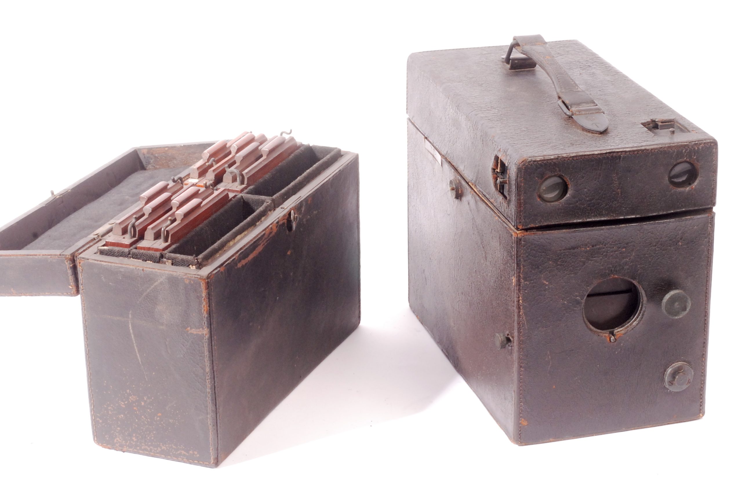 Sténopé Double N°3 Modèle B par Demaria.  Il s'agit d'une autre version, moins courante,  du sténopé de Dehors et Deslandres.  L'appareil est accompagné de sa notice descriptive et d'emploi. Il remplace l'objectif à la place duquel il se met, sur n'importe quelle chambre noire.  Il se compose d'une plaque en laiton noirci pouvant coulisser entre deux rails fixés sur une platine en vieux noyer. Sur cette plaque, trois trous côniques sont percés. Leur grandeur mathématique est liée à la dimension de la reproduction obtenue sur la glace dépolie. Avec cet appareil, tous les plans jusqu'à l'horizon sont  toujours au point, il permet de photographier des objets de grandes dimensions, en se plaçant à de petites distances. Les images sont toujours nettes, même sur des surfaces irrégulières, ce qui permet l'emploi des cartons pelliculaires et papier au gélatinobromure. Par conséquent, l'appareil Sténopé supprime les deux parties les plus fragiles des chambres , l'objectif et la glace dépolie. En plus de la description détaillée de l'appareil , la notice présente les divers types de sténopé proposé par Demaria,  ainsi que des indications sur les longueurs focales et les temps de pose. Très belle pièce de collection.