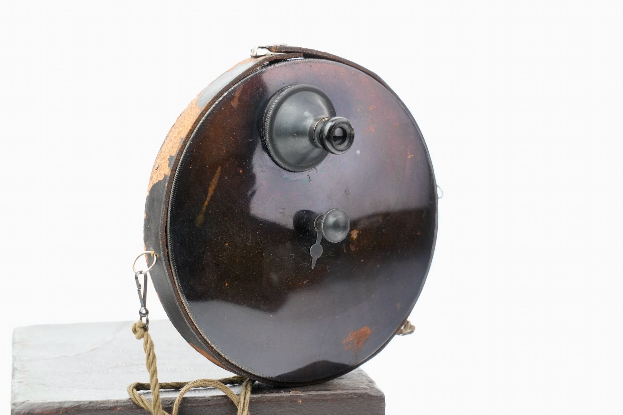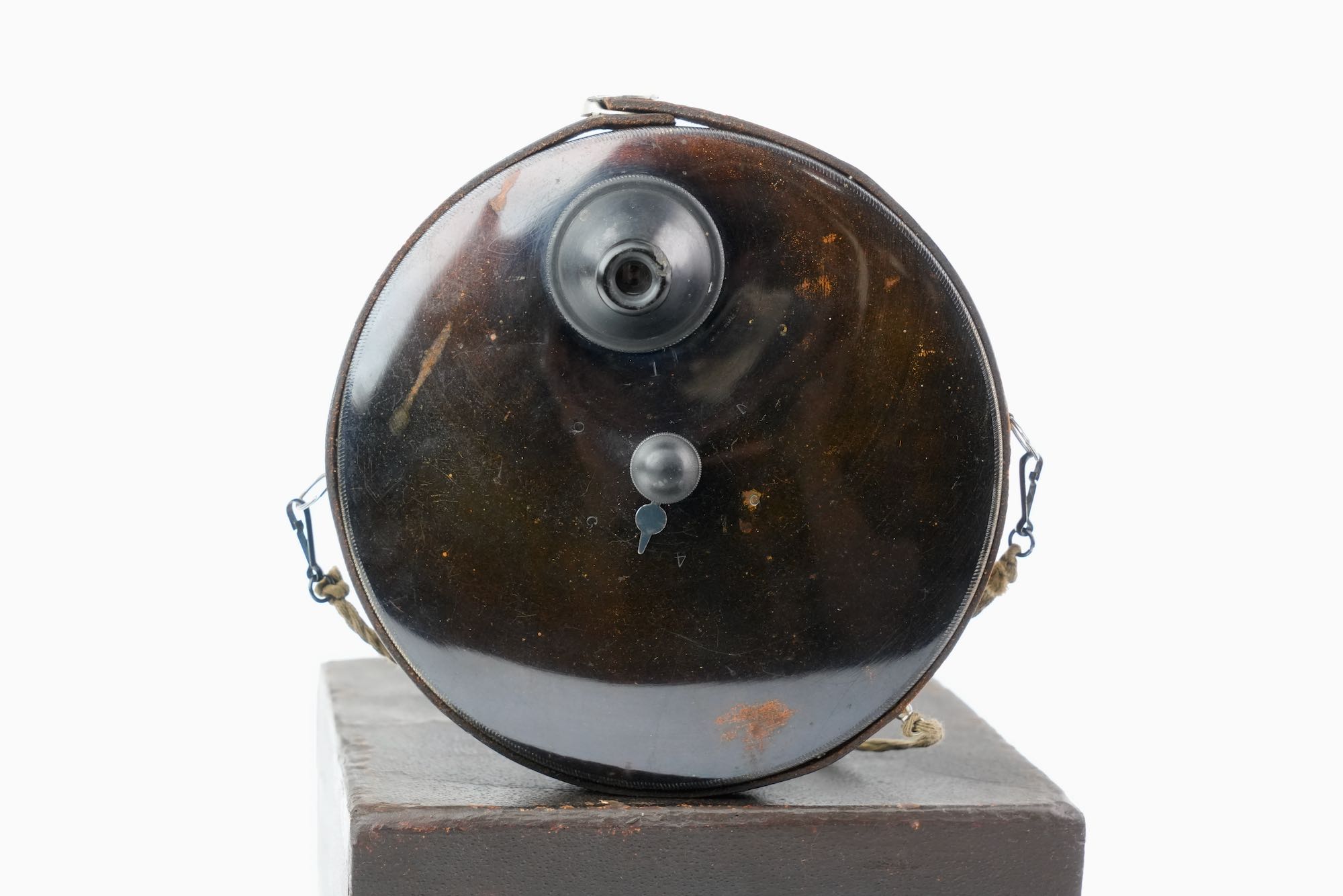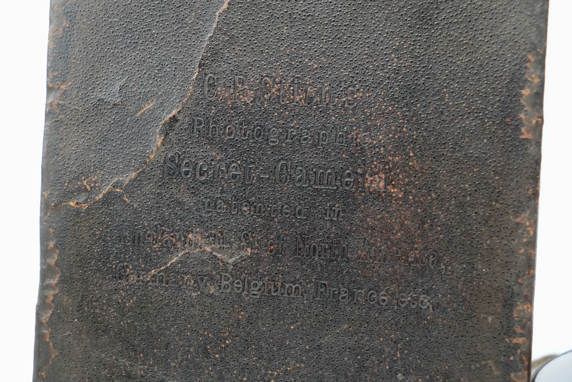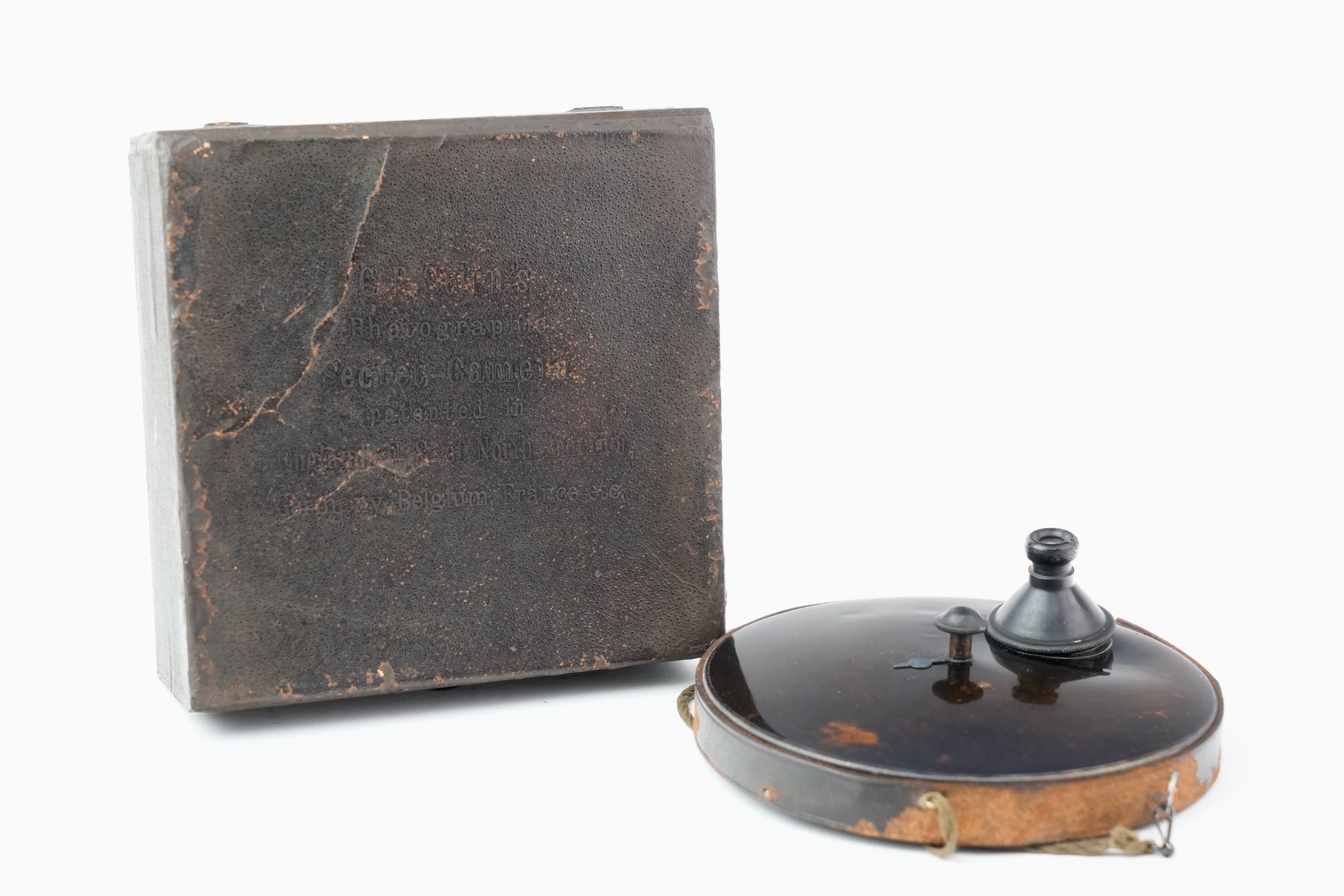 Plastron de Stirn appareil photographique espion premier modèle (sur le premier modèle, le couvercle ferme par baïonnettes et non pas avec charnière). Le 28 juillet 1886, Carl Paul Stirn a déposé puis obtenu en Allemagne le brevet N°38391 pour ce plastron photographique. Cet appareil espion peut réaliser des vues sur des plaques de verre de 5 pouces de diamètre. L’armement de l’obturateur rotatif s’effectue par l’intermédiaire du bouton central. Le déclenchement est réalisé en agissant sur une petite tirette avec anneau située au bas de l’appareil. Le plastron est placé sous le veston. Son objectif est engagé dans l’une des boutonnières de laquelle il dépasse pour la prise de vue. Cet appareil de type « espion » est très peu courant. Appareil en excellent état, proche du neuf. Numéro de série 3549.