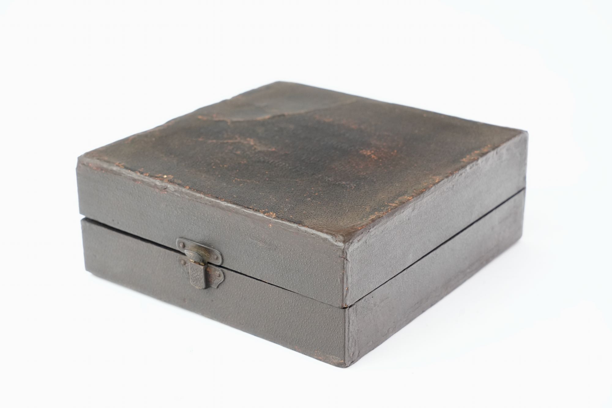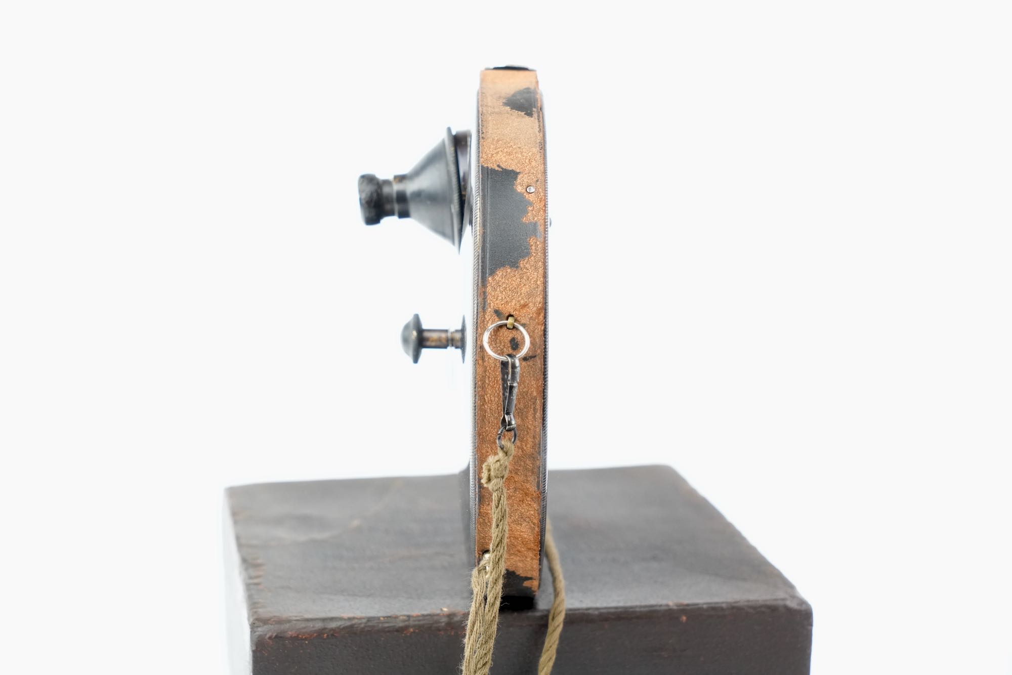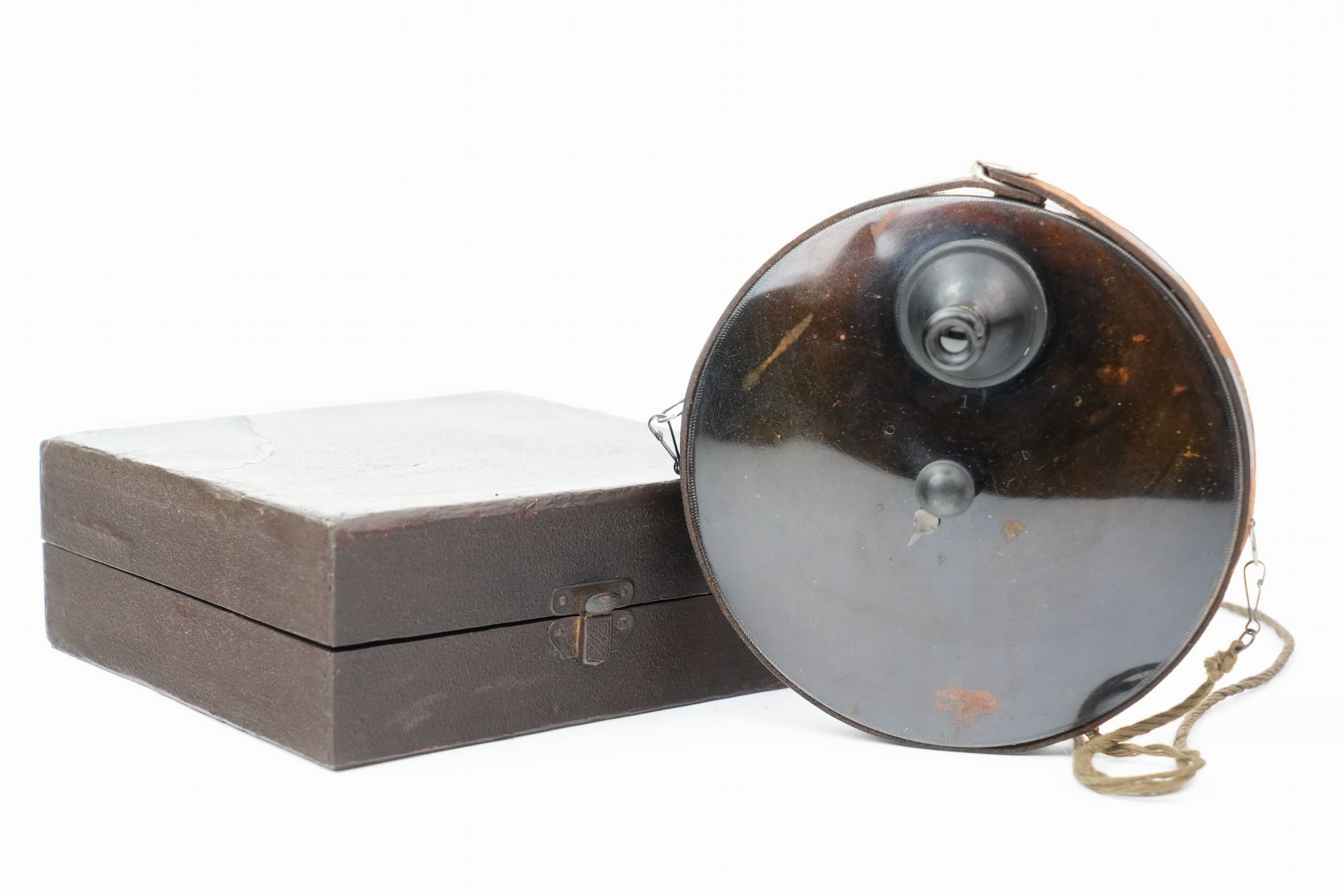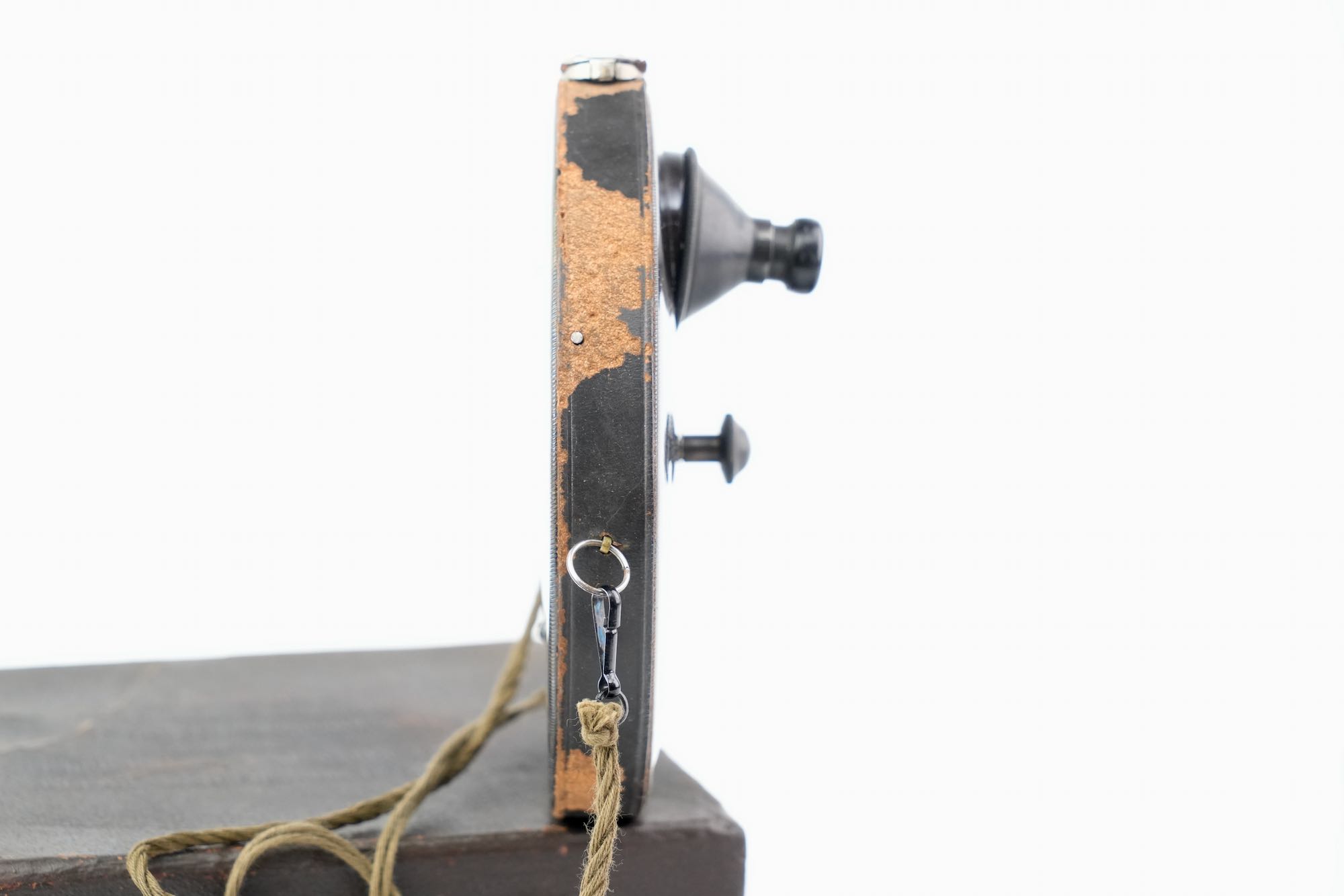 Plastron de Stirn appareil photographique espion premier modèle (sur le premier modèle, le couvercle ferme par baïonnettes et non pas avec charnière). Le 28 juillet 1886, Carl Paul Stirn a déposé puis obtenu en Allemagne le brevet N°38391 pour ce plastron photographique. Cet appareil espion peut réaliser des vues sur des plaques de verre de 5 pouces de diamètre. L’armement de l’obturateur rotatif s’effectue par l’intermédiaire du bouton central. Le déclenchement est réalisé en agissant sur une petite tirette avec anneau située au bas de l’appareil. Le plastron est placé sous le veston. Son objectif est engagé dans l’une des boutonnières de laquelle il dépasse pour la prise de vue. Cet appareil de type « espion » est très peu courant. Appareil en excellent état, proche du neuf. Numéro de série 3549.
