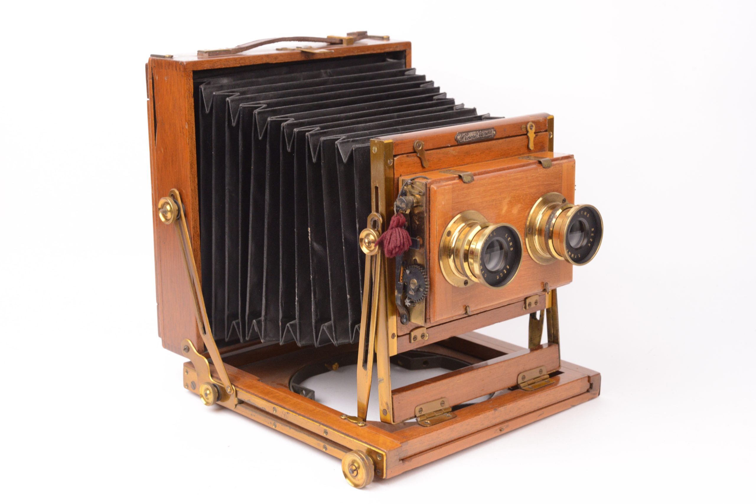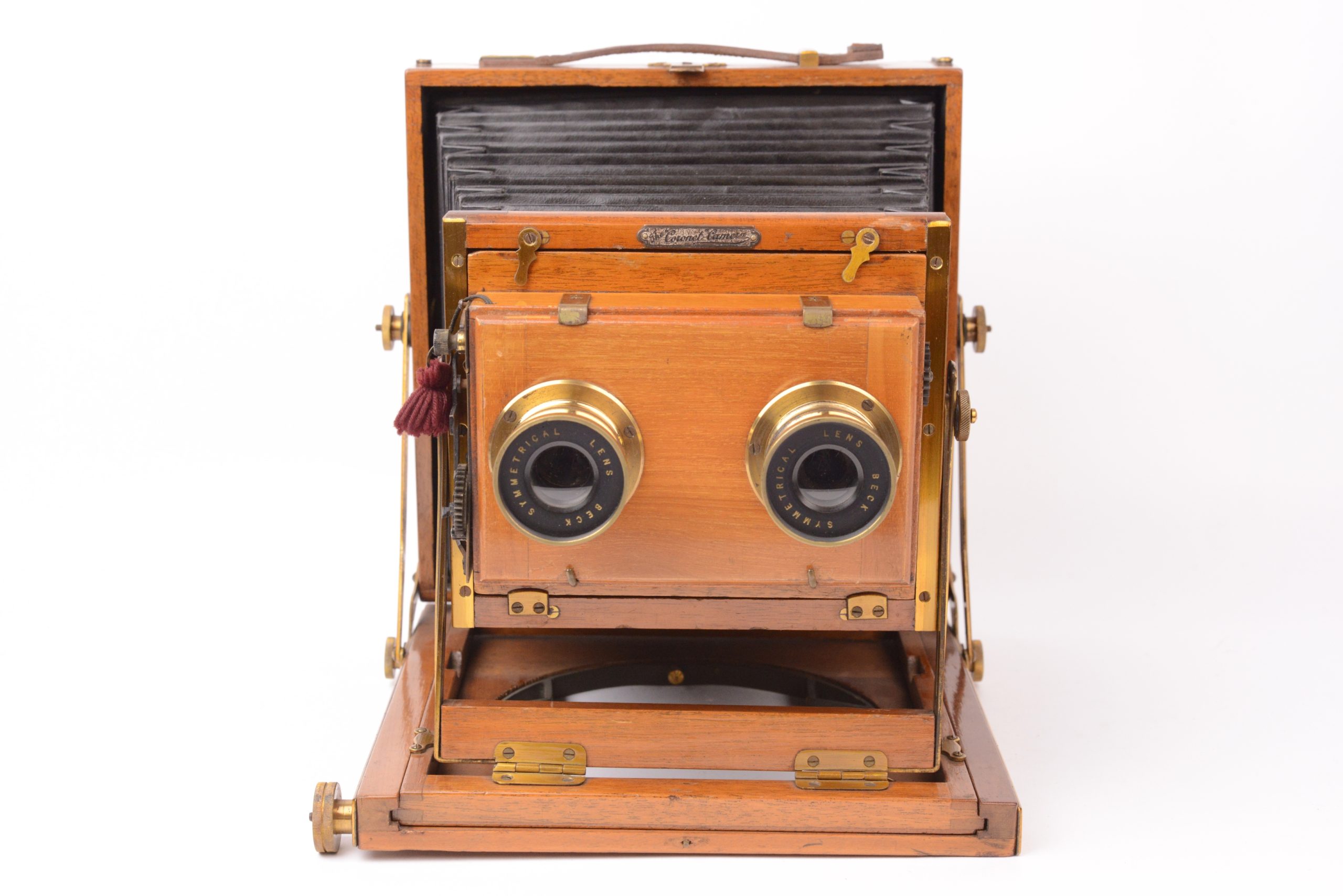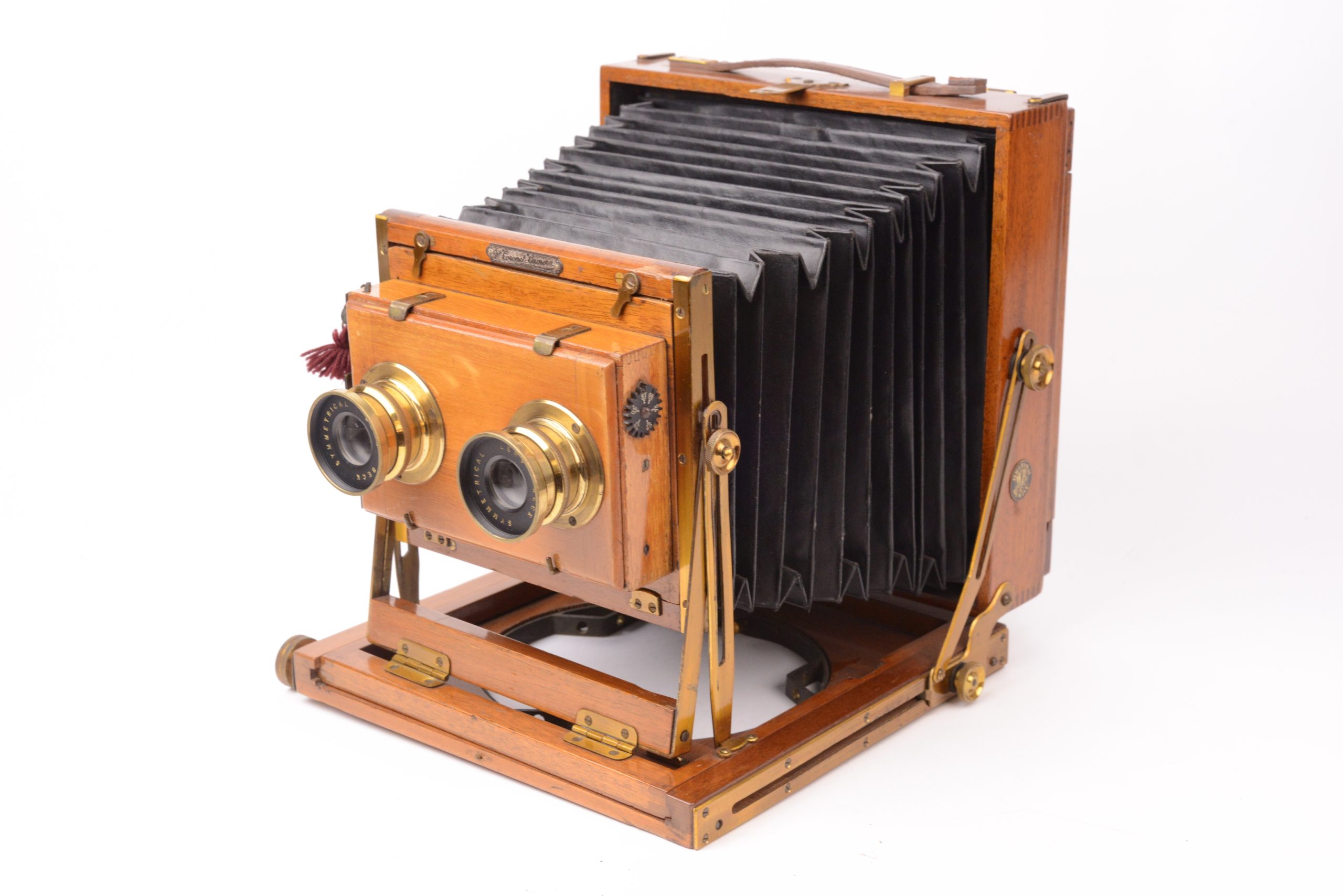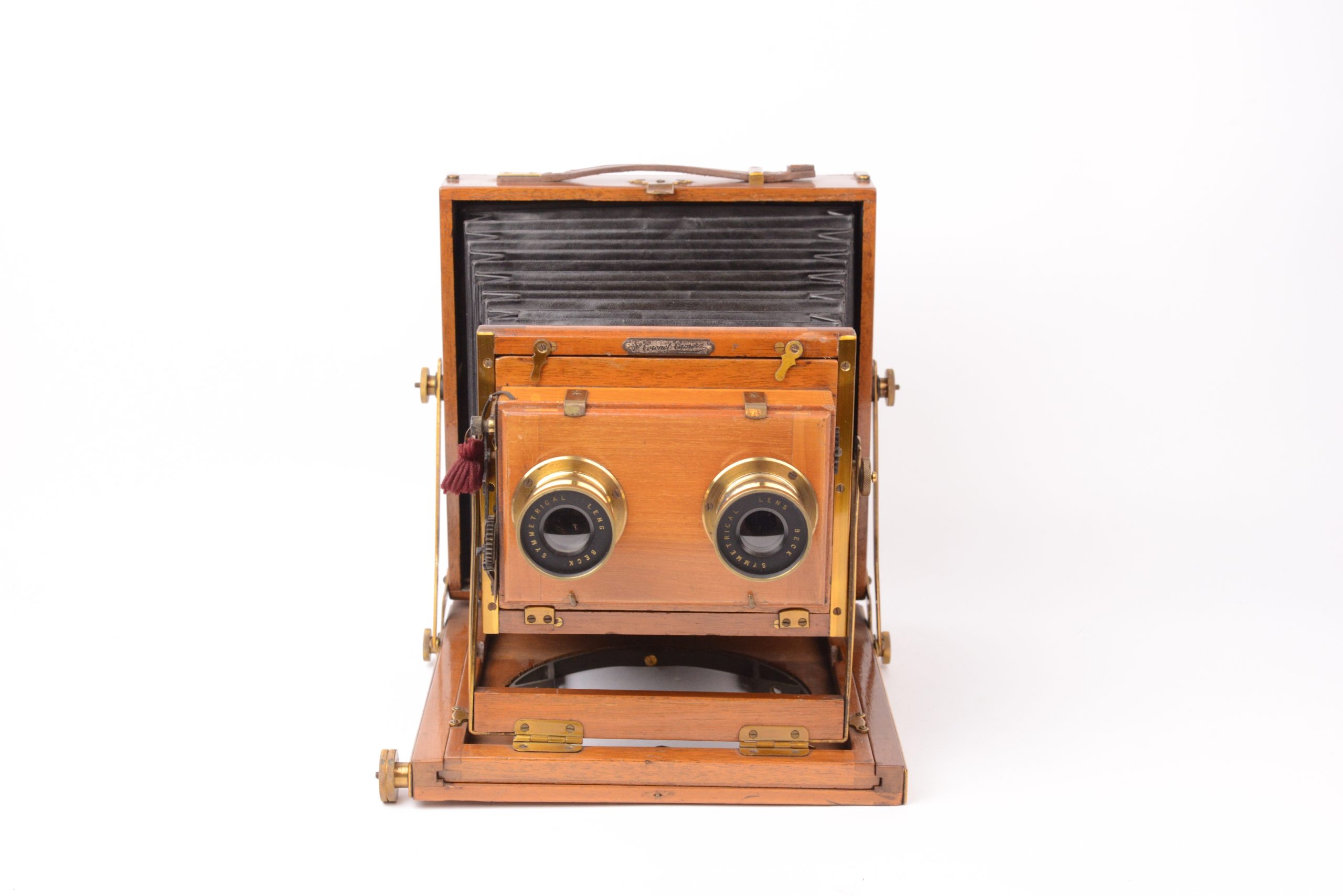 Chambre photographique stéréoscopique Coronet par W. Butcher & Sons Ltd. Période 1912 à 1925 environ. Belle construction en acajou poli et laqué, garnitures en laiton poli. Soufflet rigide pyramidal à coins non rabattus. Mise au point par bouton agissant sur pignon et crémaillère.  Bascules des corps avant et arrière. Dos carré pivotant. Platine avant recevant un obturateur à rideau Thornton-Pickard équipé d’objectifs Beck Symetrical. Dos avec cadre articulé portant verre dépoli. Bel appareil.