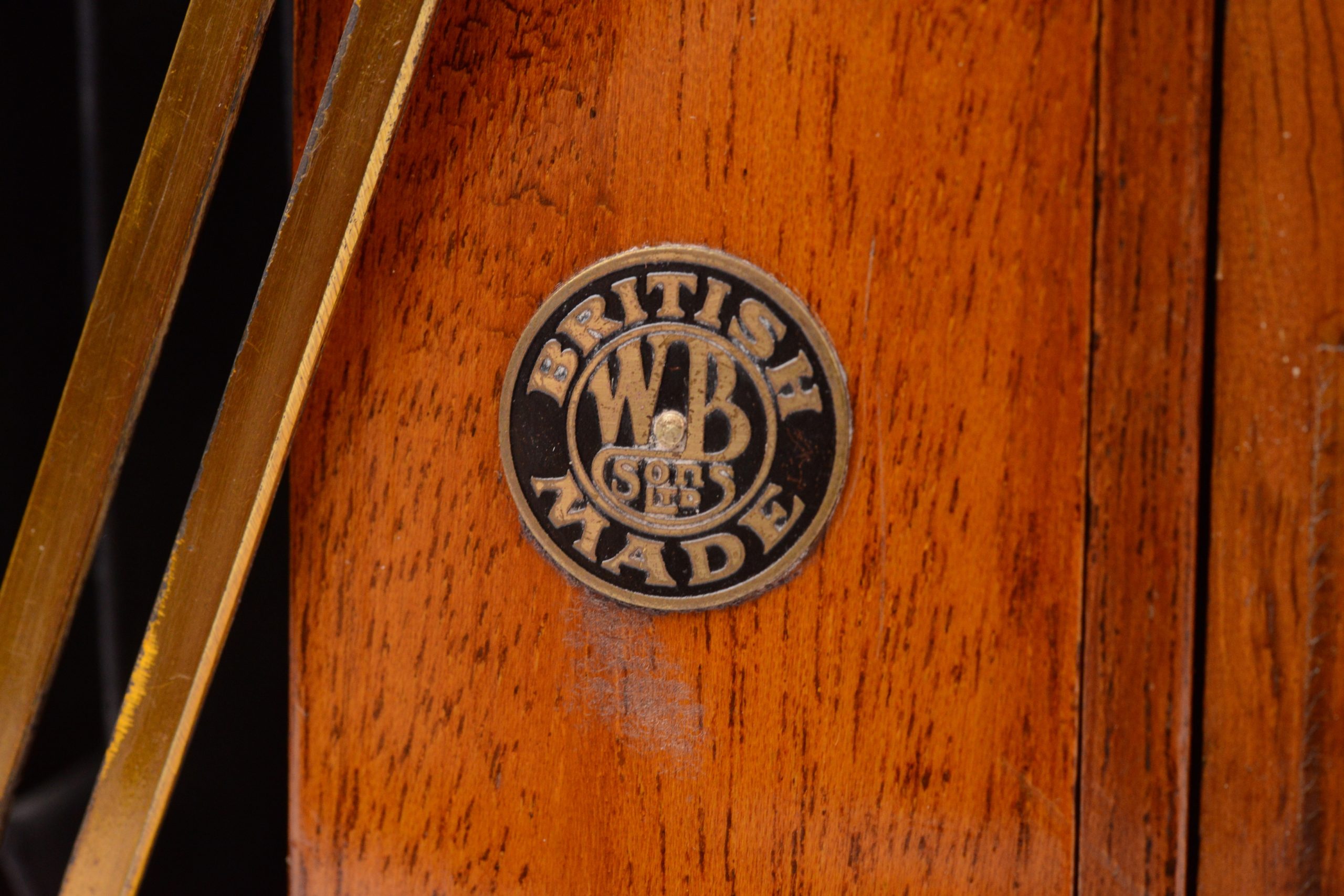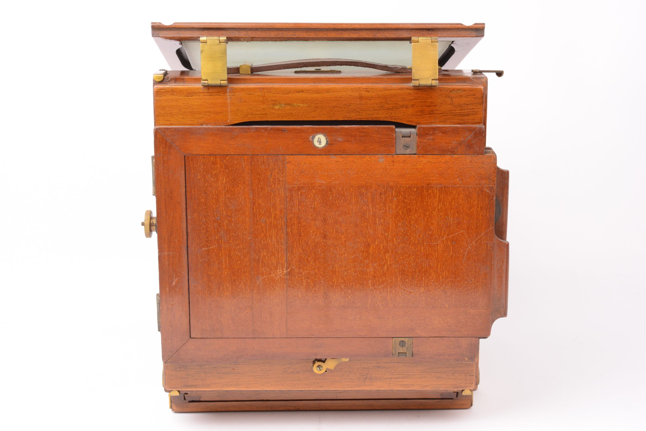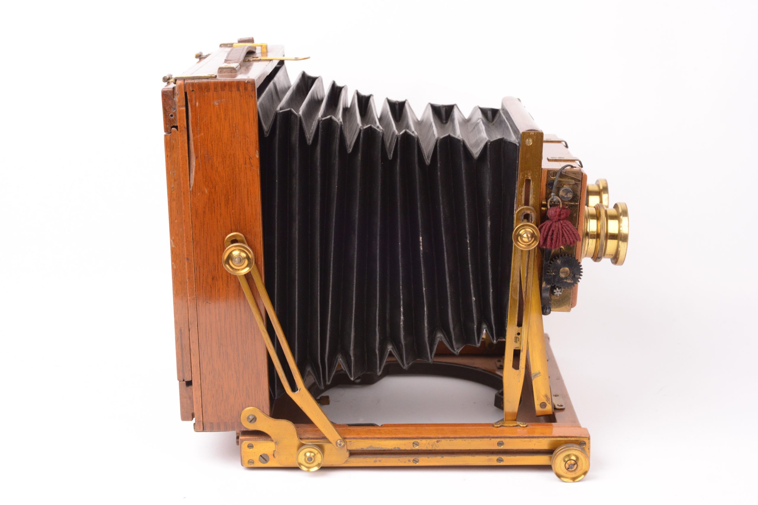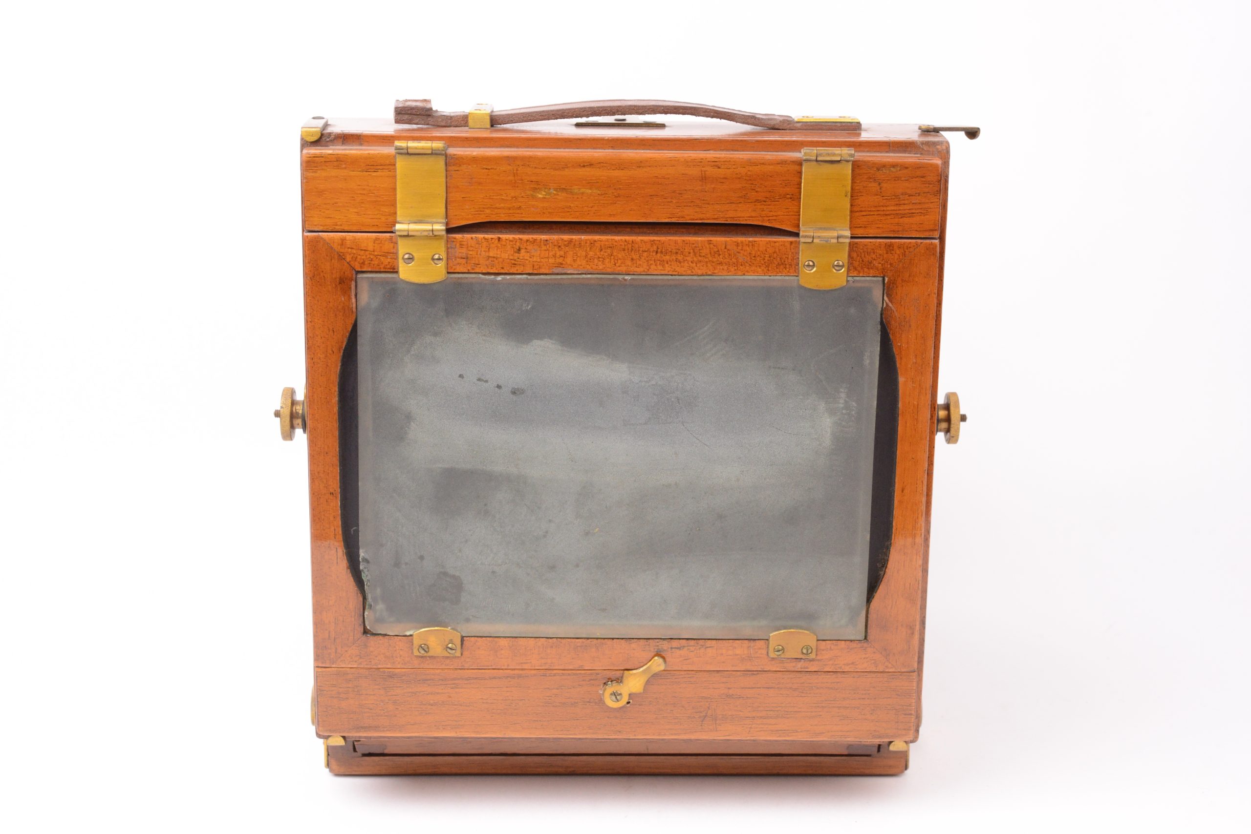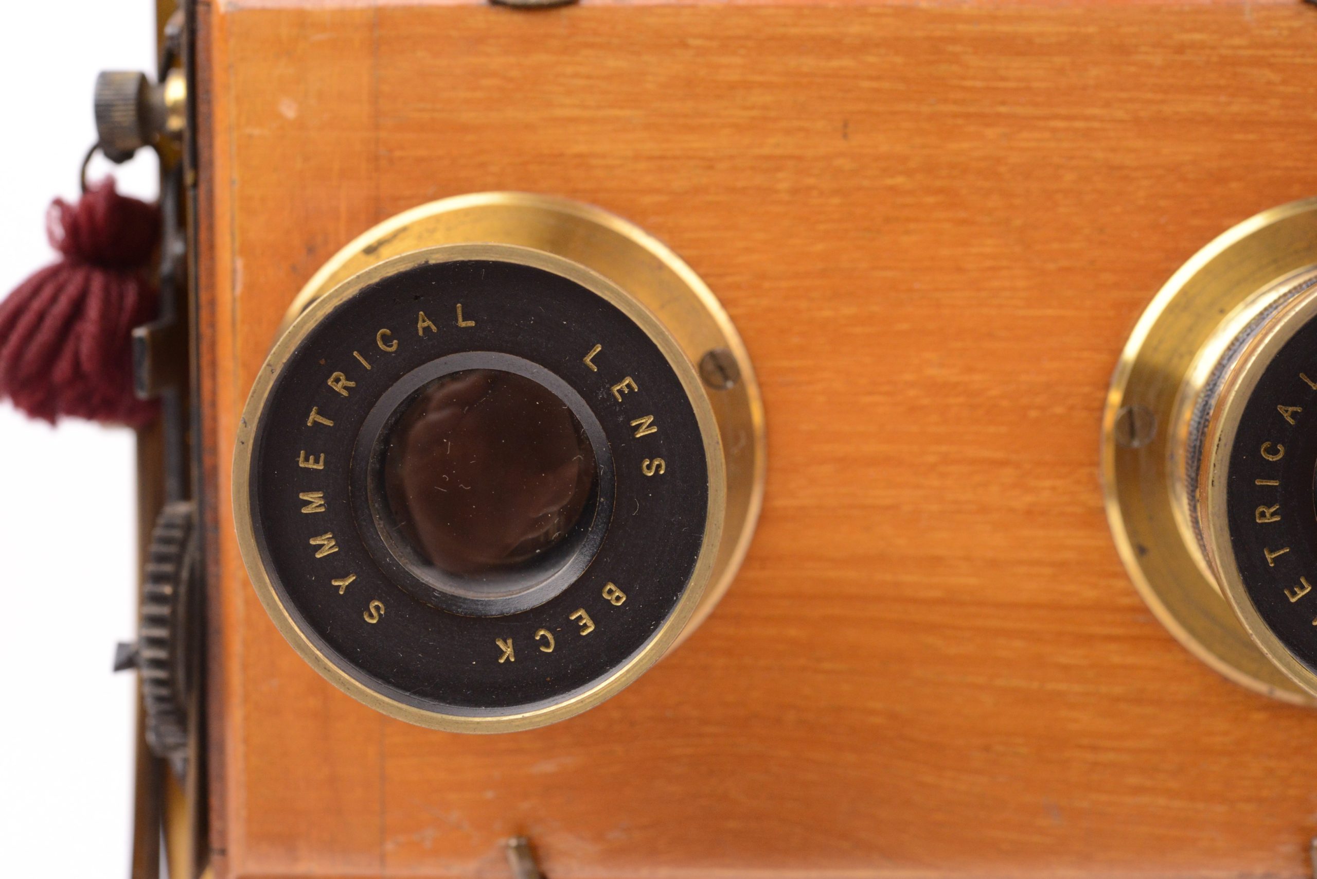 Chambre photographique stéréoscopique Coronet par W. Butcher & Sons Ltd. Période 1912 à 1925 environ. Belle construction en acajou poli et laqué, garnitures en laiton poli. Soufflet rigide pyramidal à coins non rabattus. Mise au point par bouton agissant sur pignon et crémaillère.  Bascules des corps avant et arrière. Dos carré pivotant. Platine avant recevant un obturateur à rideau Thornton-Pickard équipé d’objectifs Beck Symetrical. Dos avec cadre articulé portant verre dépoli. Bel appareil.