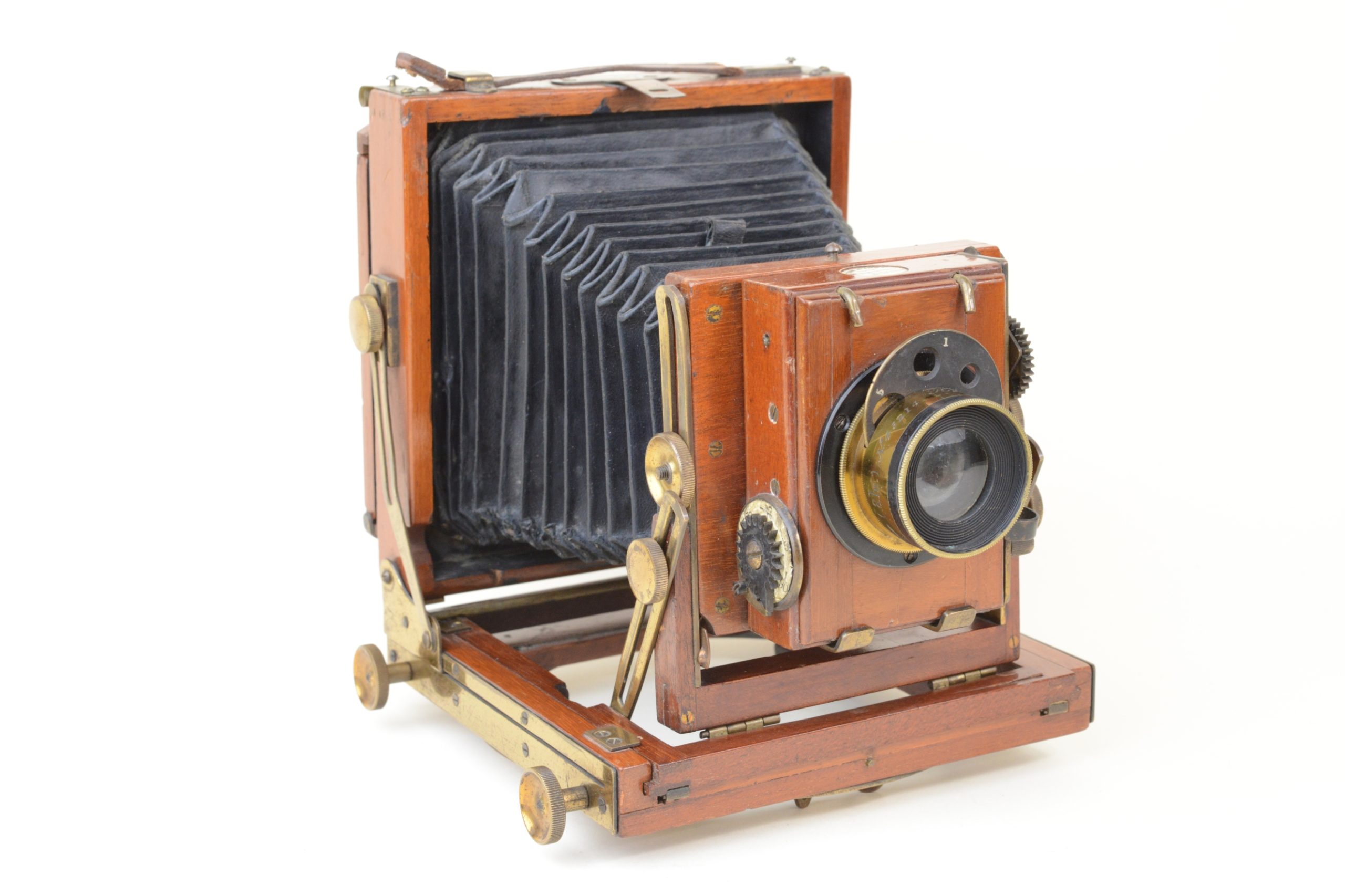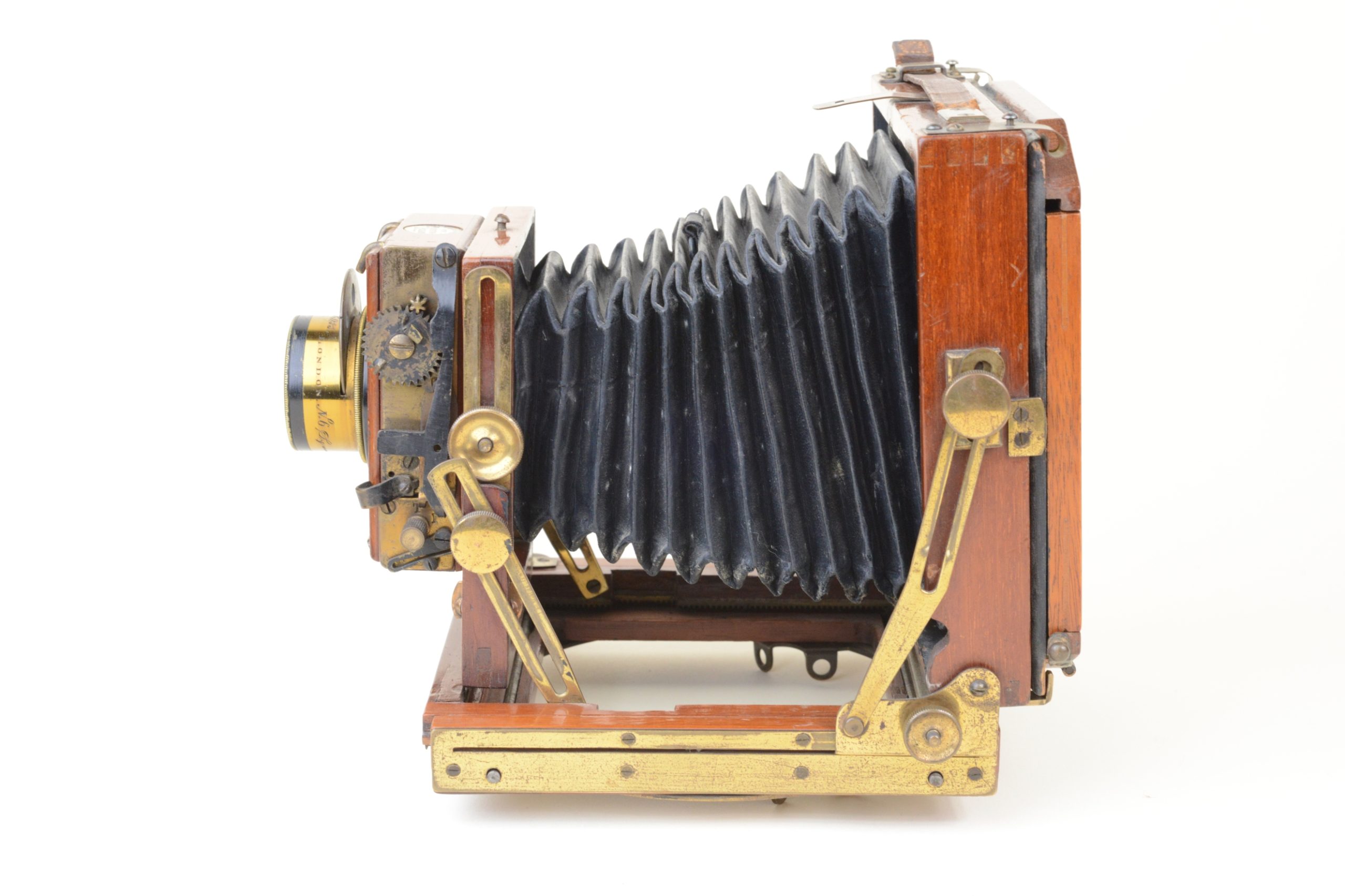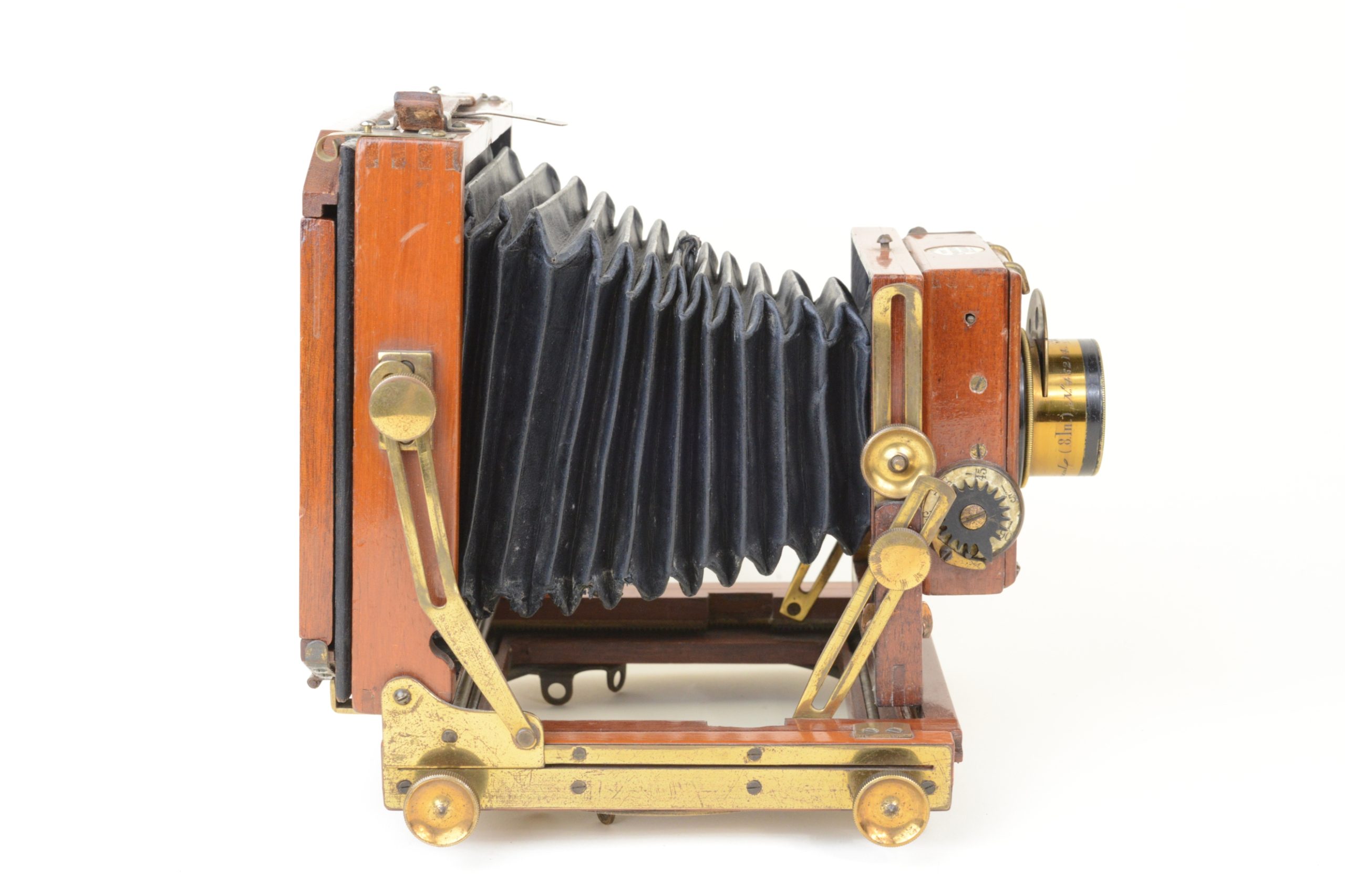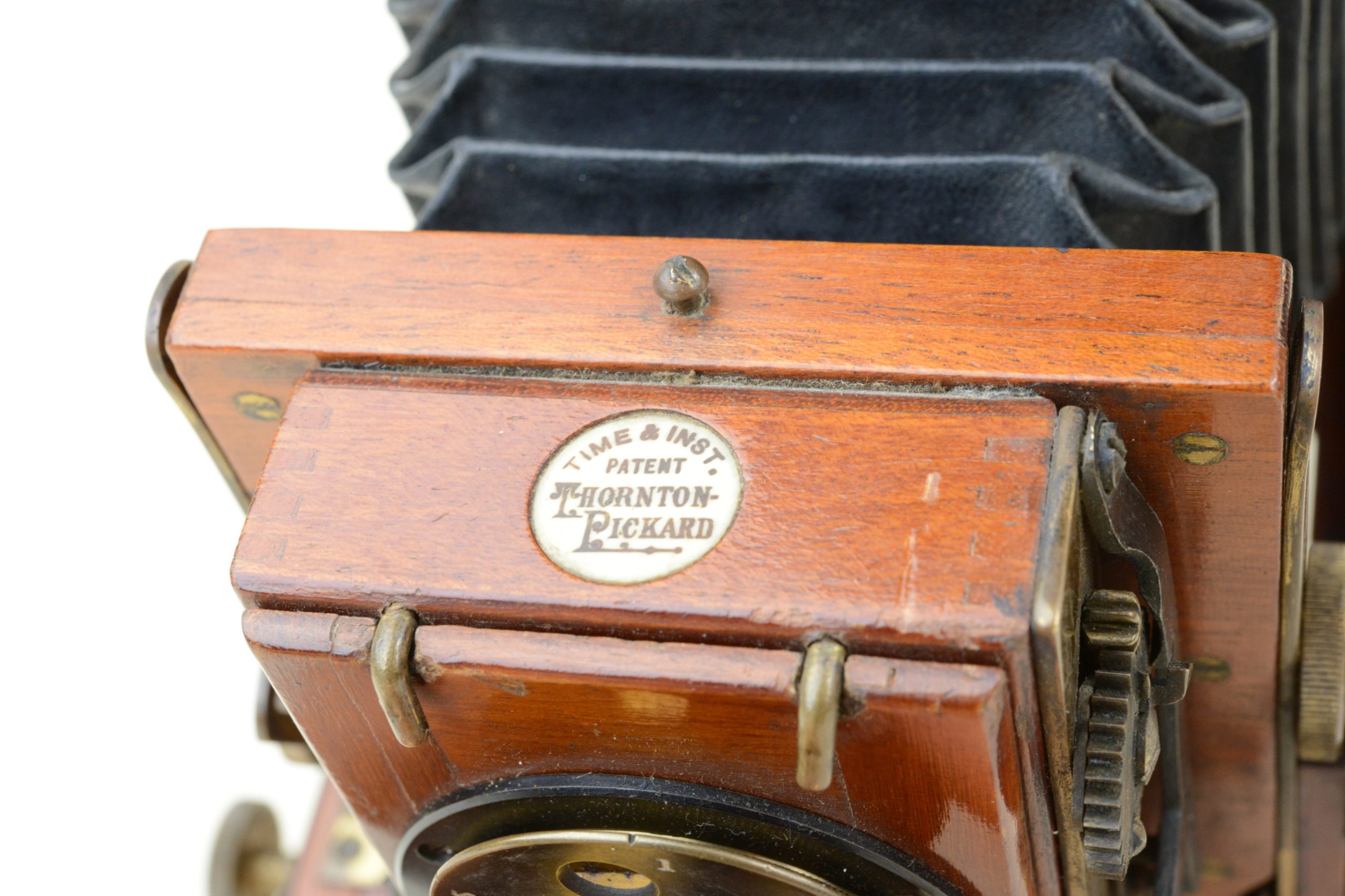 Thornton-Pickard Folding camera 9x12 cm.  Construction en acajou blond verni, toutes les parties métalliques sont en laiton. Soufflet en cuir à coins rabattus. Décentrement vertical de la platine avant. Les corps avant et arrière sont basculants. Dos amovible tournant portant le châssis ou le verre dépoli.  Mise au point par déplacement du chariot à l’aide des molettes agissant sur peignons et crémaillères. Objectif Ross en laiton (de 8 In.) avec diaphragmes à tourelle. Châssis double à volets rigides. Vers 1895. Appareil particulièrement séduisant, de par son type de construction et son relatif petit format.