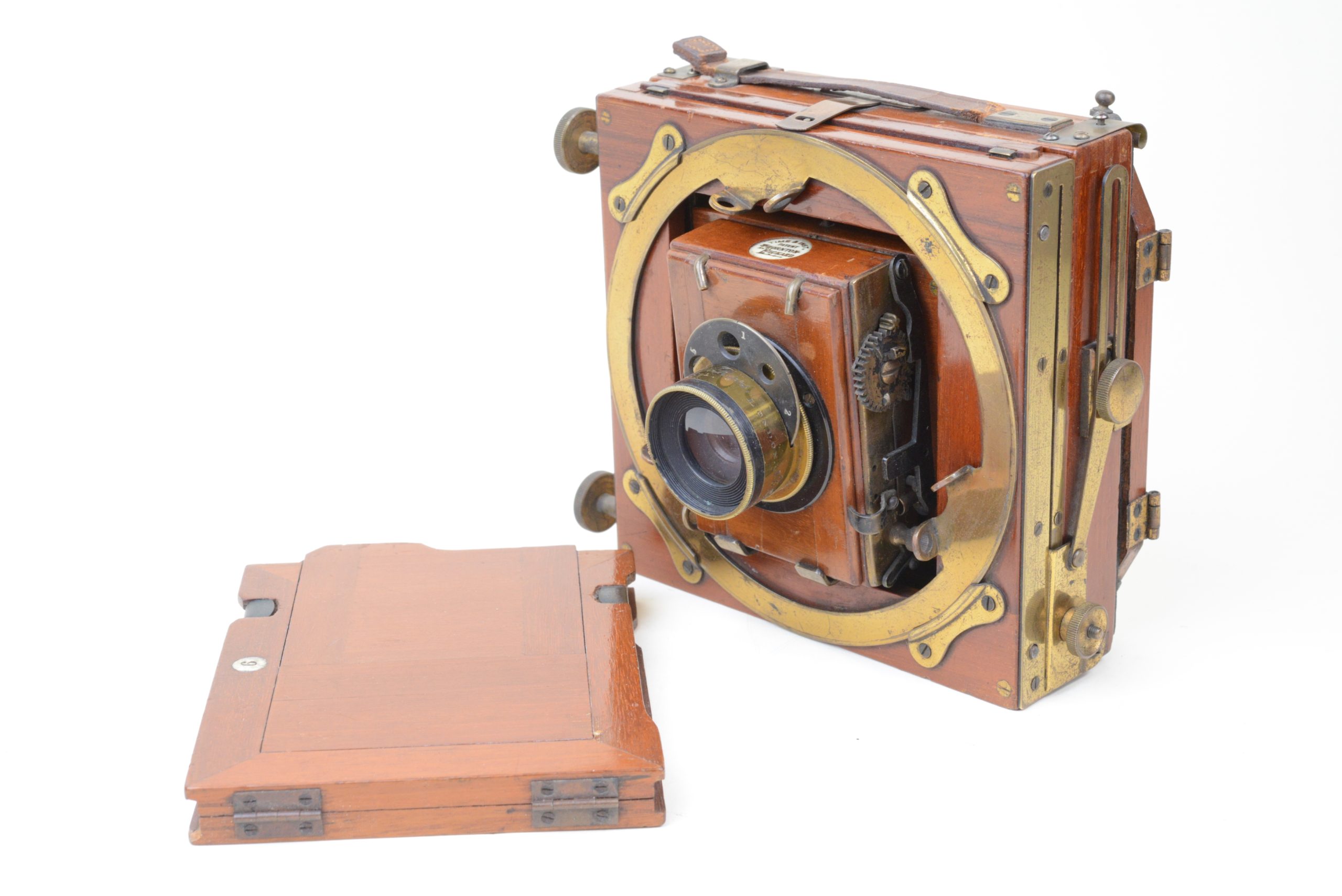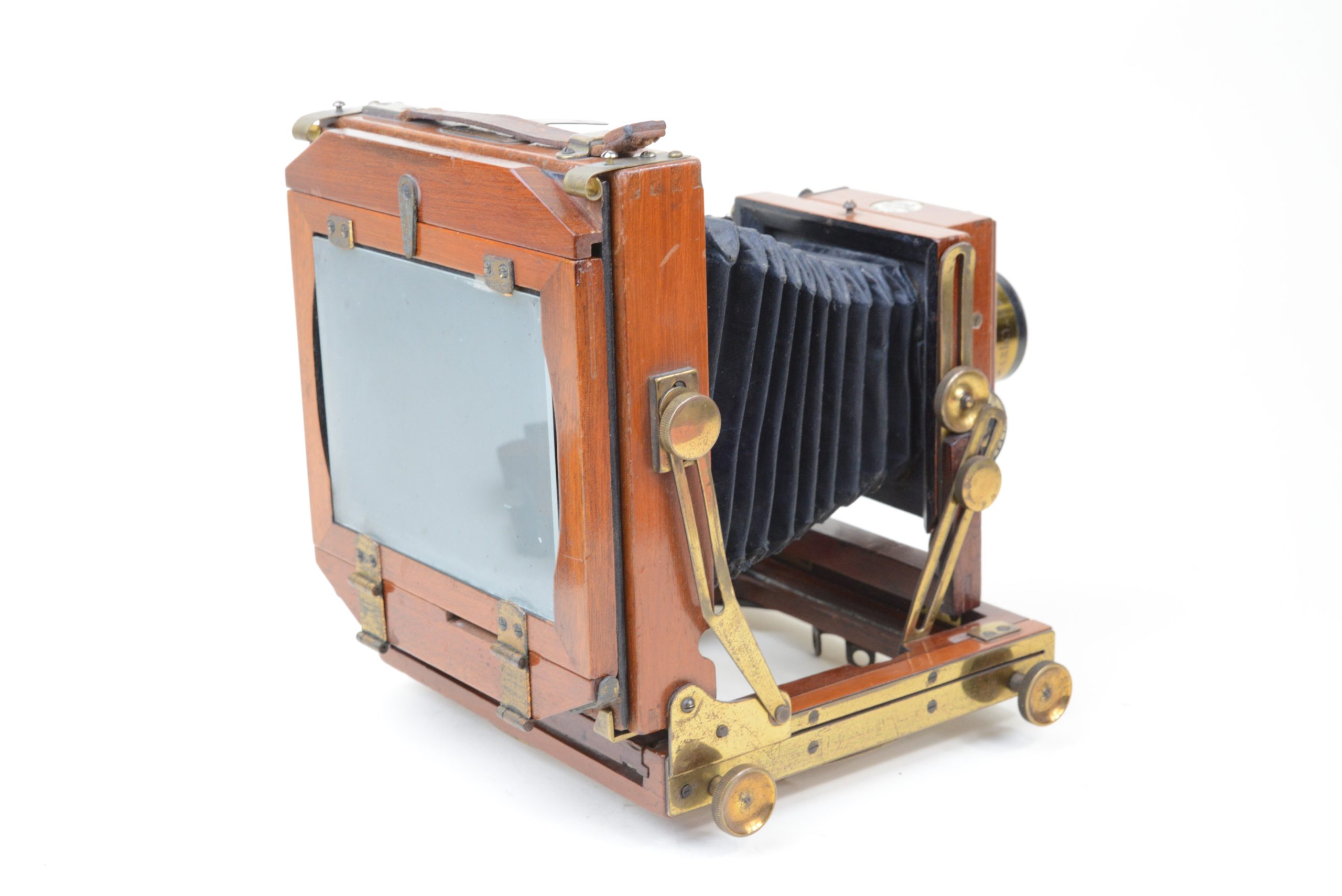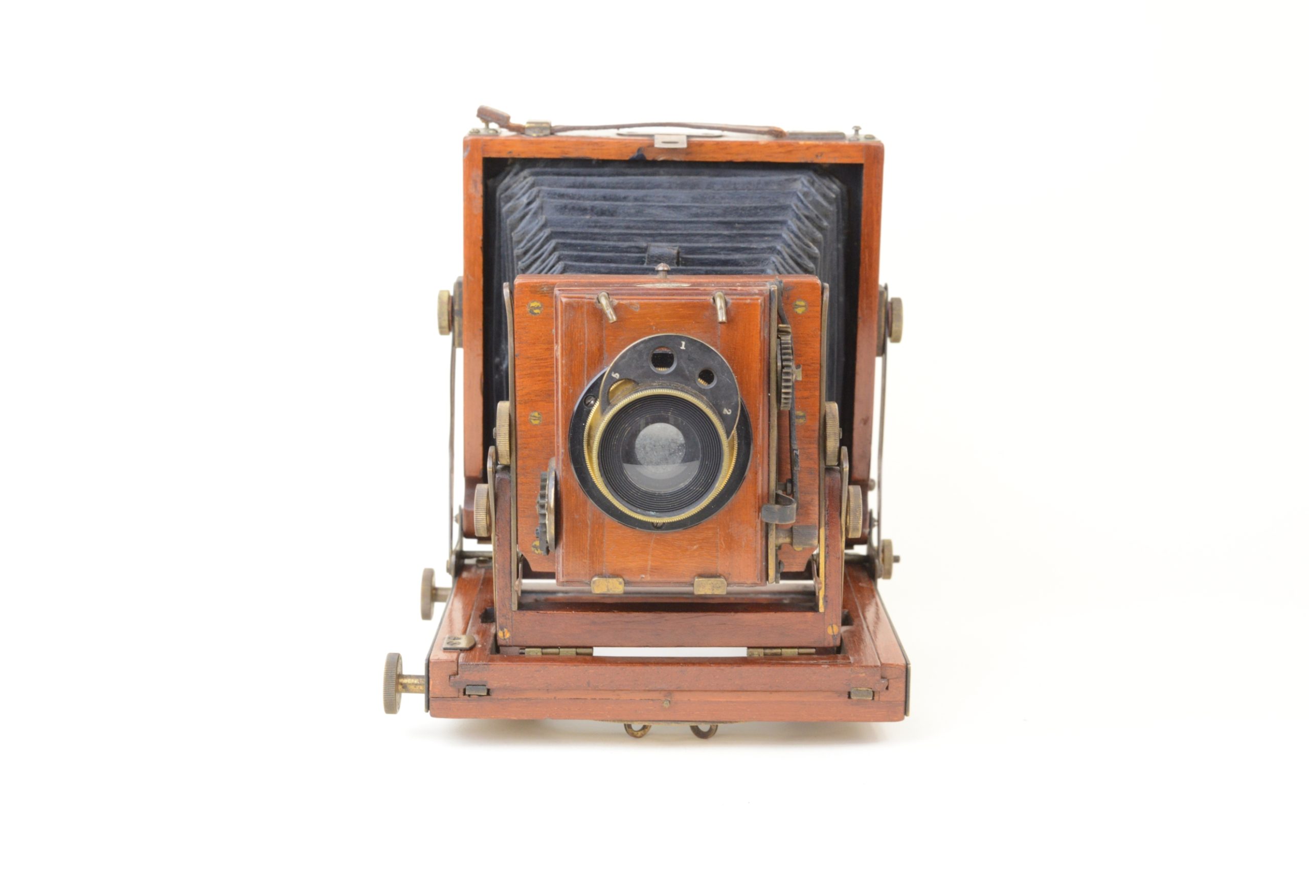 Thornton-Pickard Folding camera 9x12 cm.  Construction en acajou blond verni, toutes les parties métalliques sont en laiton. Soufflet en cuir à coins rabattus. Décentrement vertical de la platine avant. Les corps avant et arrière sont basculants. Dos amovible tournant portant le châssis ou le verre dépoli.  Mise au point par déplacement du chariot à l’aide des molettes agissant sur peignons et crémaillères. Objectif Ross en laiton (de 8 In.) avec diaphragmes à tourelle. Châssis double à volets rigides. Vers 1895. Appareil particulièrement séduisant, de par son type de construction et son relatif petit format.