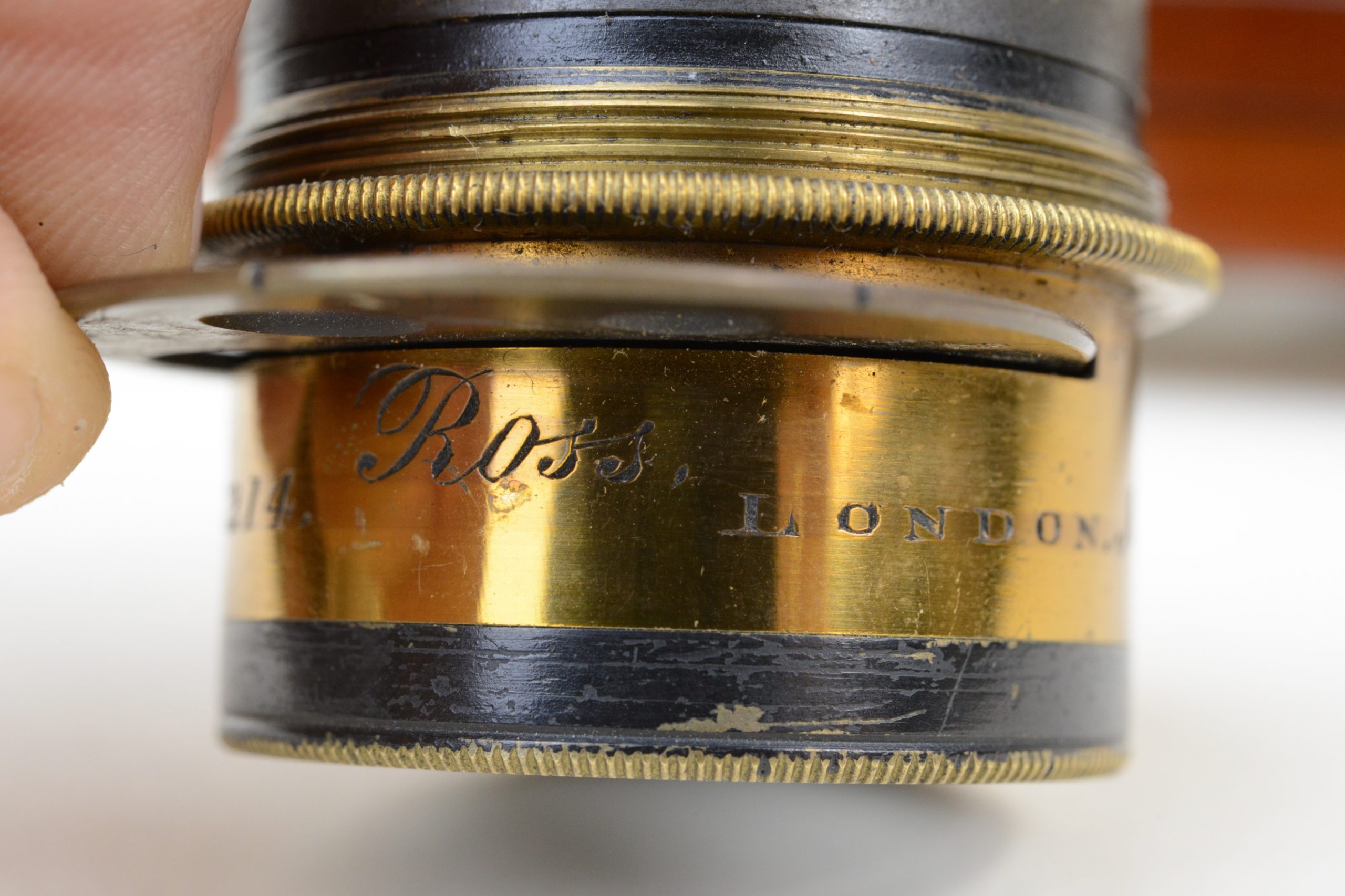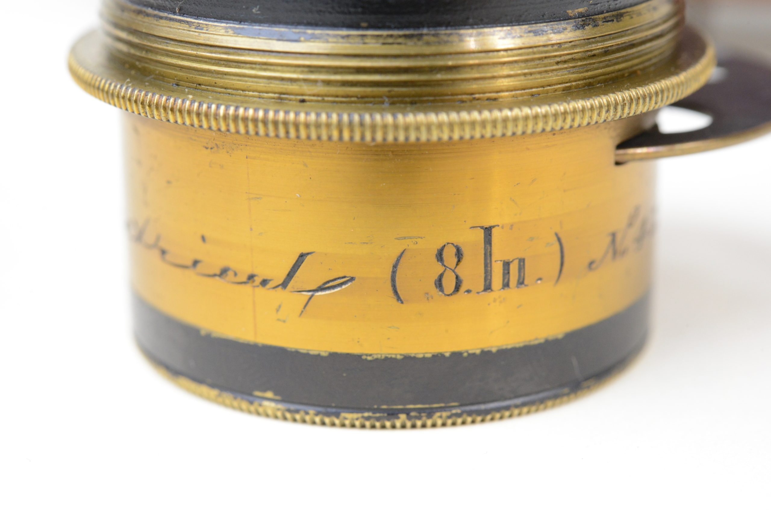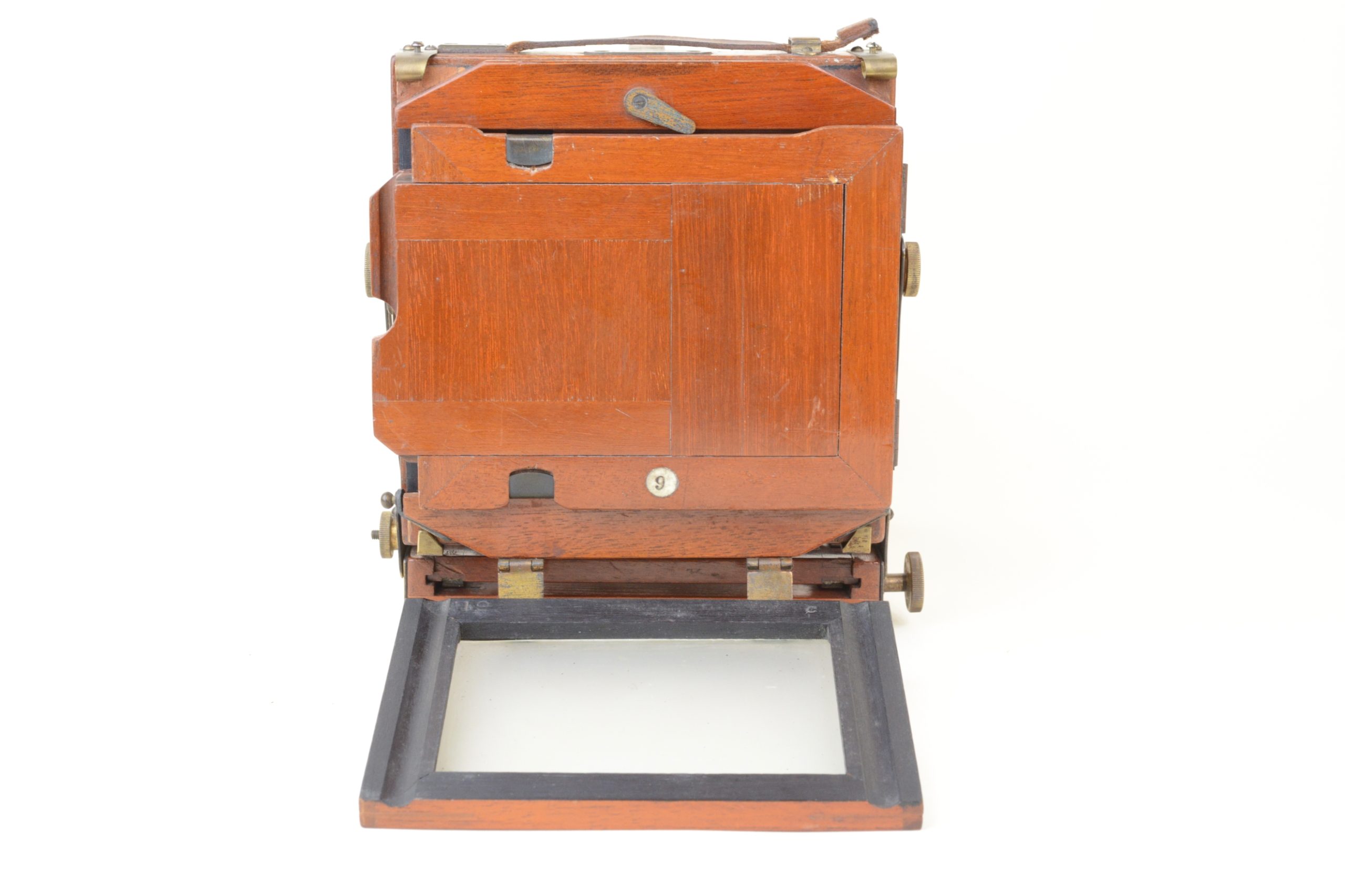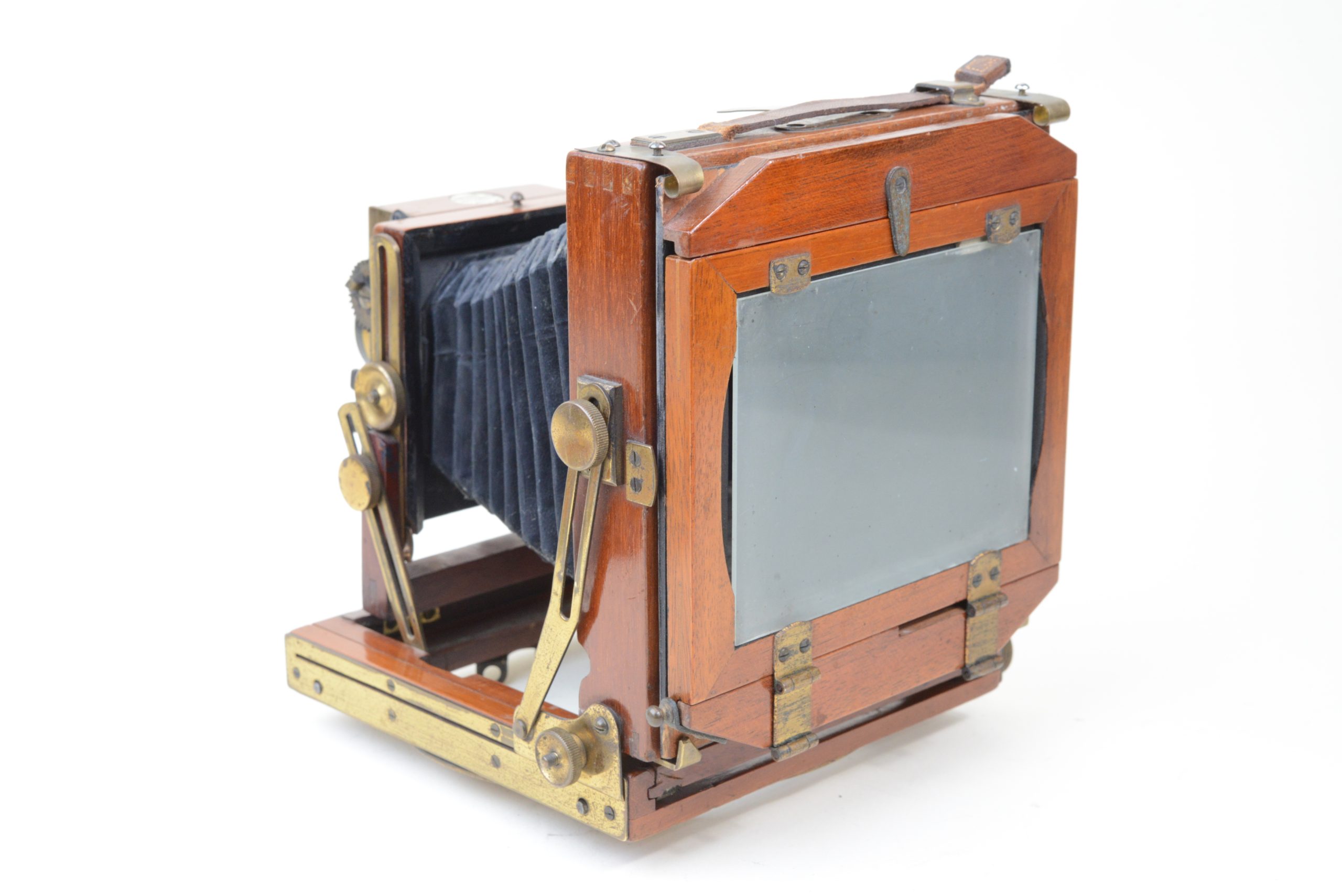 Thornton-Pickard Folding camera 9x12 cm.  Construction en acajou blond verni, toutes les parties métalliques sont en laiton. Soufflet en cuir à coins rabattus. Décentrement vertical de la platine avant. Les corps avant et arrière sont basculants. Dos amovible tournant portant le châssis ou le verre dépoli.  Mise au point par déplacement du chariot à l’aide des molettes agissant sur peignons et crémaillères. Objectif Ross en laiton (de 8 In.) avec diaphragmes à tourelle. Châssis double à volets rigides. Vers 1895. Appareil particulièrement séduisant, de par son type de construction et son relatif petit format.