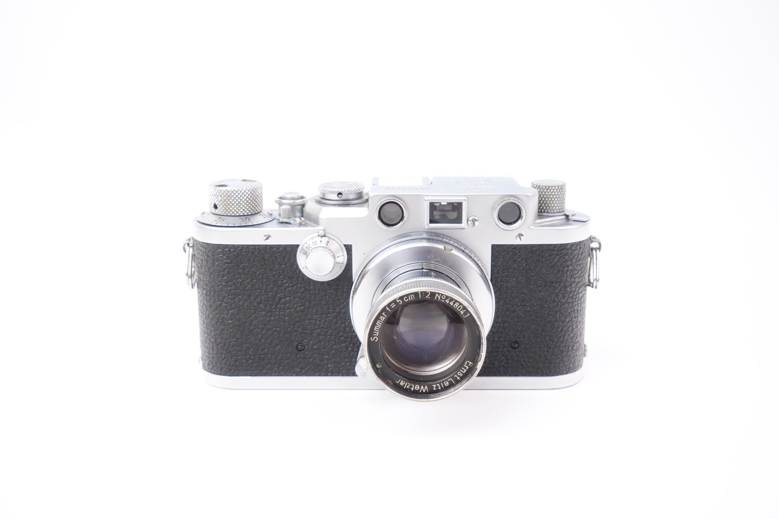 Bel appareil photo télémetrique Leica IIIf dont le numéro de série est N° 610742 et daté de 1952. L'objectif est un Summar f/2 - 50mm, dont le numéro de série est N° 448043, est daté de 1938. Cet appareil est en bel état et a été révisé. L'obturateur déclenche parfaitement à toutes les vitesses. Le viseur est clair et le télémètre est correctement contrasté. L'objectif est sans décollement, sans champignon ni voile, cependant il est à noter la présence de micro rayures de nettoyage sur la lentille avant. Les bagues de mise au point et de diaphragme fonctionnent parfaitement.