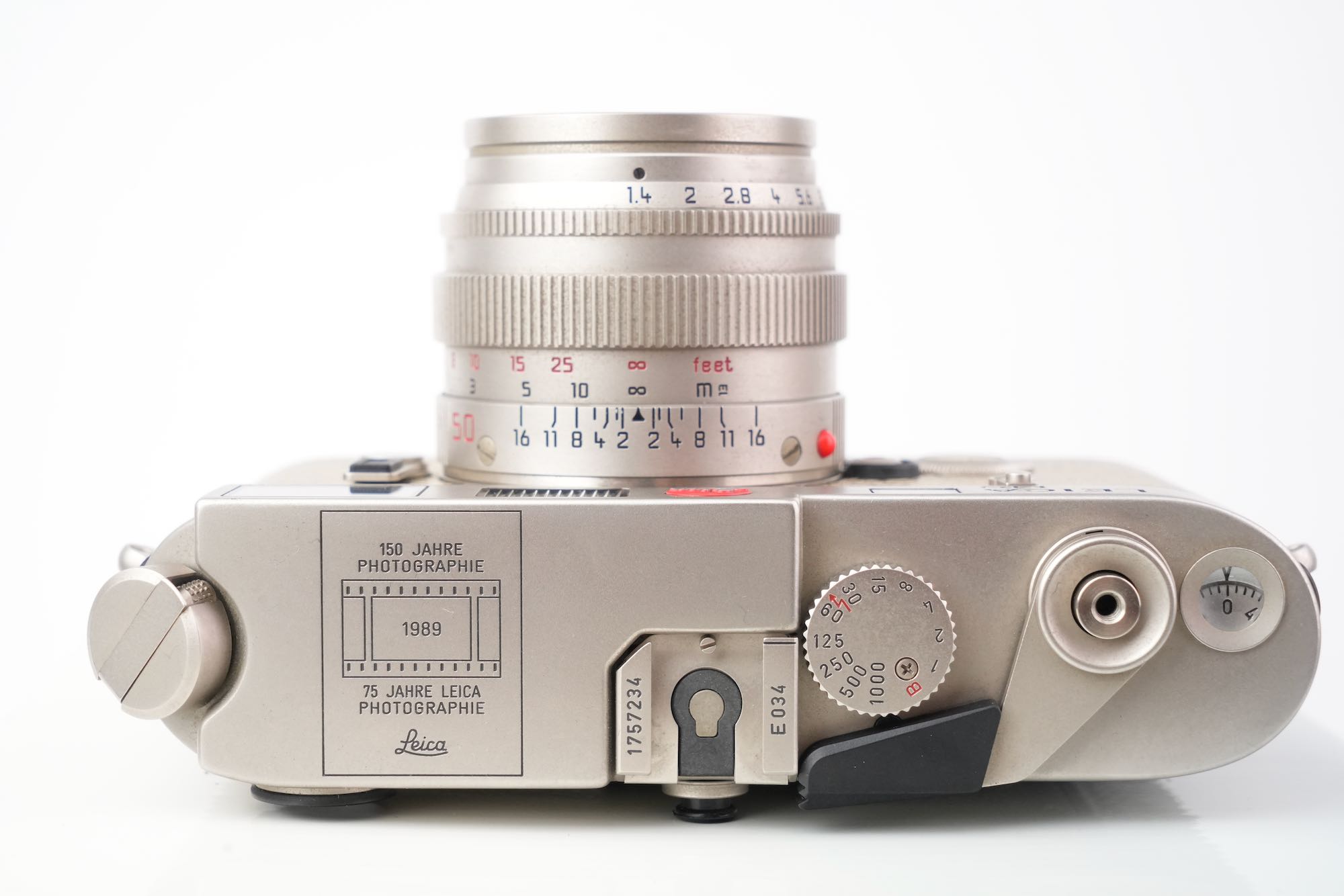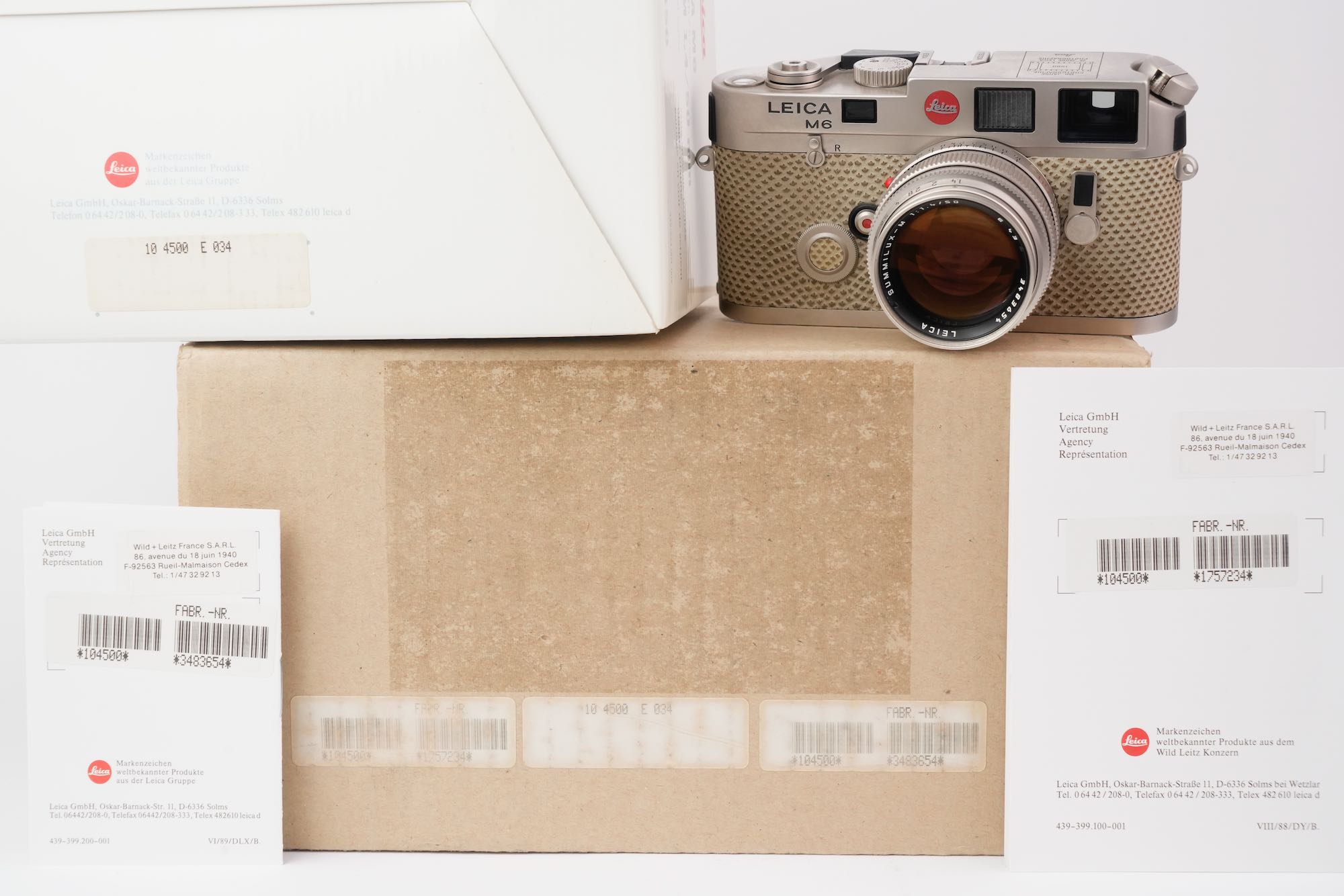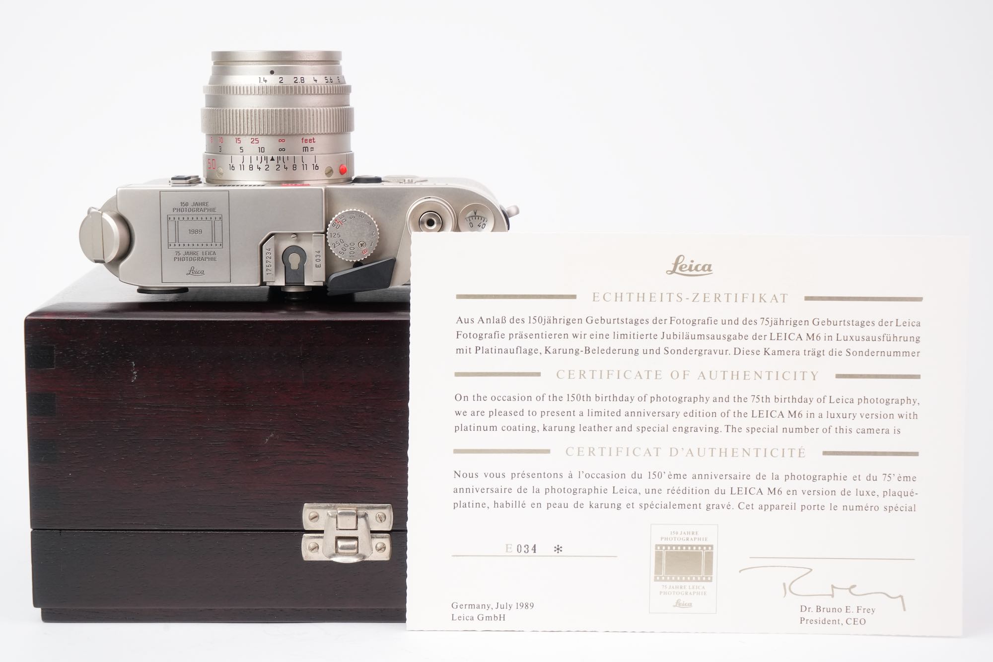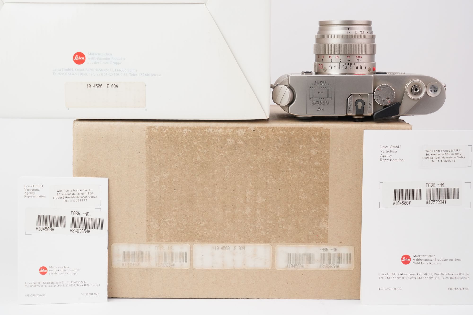Splendide coffret Leica pour un double anniversaire : les 150 ans de la photographie (1839-1989) et les 75 ans de la photographie au Leica (1914-1989). On y trouve un boîtier M6 plaqué platine avec un gainage en cuir exotique (karung) et son objectif Summilux-M 50mm f/1.4 également plaqué platine. L'état mécanique est à revoir, avec des vitesses lentes HS. La cellule photométrique est opérationnelle ainsi que la selection d'ISO. Le rideau est en bel état, sans défauts. Les lentilles de l'objectif sont impeccables. Ce dernier est fluide tant dans la mise au point que la sélection du diaphragme. On note un viseur clair et un télémètre contrasté. Le tout est en très bon état, le film plastique est toujours présent sur la semelle. Seulement 1000 modèles produits. L'ensemble vient avec son coffret en bois, les boites d'origine, la documentation et le certificat ainsi que les accessoires (bouchons, lanière). N°E034. Pour collectionneurs passionnés.