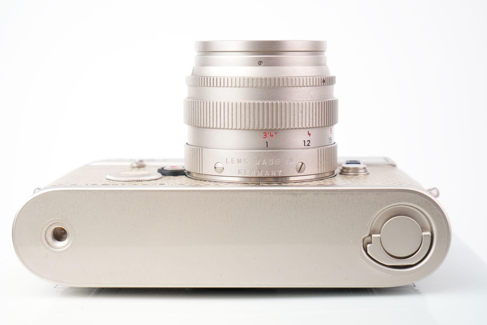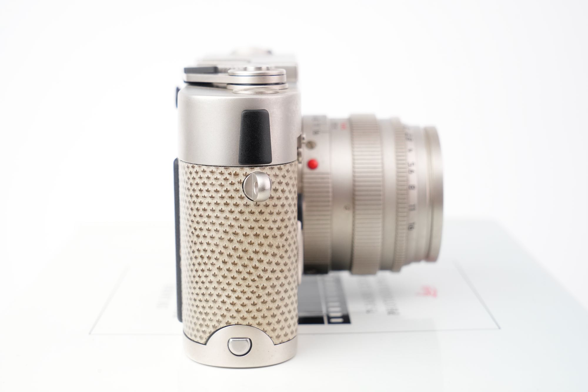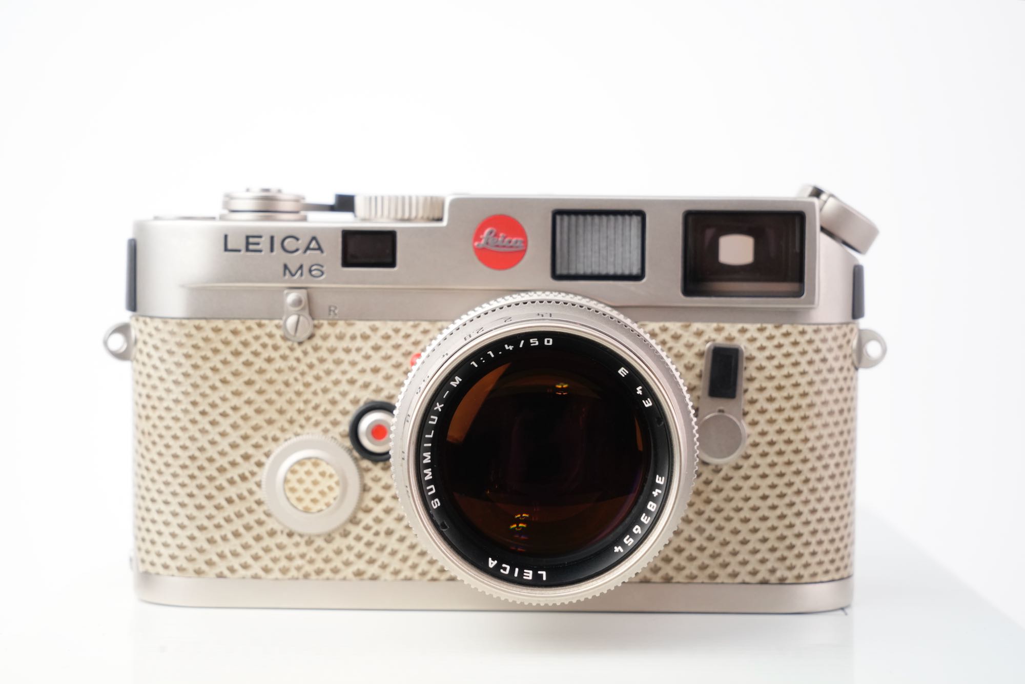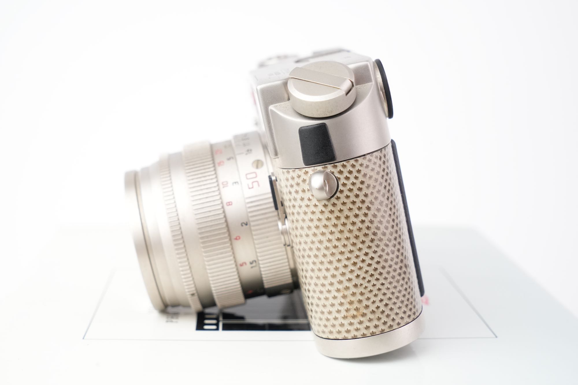 Splendide coffret Leica pour un double anniversaire : les 150 ans de la photographie (1839-1989) et les 75 ans de la photographie au Leica (1914-1989). On y trouve un boîtier M6 plaqué platine avec un gainage en cuir exotique (karung) et son objectif Summilux-M 50mm f/1.4 également plaqué platine. L'état mécanique est à revoir, avec des vitesses lentes HS. La cellule photométrique est opérationnelle ainsi que la selection d'ISO. Le rideau est en bel état, sans défauts. Les lentilles de l'objectif sont impeccables. Ce dernier est fluide tant dans la mise au point que la sélection du diaphragme. On note un viseur clair et un télémètre contrasté. Le tout est en très bon état, le film plastique est toujours présent sur la semelle. Seulement 1000 modèles produits. L'ensemble vient avec son coffret en bois, les boites d'origine, la documentation et le certificat ainsi que les accessoires (bouchons, lanière). N°E034. Pour collectionneurs passionnés.