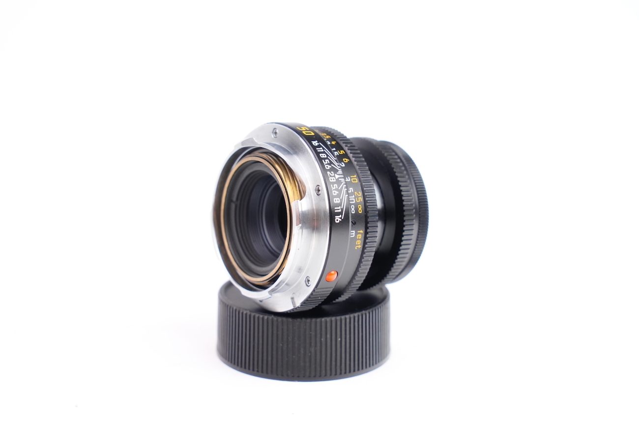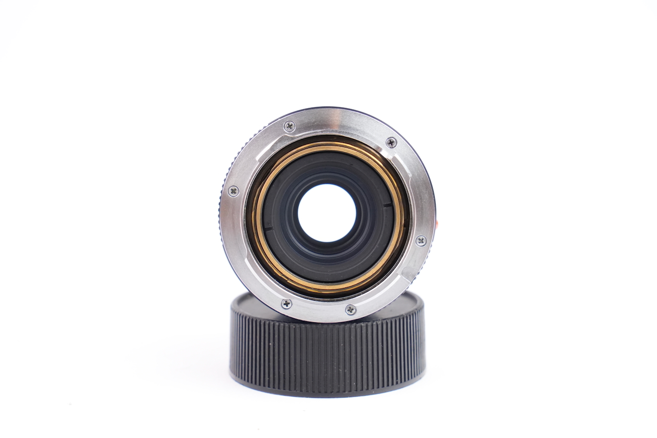 Objectif du fabricant allemand Leitz en monture Leica M. La focale est de 50mm et le diaphragme ouvre à f/2.8. Les lentilles sont en bon état, pas de décollement, pas de champignon, pas de brume mais quelques poussières. Les bagues de diaphragme et de mise au point sont fluides. Vient avec son bouchon avant, arrière ainsi que son pare-soleil. Très bel état. Numéro 3702437.