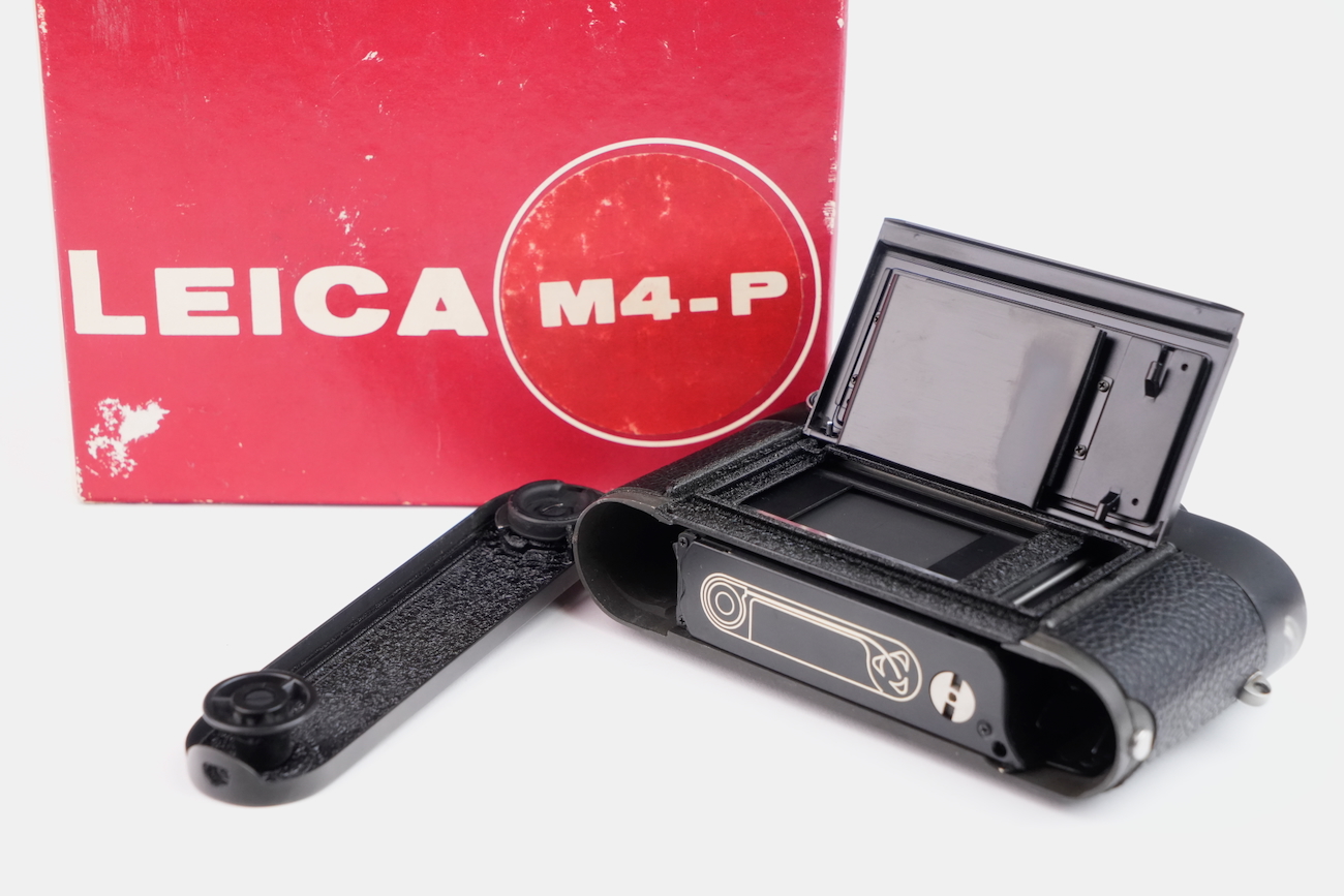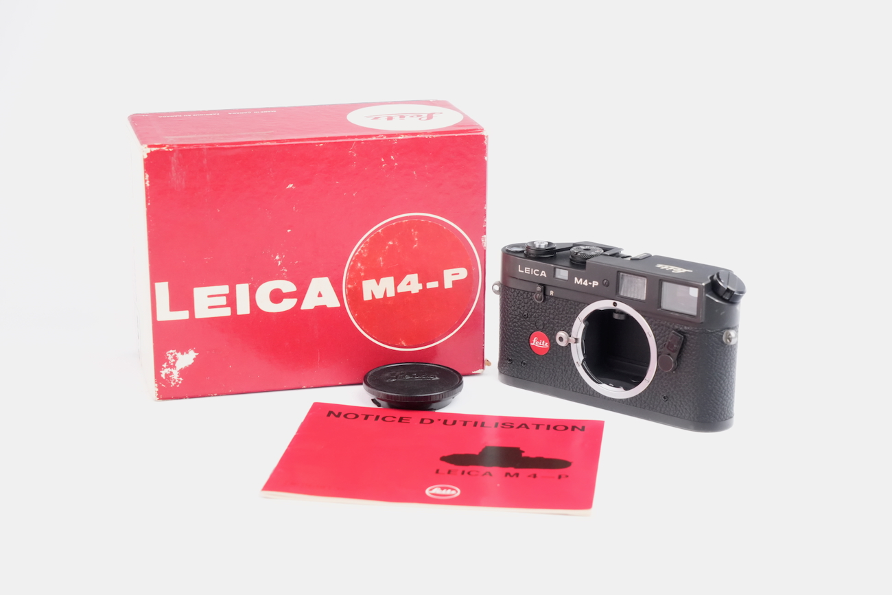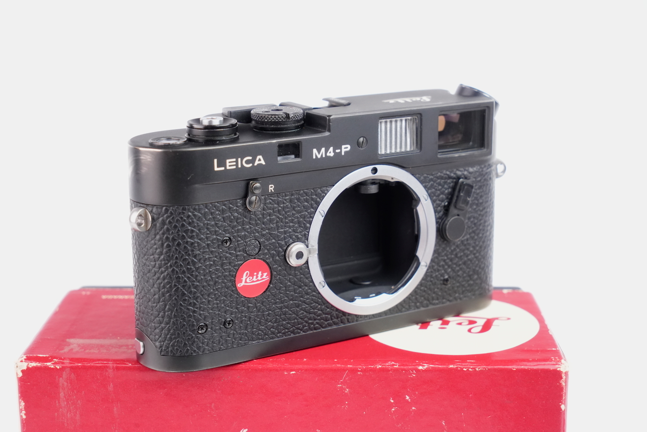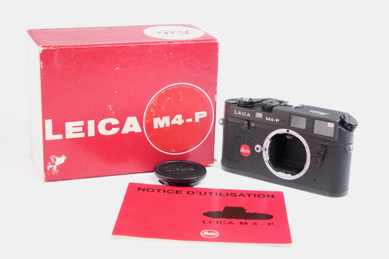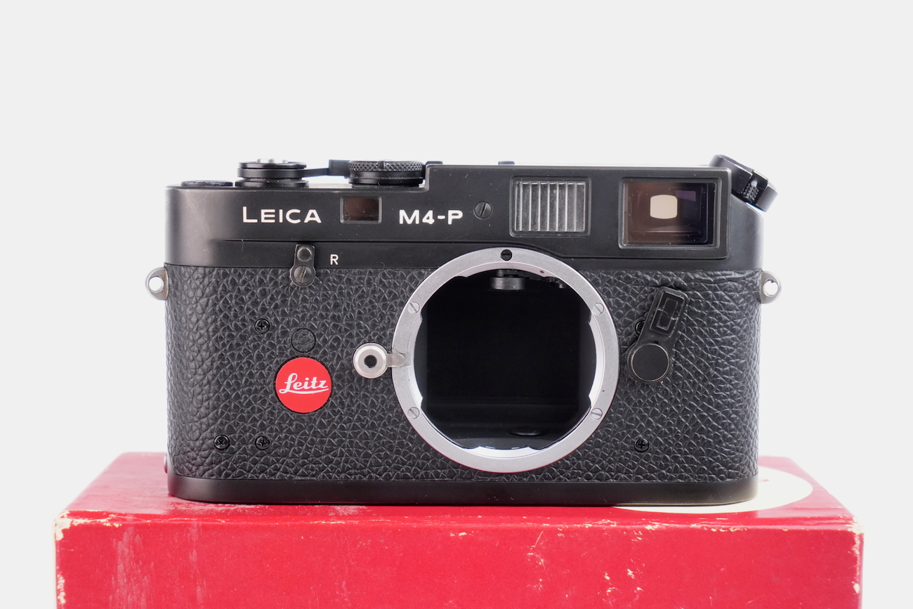 Le Leica M4-P, à destination des professionnels, est le successeur perfectionné du M4-2. Le présent appareil comporte les cadres de visée qui deviendront la norme après lui : le 28mm, le 35mm, le 50mm, le 75mm, le 90mm et le 135mm. On dénote quelques traces d'utilisation sur le boitier : on relève de l'usure sur la semelle et sur le capot. L'appareil semble avoir été regainé puisque les textures de la fenêtre arrière et du reste du corps ne sont pas les mêmes. On pourra aussi noter le placement curieux du logo qui n'est pas aligné au centre sur le bouton de déverrouillage de l'objectif. Bouton qui est noir (!) et non pas rouge. Malgré ces transformations, le boîtier réagit correctement et comporte bien les cadres de visée du M4-P. L'état mécanique est satisfaisant : les rideaux sont en bon état, le viseur est clair et télémètre contrasté, les vitesses semblent justes. Numéro de boîtier 1533246, datant de 1980. Un léger mystère plane autour de la numérotation de ce boitier, selon le registre Leitz, il s'agirait d'un M4-2…