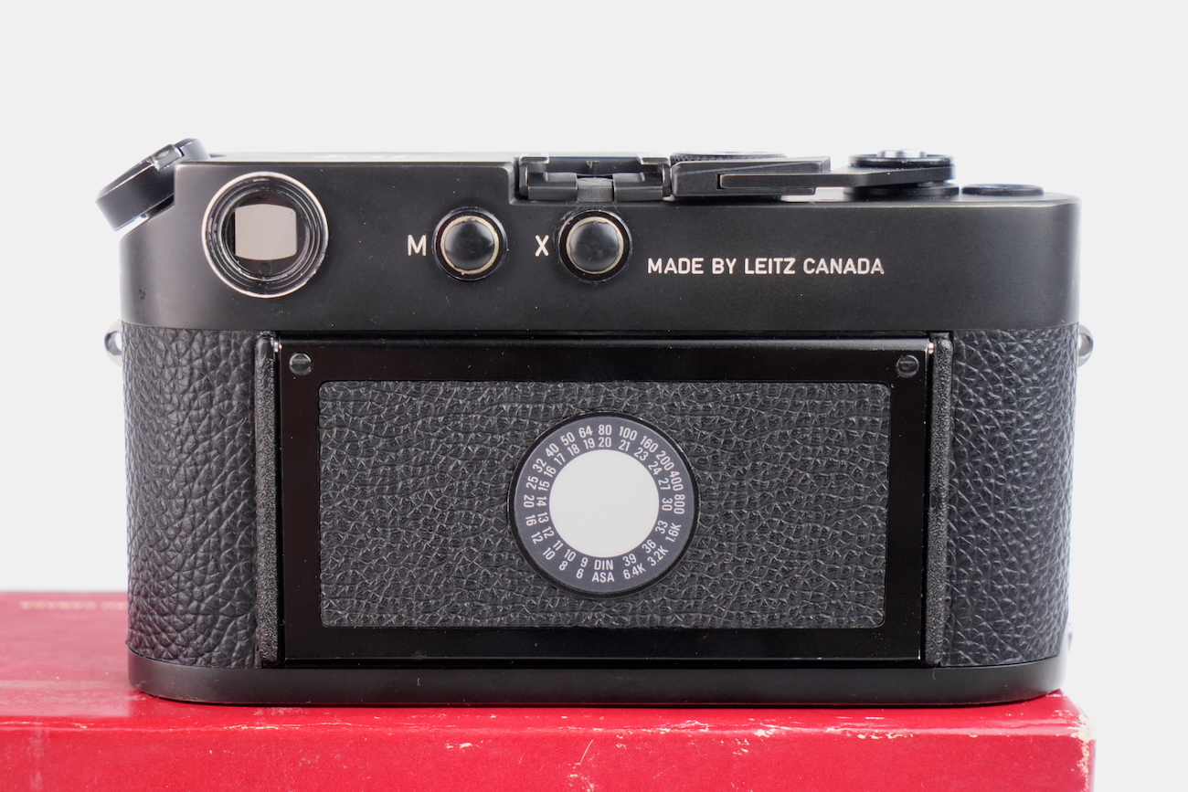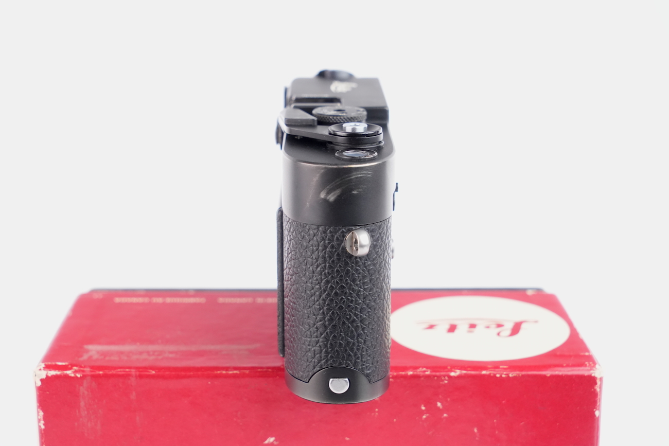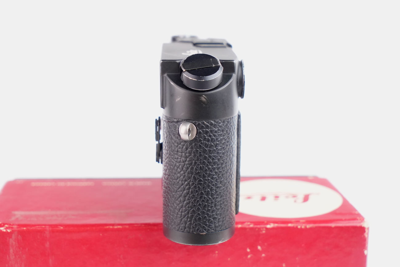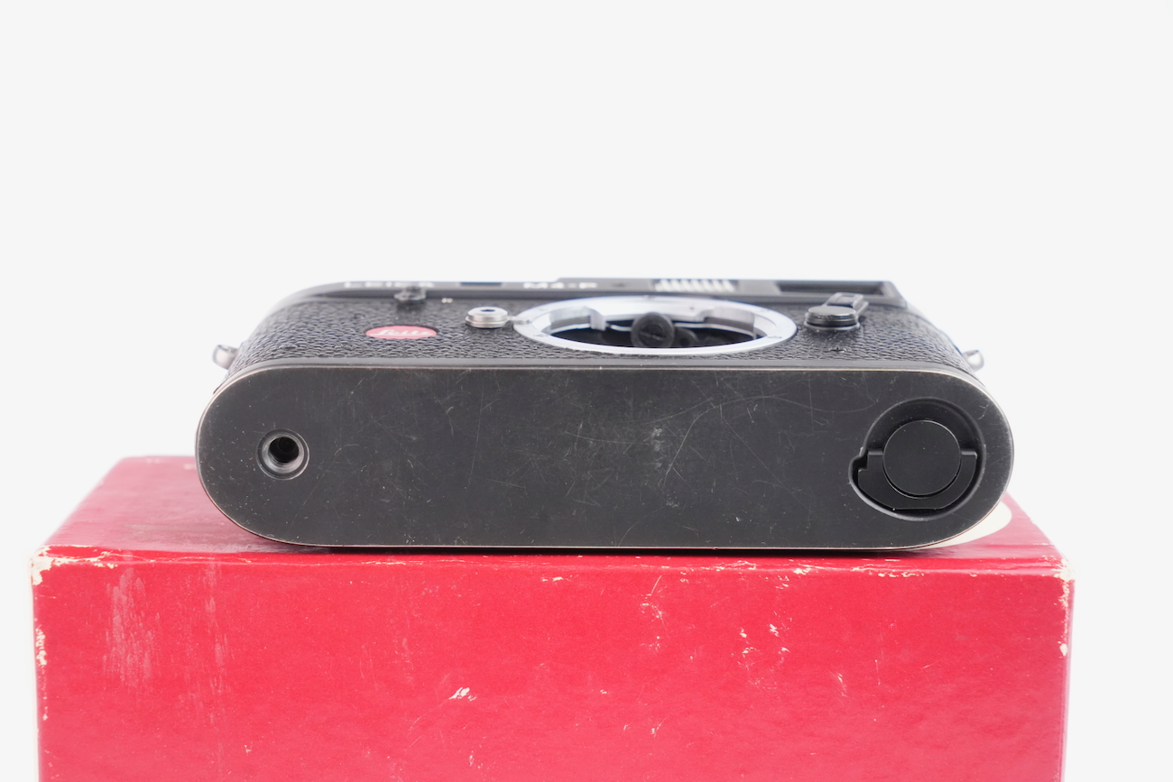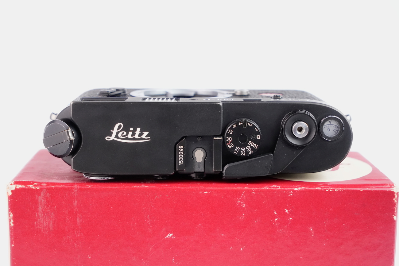 Le Leica M4-P, à destination des professionnels, est le successeur perfectionné du M4-2. Le présent appareil comporte les cadres de visée qui deviendront la norme après lui : le 28mm, le 35mm, le 50mm, le 75mm, le 90mm et le 135mm. On dénote quelques traces d'utilisation sur le boitier : on relève de l'usure sur la semelle et sur le capot. L'appareil semble avoir été regainé puisque les textures de la fenêtre arrière et du reste du corps ne sont pas les mêmes. On pourra aussi noter le placement curieux du logo qui n'est pas aligné au centre sur le bouton de déverrouillage de l'objectif. Bouton qui est noir (!) et non pas rouge. Malgré ces transformations, le boîtier réagit correctement et comporte bien les cadres de visée du M4-P. L'état mécanique est satisfaisant : les rideaux sont en bon état, le viseur est clair et télémètre contrasté, les vitesses semblent justes. Numéro de boîtier 1533246, datant de 1980. Un léger mystère plane autour de la numérotation de ce boitier, selon le registre Leitz, il s'agirait d'un M4-2…