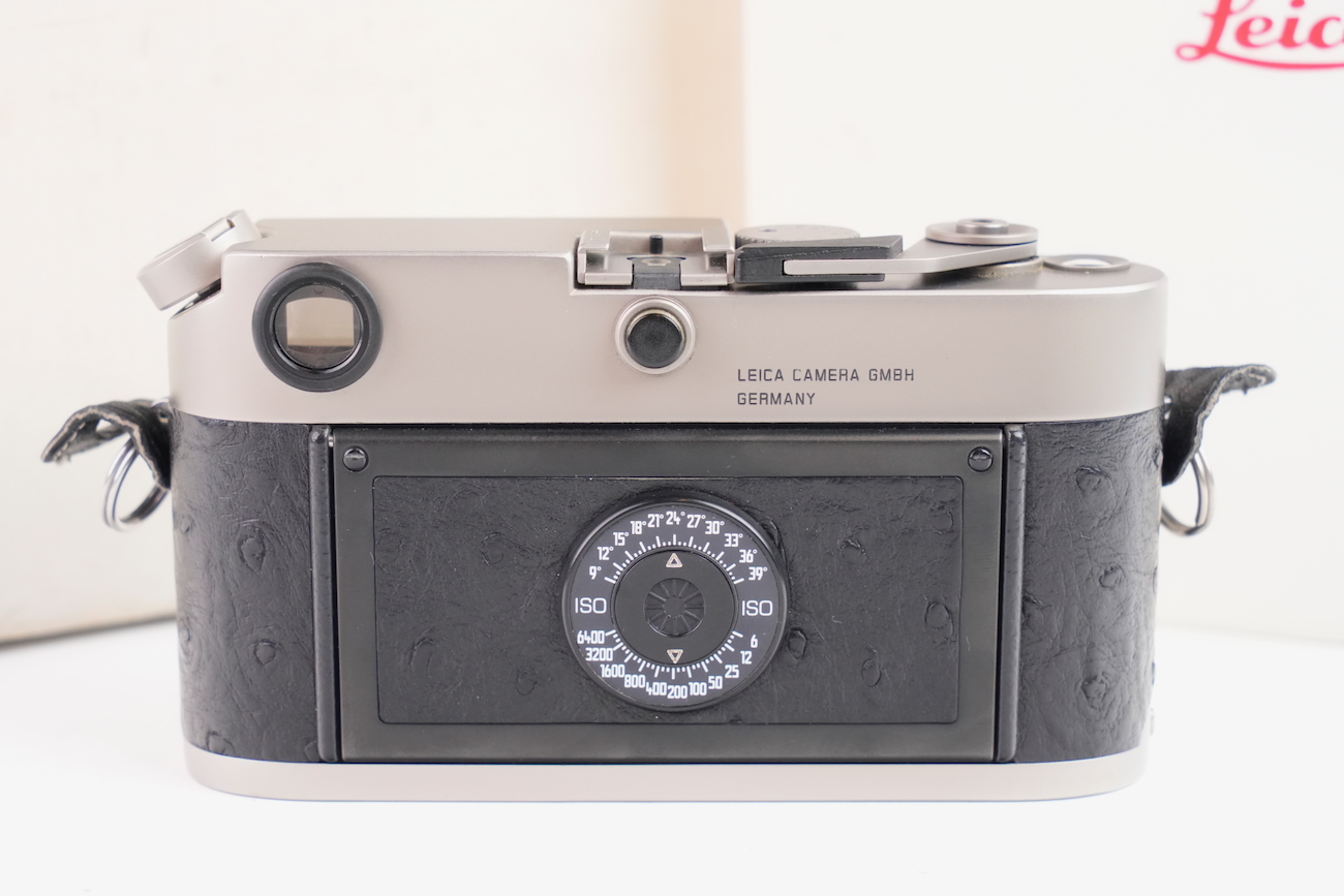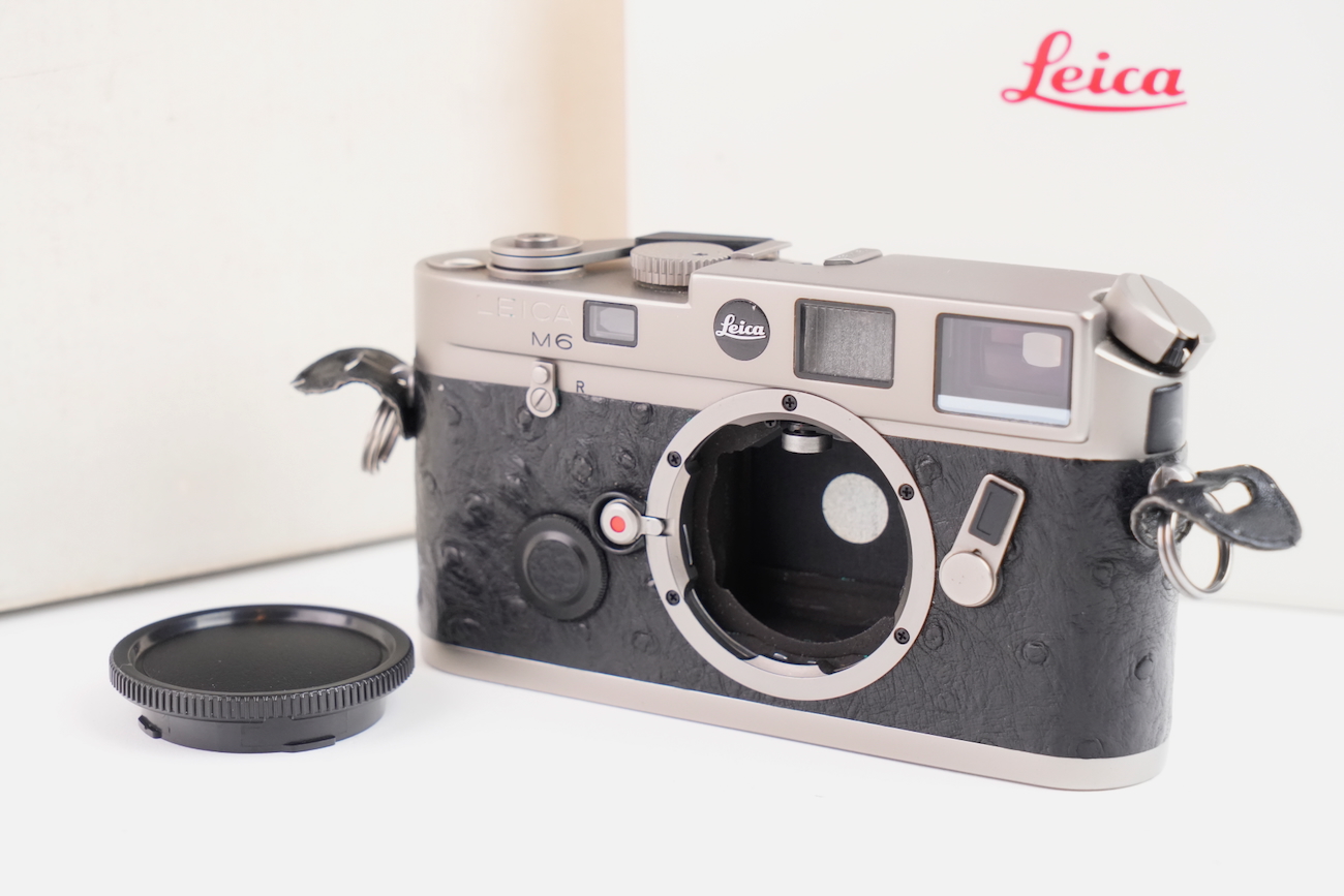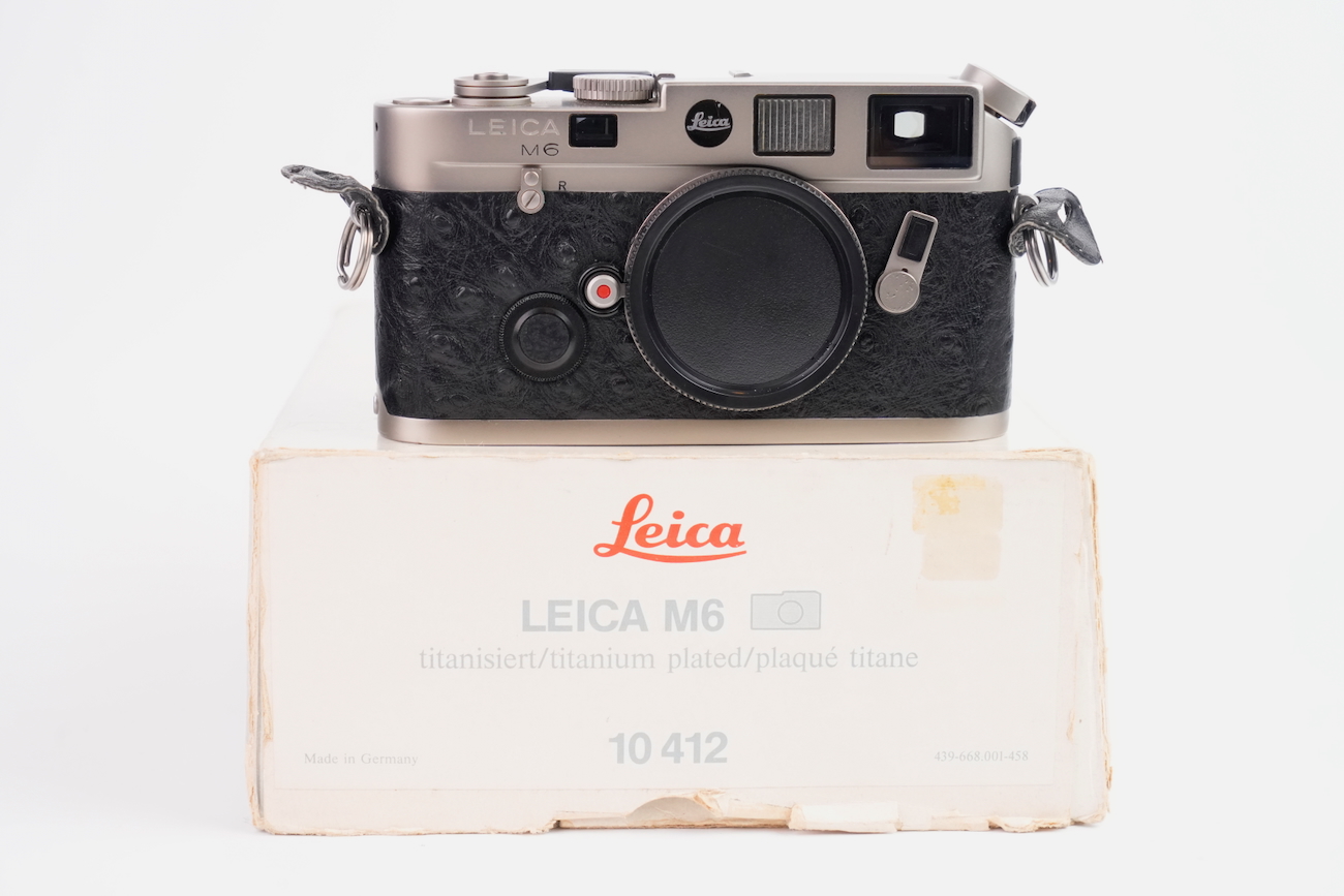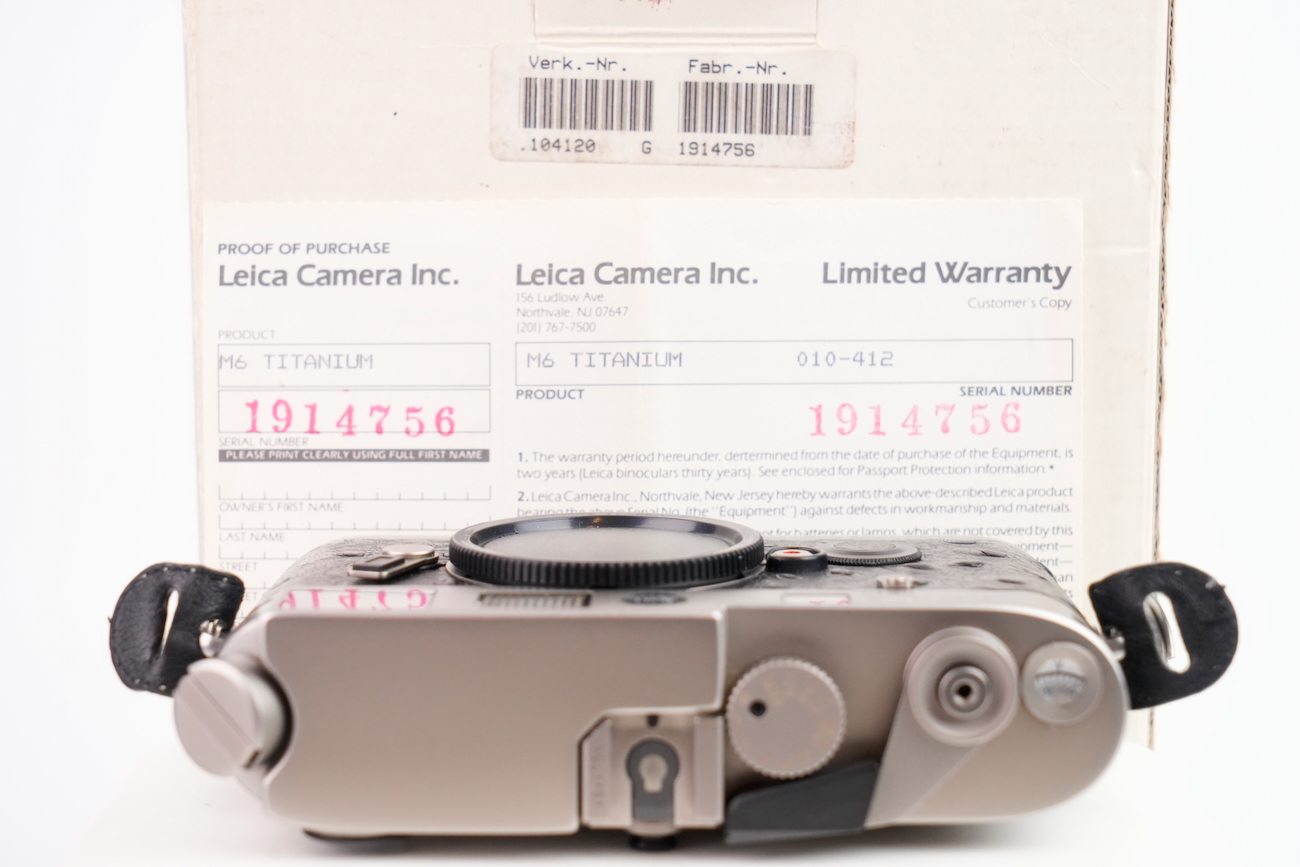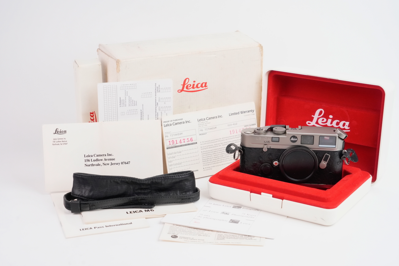 Boîtier télémétrique 35 mm Leica M6 en titanium, production des années 1990. Ce modèle date de 1992. Habillage spécifique noir à texture marquée, imitation emu, conforme à la série Titan. Bouton frontal Leica noir, variante d’origine. Bon état mécanique, l'obturateur fonctionne, les vitesses sont justes, le télémètre est contrasté, rideaux en bon état, la cellule fonctionne de même que le sélecteur d'ISO. État cosmétique bon, on déplore cependant des manques de peinture au niveau du sigle en façade et de la molette de vitesses. Boîtier seul, monture Leica M. Numéro de série 1914756. Vient avec sa documentation, sa sangle et ses boites.