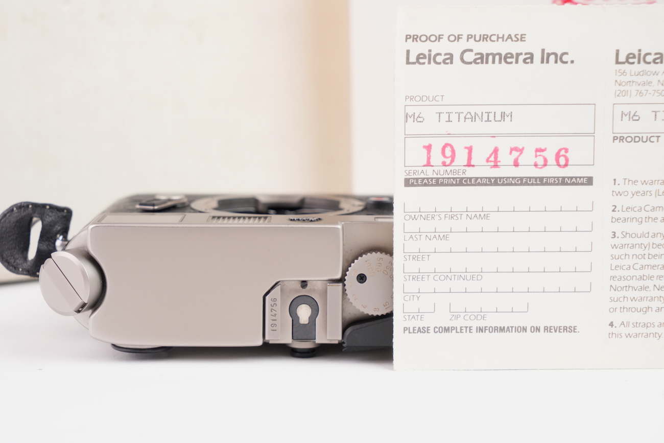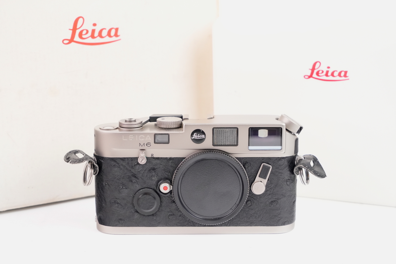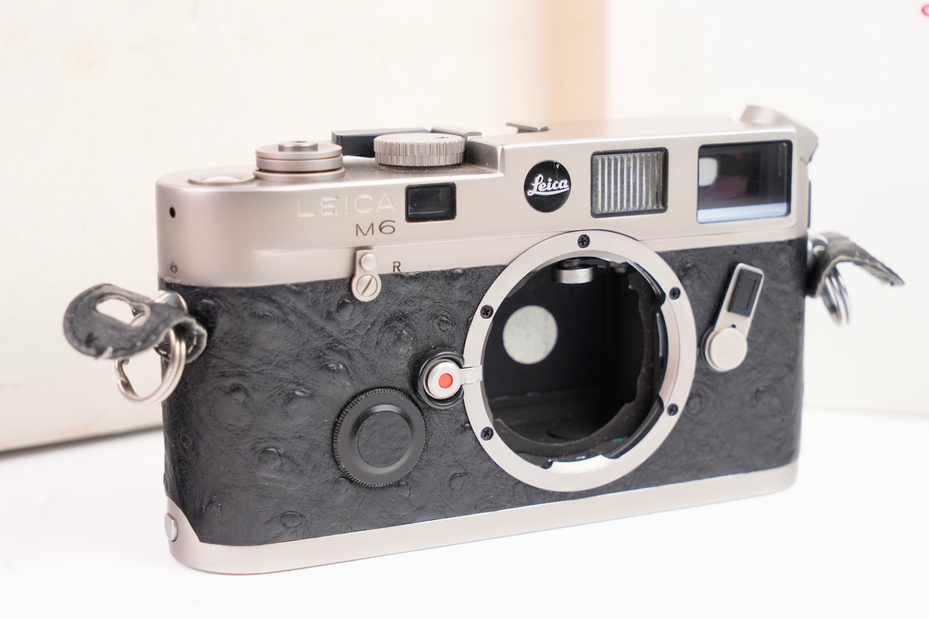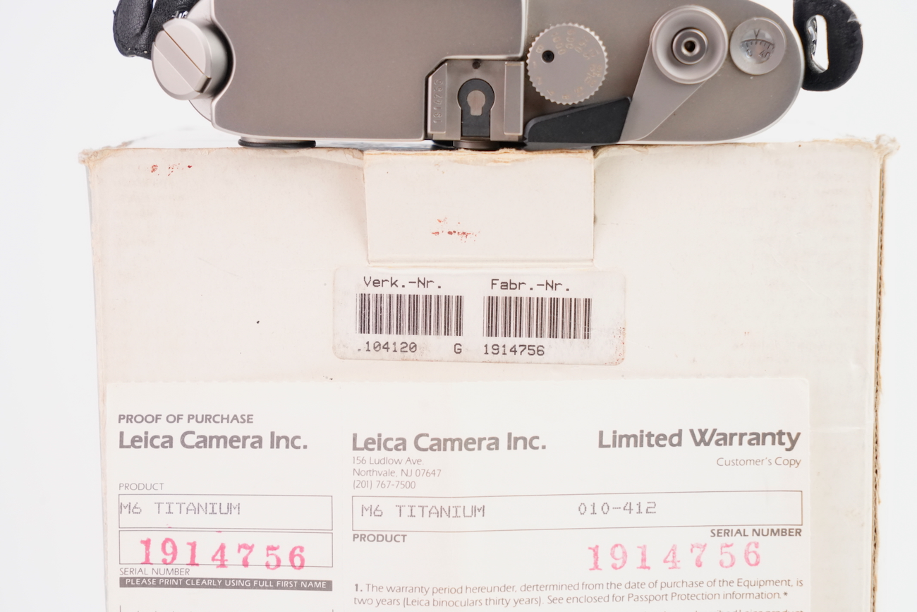 Boîtier télémétrique 35 mm Leica M6 en titanium, production des années 1990. Ce modèle date de 1992. Habillage spécifique noir à texture marquée, imitation emu, conforme à la série Titan. Bouton frontal Leica noir, variante d’origine. Bon état mécanique, l'obturateur fonctionne, les vitesses sont justes, le télémètre est contrasté, rideaux en bon état, la cellule fonctionne de même que le sélecteur d'ISO. État cosmétique bon, on déplore cependant des manques de peinture au niveau du sigle en façade et de la molette de vitesses. Boîtier seul, monture Leica M. Numéro de série 1914756. Vient avec sa documentation, sa sangle et ses boites.