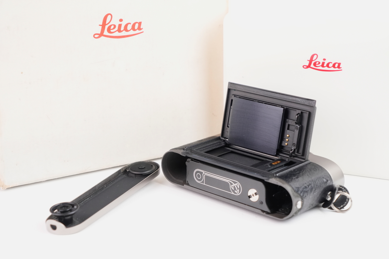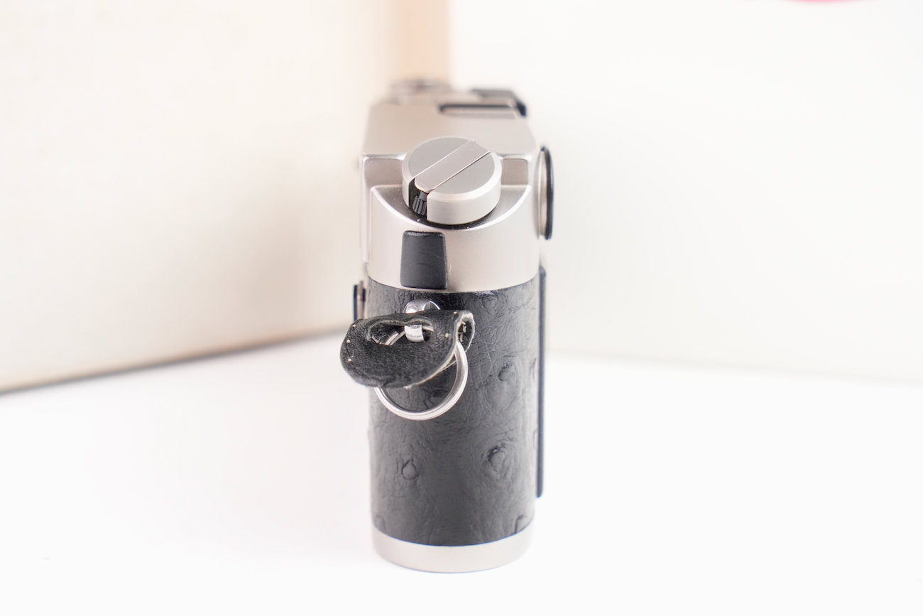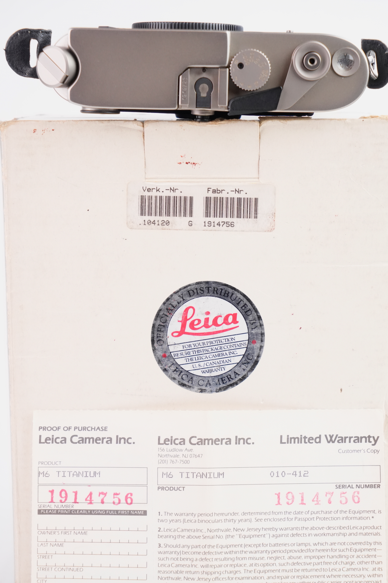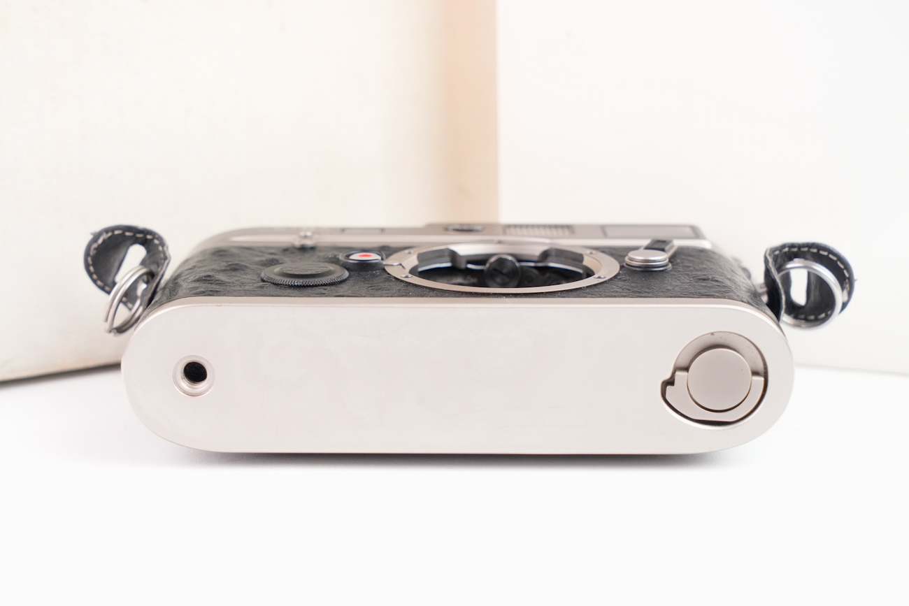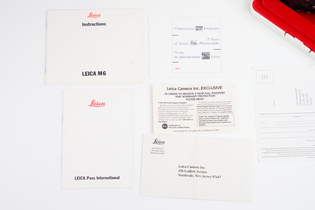 Boîtier télémétrique 35 mm Leica M6 en titanium, production des années 1990. Ce modèle date de 1992. Habillage spécifique noir à texture marquée, imitation emu, conforme à la série Titan. Bouton frontal Leica noir, variante d’origine. Bon état mécanique, l'obturateur fonctionne, les vitesses sont justes, le télémètre est contrasté, rideaux en bon état, la cellule fonctionne de même que le sélecteur d'ISO. État cosmétique bon, on déplore cependant des manques de peinture au niveau du sigle en façade et de la molette de vitesses. Boîtier seul, monture Leica M. Numéro de série 1914756. Vient avec sa documentation, sa sangle et ses boites.