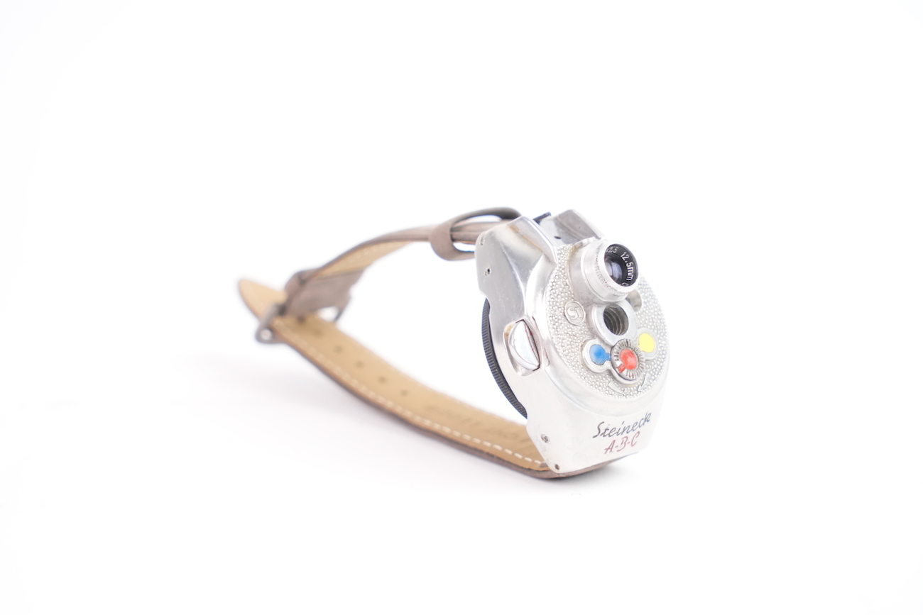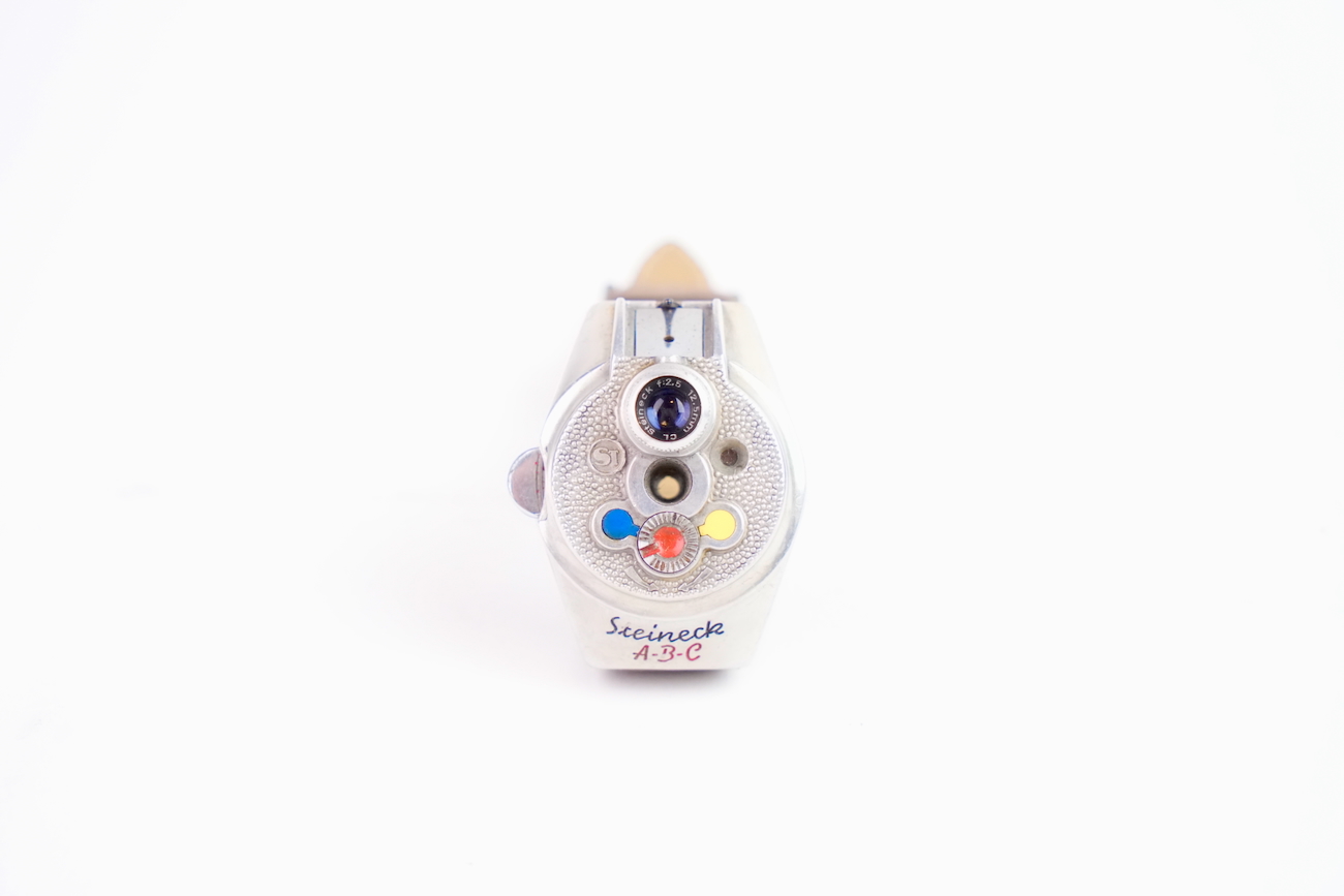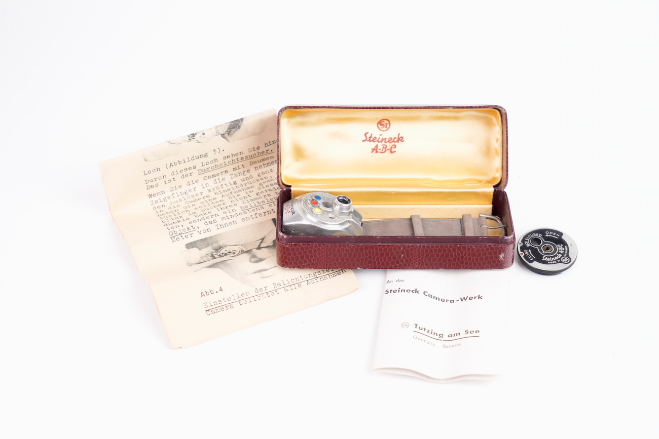 Steineck ABC Wristwatch camera est un appareil espion montre-bracelet. Cet appareil espion a été fabriqué en Allemagne par Steineck Kamerawerk en 1948. Il s’agit d’un appareil photographique subminiature pour disques de 25 mm de diamètre. Il permet de faire 8 poses de 7 mm de diamètre. Objectif Steinheil VI à ouverture fixe de 12,5 mm f / 2,8. Obturateur rotatif à deux vitesses. Viseur direct. Très bel état. Vient avec  avec un bracelet en veau-velours de couleur taupe, sa boite de rangement de couleur bordeaux et sa documentation d'origine. Une très belle pièce de collection. Date de 1950 environ.