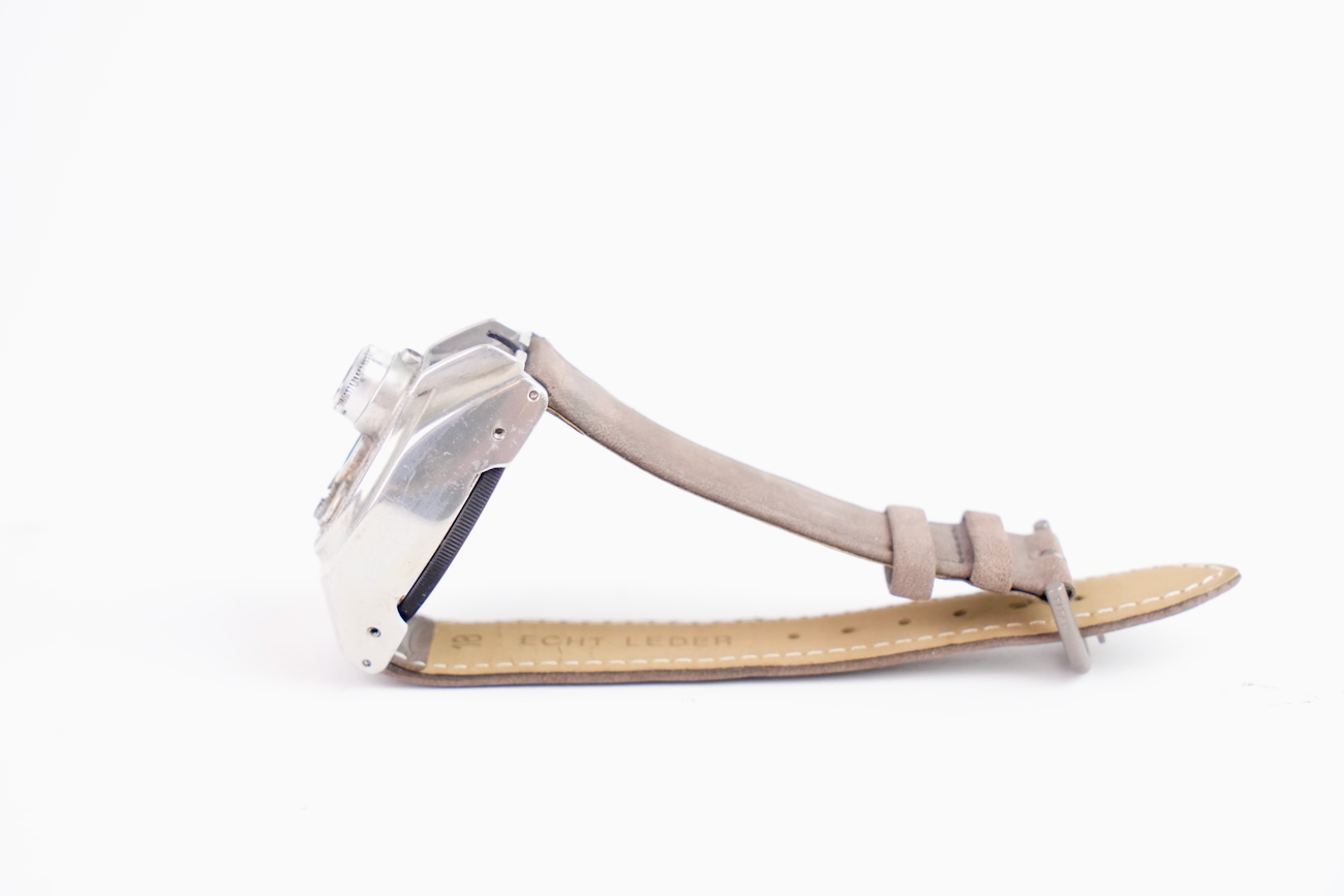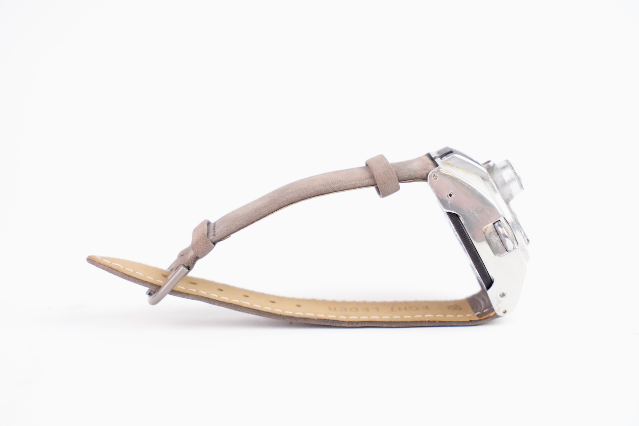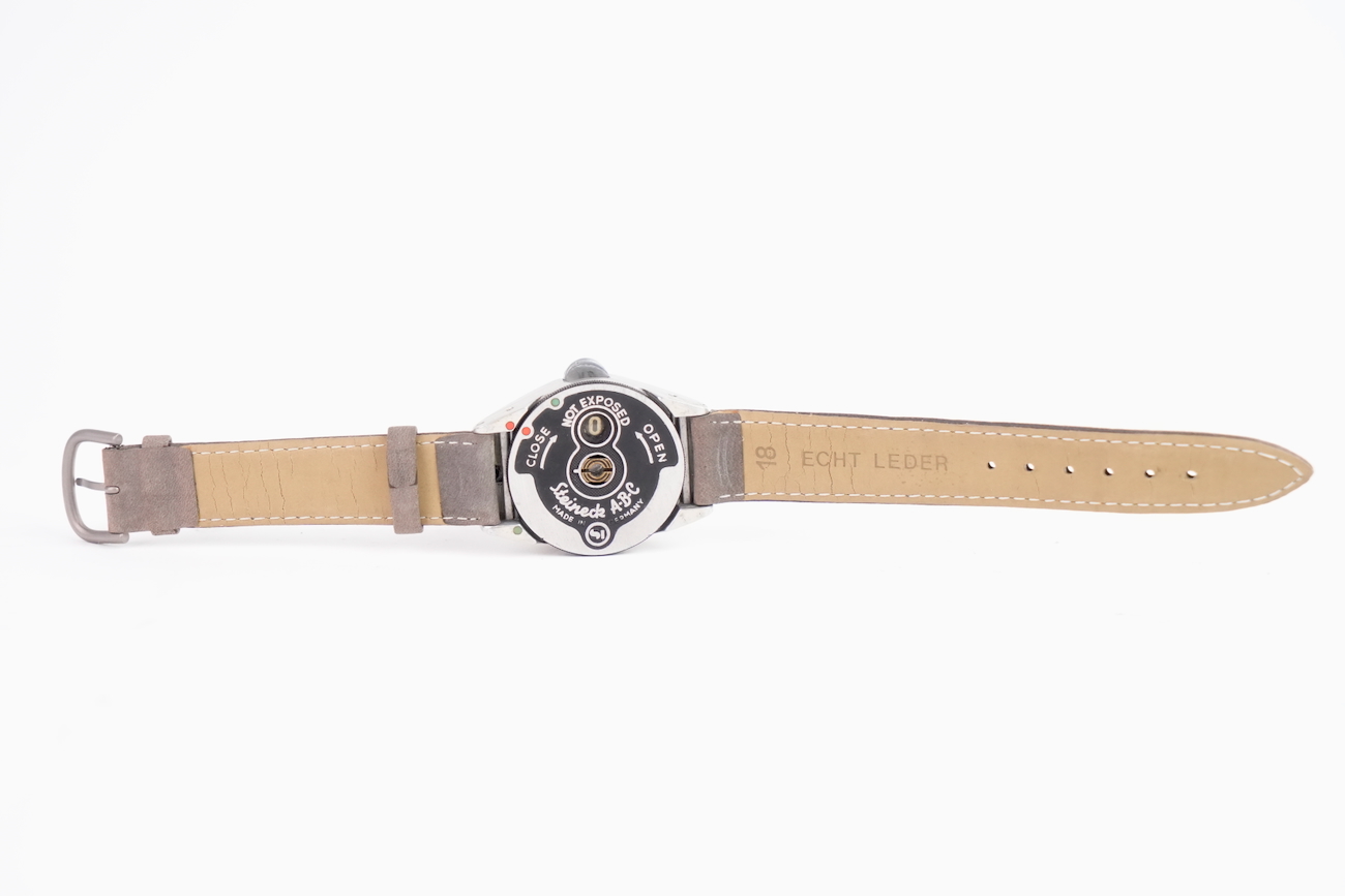 Steineck ABC Wristwatch camera est un appareil espion montre-bracelet. Cet appareil espion a été fabriqué en Allemagne par Steineck Kamerawerk en 1948. Il s’agit d’un appareil photographique subminiature pour disques de 25 mm de diamètre. Il permet de faire 8 poses de 7 mm de diamètre. Objectif Steinheil VI à ouverture fixe de 12,5 mm f / 2,8. Obturateur rotatif à deux vitesses. Viseur direct. Très bel état. Vient avec  avec un bracelet en veau-velours de couleur taupe, sa boite de rangement de couleur bordeaux et sa documentation d'origine. Une très belle pièce de collection. Date de 1950 environ.