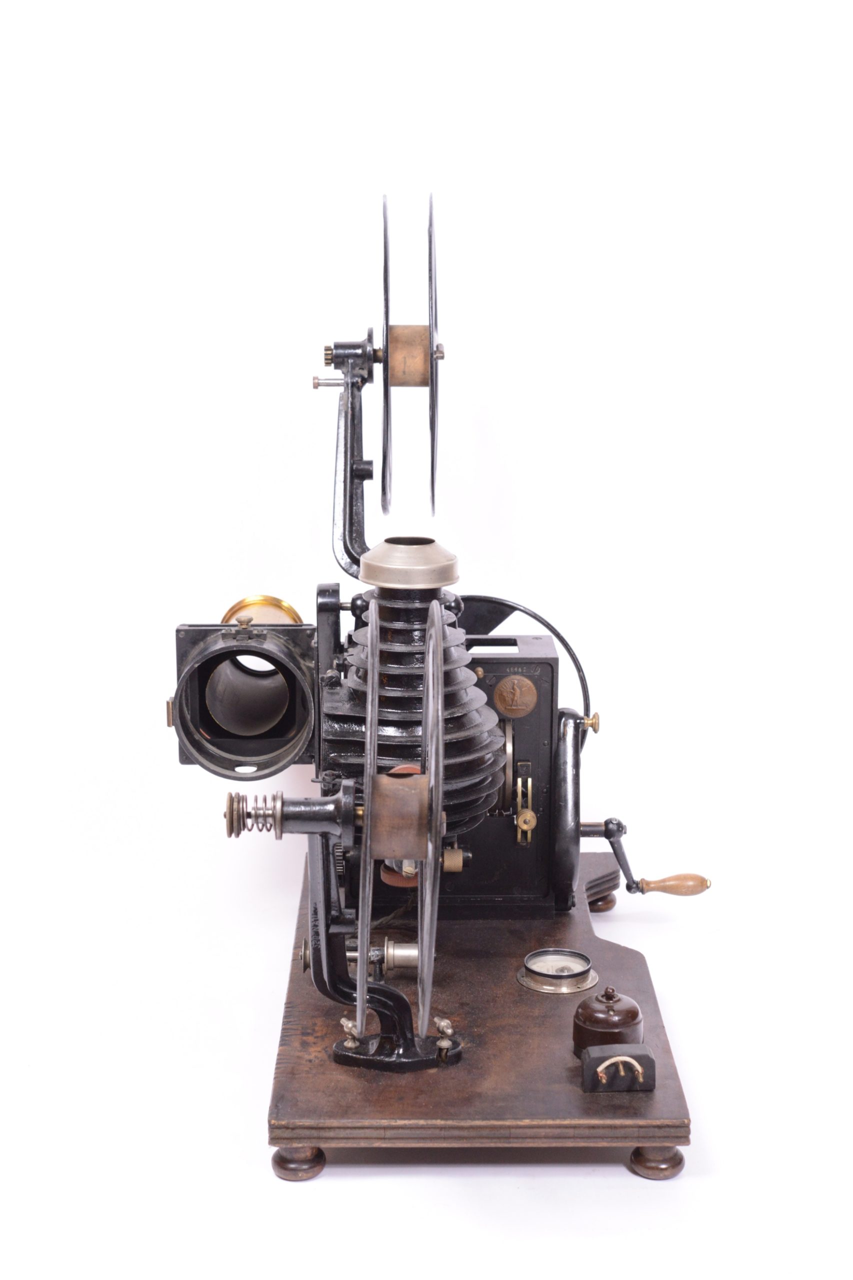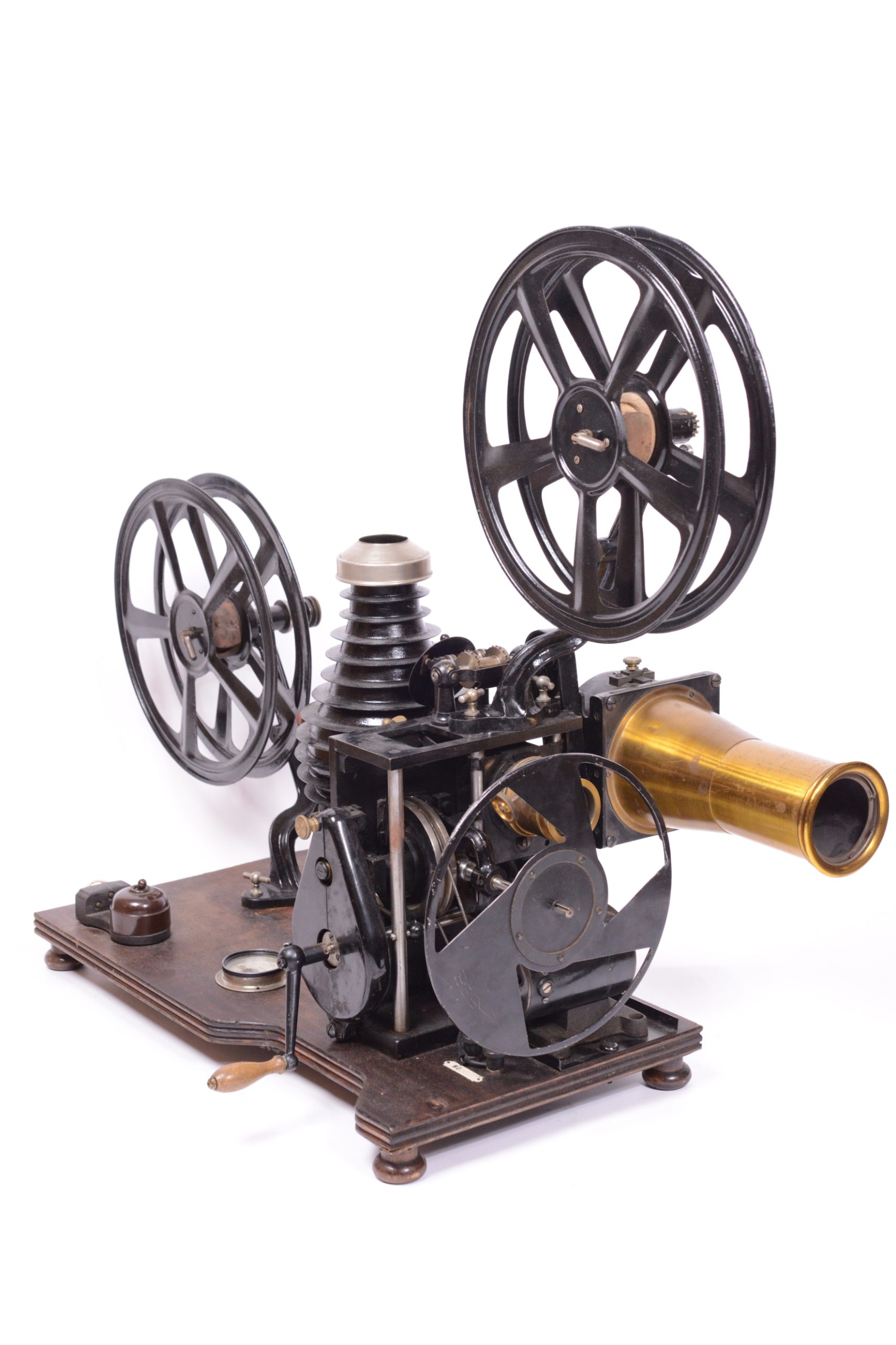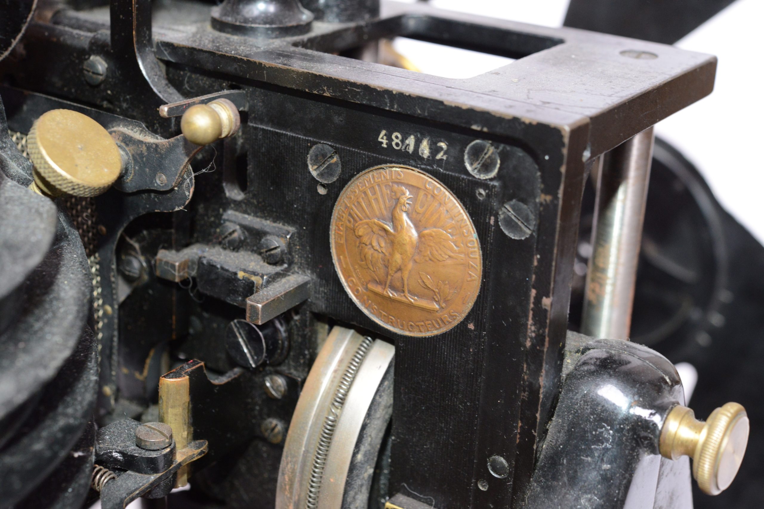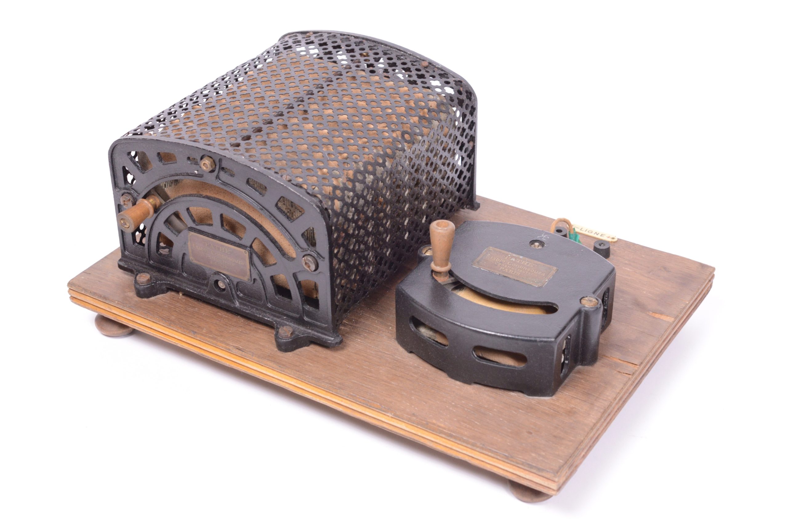 Projecteur cinématographique Pathé Renforcé de type N.A.U. Utilise du film 35 mm. Continsouza Constructeur. Modèle avec poste double permettant la projection de films animés ou la projection fixe de diapositifs. Particulièrement réservé à l’enseignement. Vers 1920. Bel état général, avec en particulier, sur planchette distincte, la présence du rare rhéostat d’origine portant la marque du constructeur. Numéro de série du chrono-projecteur 48162.