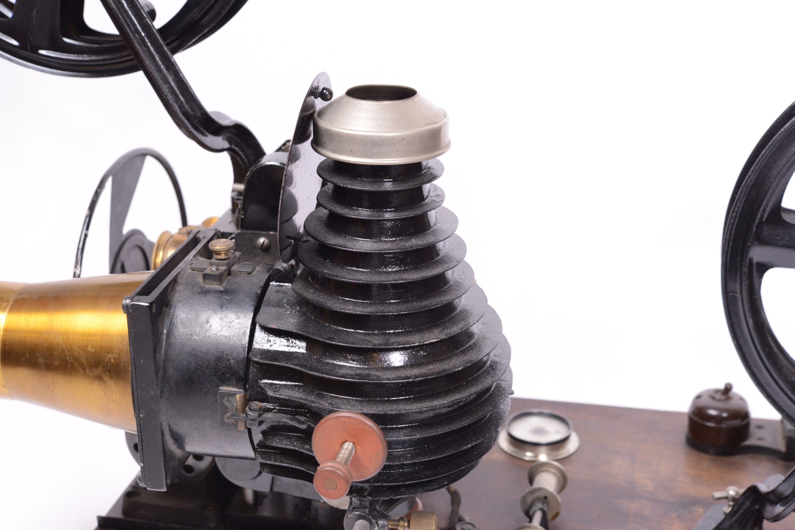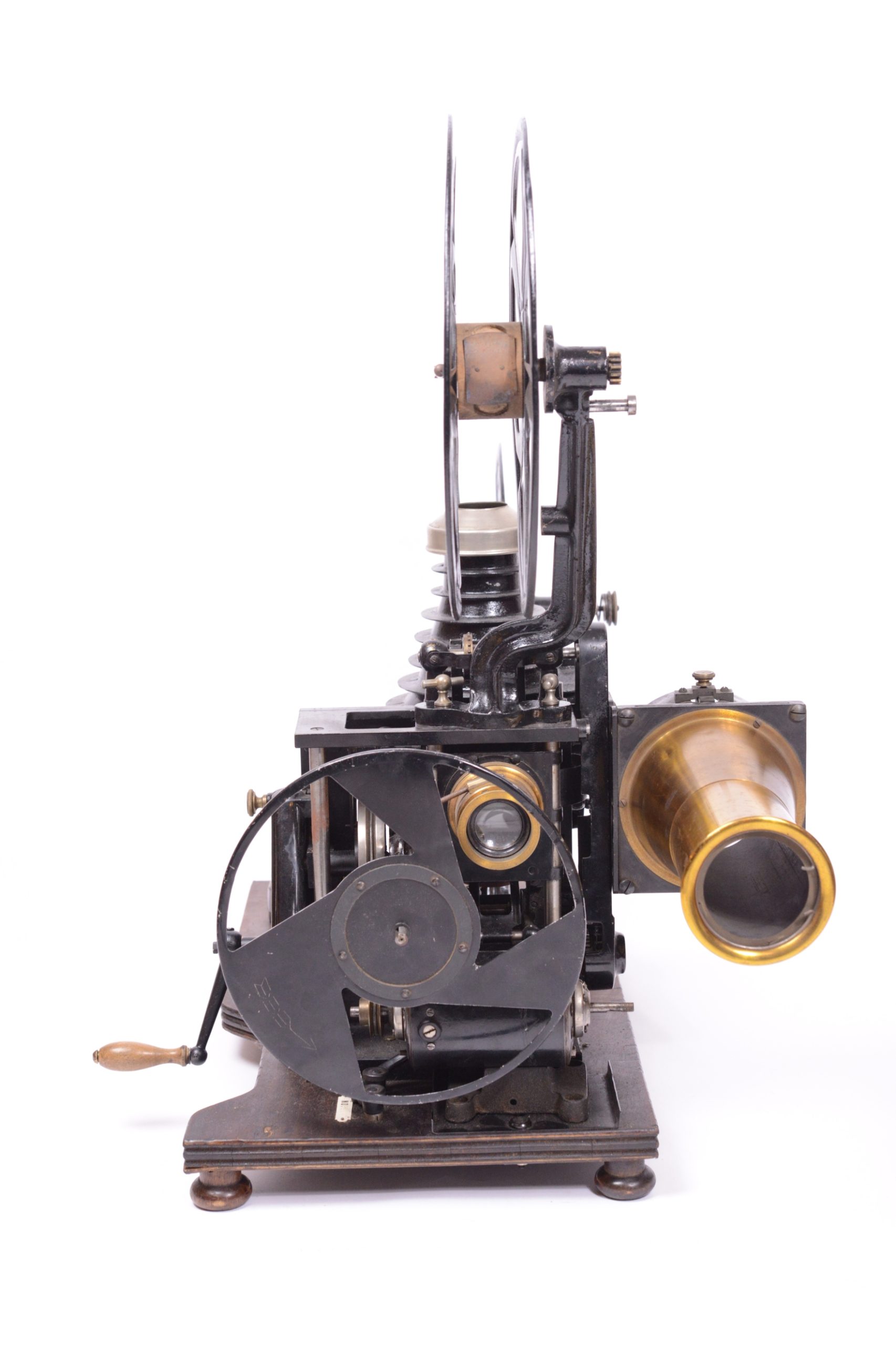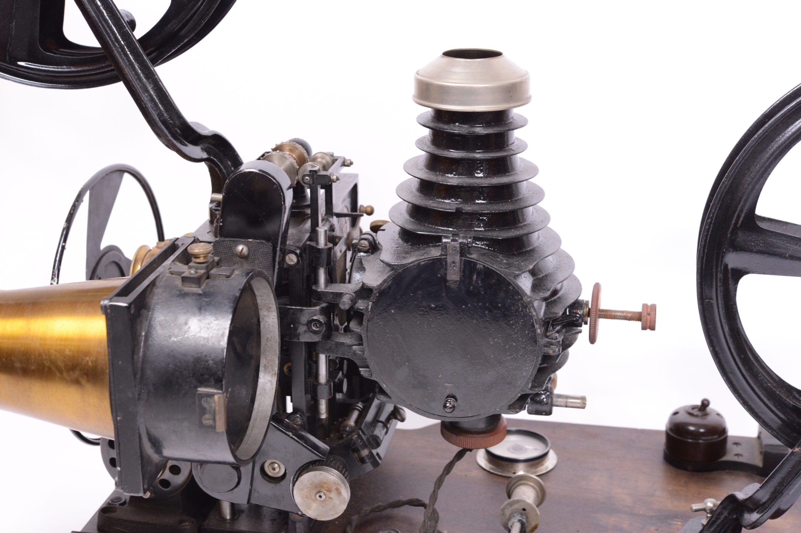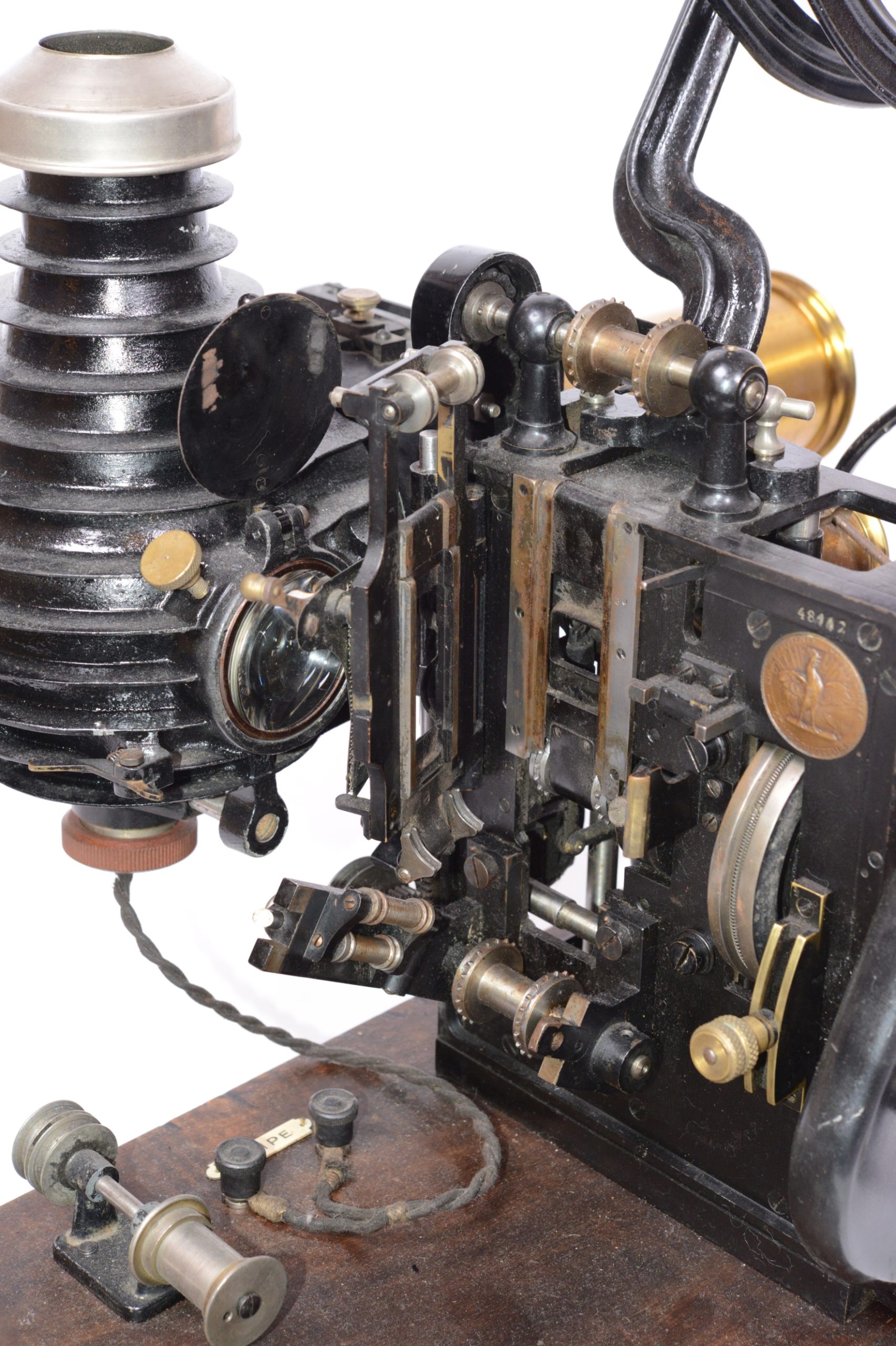 Projecteur cinématographique Pathé Renforcé de type N.A.U. Utilise du film 35 mm. Continsouza Constructeur. Modèle avec poste double permettant la projection de films animés ou la projection fixe de diapositifs. Particulièrement réservé à l’enseignement. Vers 1920. Bel état général, avec en particulier, sur planchette distincte, la présence du rare rhéostat d’origine portant la marque du constructeur. Numéro de série du chrono-projecteur 48162.