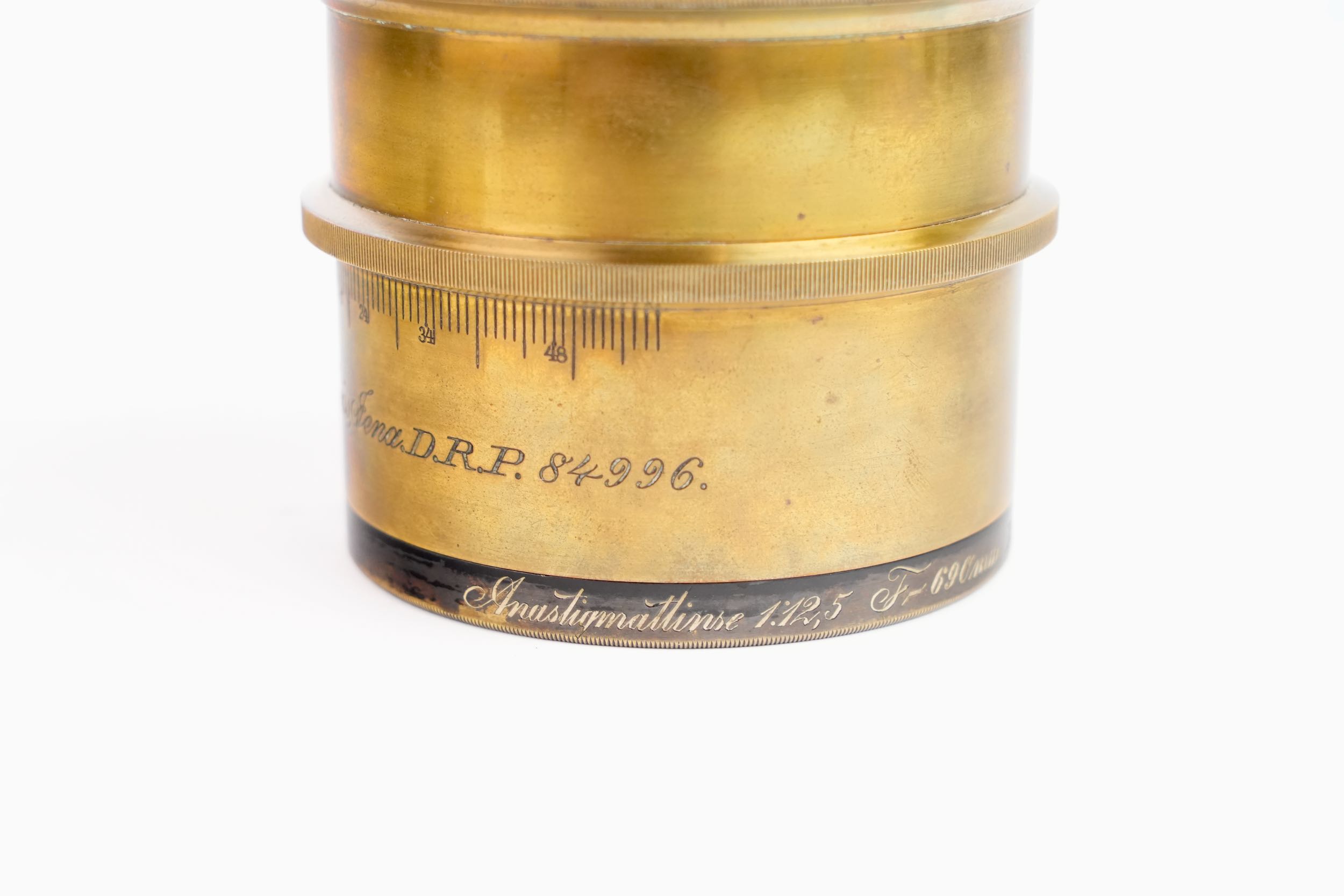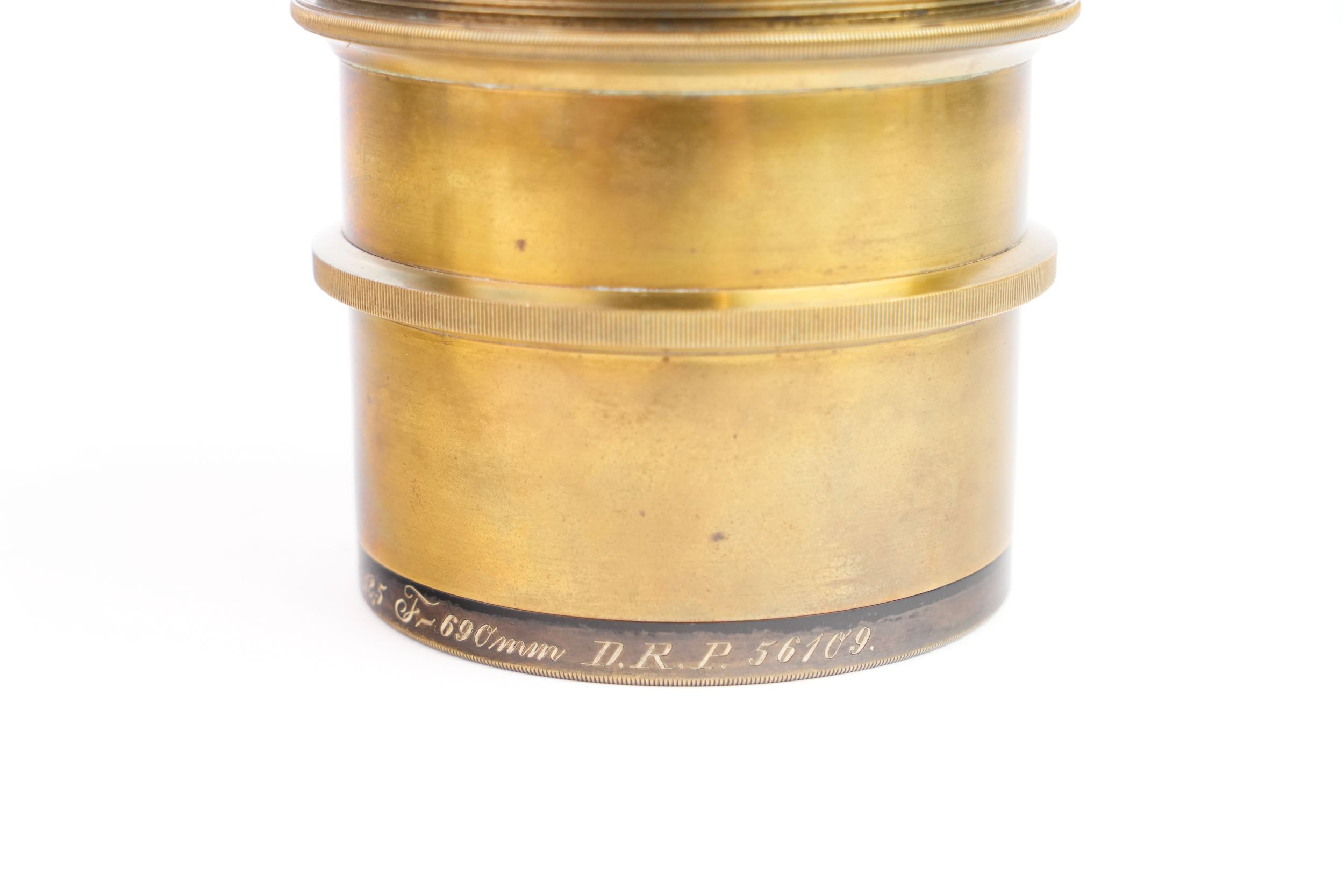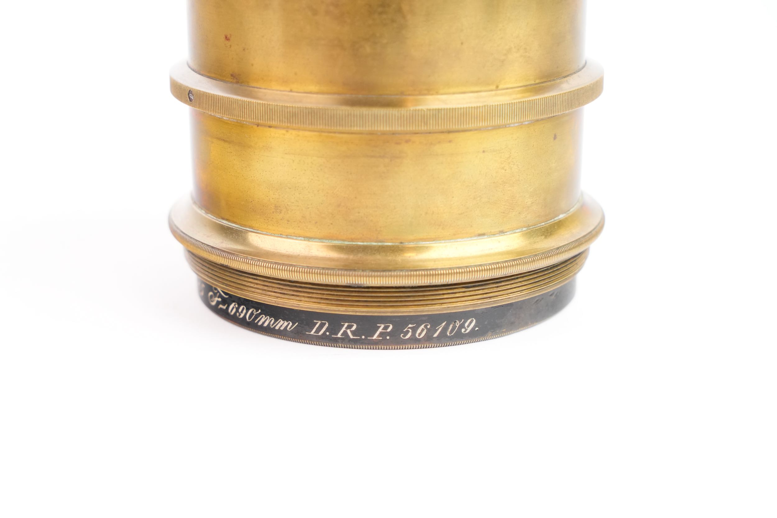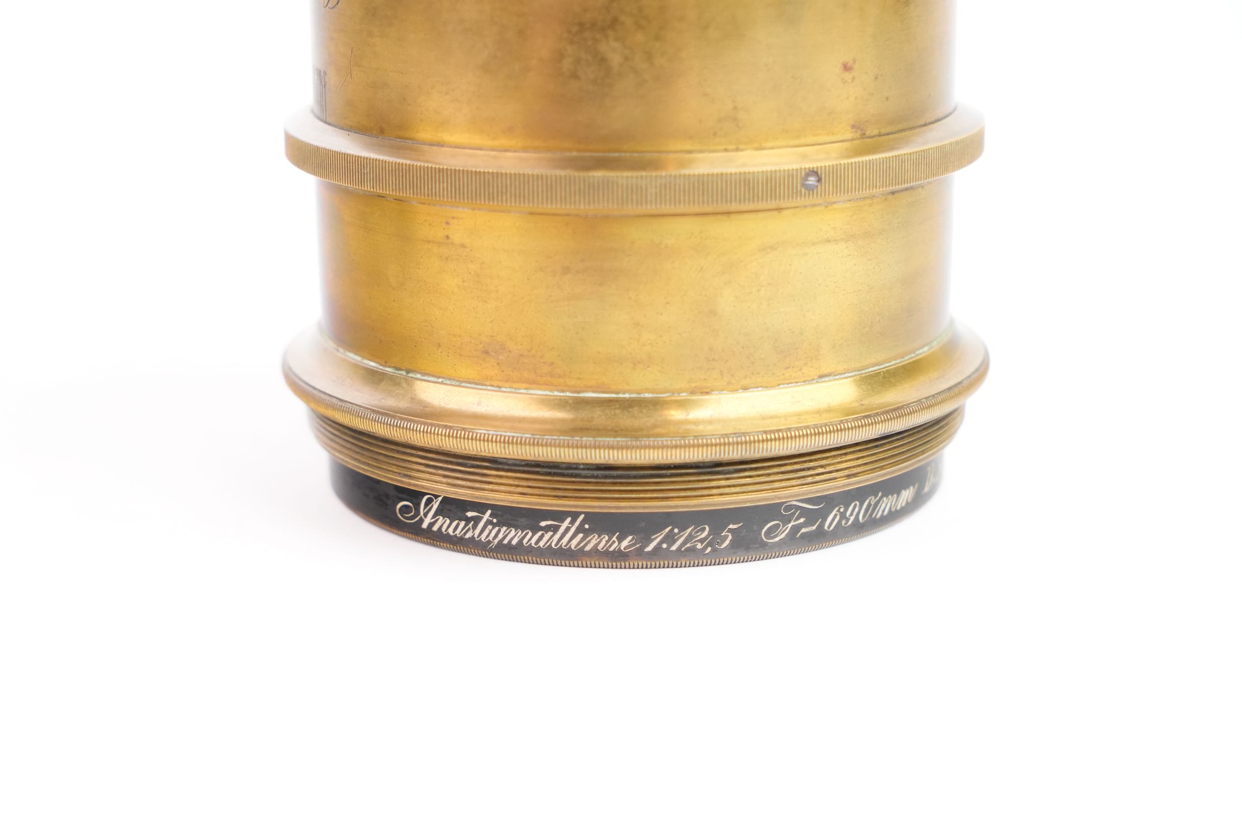Objectif photographique anastigmat Carl Zeiss Jena, portant la mention DRP 84996, type Double Protar Série VII, réalisé vers 1900 ; conçu d’après les travaux de Dr Rudolph, cet objectif appartient à la première génération d’objectifs anastigmatiques calculés scientifiquement, assurant une correction avancée des aberrations et une grande planéité de champ ; il présente une focale de 690 mm pour une ouverture de f/12,5, et offre une couverture annoncée pour le format 30 × 40 cm. Bel état des lentilles.