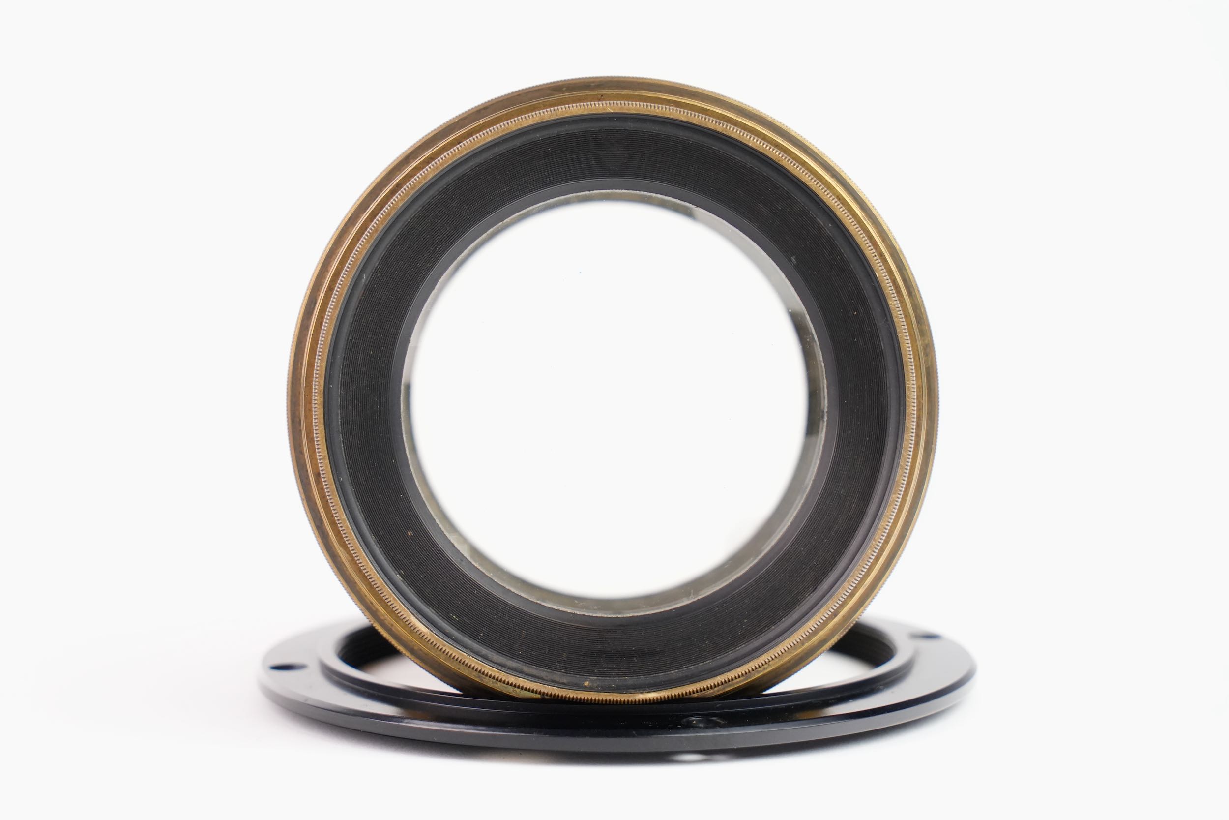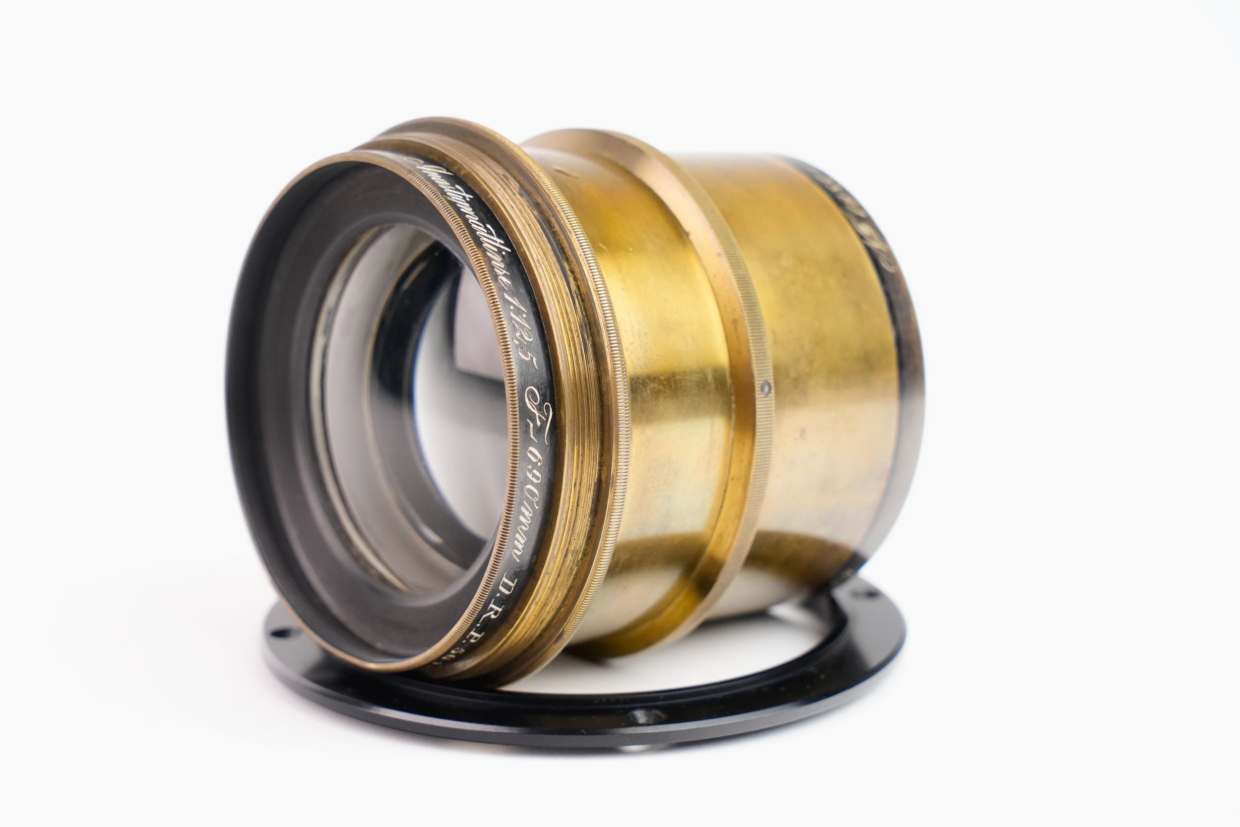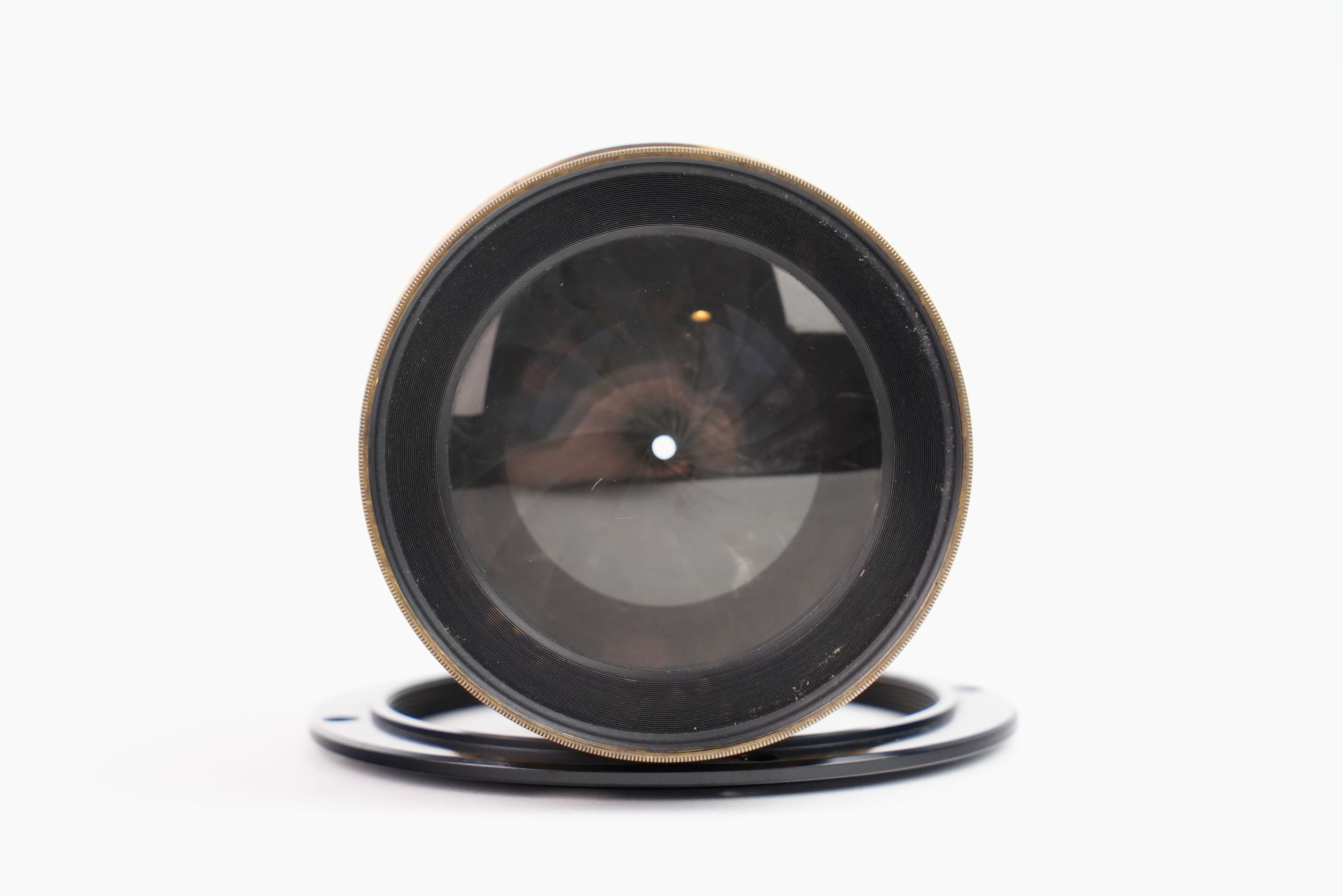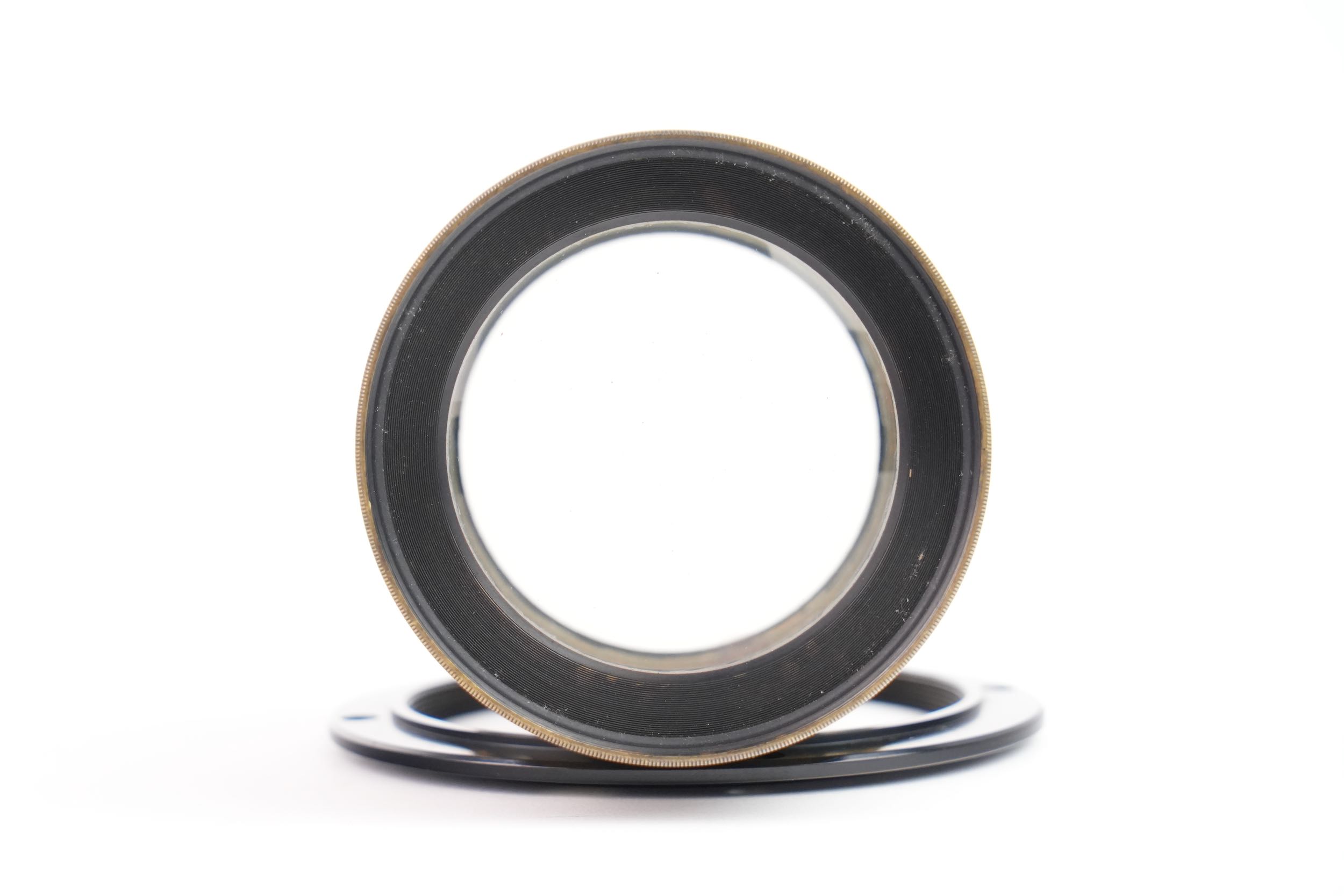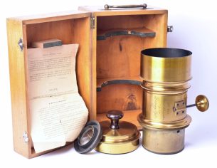 Objectif photographique anastigmat Carl Zeiss Jena, portant la mention DRP 84996, type Double Protar Série VII, réalisé vers 1900 ; conçu d’après les travaux de Dr Rudolph, cet objectif appartient à la première génération d’objectifs anastigmatiques calculés scientifiquement, assurant une correction avancée des aberrations et une grande planéité de champ ; il présente une focale de 690 mm pour une ouverture de f/12,5, et offre une couverture annoncée pour le format 30 × 40 cm. Bel état des lentilles.