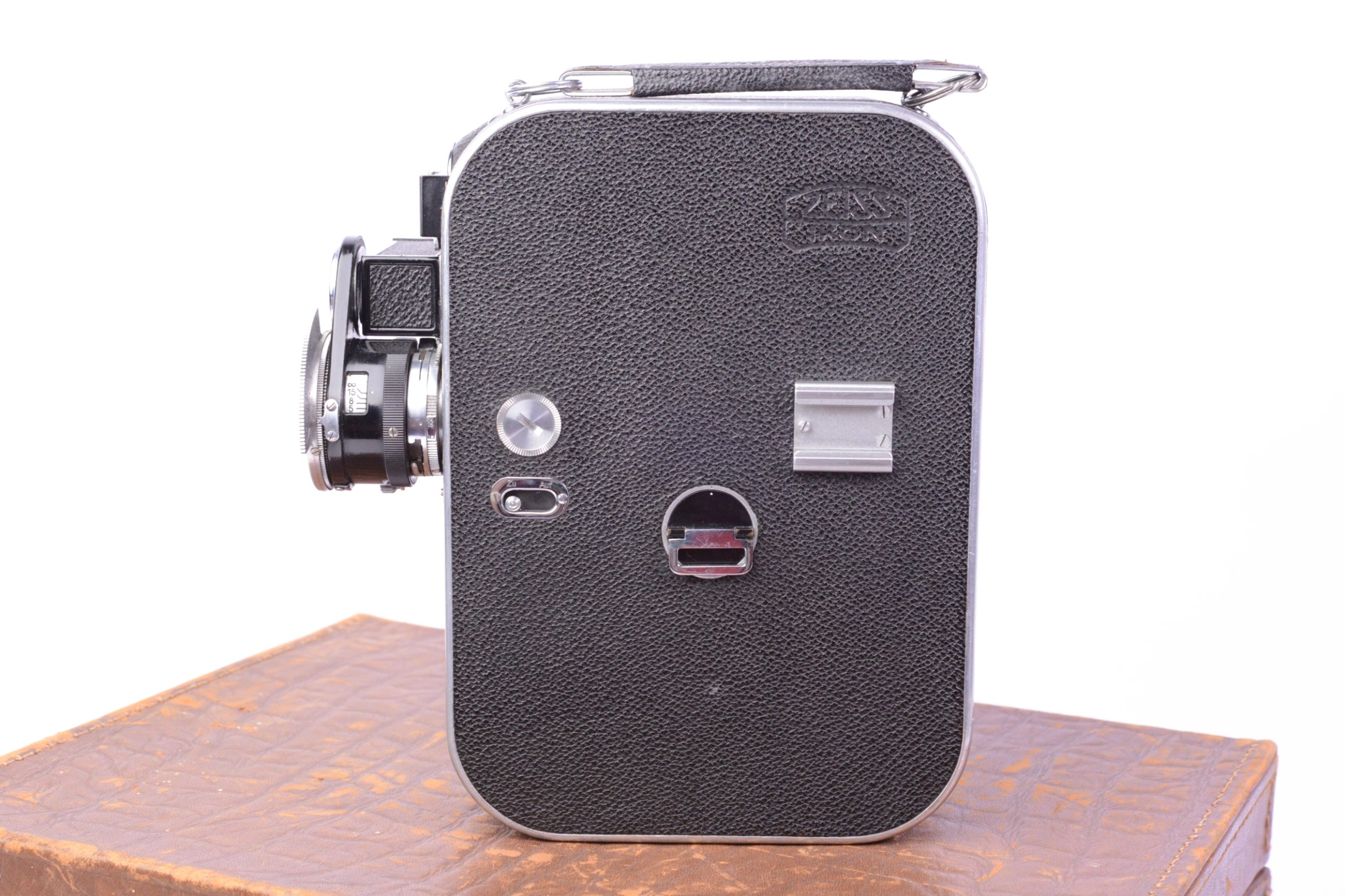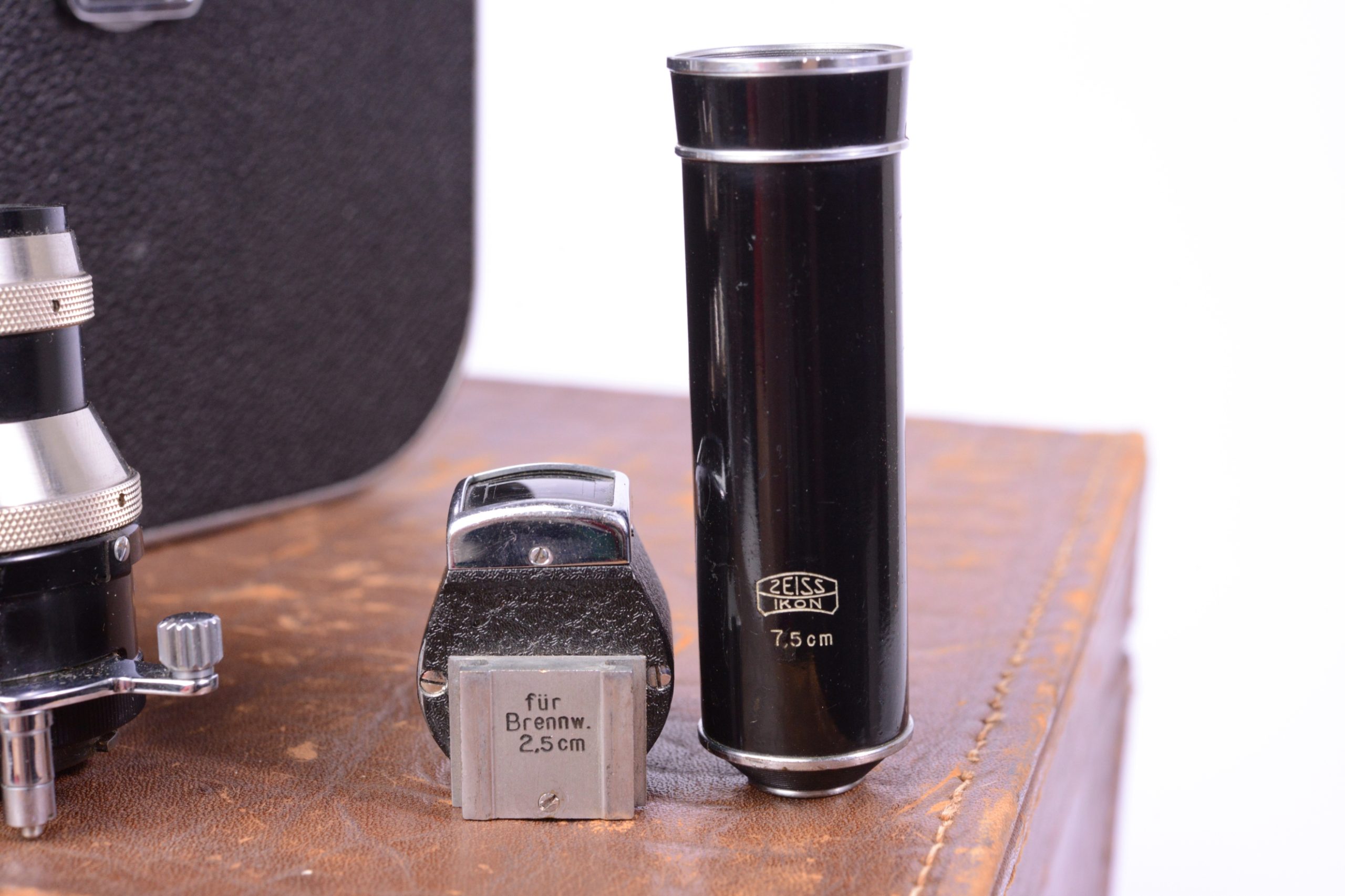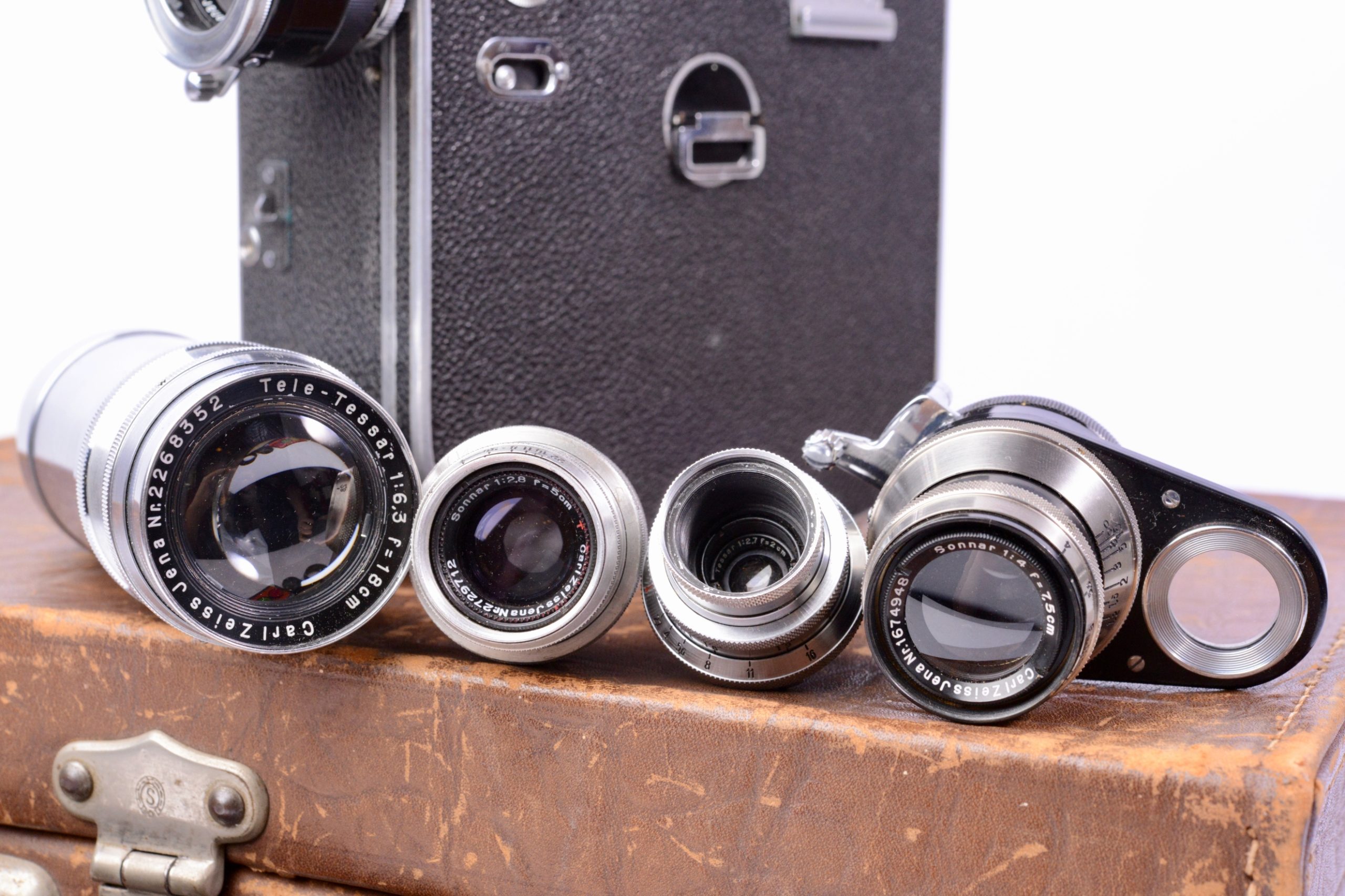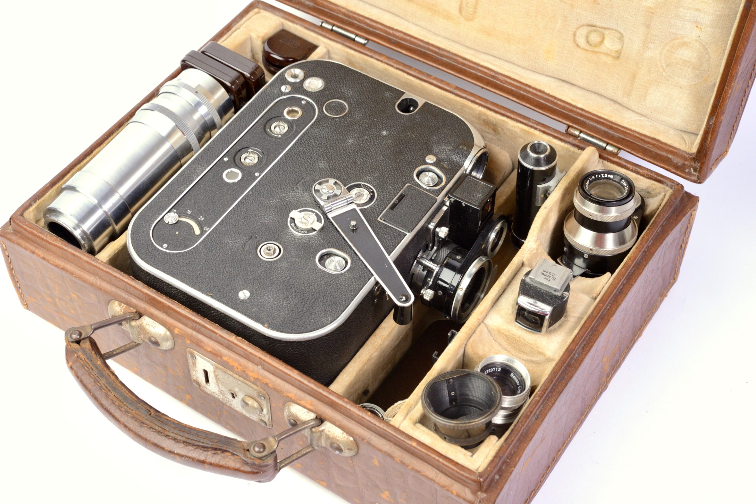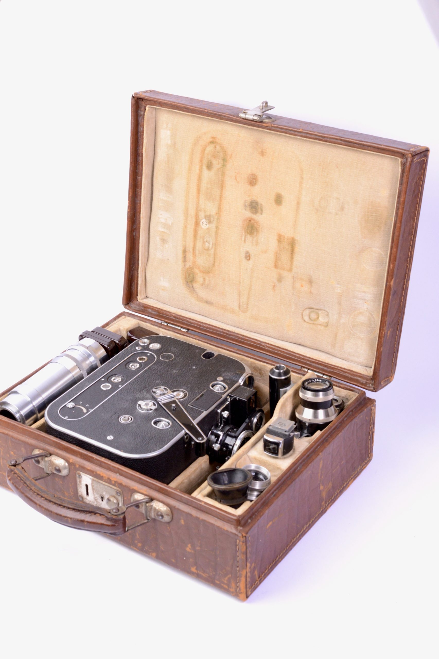 Valise complète en cuir façon crocodile renfermant une ciné-caméra Movikon 16 mm, quatre objectifs et accessoires. Elle est fabriquée par Zeiss-Ikon, à Dresde, vers 1935. Il s’agit d’une caméra allemande parmi les plus perfectionnées d’avant-guerre. Elle reçoit des bobines de 30 mètres. La vitesse de prises de vues peut varier de 12 à 62 images par seconde. Numéro de série 94762. Quatre objectifs accompagnent la caméra : Tele-Tessar 1 : 6,3 / 18 cm ; Sonnar 1 : 2,8 / 5 cm ; Tessar 1 : 2,7 / 2 cm ; Sonnar 1 : 4 / 7,5 cm.  La caméra est dotée d’un télémètre couplé et d’autres possibilités techniques telles que le réglage de netteté sur le film, indicateur dans le voyant de remontage du ressort, retardateur, viseur d’angle. Très bel et peu courant ensemble.