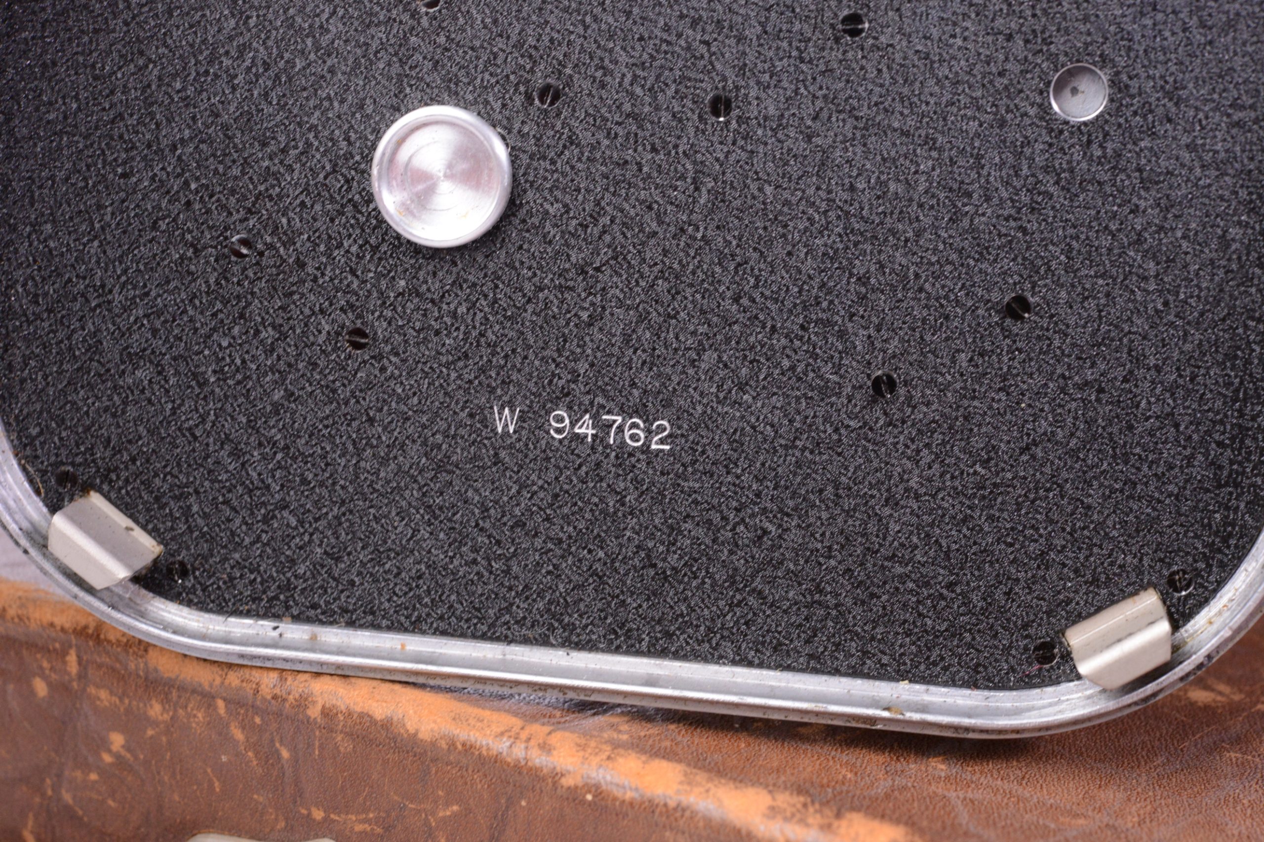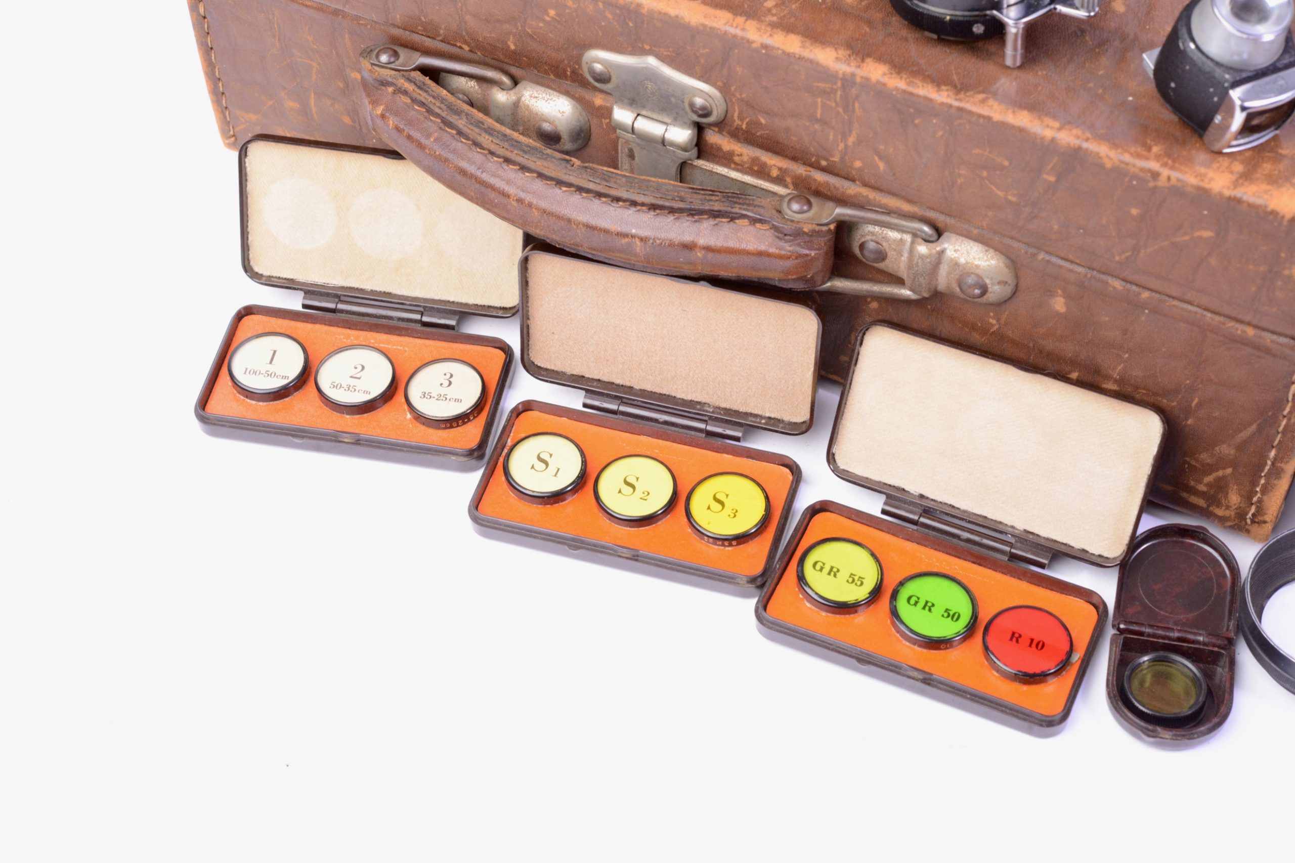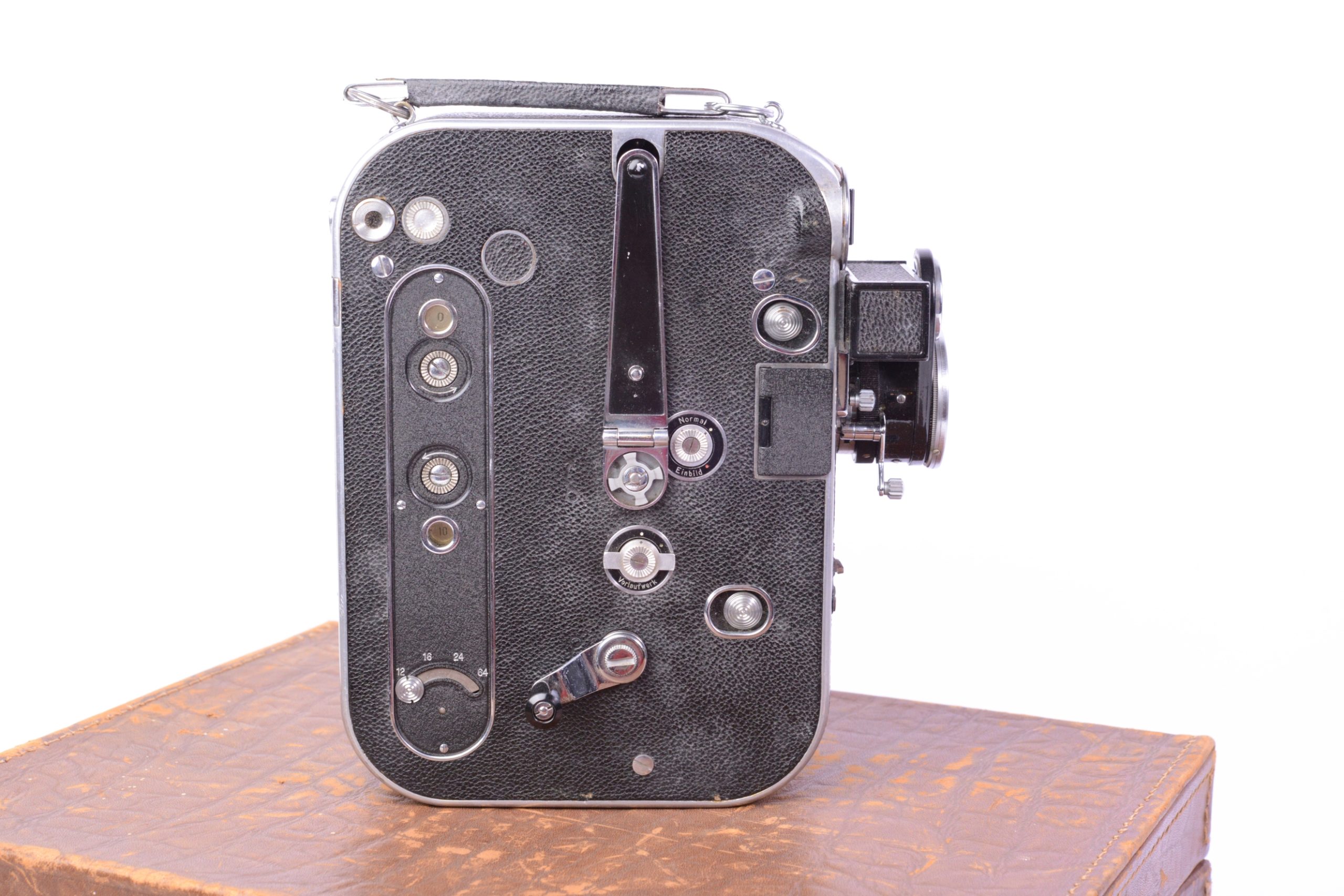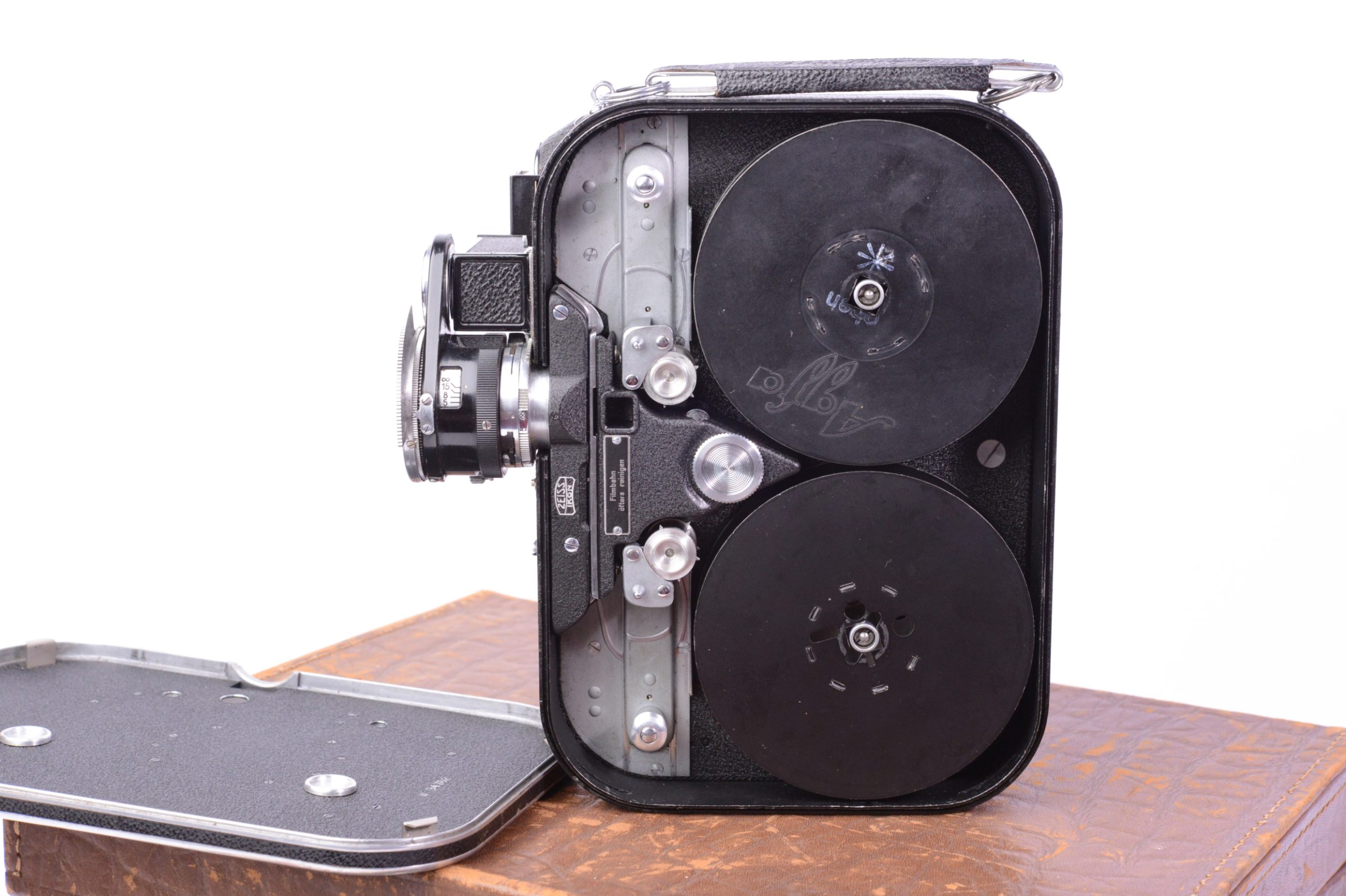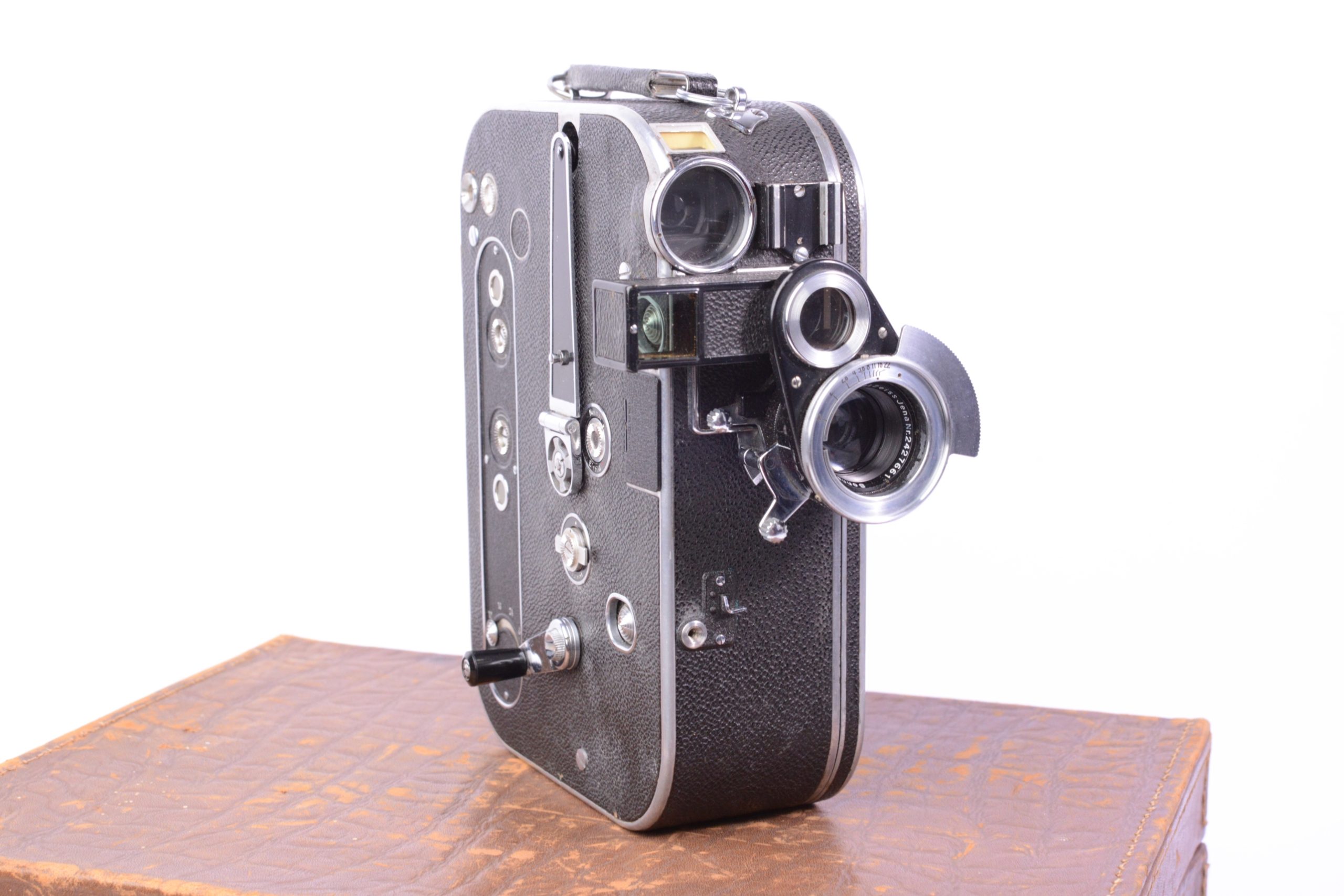 Valise complète en cuir façon crocodile renfermant une ciné-caméra Movikon 16 mm, quatre objectifs et accessoires. Elle est fabriquée par Zeiss-Ikon, à Dresde, vers 1935. Il s’agit d’une caméra allemande parmi les plus perfectionnées d’avant-guerre. Elle reçoit des bobines de 30 mètres. La vitesse de prises de vues peut varier de 12 à 62 images par seconde. Numéro de série 94762. Quatre objectifs accompagnent la caméra : Tele-Tessar 1 : 6,3 / 18 cm ; Sonnar 1 : 2,8 / 5 cm ; Tessar 1 : 2,7 / 2 cm ; Sonnar 1 : 4 / 7,5 cm.  La caméra est dotée d’un télémètre couplé et d’autres possibilités techniques telles que le réglage de netteté sur le film, indicateur dans le voyant de remontage du ressort, retardateur, viseur d’angle. Très bel et peu courant ensemble.