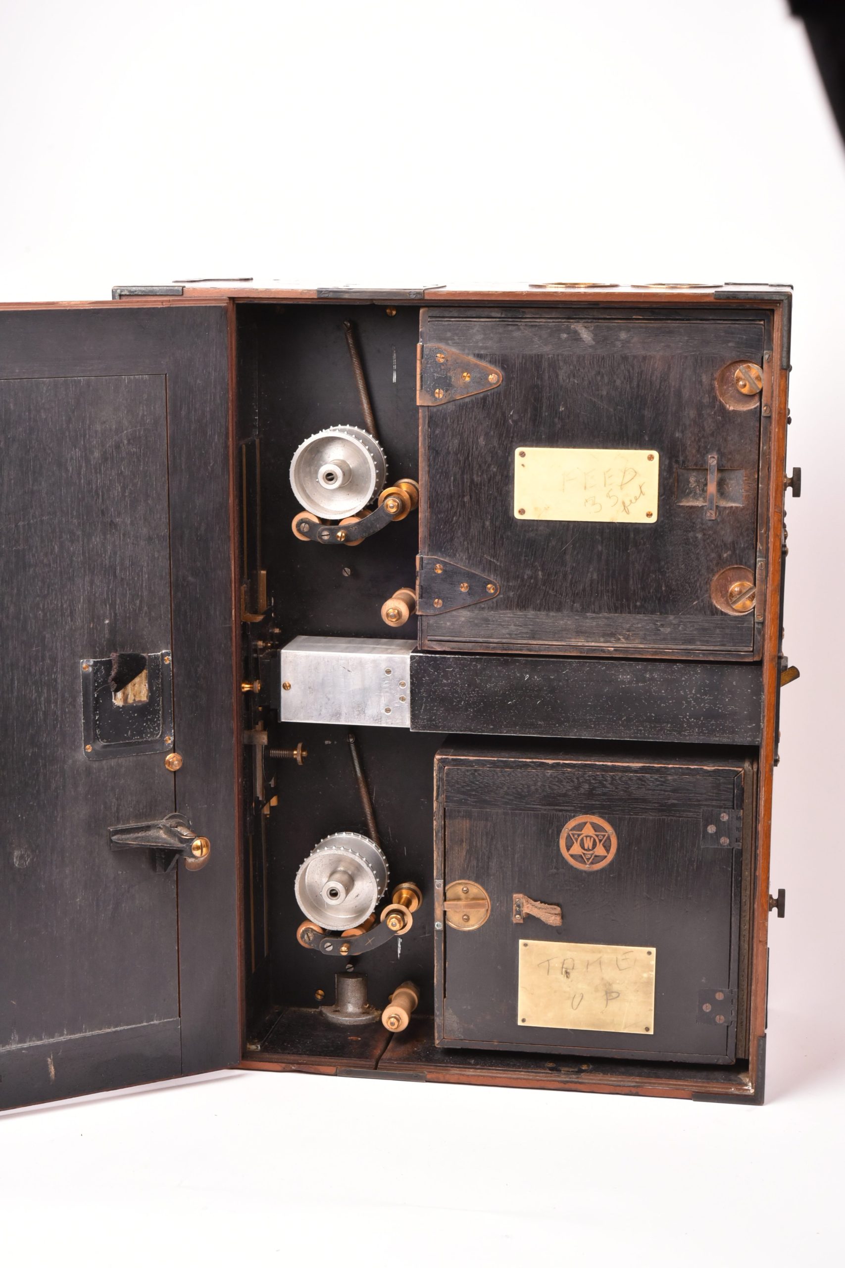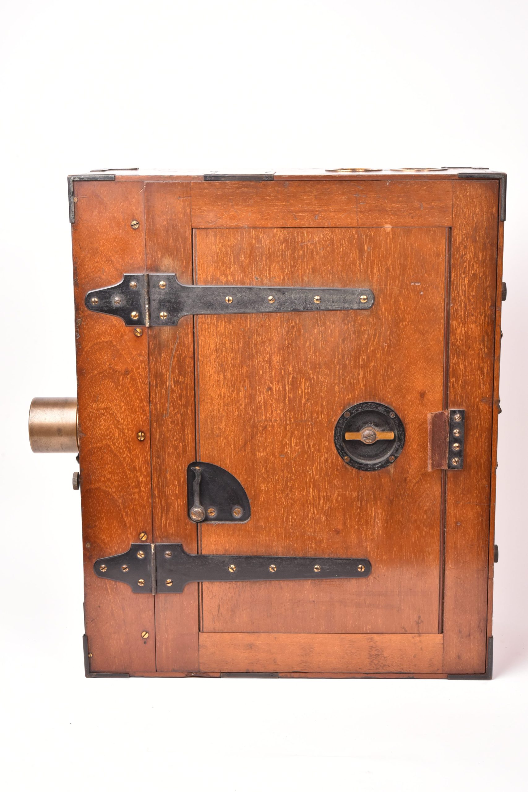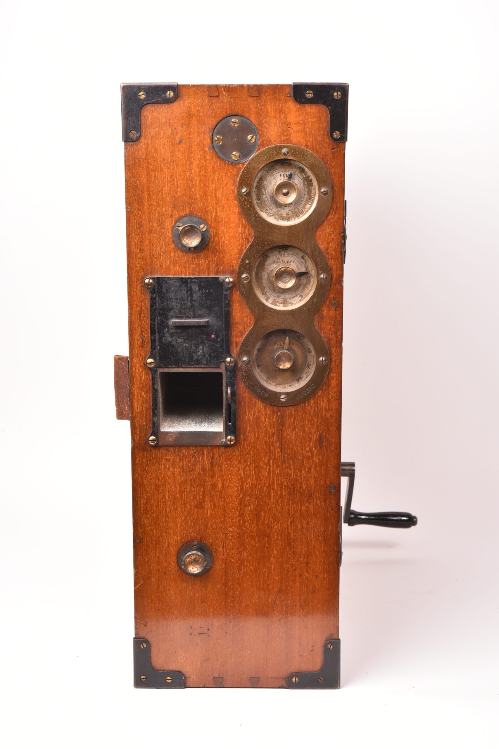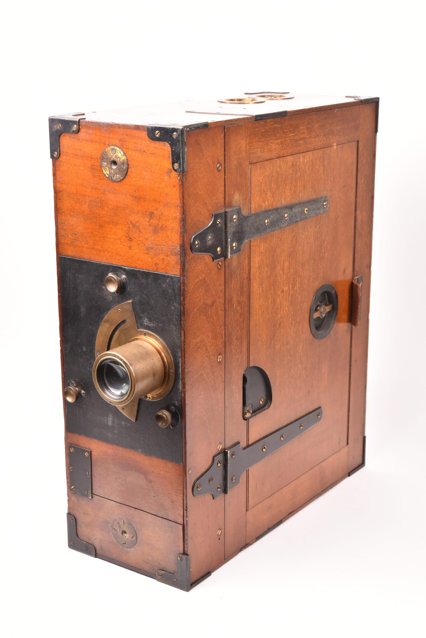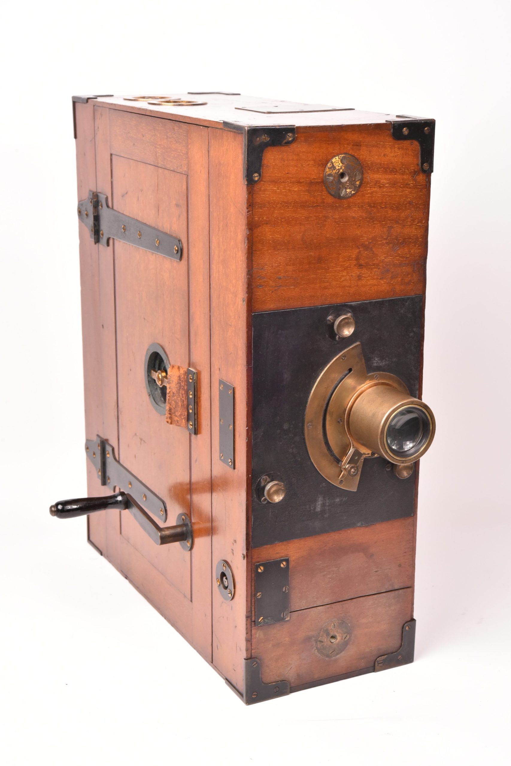 Caméra 35mm de E. F. Moy P. H. Bastie. Fabrication anglaise. Très beau mécanisme. Poignée d’origine. Circa 1909. Fabrication en bois d’acajou verni avec des raccords renforcés métalliques. Chargeurs présents. Le corps est marqué : « Patent Moy & Bastie N° 4534 1909 » - N° de série : 509.  Ce type de caméra fut utilisé par des cinéastes officiels britanniques travaillant avec les forces armées de sa majesté au cours de la Première Guerre mondiale. Le lieutenant Geoffrey Malins (un des plus célèbres cameramen de la période) a utilisé une caméra Moy & Bastie pour enregistrer des séquences mémorables traduites ensuite dans le film épique, « La bataille de la Somme ». Les grandes dimensions de la caméra Moy & Bastie montée sur trépied, en faisait une cible facile pour les tireurs d'élite ennemis. Le modèle proposé est en bel état cosmétique et fonctionnel.