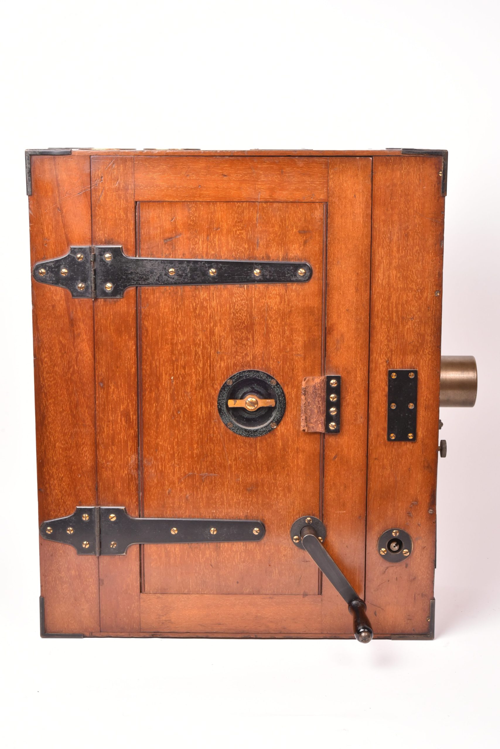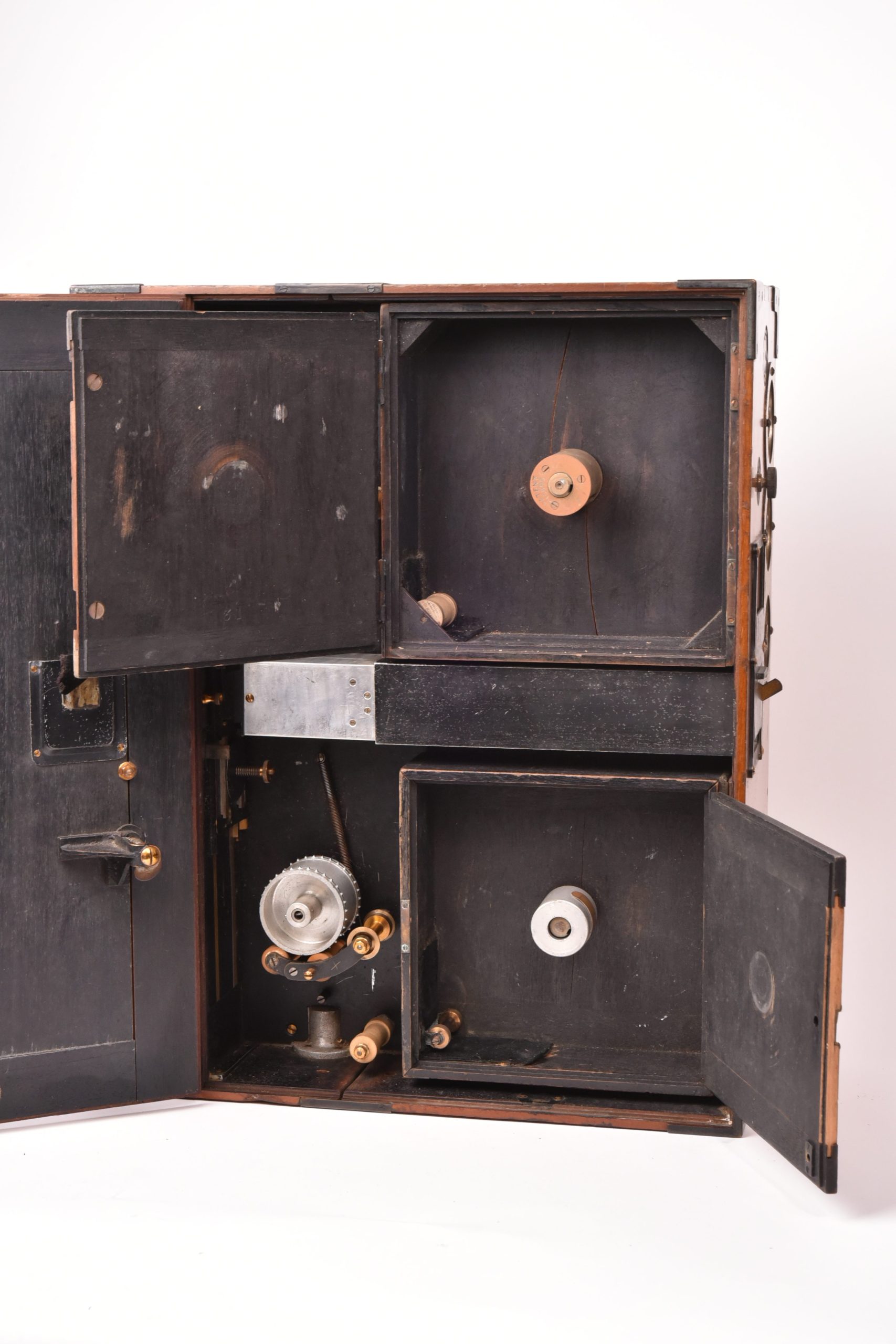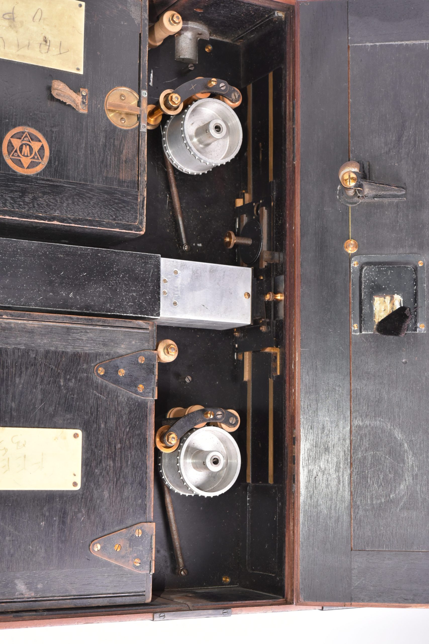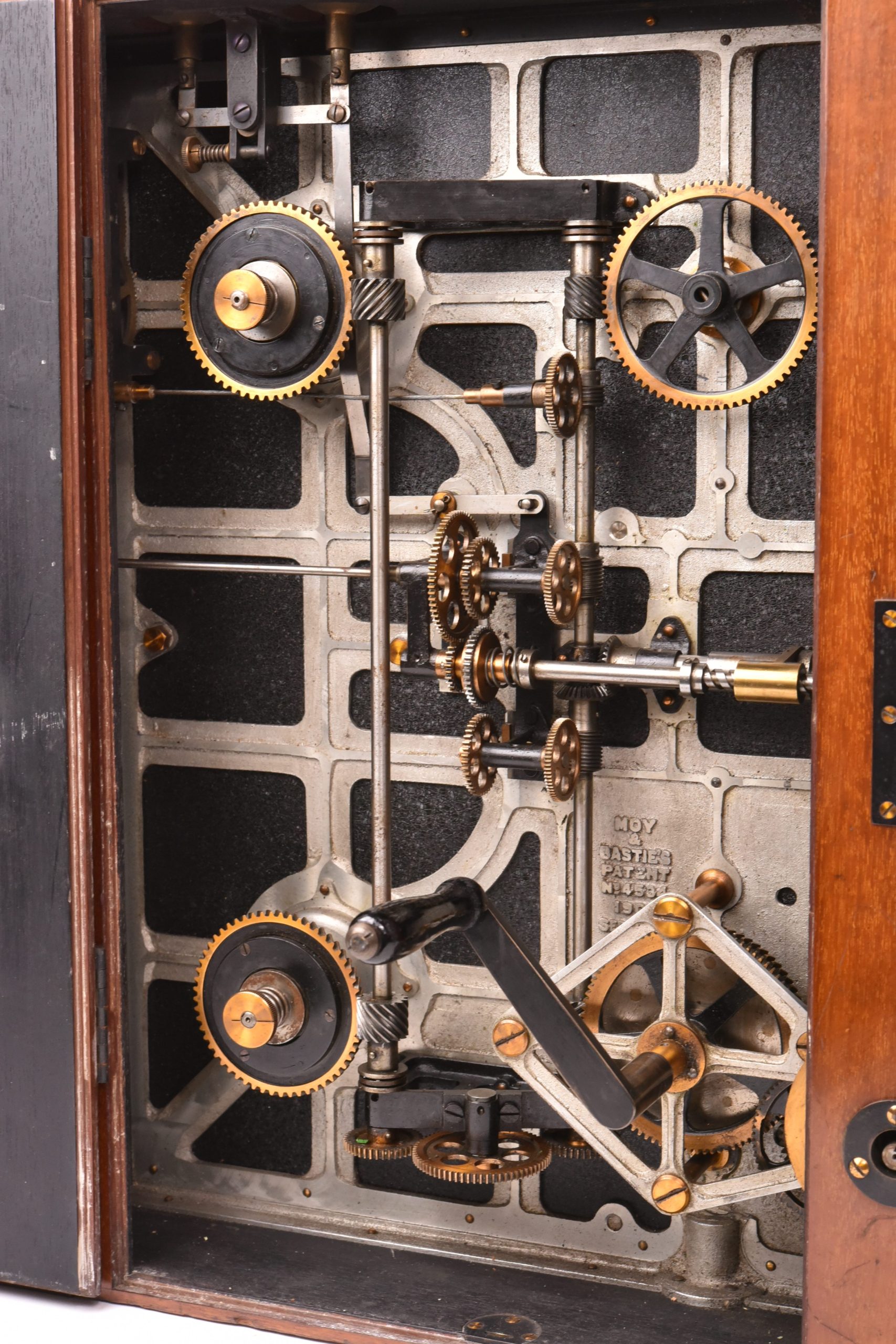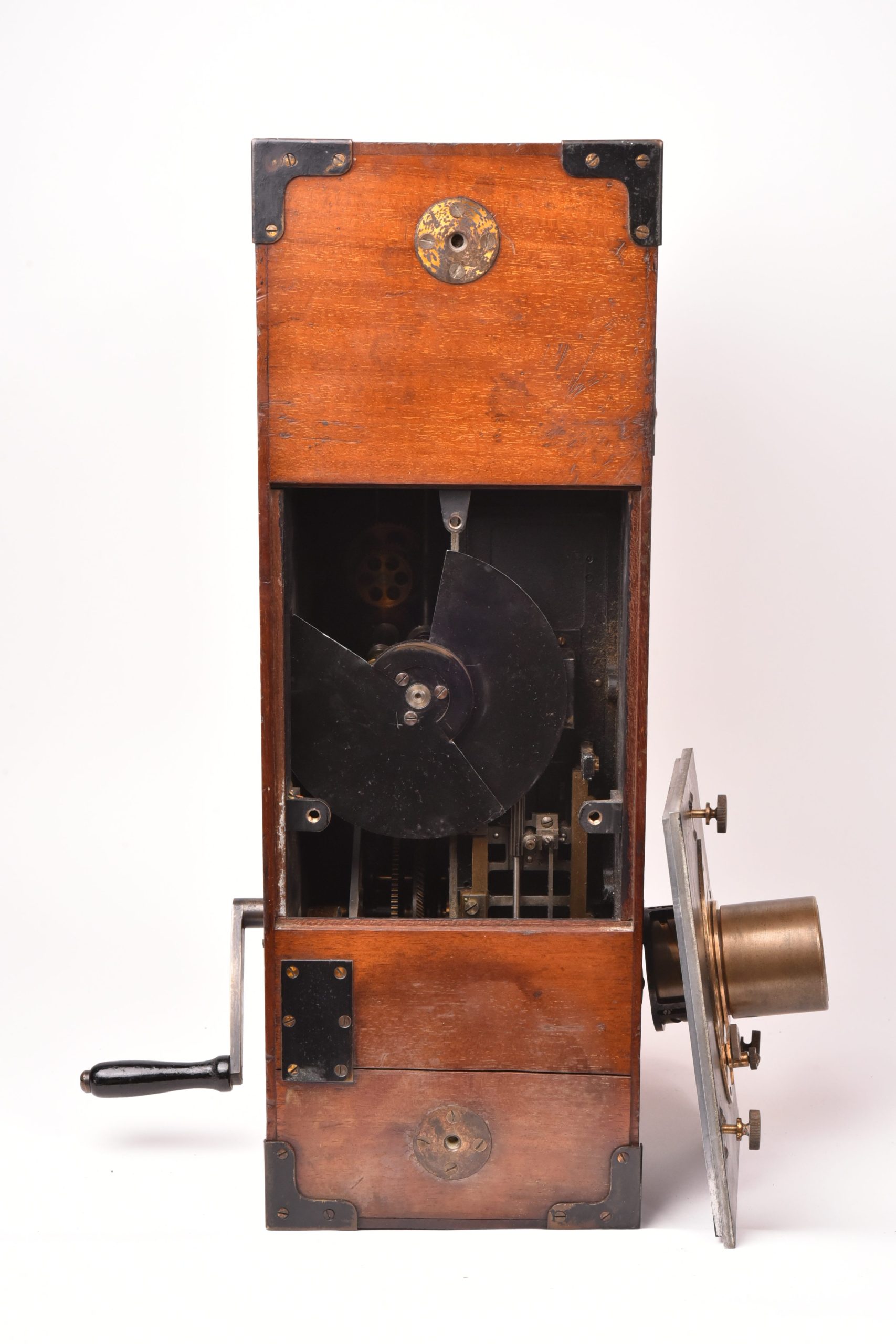 Caméra 35mm de E. F. Moy P. H. Bastie. Fabrication anglaise. Très beau mécanisme. Poignée d’origine. Circa 1909. Fabrication en bois d’acajou verni avec des raccords renforcés métalliques. Chargeurs présents. Le corps est marqué : « Patent Moy & Bastie N° 4534 1909 » - N° de série : 509.  Ce type de caméra fut utilisé par des cinéastes officiels britanniques travaillant avec les forces armées de sa majesté au cours de la Première Guerre mondiale. Le lieutenant Geoffrey Malins (un des plus célèbres cameramen de la période) a utilisé une caméra Moy & Bastie pour enregistrer des séquences mémorables traduites ensuite dans le film épique, « La bataille de la Somme ». Les grandes dimensions de la caméra Moy & Bastie montée sur trépied, en faisait une cible facile pour les tireurs d'élite ennemis. Le modèle proposé est en bel état cosmétique et fonctionnel.