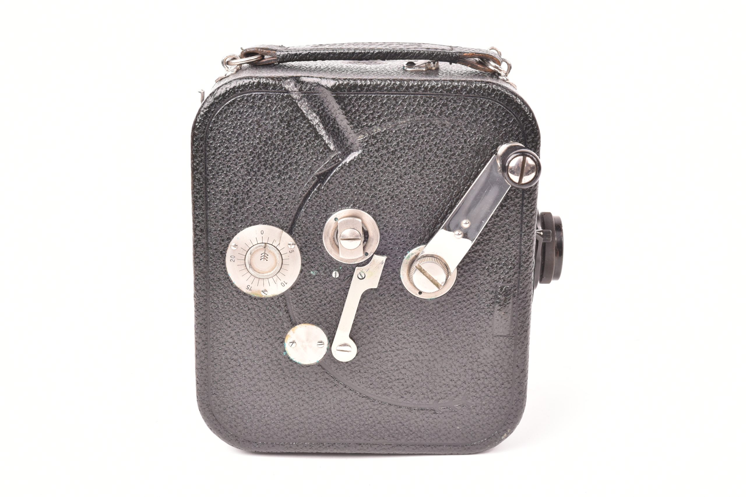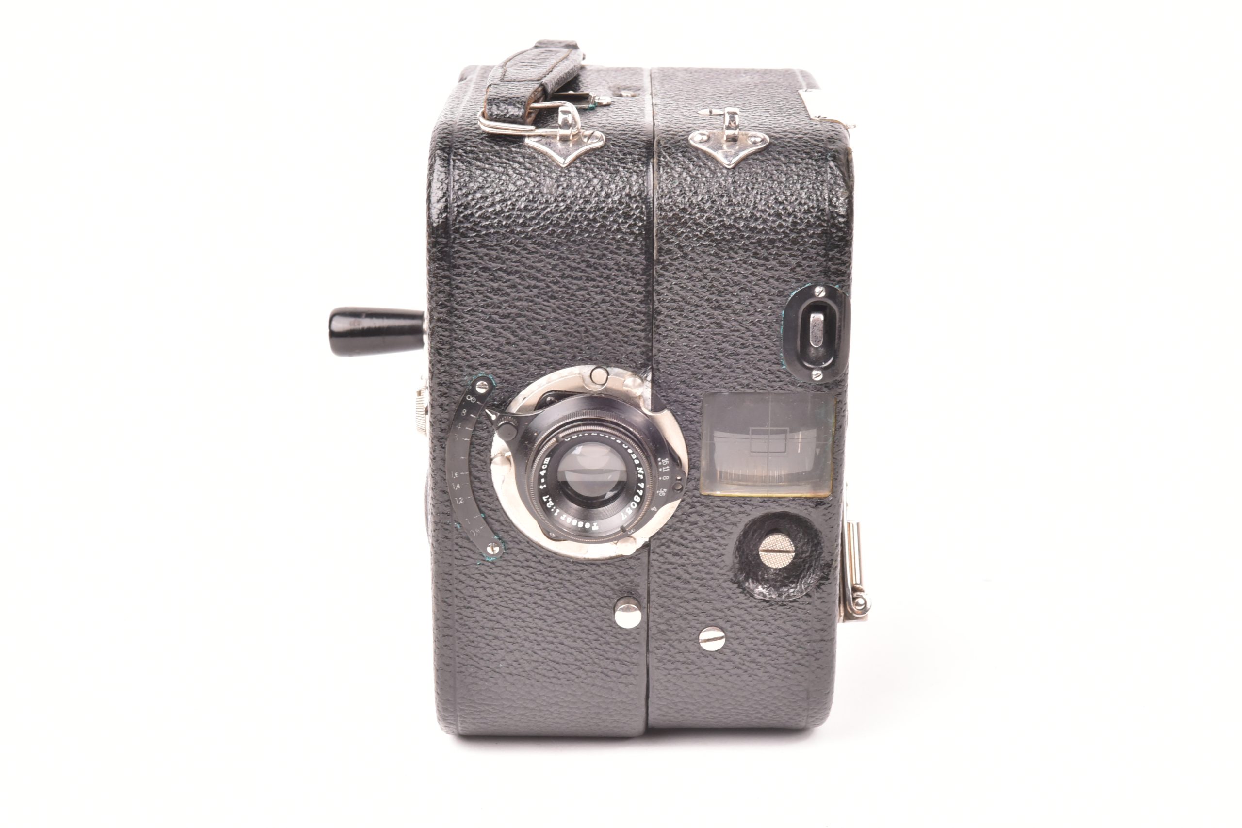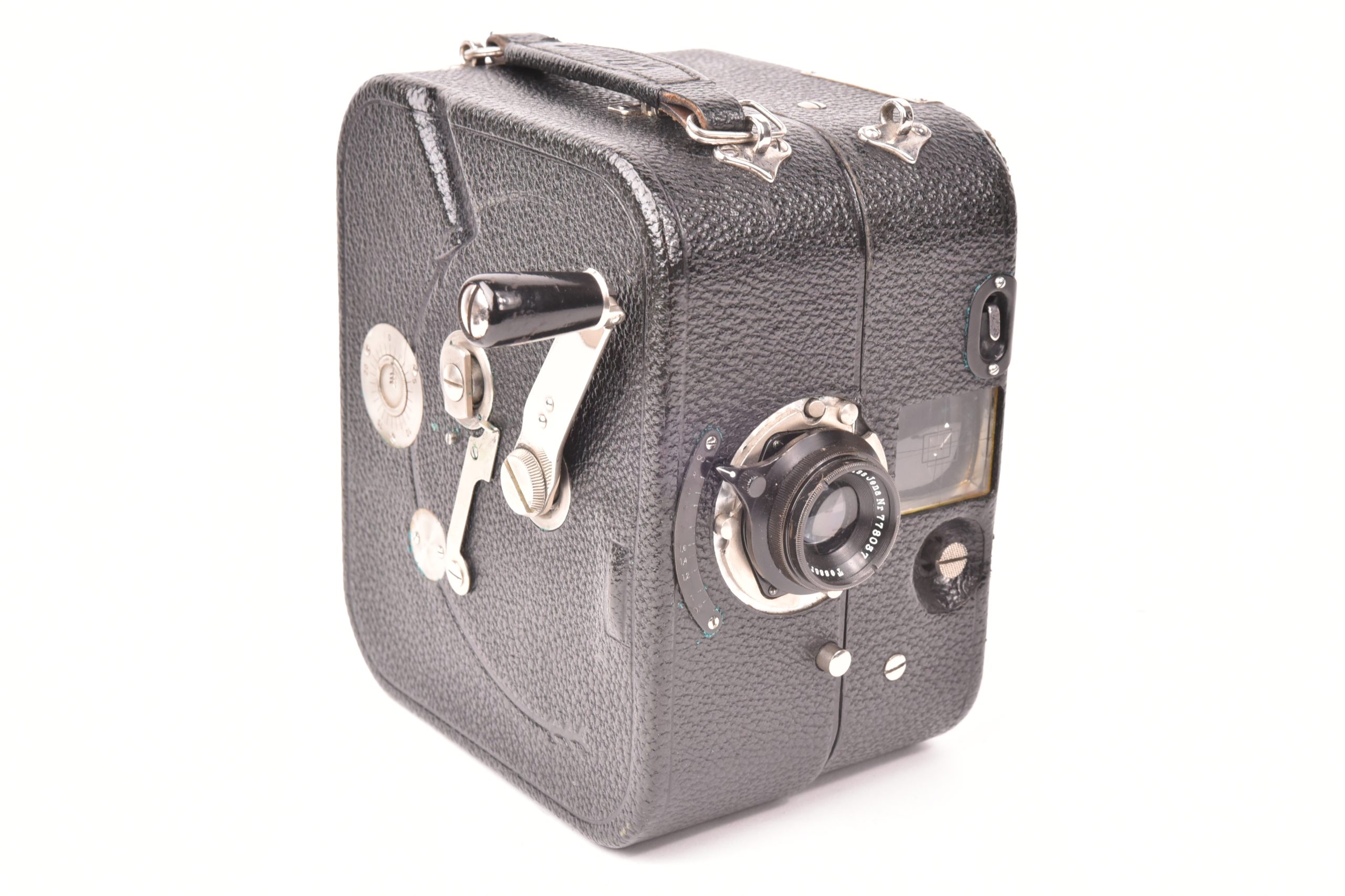 Camera ICA Kinamo pour film 35 mm complète avec sacoche, moteur et chargeur. Viseur iconométrique. Dans le catalogue constructeur de 1927, la caméra est présentée comme "appareil d'amateur le plus moderne et le plus recherché pour prises de vues animées, portraits vivants, scènes de la vie mondaine etc. sur film cinématographique normal de 18x24 mm. L'appareil n'est pas plus grand qu'une chambre photographique 9x12 cm pliée. Il marche presque sans bruit. Il y a deux vitesses différentes, l'une pour la prise de vues animées, l'autre 8 fois plus lente pour les scènes truquées, expériences scientifiques etc". Objectif Tessar Carl Zeiss Iena 1:3,5 F=4,5 cm. Accompagné d'un magasin et d'une sacoche en cuir d'origine.