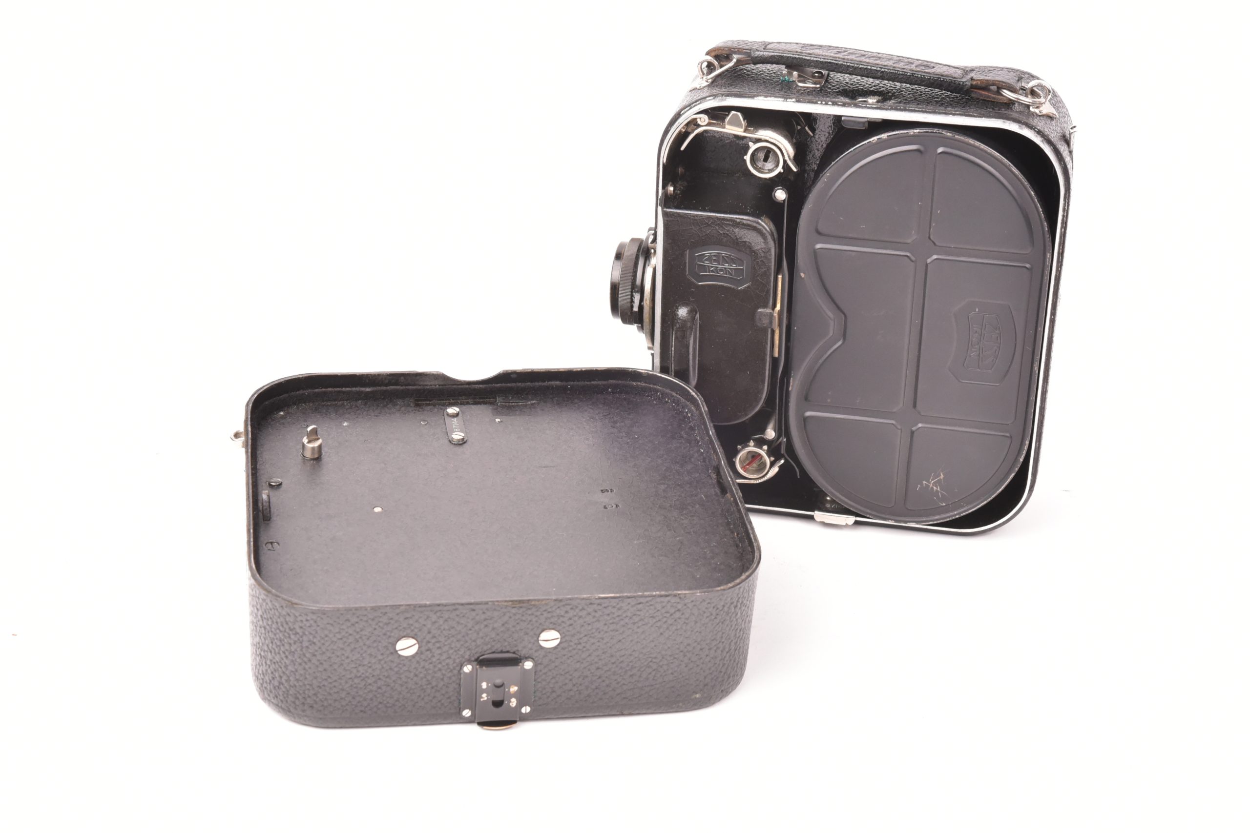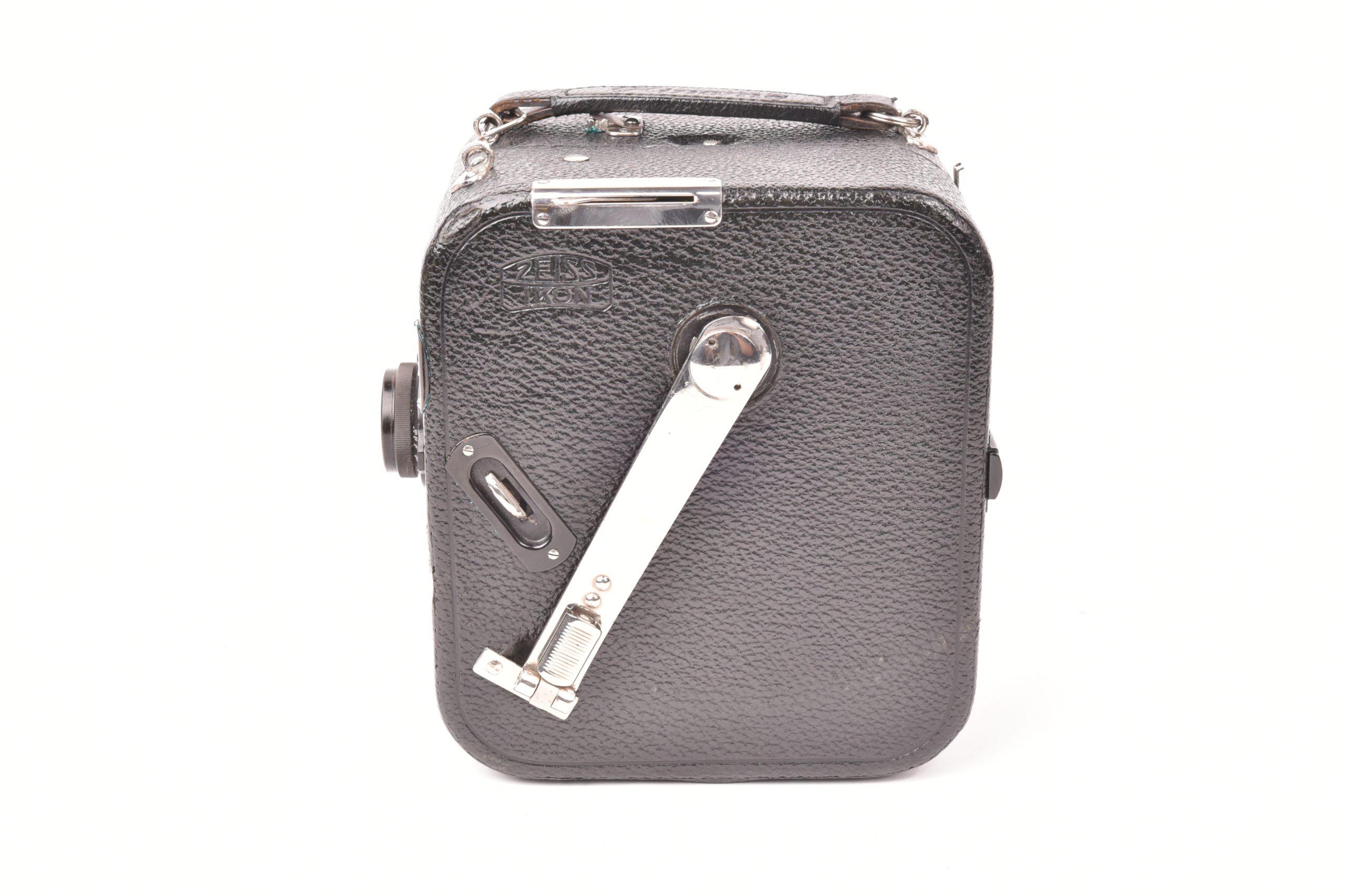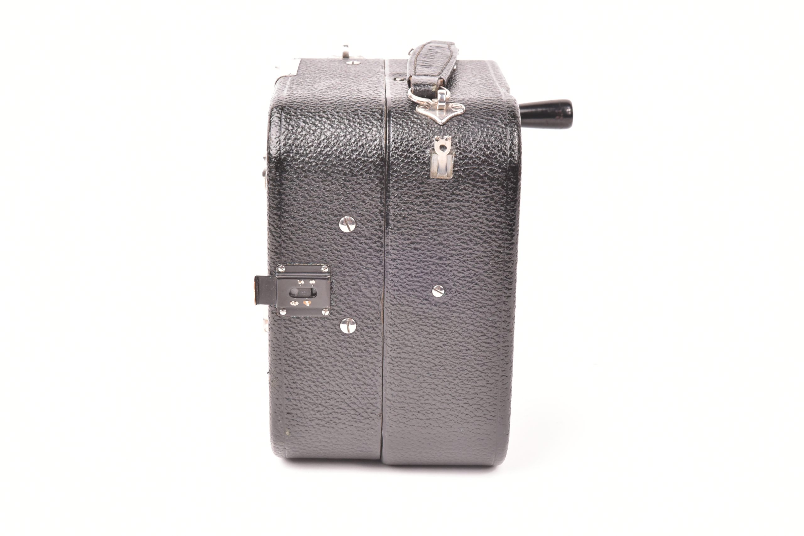 Camera ICA Kinamo pour film 35 mm complète avec sacoche, moteur et chargeur. Viseur iconométrique. Dans le catalogue constructeur de 1927, la caméra est présentée comme "appareil d'amateur le plus moderne et le plus recherché pour prises de vues animées, portraits vivants, scènes de la vie mondaine etc. sur film cinématographique normal de 18x24 mm. L'appareil n'est pas plus grand qu'une chambre photographique 9x12 cm pliée. Il marche presque sans bruit. Il y a deux vitesses différentes, l'une pour la prise de vues animées, l'autre 8 fois plus lente pour les scènes truquées, expériences scientifiques etc". Objectif Tessar Carl Zeiss Iena 1:3,5 F=4,5 cm. Accompagné d'un magasin et d'une sacoche en cuir d'origine.