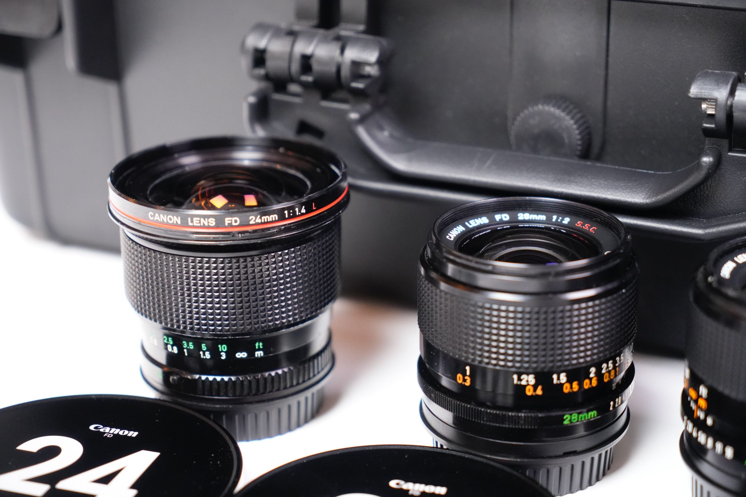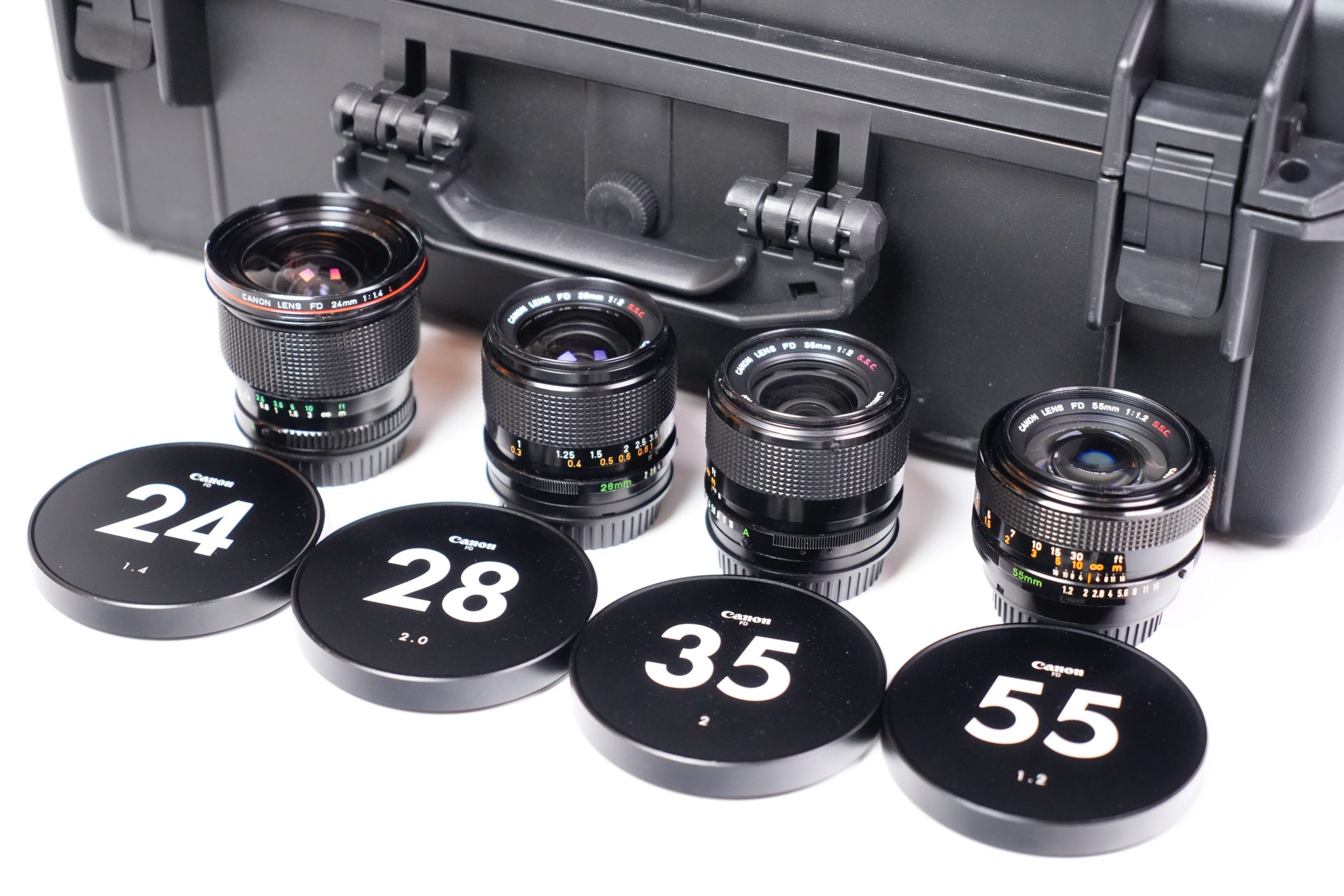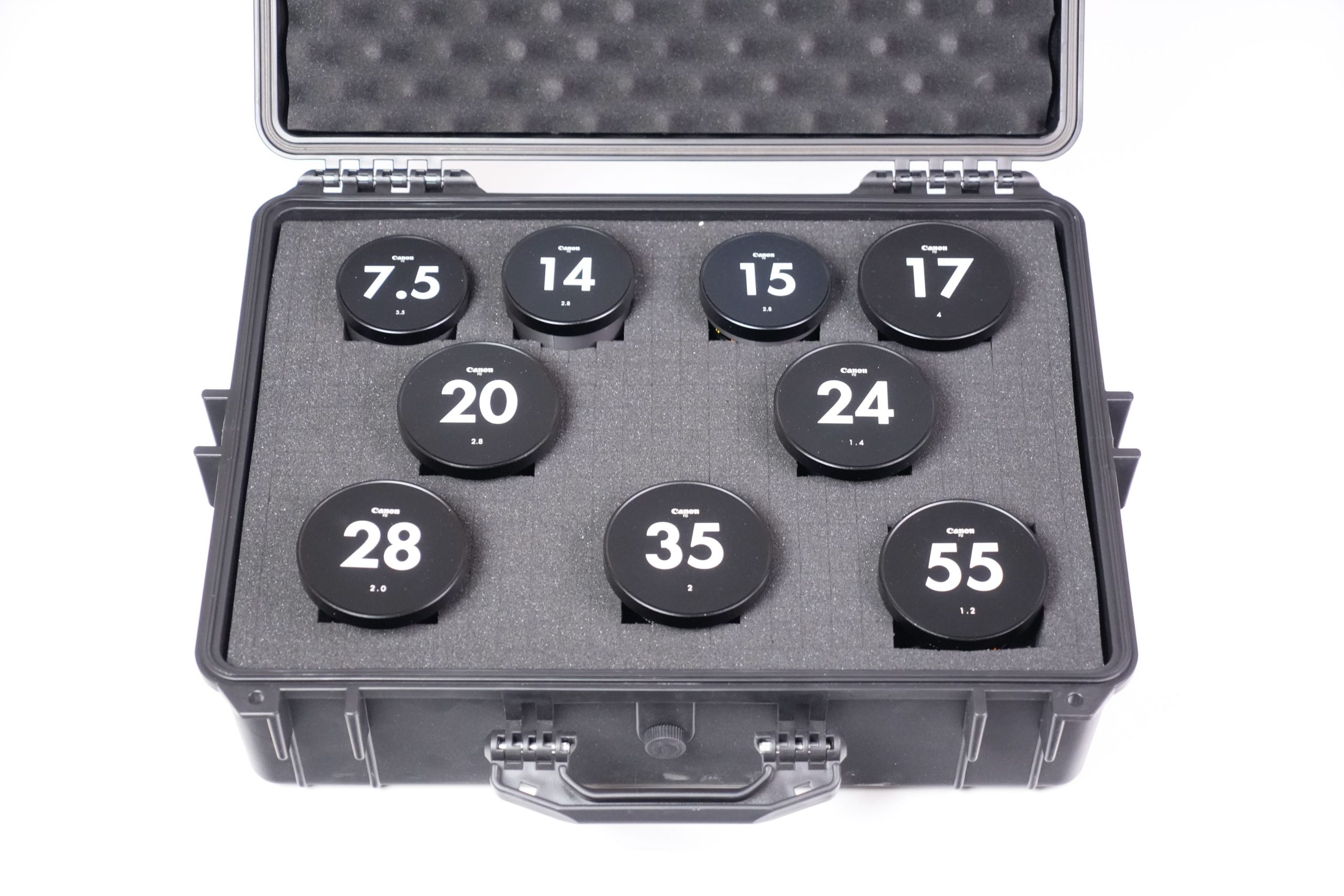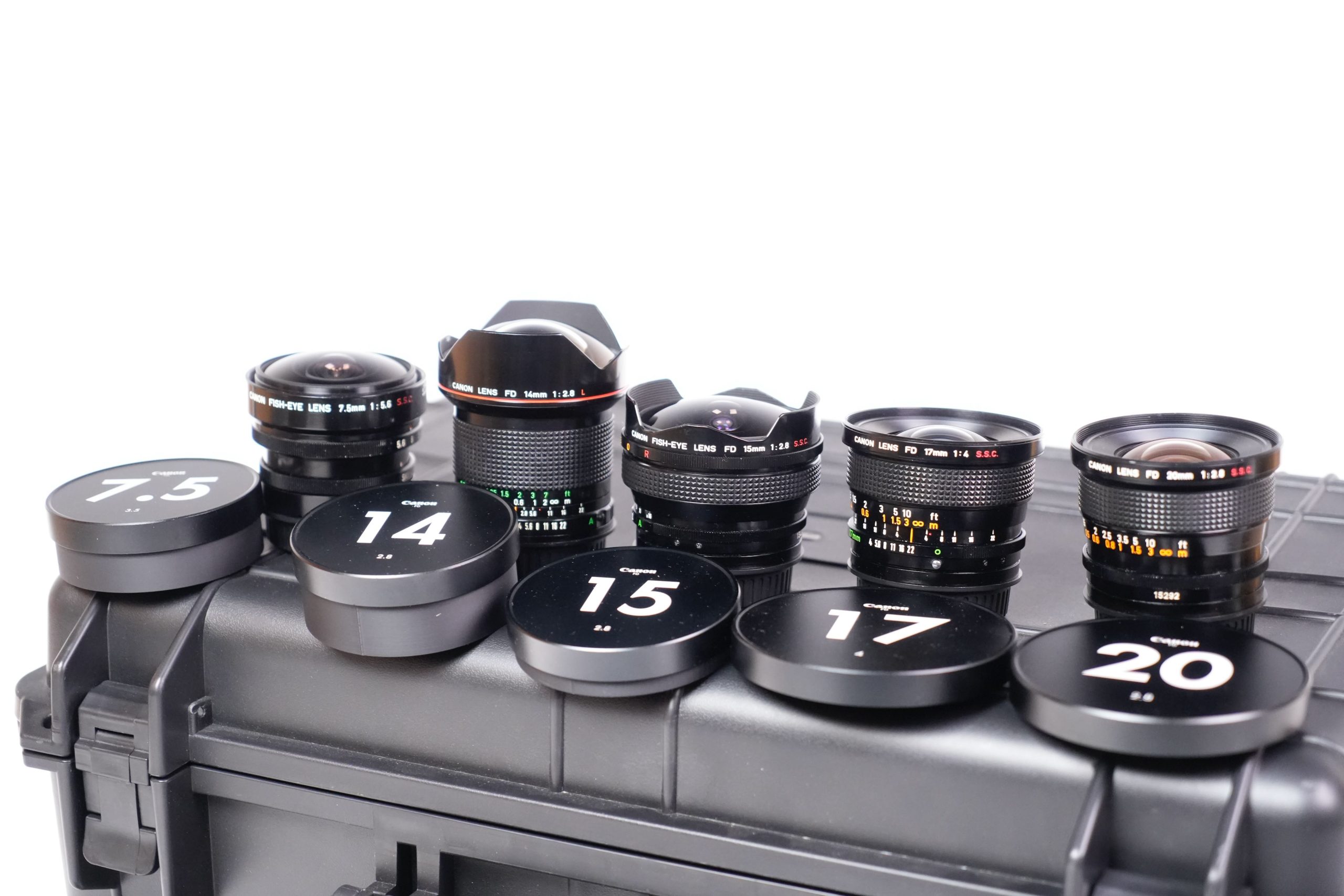 <p data-start="273" data-end="752">Cet ensemble se compose de huit objectifs fixes Canon FD fabriqués entre les années 1970 et 1980. Il comprend  Canon 7.5 mm f/5.6 Fisheye S.S.C,  Canon 14 mm f/2.8 nFD,  Canon 15 mm f/2.8 Fisheye S.S.C,  Canon 17 mm f/4 S.S.C, un Canon 20 mm f/2.8 S.S.C,  Canon 24 mm f/1.4 nFD,  Canon 28 F2 S.S.C, Canon 35 mm f/2 S.S.C et un Canon 55 mm f/1.2 S.S.C. Tous sont présentés dans un coffret rigide moderne, équipés de capuchons signalant clairement leurs focales et ouvertures maximales. À l’origine, ces objectifs appartenaient à la prestigieuse gamme Canon FD, produite entre 1971 et 1992 et destinée aux reflex argentiques 24×36 de la marque. Les versions S.S.C. (Super Spectra Coating) bénéficiaient d’un traitement multicouche avancé qui améliorait le contraste et limitait les reflets parasites. Ils représentent une étape clé dans l’histoire de l’optique photographique japonaise. L’ensemble présenté a été profondément modifié pour répondre aux standards actuels du cinéma numérique. Les montures FD d’origine ont été remplacées par des montures EF cinéma, plus robustes et compatibles avec un large éventail de caméras professionnelles (Canon EOS Cinema, RED, Blackmagic Design, etc.). Contrairement aux simples adaptateurs, cette conversion assure une fixation mécanique fiable, un respect parfait du tirage optique (flange distance) et une durabilité accrue en conditions de tournage. De plus, les bagues de diaphragme ont été décliquer, permettant un réglage continu et fluide de l’ouverture, sans les crans classiques des objectifs photographiques. Cette modification est essentielle en production audiovisuelle, car elle offre une maîtrise progressive de l’exposition et un rendu plus cinématographique lors des transitions de lumière. Ainsi, ces optiques historiques trouvent une nouvelle vie dans l’univers du cinéma moderne. Elles sont recherchées pour leur rendu unique, offrant une image au contraste doux, des flares caractéristiques et une esthétique organique, contrastant avec la netteté et la neutralité des optiques contemporaines. L’alliance d’une conception des années 1970 avec des montures et adaptations modernes illustre le dialogue entre héritage photographique et innovation cinématographique</p>