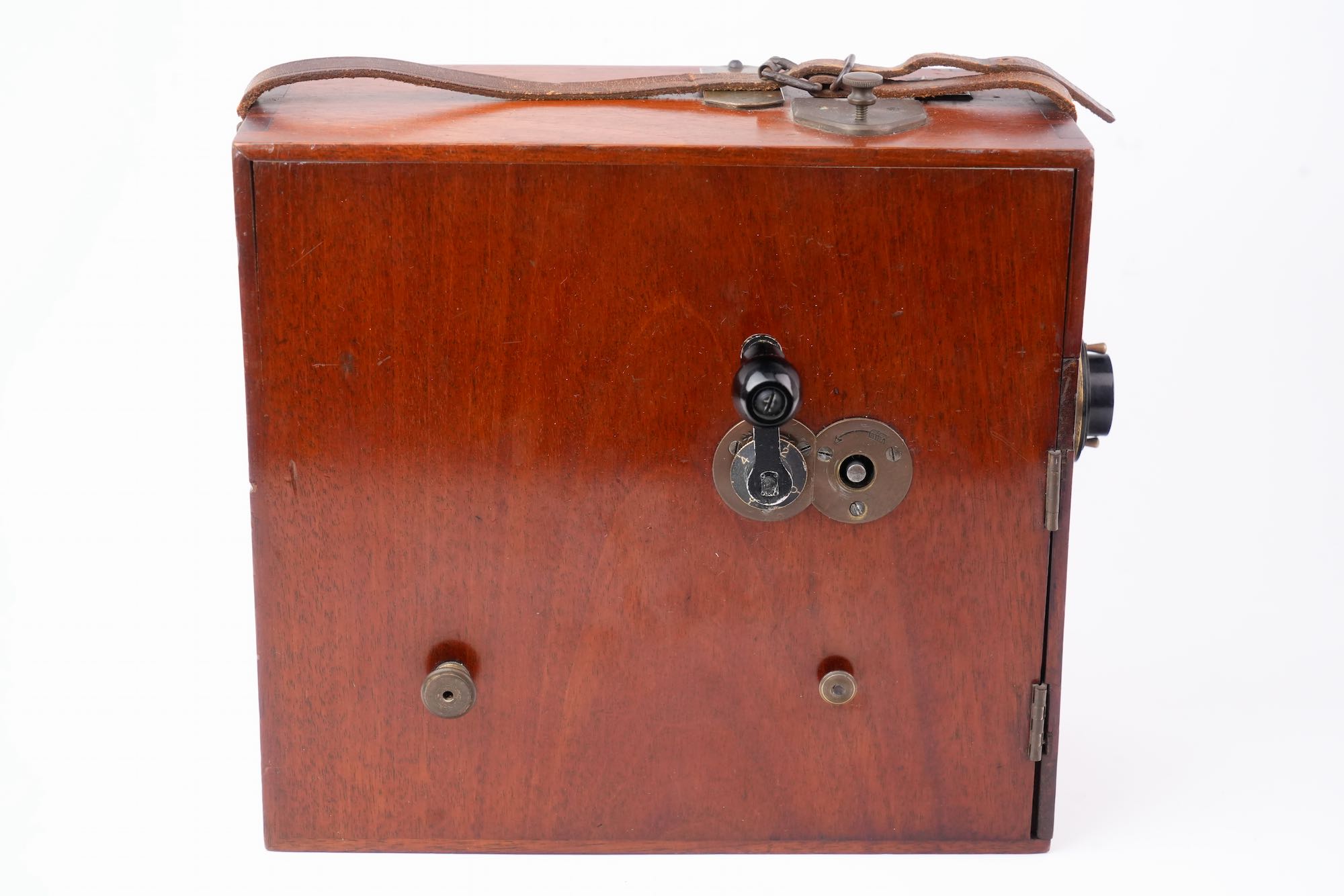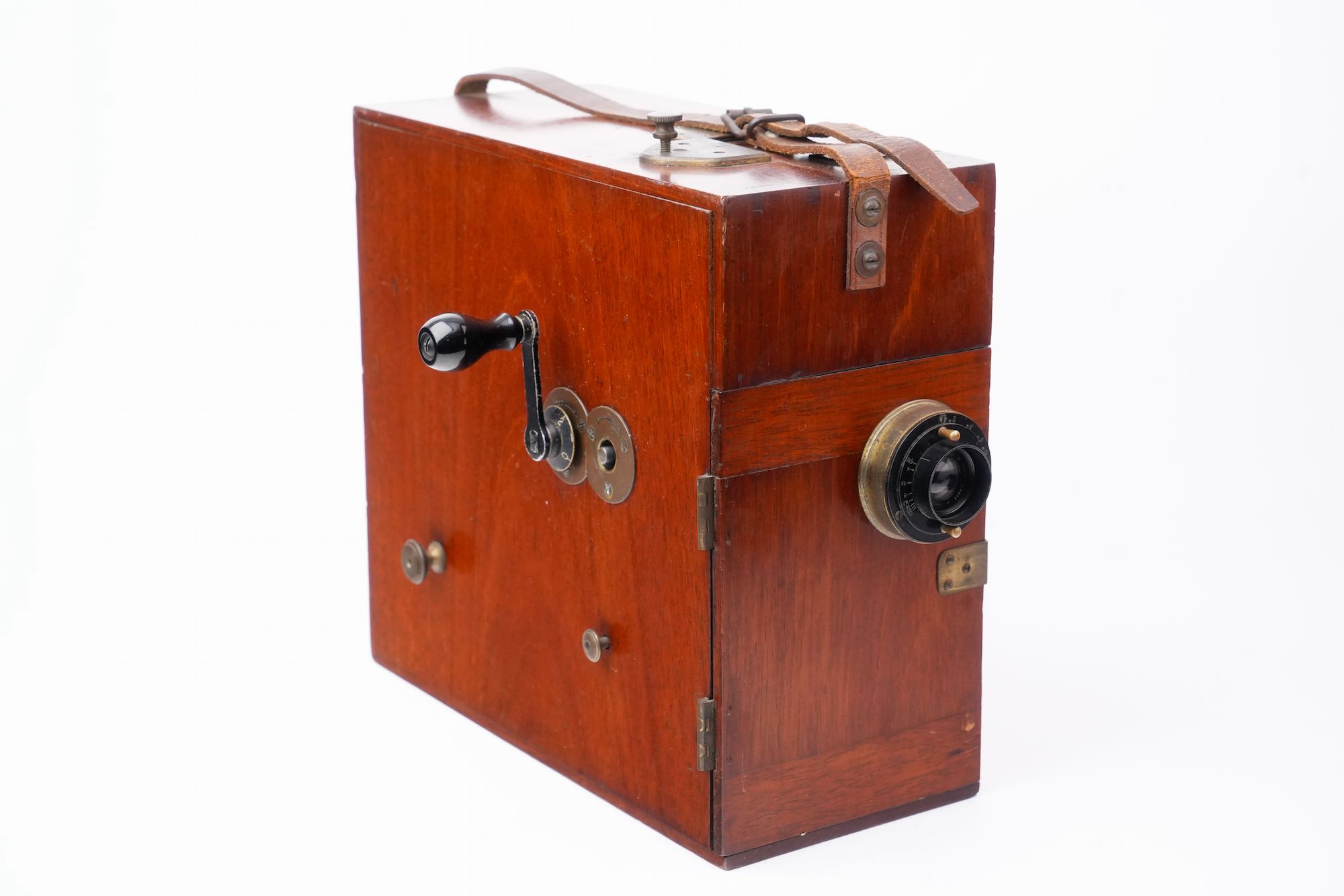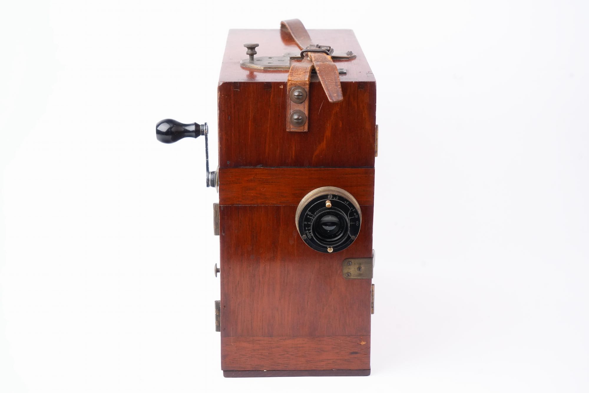 <div class="available-middle-text">Caméra de cinéma, semi professionnelle, de petite taille (30x15x30 cm) en acajou verni avec éléments en cuivre et laiton. Mécanisme d'entraînement du film à deux griffes. Deux magasins, émetteur et récepteur, présents. Manivelle d'origine. Objectif français "Huet Anastigmat" 50mm f/3.5. On relève la présence d'un fêle dans le bois du panneau gauche. Belle facture.</div>
