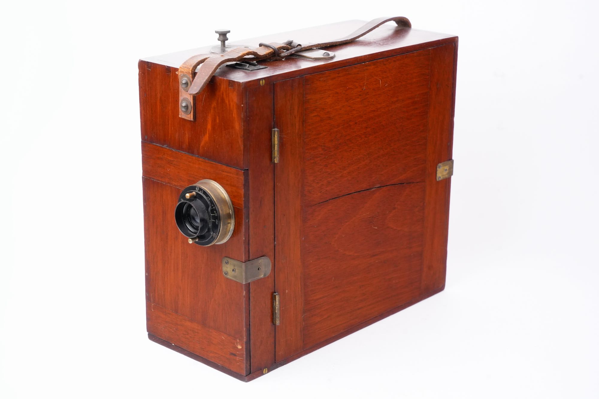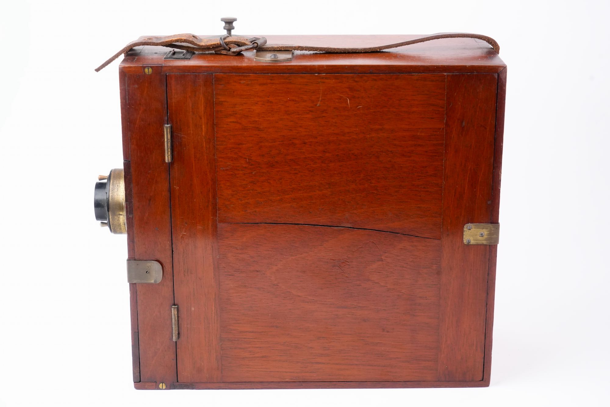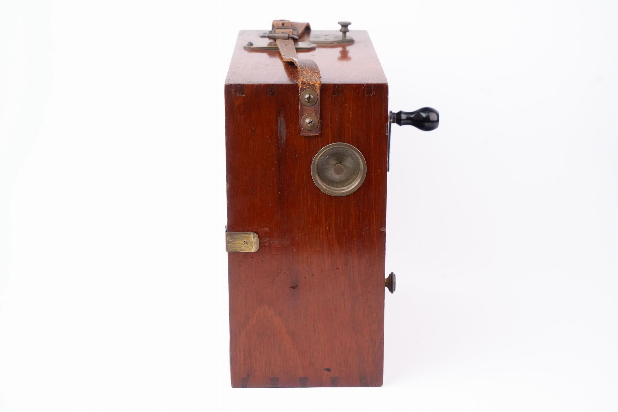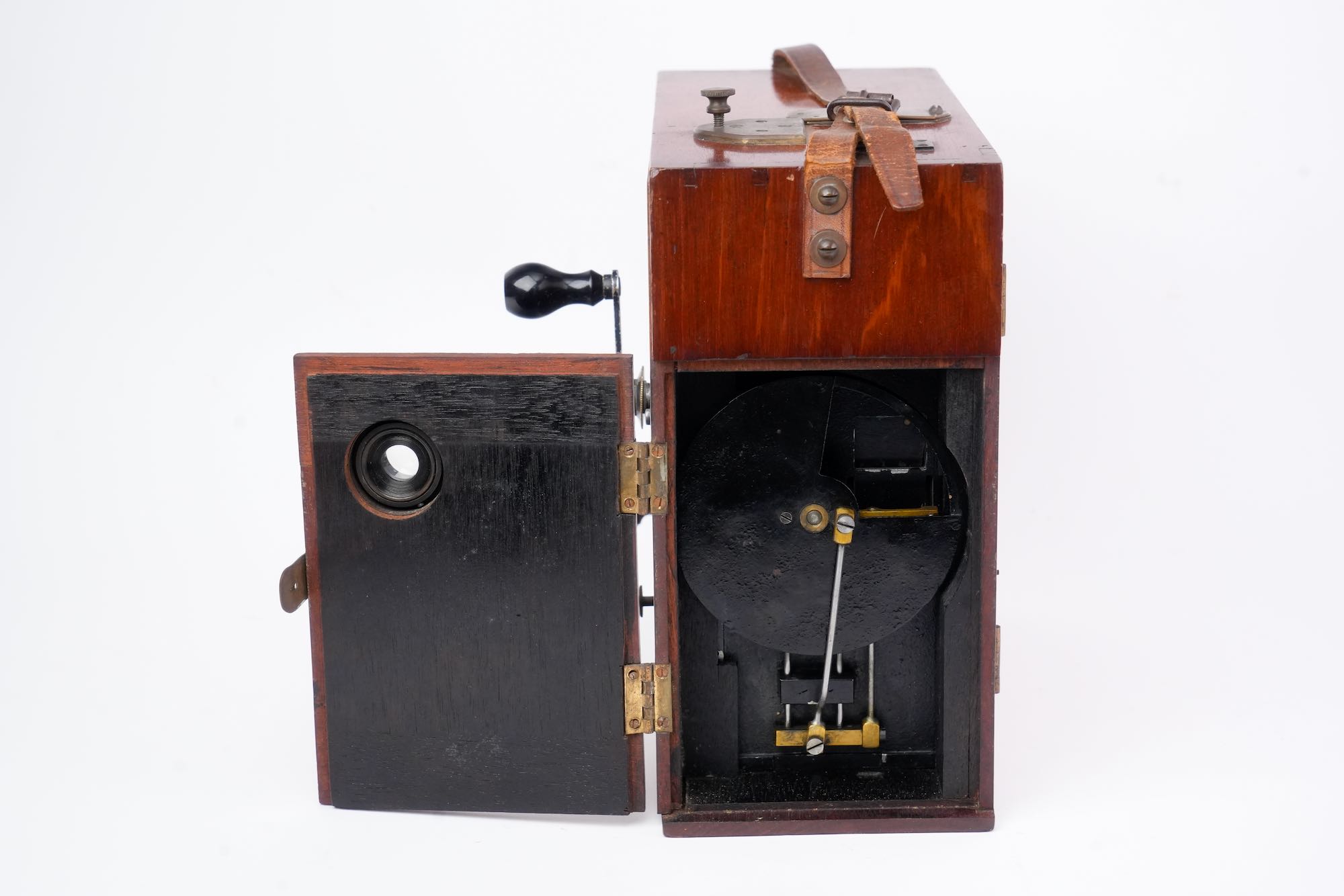 <div class="available-middle-text">Caméra de cinéma, semi professionnelle, de petite taille (30x15x30 cm) en acajou verni avec éléments en cuivre et laiton. Mécanisme d'entraînement du film à deux griffes. Deux magasins, émetteur et récepteur, présents. Manivelle d'origine. Objectif français "Huet Anastigmat" 50mm f/3.5. On relève la présence d'un fêle dans le bois du panneau gauche. Belle facture.</div>