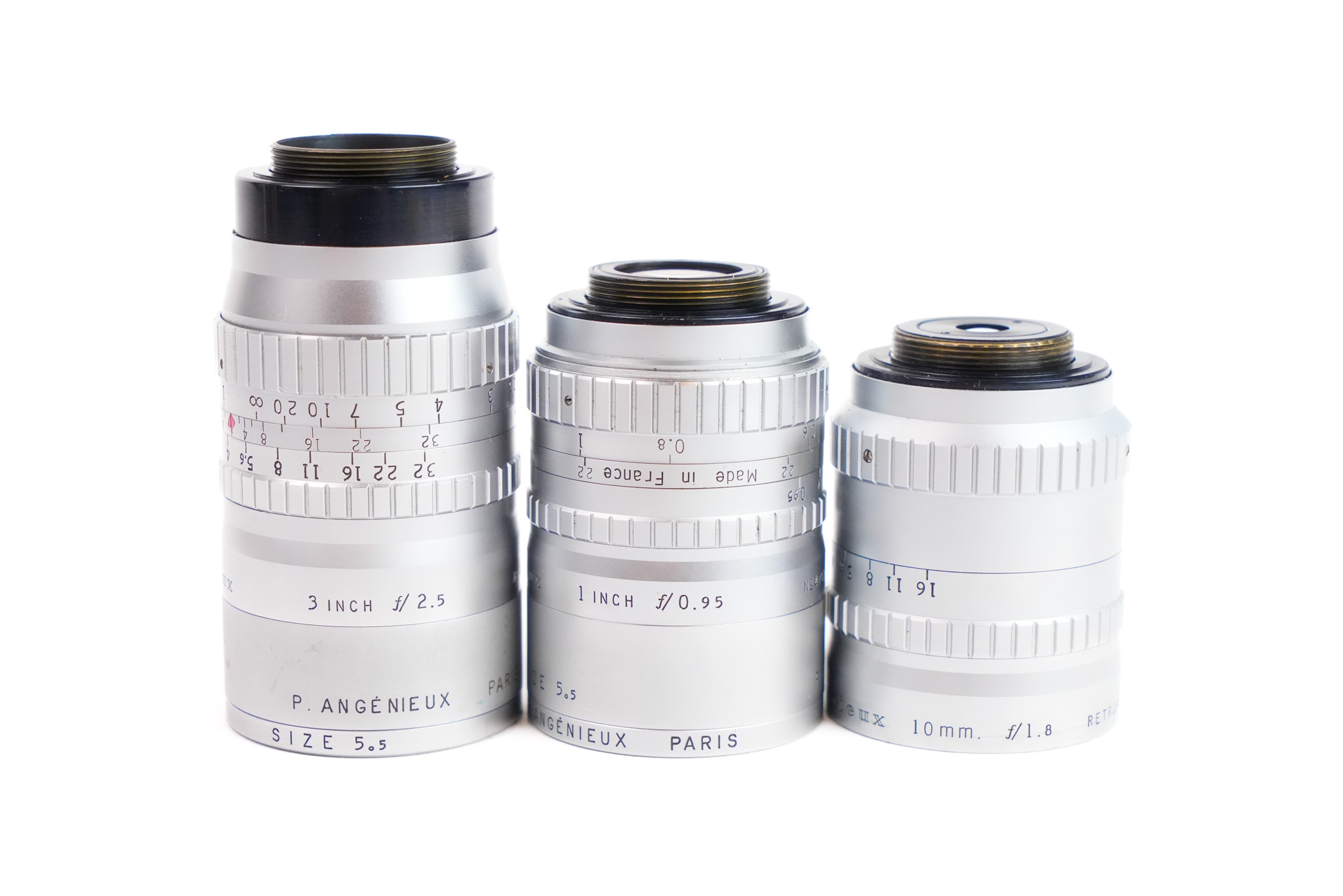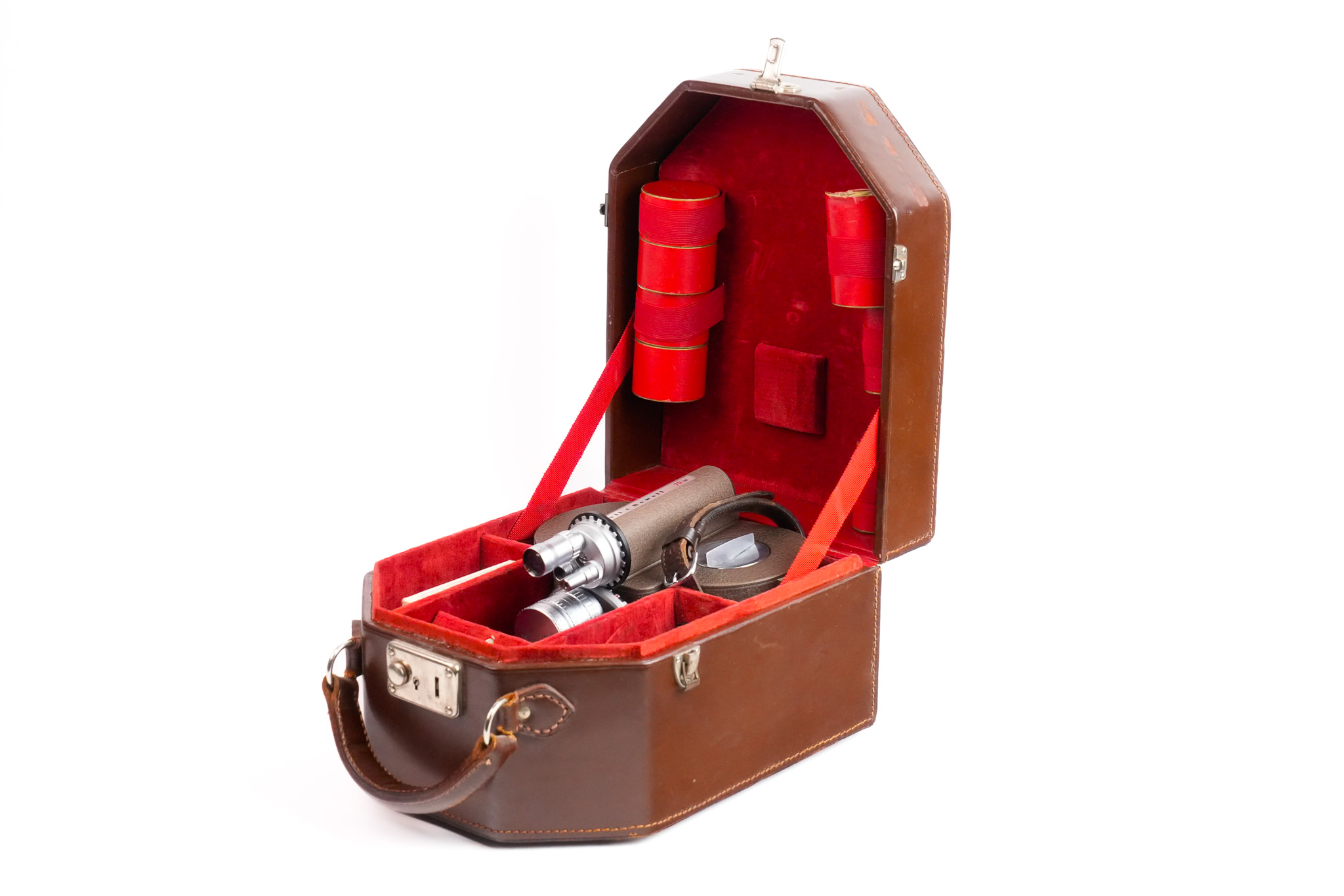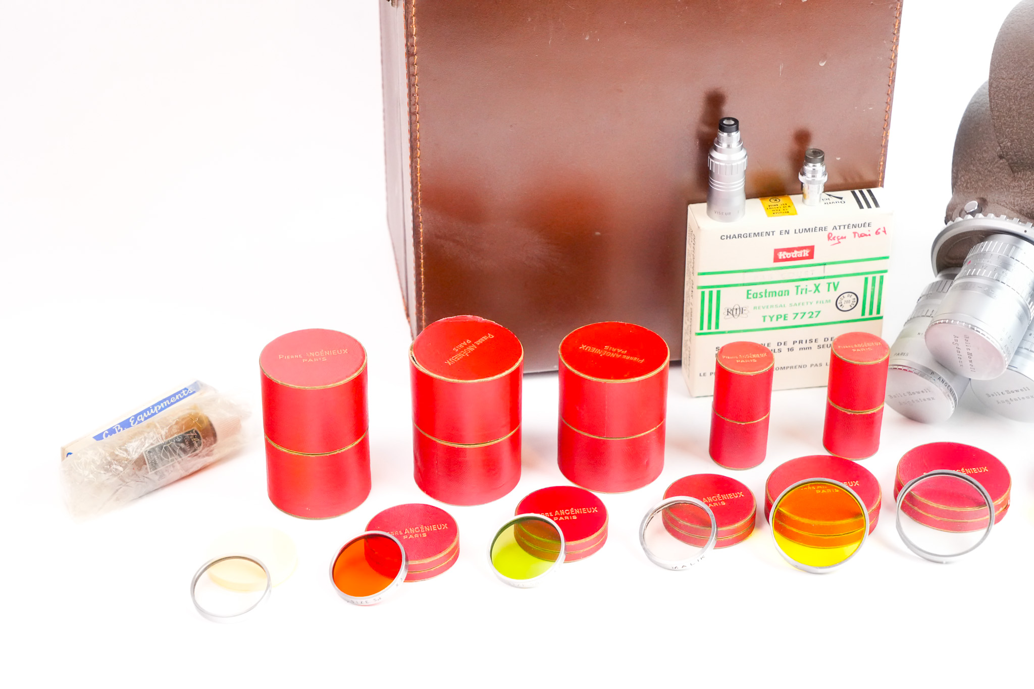 Très belle camera 70DR fabriqué par Bell & Howell à partir de 1955. C'est un modèle avec une tourelle à trois objectifs. Cette camera utilise de la pellicule 16mm. Le modèle présenté ici porte le numéro de série N°93252. Cette camera est présentée avec sa valise, sa poignée, un jeux de filtres et avec leurs boites. Les trois objectifs présents sont: - Bell & Howell Angénieux Retrofocus f/1.8 - 10mm #466820; - Bell & Howell Angénieux f/0.95 - 1" (25mm) #475974; - Bell & Howell Angénieux f/2.5 - 3" (75mm) #474923. Les bagues de mise au point et de diaphragme des objectifs, fonctionnent parfaitement. Les lentilles ont besoin d'un nettoyage (présence de champignon et d'une légère brume). L'obturateur déclenche correctement à toutes les vitesses. Exemplaire en très bel état.