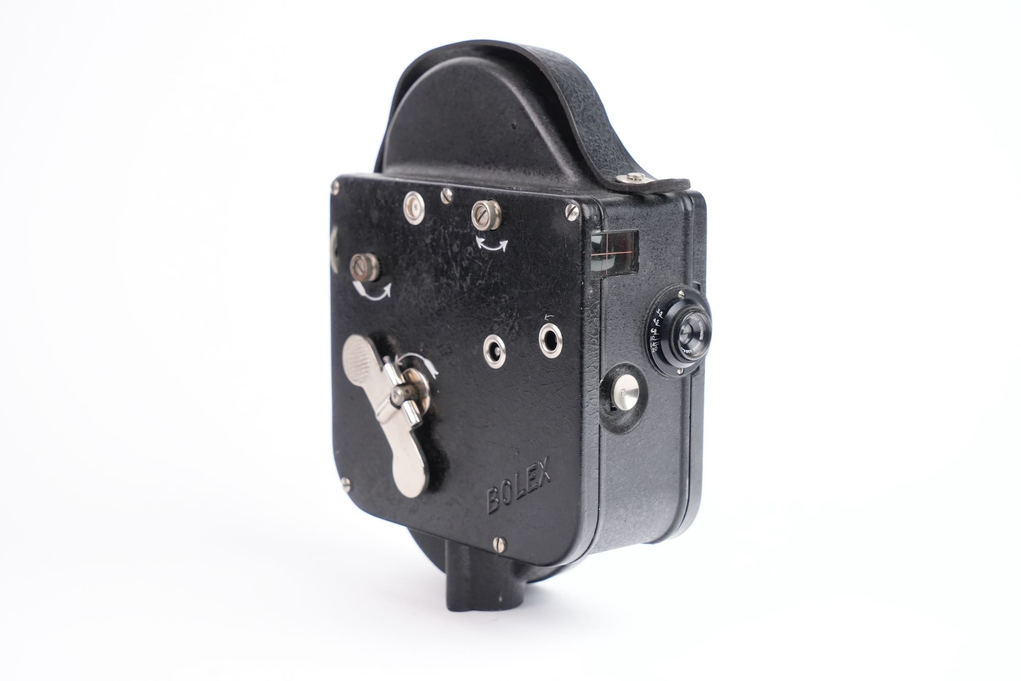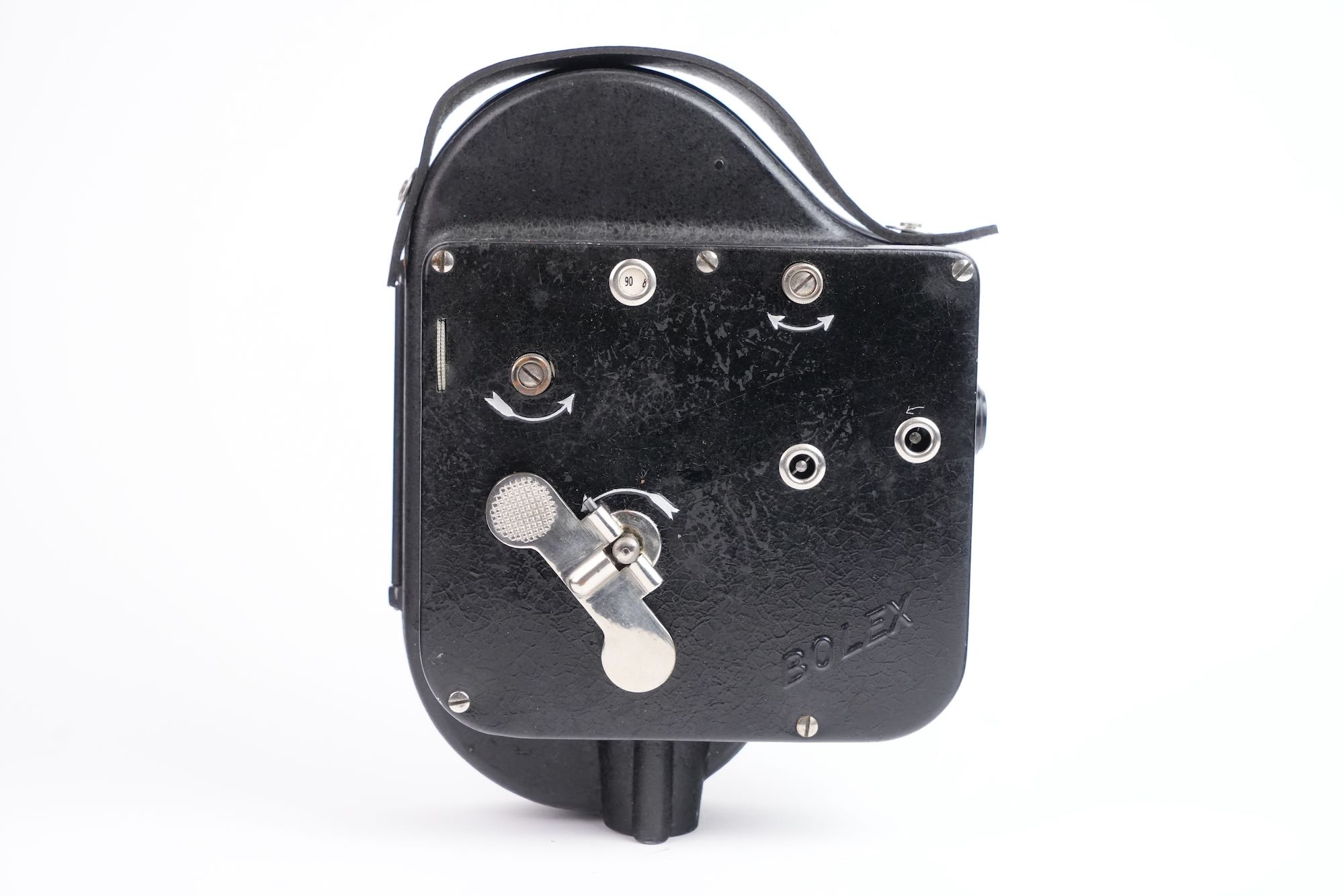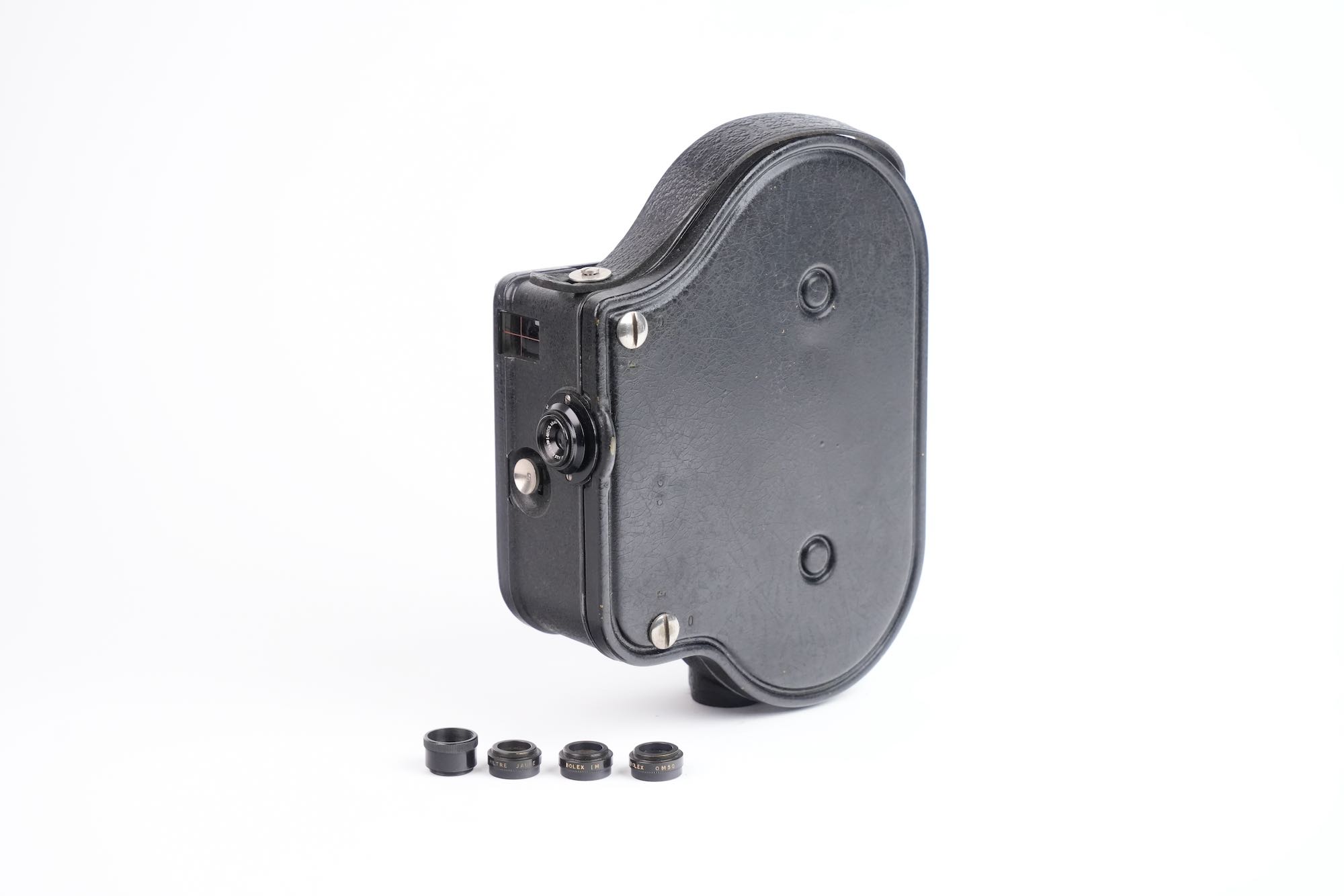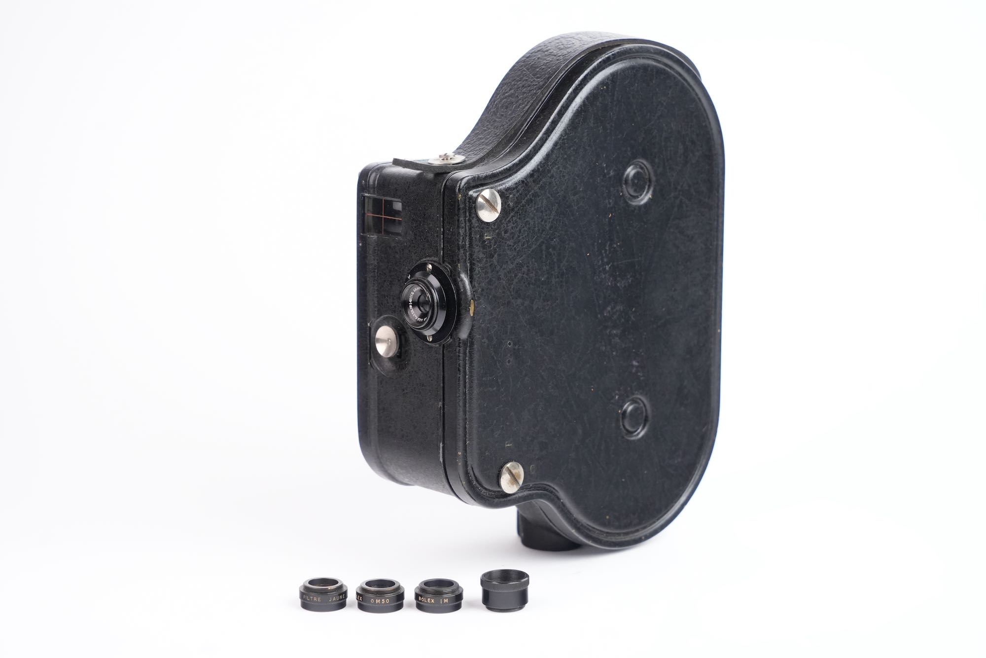Bolex, Auto Ciné B, Suisse, 1929. Deuxième modèle de caméra cinématographique 16 mm développé par Jacques Bogopolsky, l’Auto Ciné B prolonge et améliore les principes établis par l’Auto Ciné A, tout en affirmant l’identité technique et formelle de la marque BOLEX