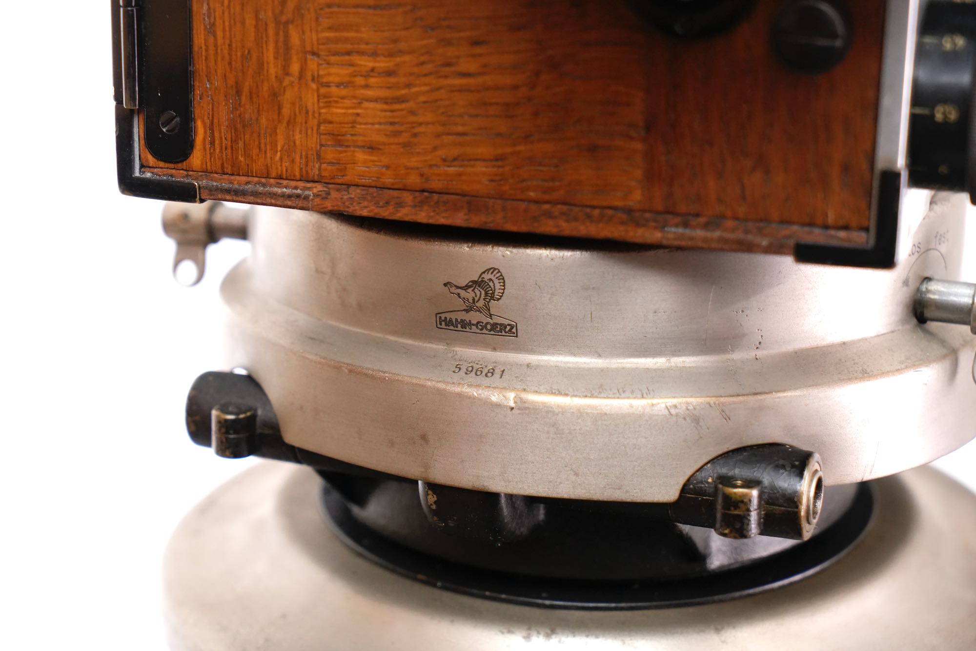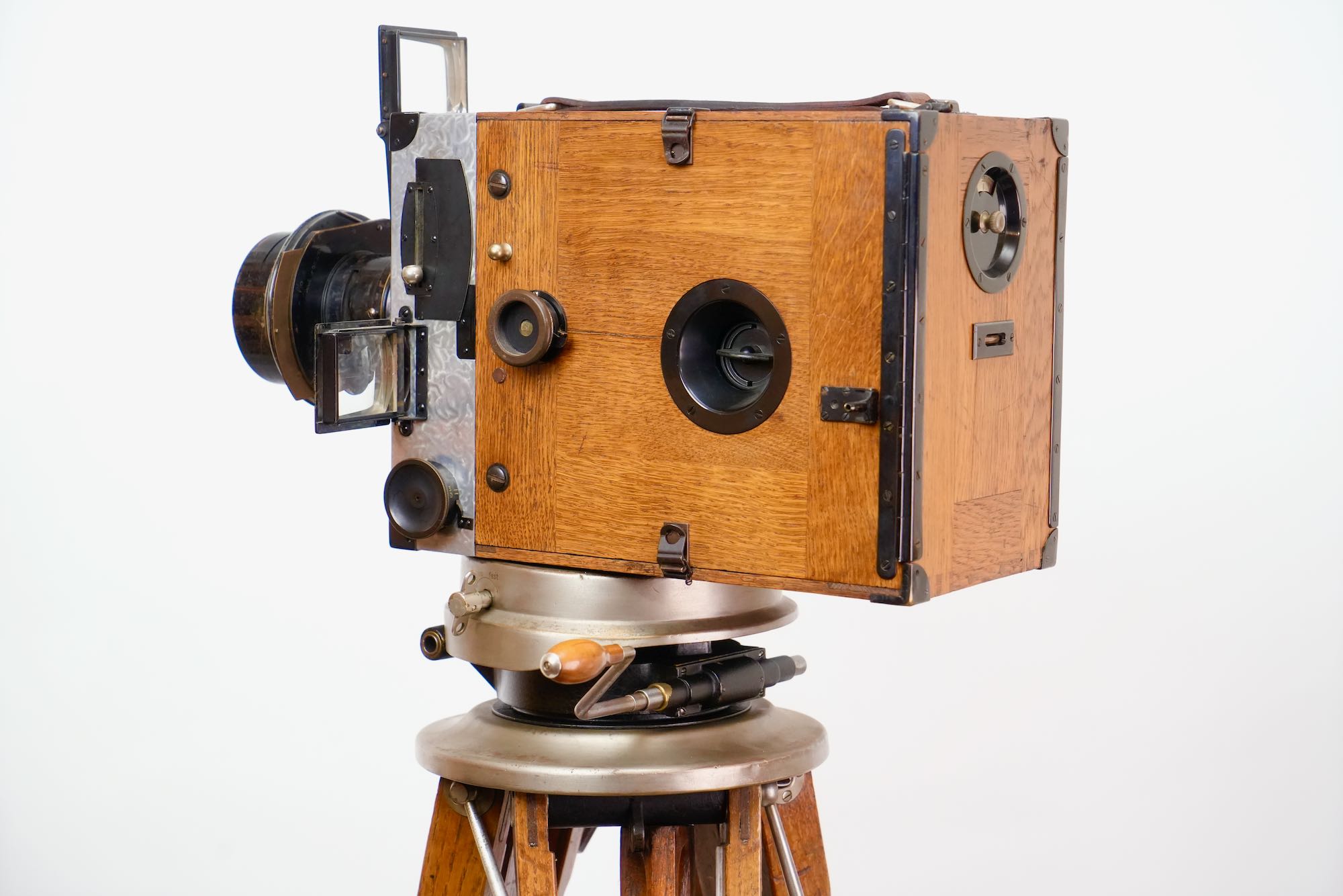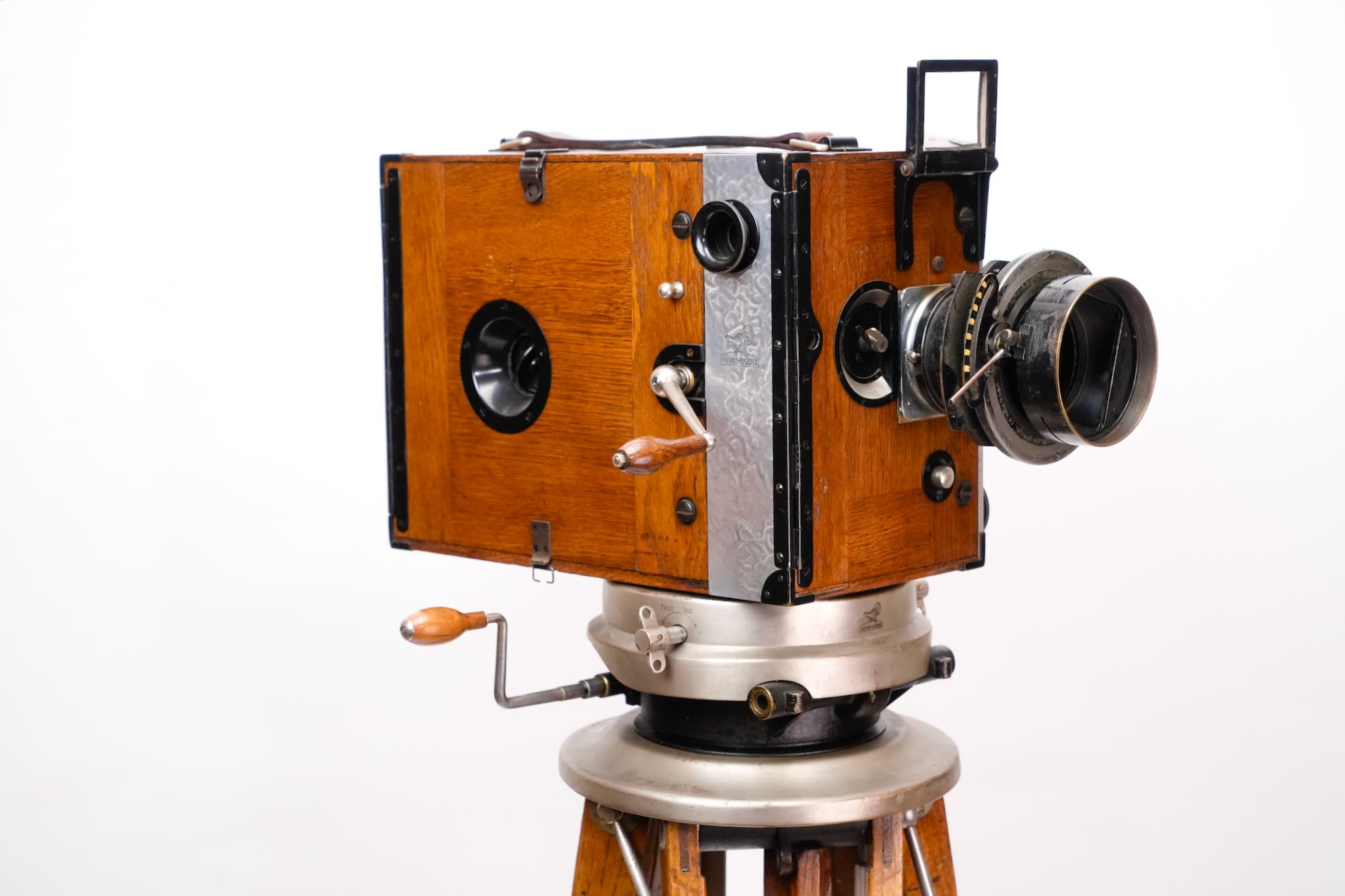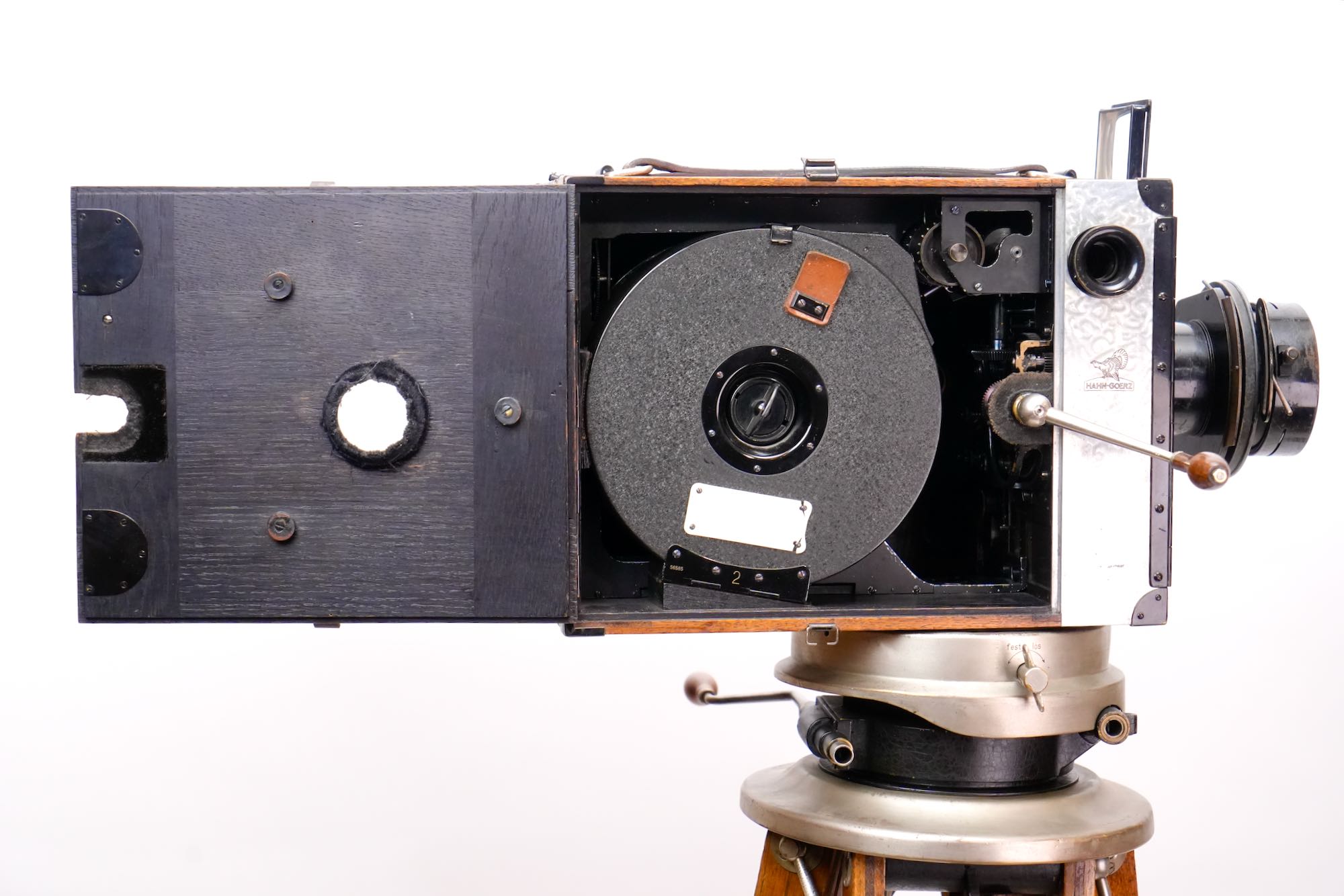 <div class="available-middle-text">En 1907, la Hahn AG est spécialisée dans l'optique et la mécanique (Hahn-Goerz). Cette filiale de Goerz AG ouvre une usine à Ihringshausen, près de Kassel. Dans le créneau 1919-1927, on y fabrique des projecteurs et des caméras de qualité. Ils rencontrent un grand succès auprès des professionnels du cinéma. La fabrication prend fin en 1927 après la fusion avec Zeiss-Ikon . La caméra que nous présentons est issue de cette production. Elle est dotée de détails de conception remaquables. La réalisation mécanique est d‘excellente facture. Le coffrage est en bois verni renforcé par des pièces métalliques peintes. La caméra peut recevoir des films 35 mm de 120 m. dans deux cassettes coaxiales bois / métal. Fixation manivelle sur le boîtier et manivelle originale. Le pied qui l'accompagne est du même fabricant. Très bel ensemble.</div>