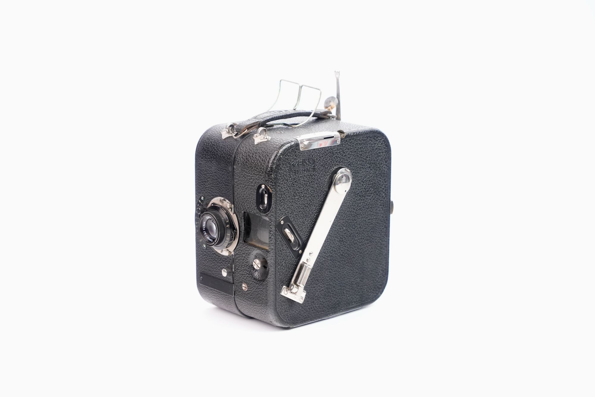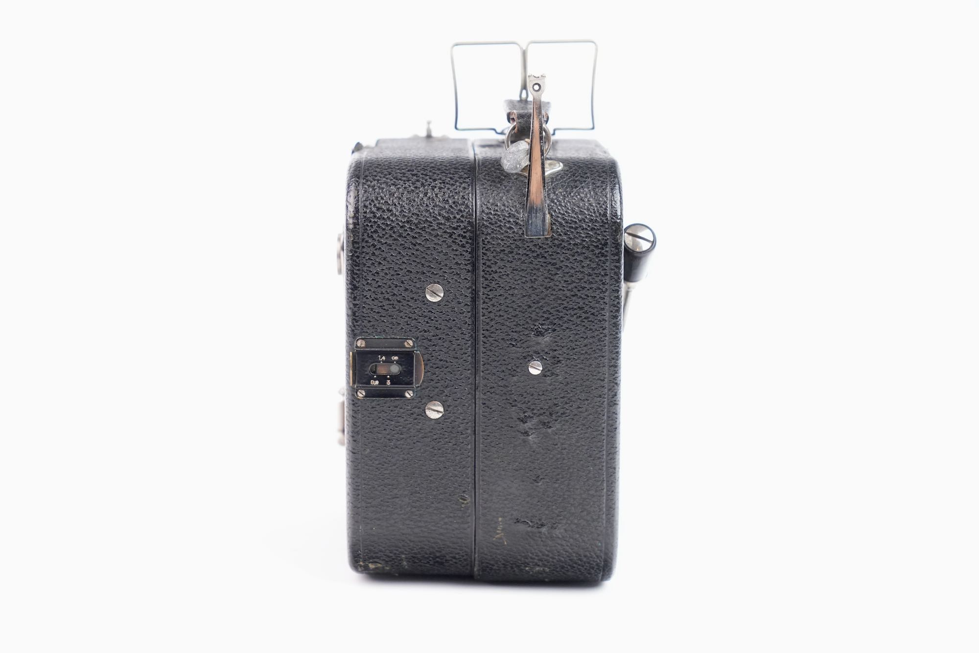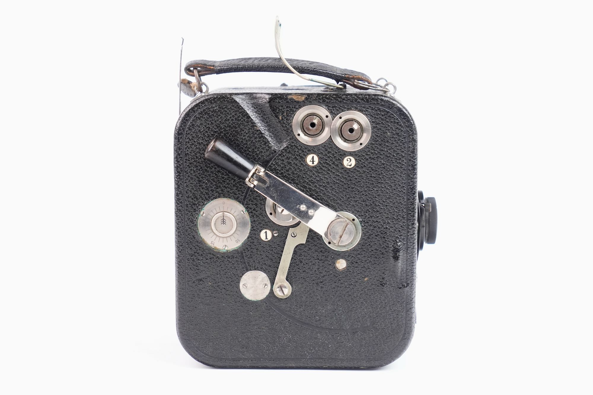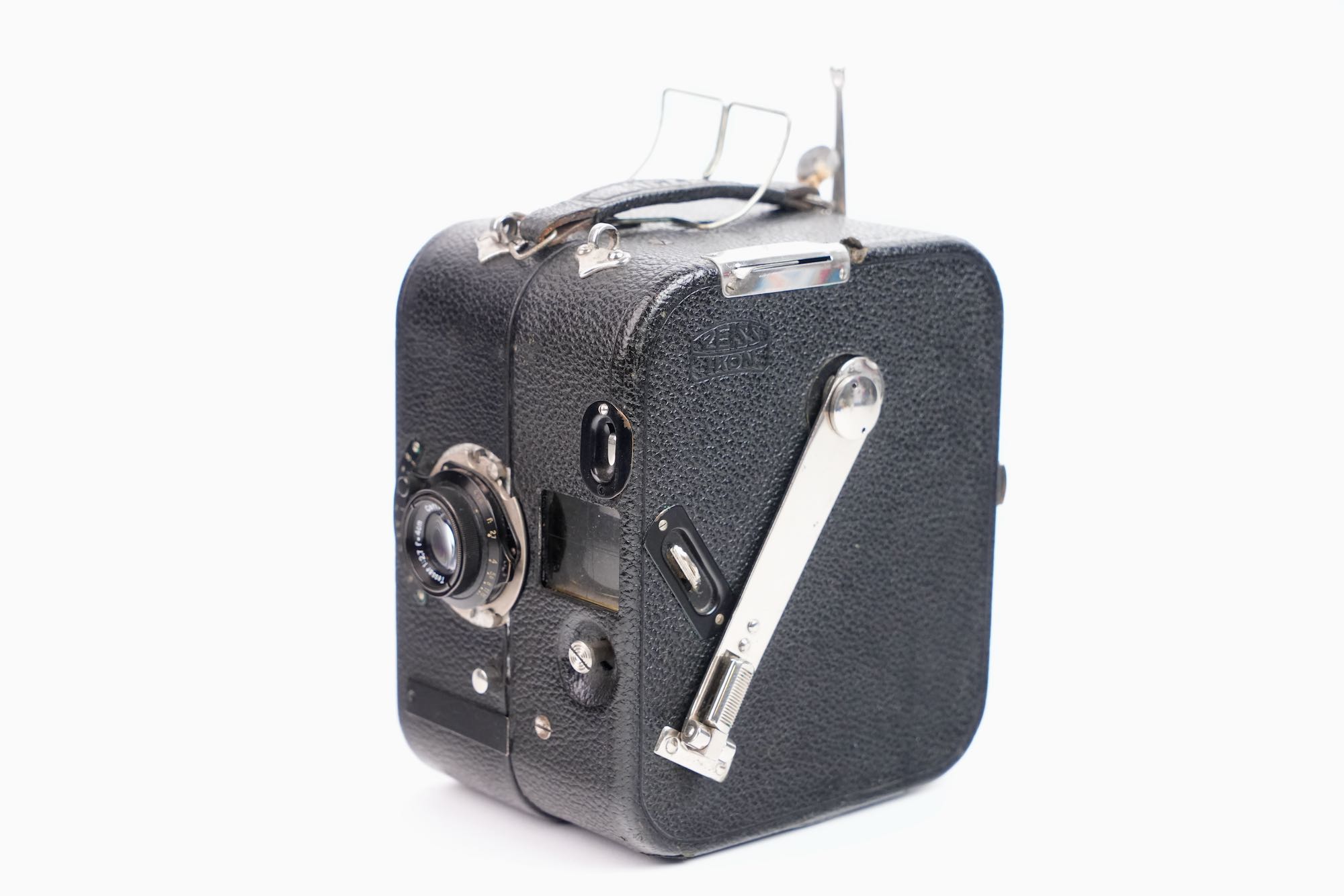 La caméra Kinamo 35 mm de ICA – Internationale Camera AG, développée au début des années 1920, compte parmi les premières caméras portables de format 35 mm conçues pour un usage de terrain, à une période où l’équipement cinématographique demeurait majoritairement encombrant et destiné au studio. L’exemplaire présenté est doté d’un moteur mécanique à ressort, armé par levier, garantissant une cadence stable sur une durée de prise de vues limitée et permettant une autonomie complète sans alimentation externe. Son boîtier métallique compact gainé de cuir protège le mécanisme de transport du film de haute précision, associé à un viseur latéral facilitant le cadrage en situation mobile. Prévue pour recevoir des objectifs interchangeables, ici un Tessar 40mm F/2.7