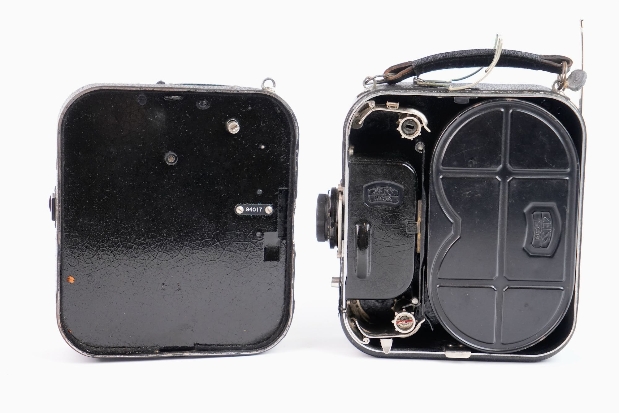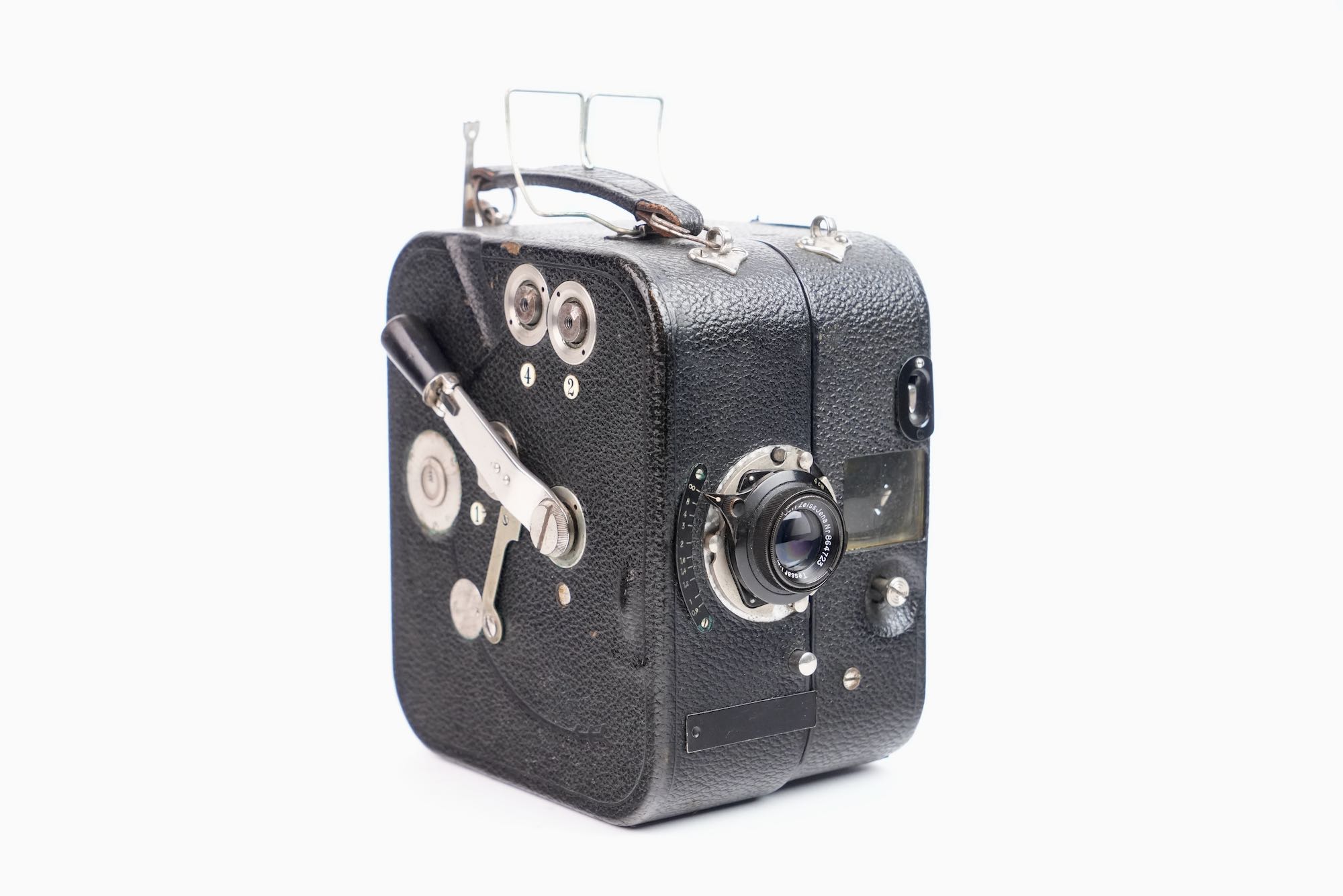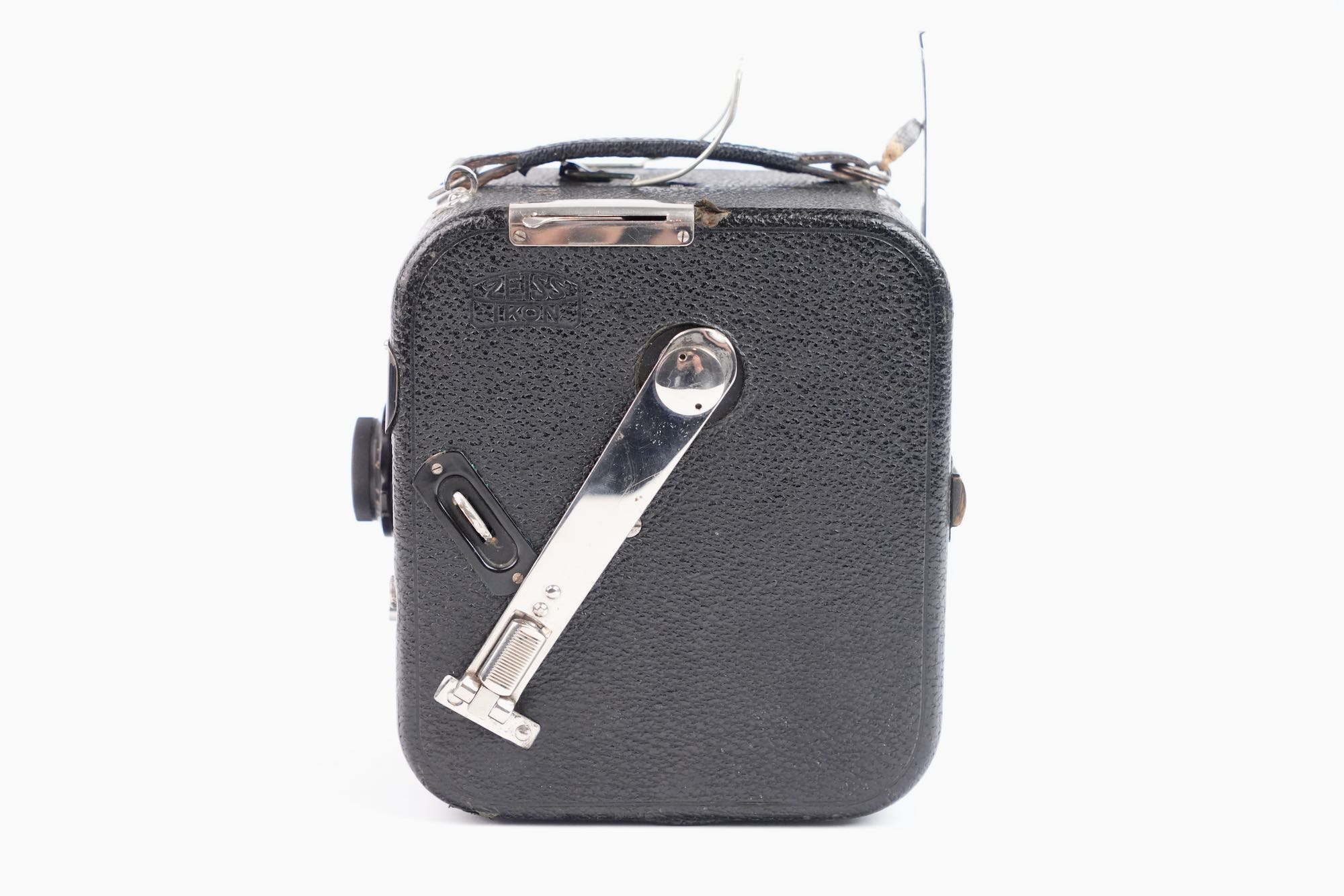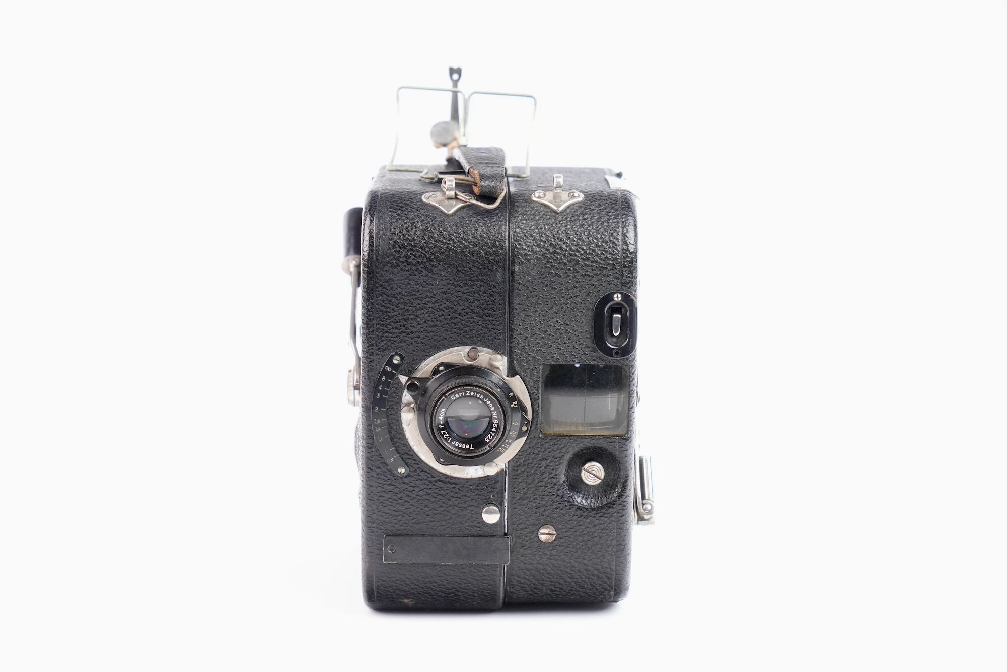 La caméra Kinamo 35 mm de ICA – Internationale Camera AG, développée au début des années 1920, compte parmi les premières caméras portables de format 35 mm conçues pour un usage de terrain, à une période où l’équipement cinématographique demeurait majoritairement encombrant et destiné au studio. L’exemplaire présenté est doté d’un moteur mécanique à ressort, armé par levier, garantissant une cadence stable sur une durée de prise de vues limitée et permettant une autonomie complète sans alimentation externe. Son boîtier métallique compact gainé de cuir protège le mécanisme de transport du film de haute précision, associé à un viseur latéral facilitant le cadrage en situation mobile. Prévue pour recevoir des objectifs interchangeables, ici un Tessar 40mm F/2.7