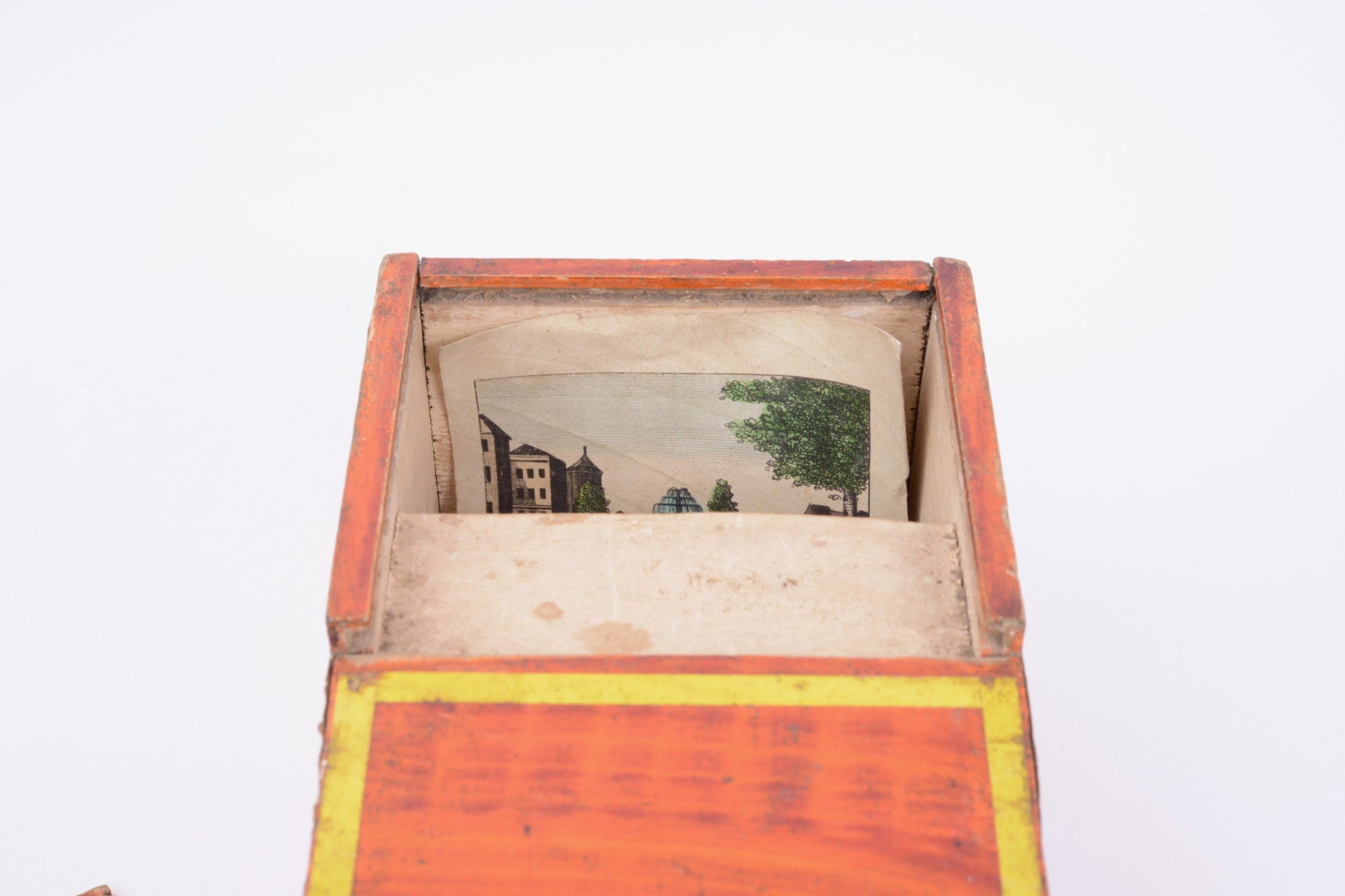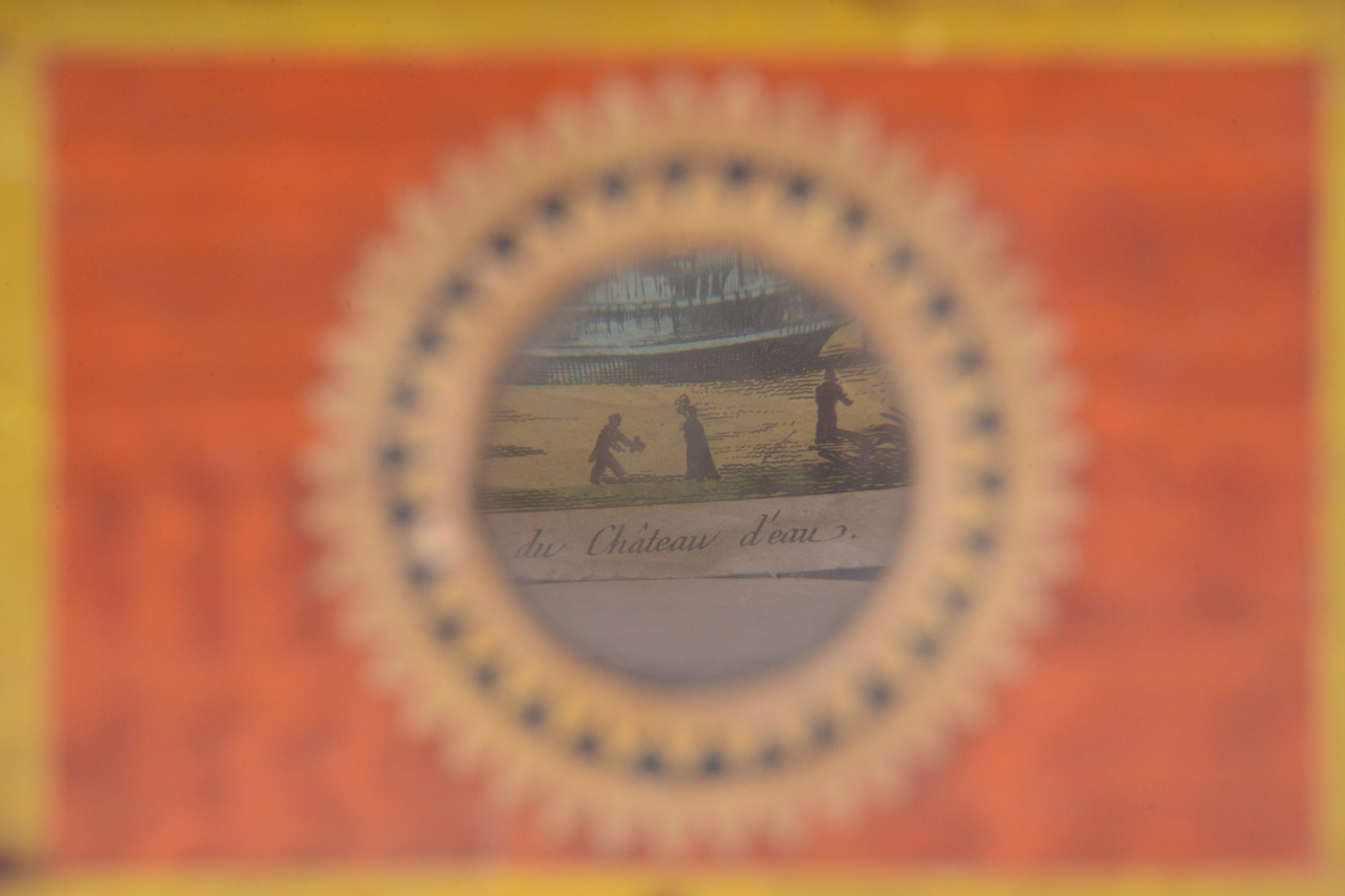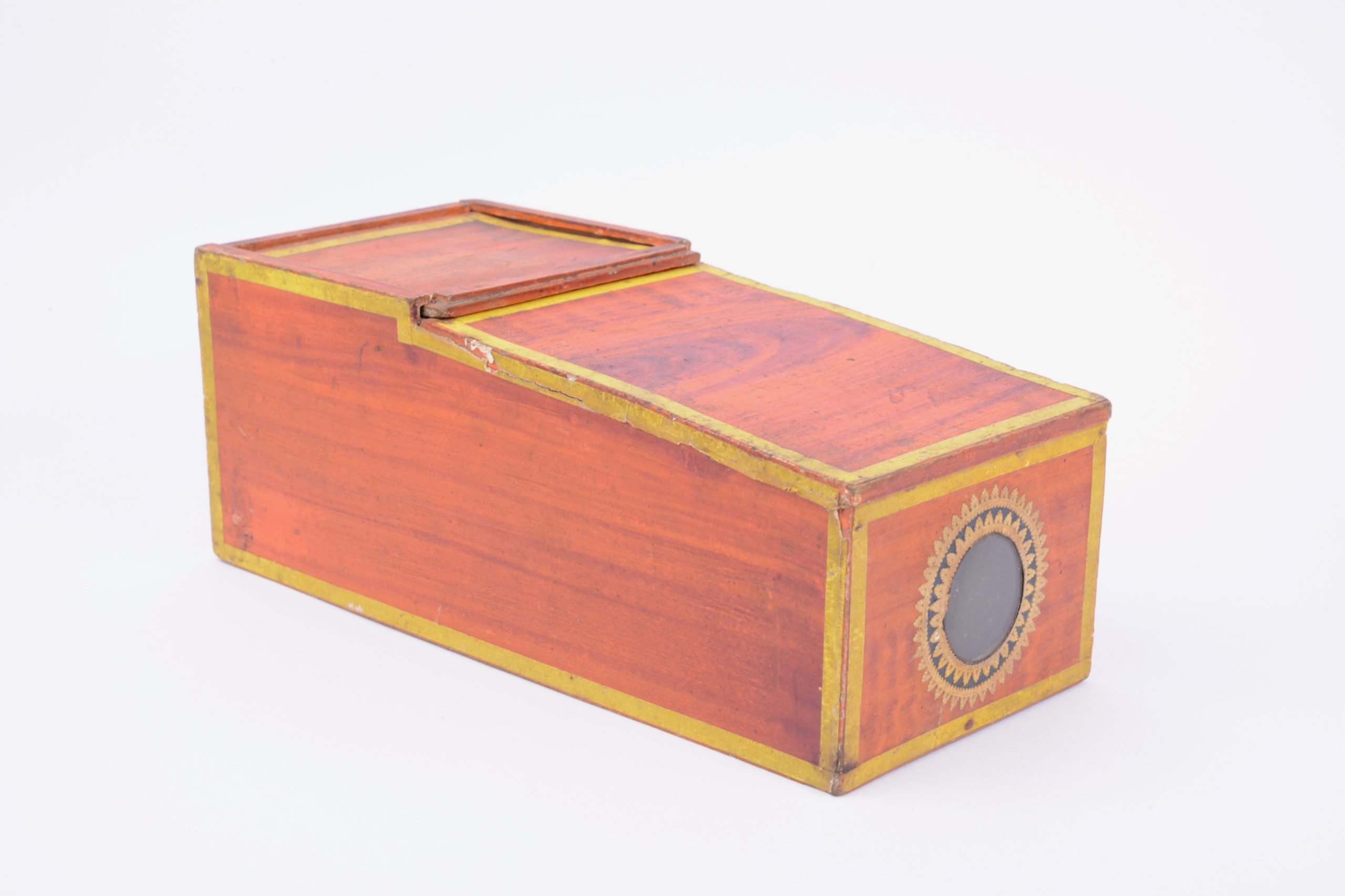 Boite optique ou Peep-show pour vues. France vers 1820. Une telle boite possède deux fonctions ; celle de peep-show pour l’observation des vues ou bien celle de boite optique pour le dessin. La boite est construite en bois recouvert d’une teinte au sang-de-bœuf rehaussée de motifs   géométriques à filets jaunes. Cette boite optique se distingue des autres de par ses toutes petites dimensions : 25x11x10 cm. Elle reçoit des vues de 9x9 cm. Sont présentes quatre vues polychromes de sites remarquables parisiens légendés : « Vue du Château d’eau », « Vue de la Place du Chatelet » et « Vue du Palis de la Bourse ».  Rare dans ce petit format.