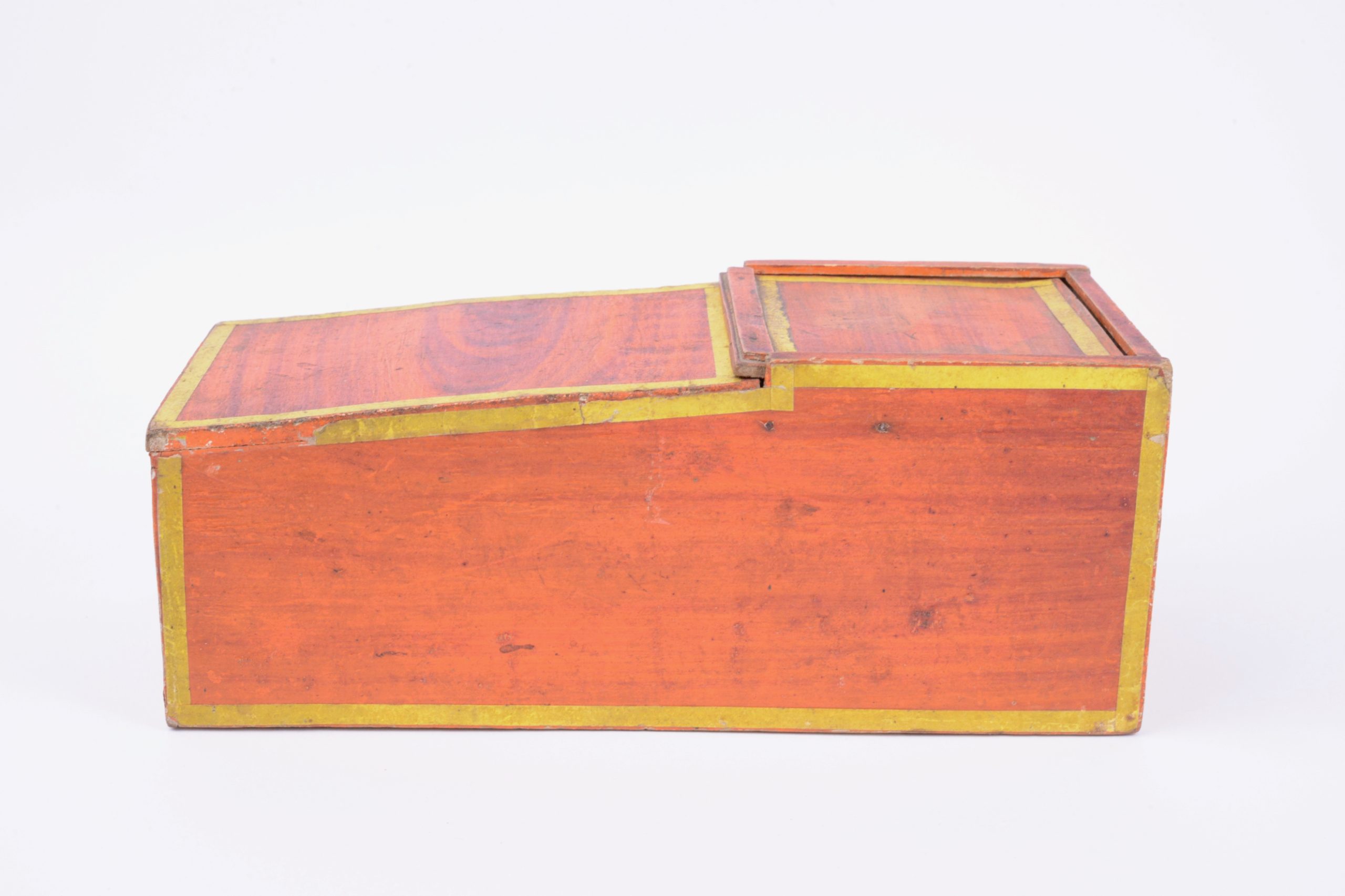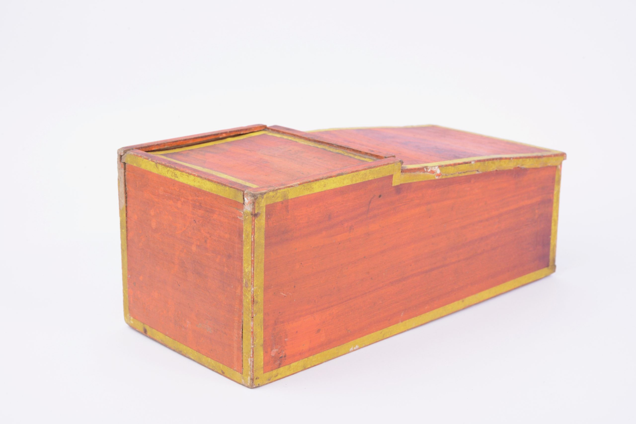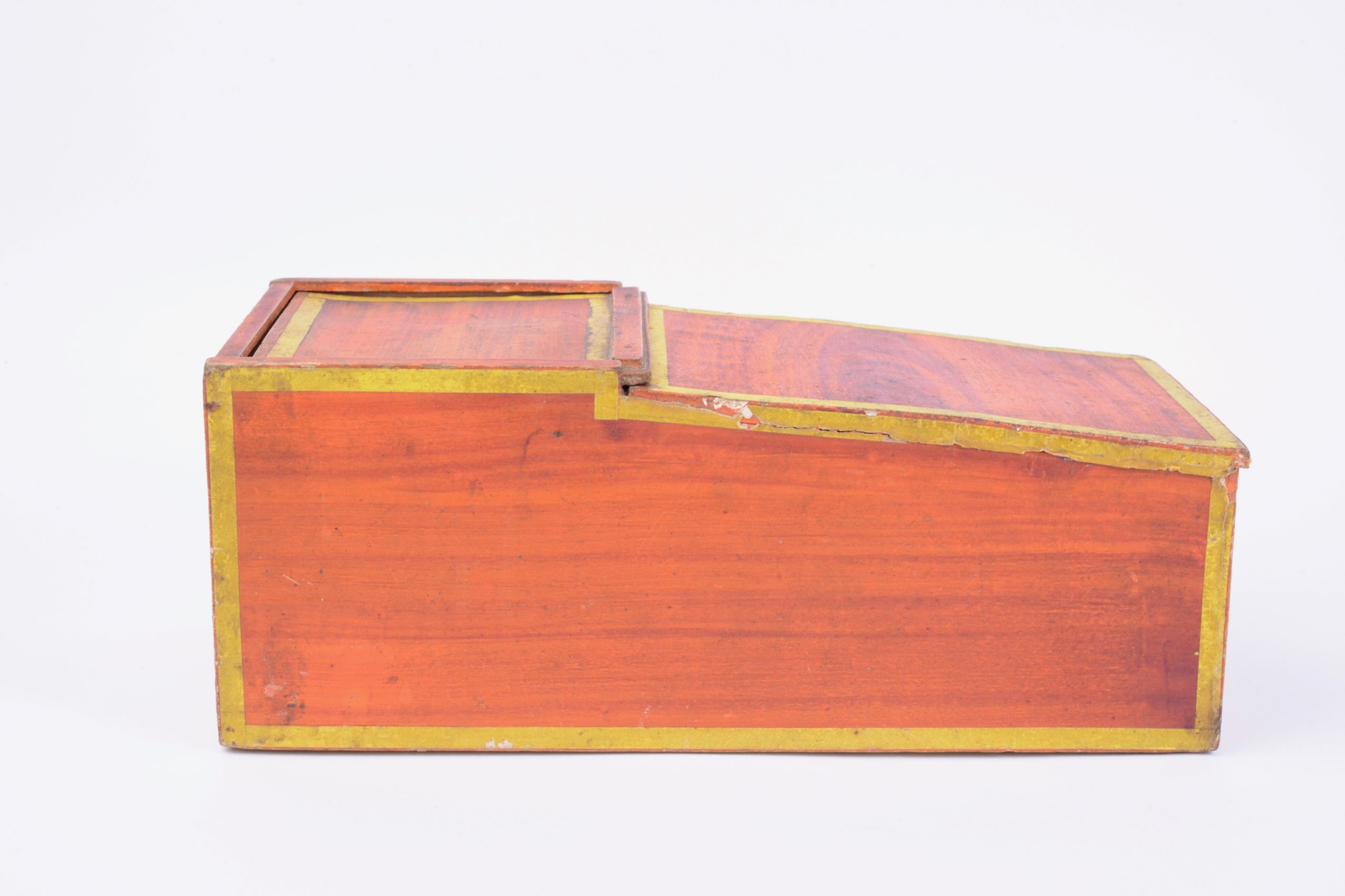 Boite optique ou Peep-show pour vues. France vers 1820. Une telle boite possède deux fonctions ; celle de peep-show pour l’observation des vues ou bien celle de boite optique pour le dessin. La boite est construite en bois recouvert d’une teinte au sang-de-bœuf rehaussée de motifs   géométriques à filets jaunes. Cette boite optique se distingue des autres de par ses toutes petites dimensions : 25x11x10 cm. Elle reçoit des vues de 9x9 cm. Sont présentes quatre vues polychromes de sites remarquables parisiens légendés : « Vue du Château d’eau », « Vue de la Place du Chatelet » et « Vue du Palis de la Bourse ».  Rare dans ce petit format.