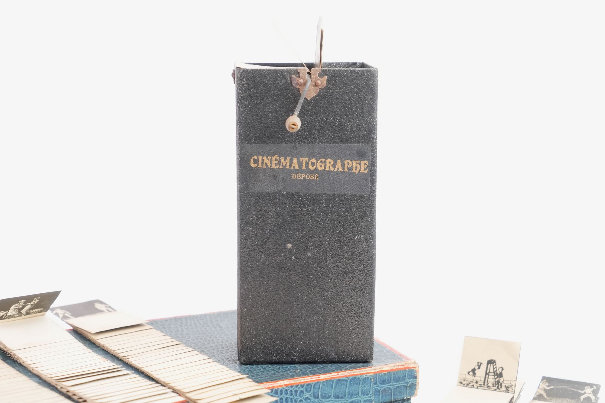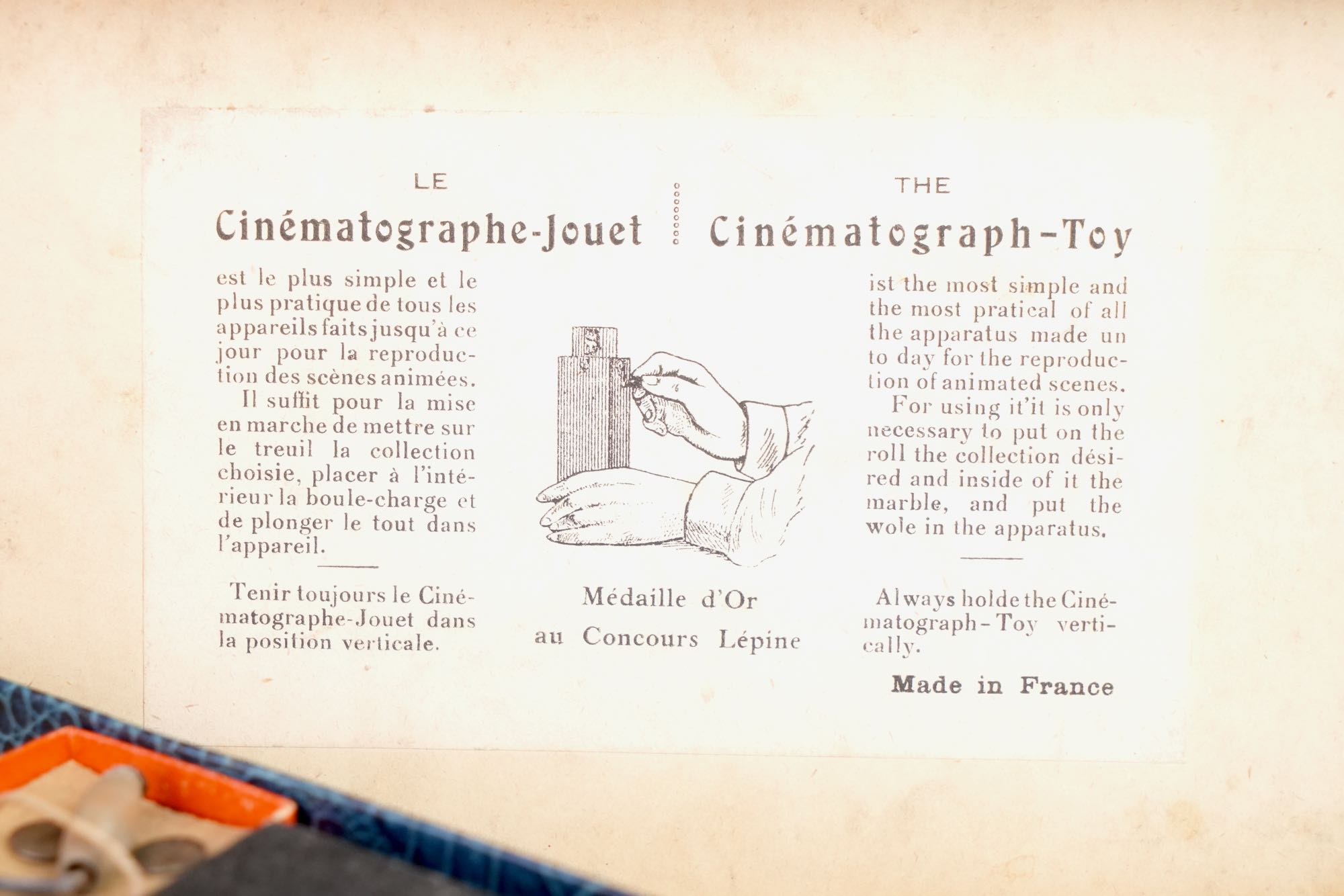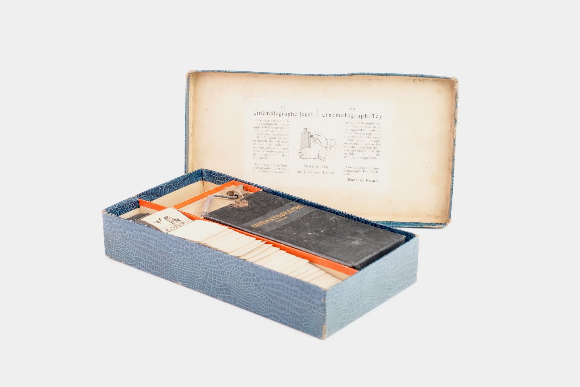 Cinématographe Jouet Déposé. Une telle invention reçut la médaille d'or au concours Lépine 1920. Ensemble complet de son armature, sa boule de lestage et cinq bandes de scénettes animées, le tout se renfermant dans une boite en carton d'origine. À l'intérieur du couvercle de la boite se trouve contrecollée une instruction d'emploi. Exemplaire complet et en bel état. La boîte mesure 14 x 26 cm.