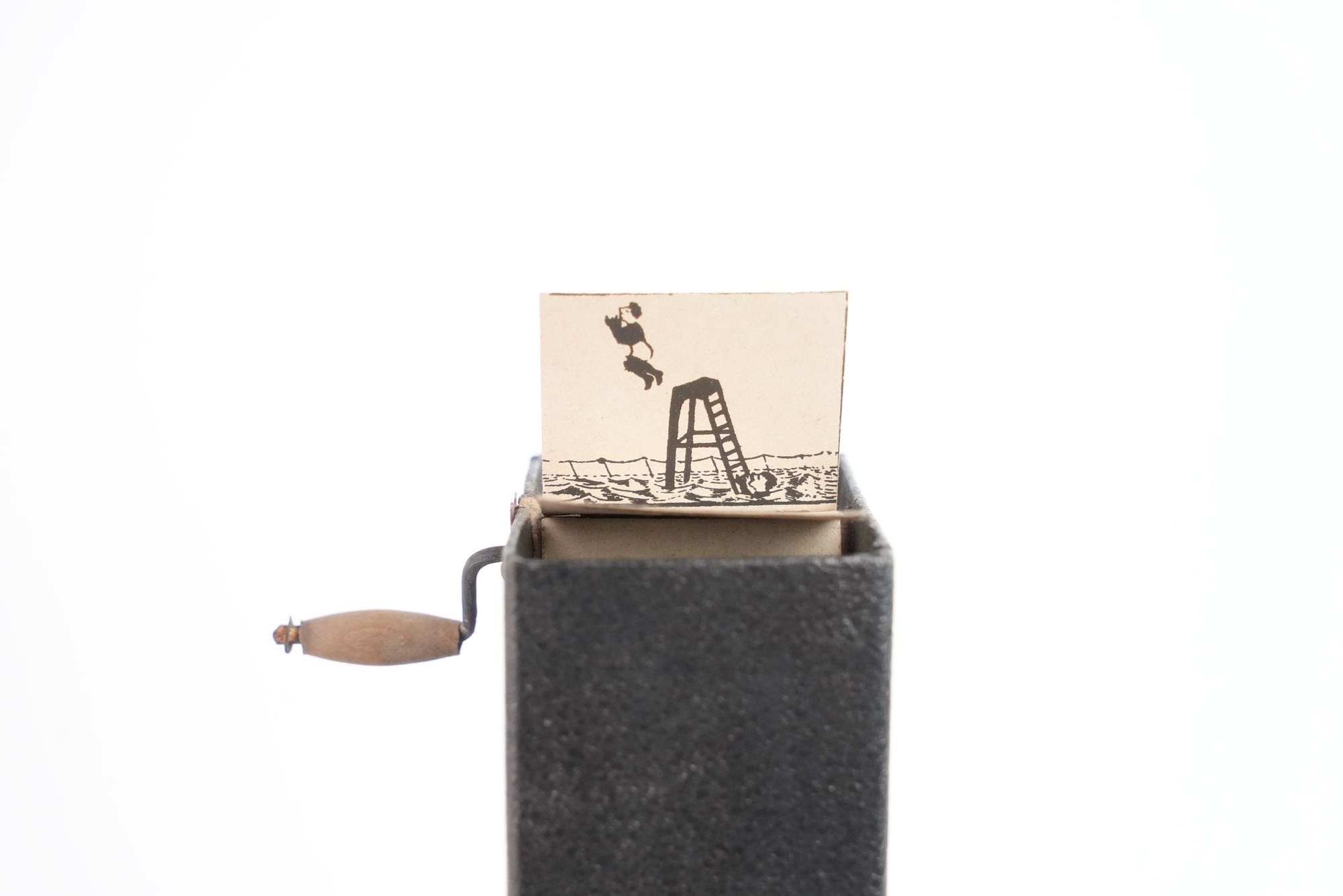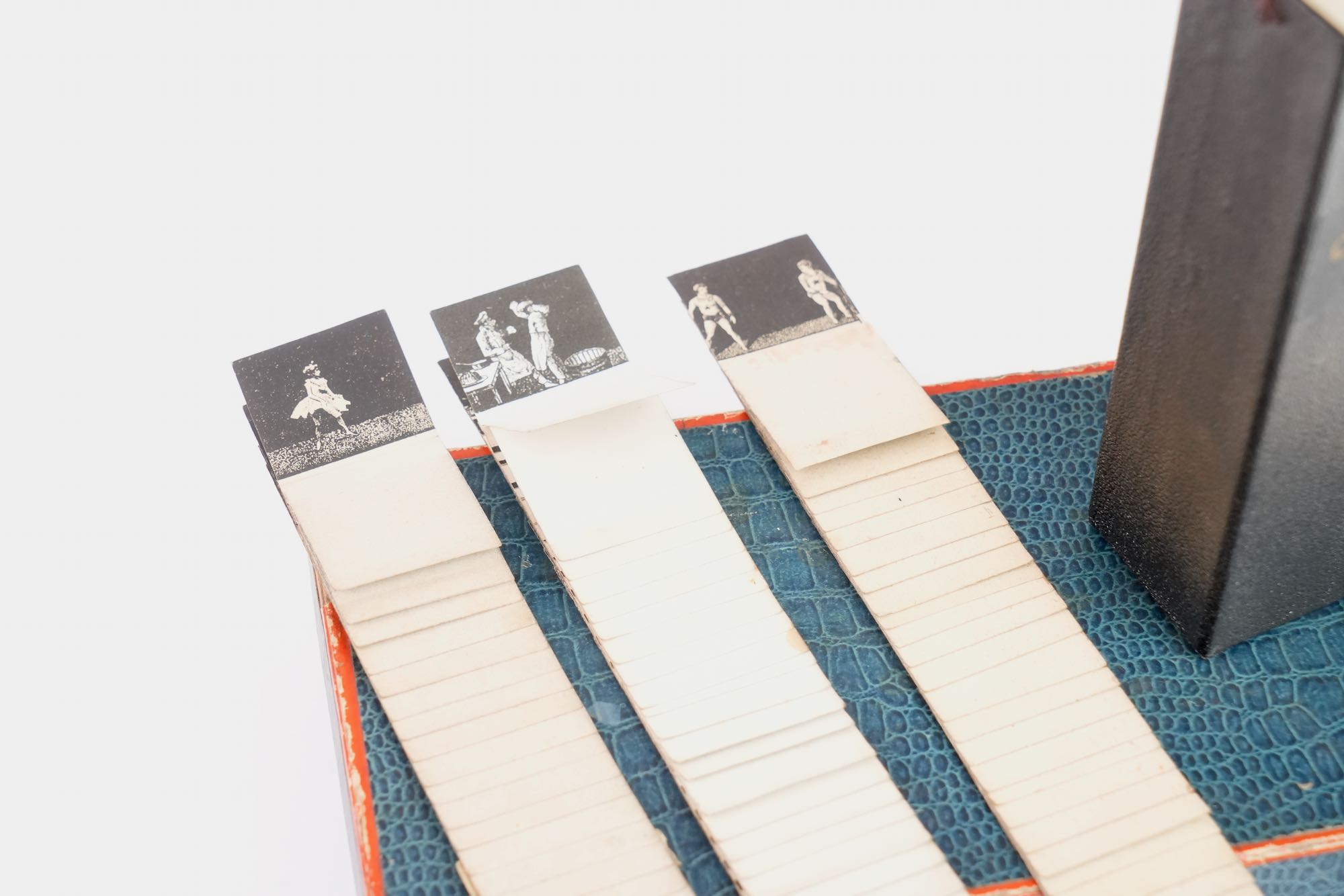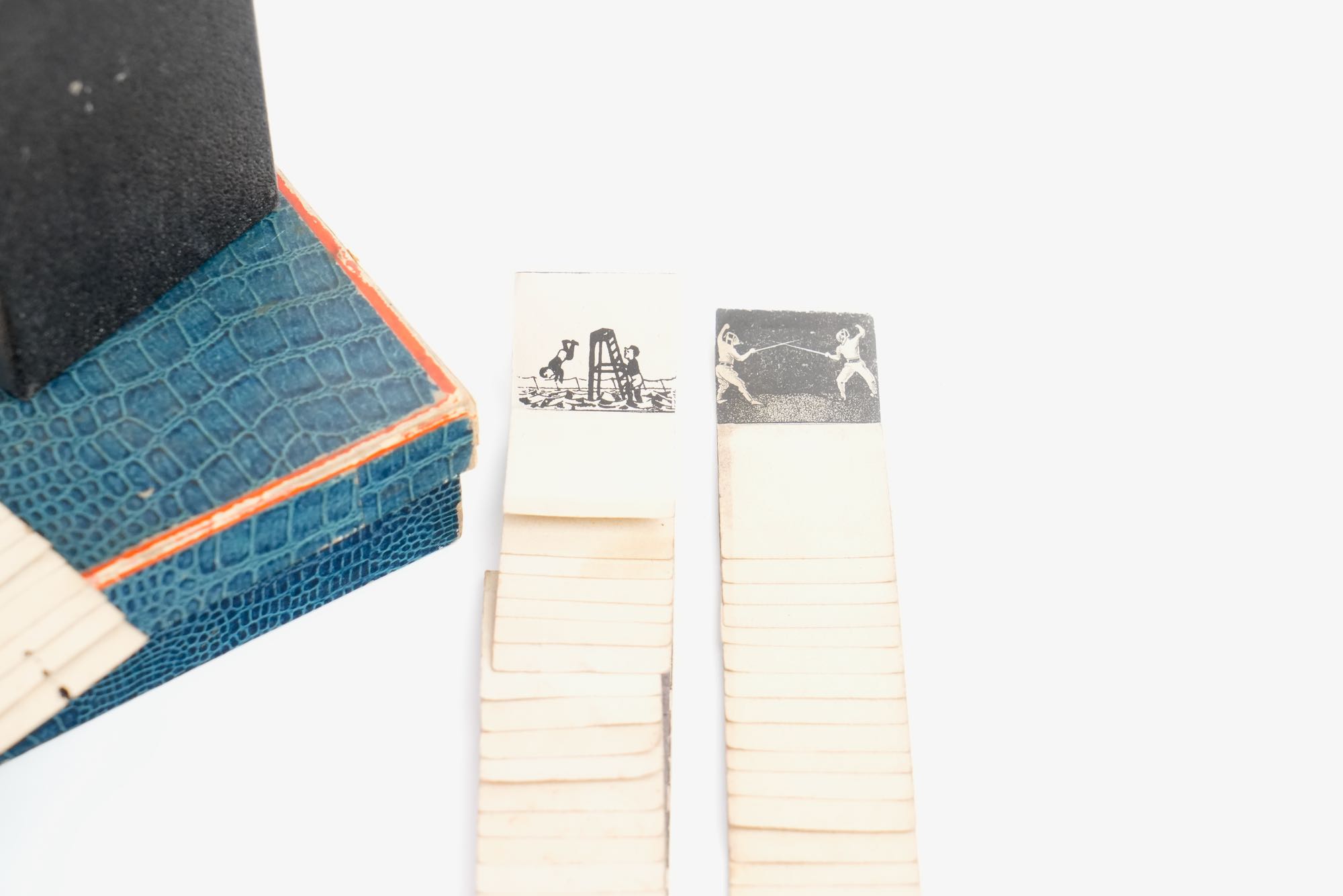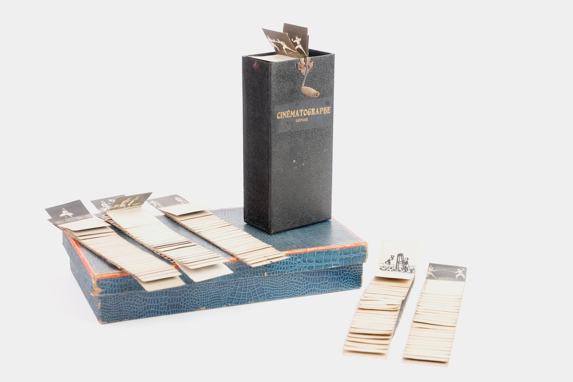 Cinématographe Jouet Déposé. Une telle invention reçut la médaille d'or au concours Lépine 1920. Ensemble complet de son armature, sa boule de lestage et cinq bandes de scénettes animées, le tout se renfermant dans une boite en carton d'origine. À l'intérieur du couvercle de la boite se trouve contrecollée une instruction d'emploi. Exemplaire complet et en bel état. La boîte mesure 14 x 26 cm.