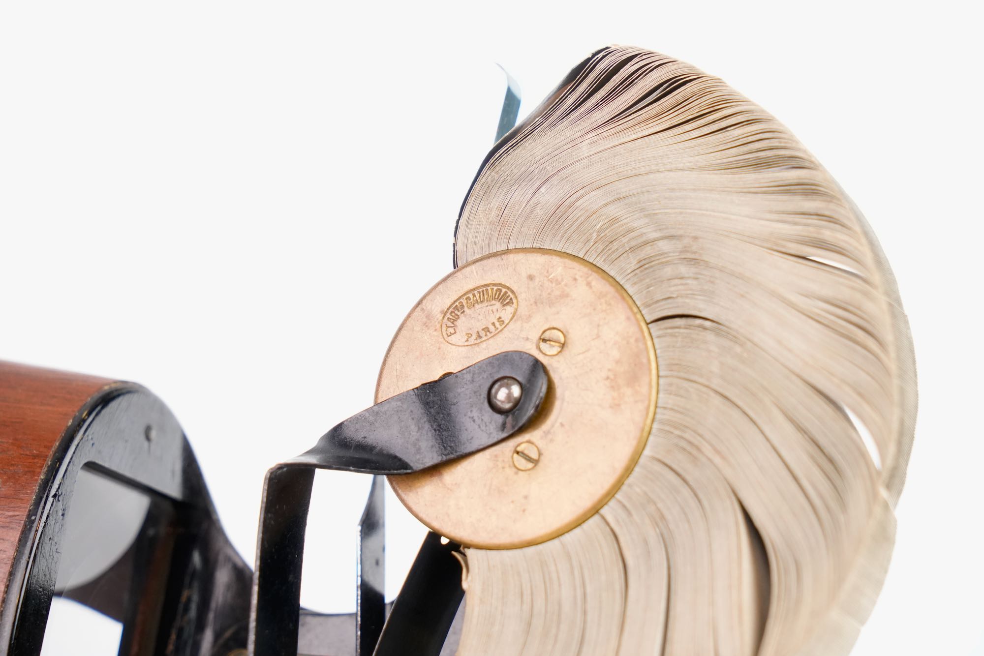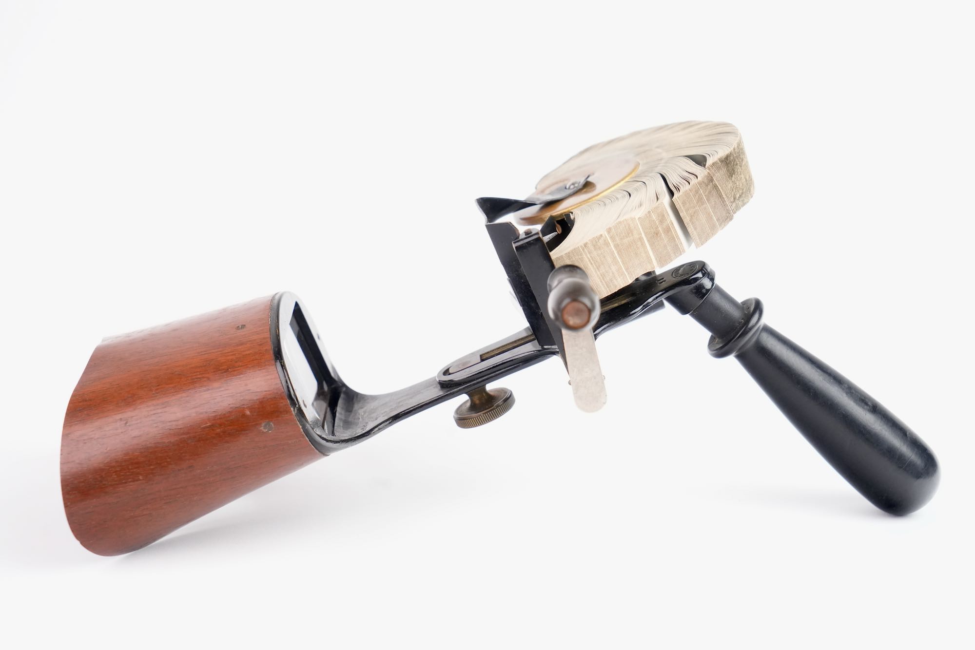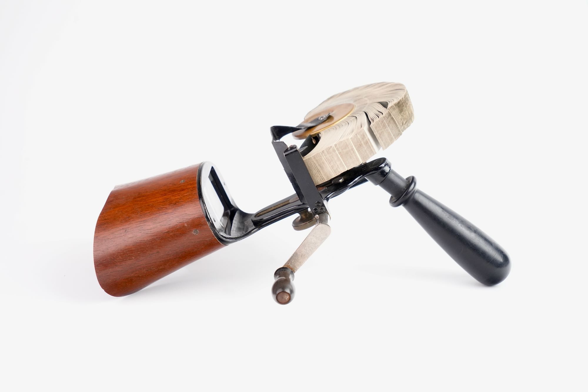 Appareil portatif de vision animée, le Kinora à main est fabriqué et commercialisé par la maison française Gaumont à partir de 1911, dans le contexte de l’essor du cinéma et des dispositifs d’images animées domestiques. Constitué d’un manche, d’un mécanisme d’entraînement et d’un bloc de feuillets photographiques montés en disque, l’appareil permet, par rotation manuelle, de feuilleter rapidement une série d’images et de restituer l’illusion du mouvement. L’observateur regarde la séquence à travers un viseur muni d’une lentille, transformant ainsi une succession de photographies en une courte scène animée.Livré avec un véritagle rouleau Gaumont.