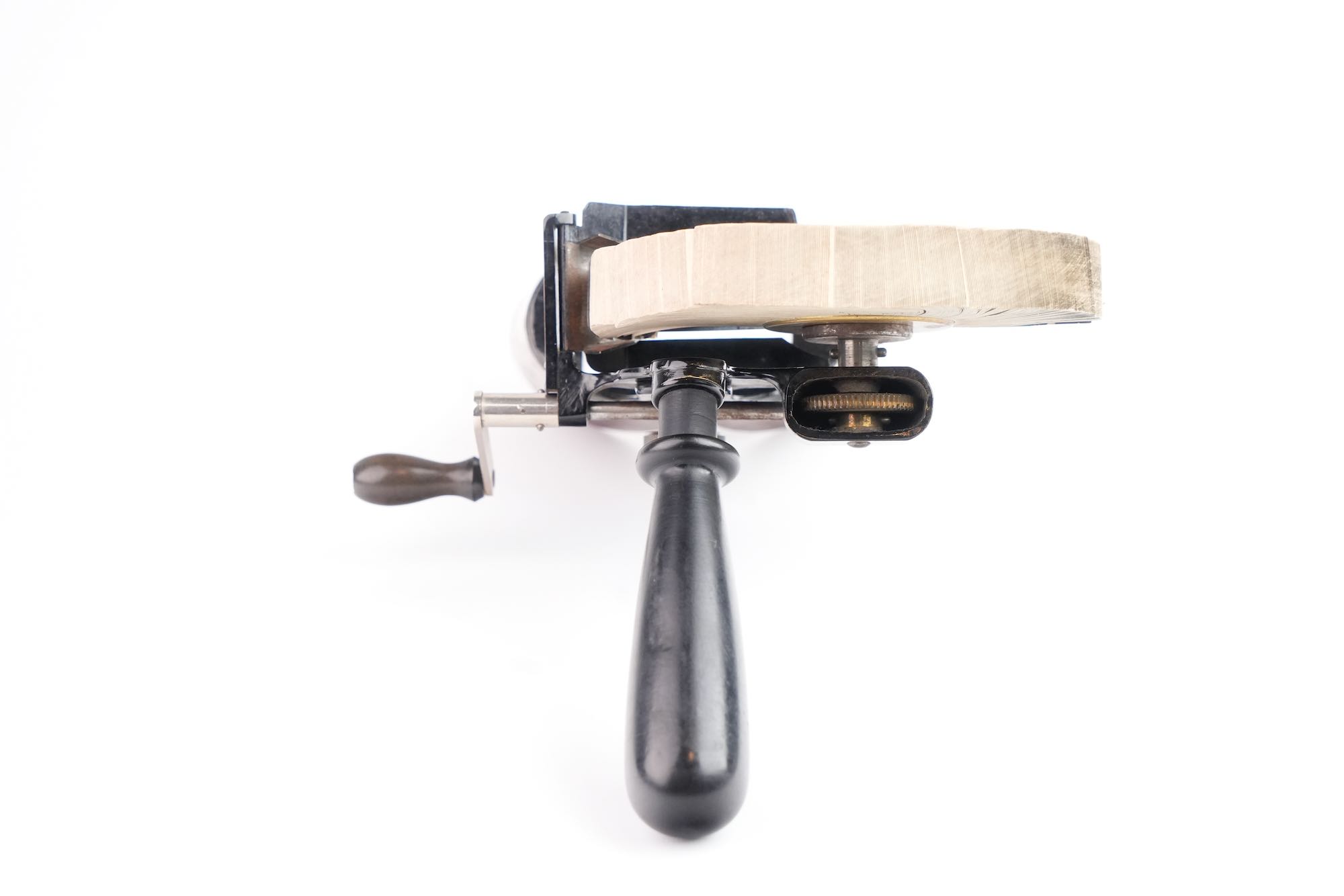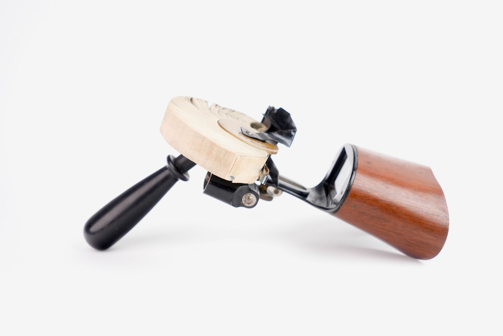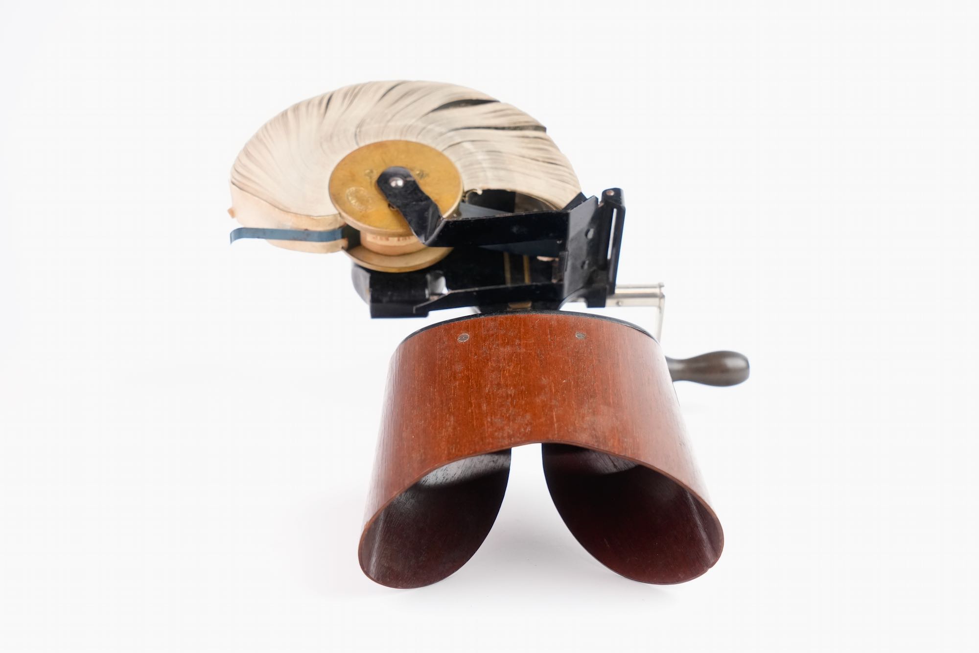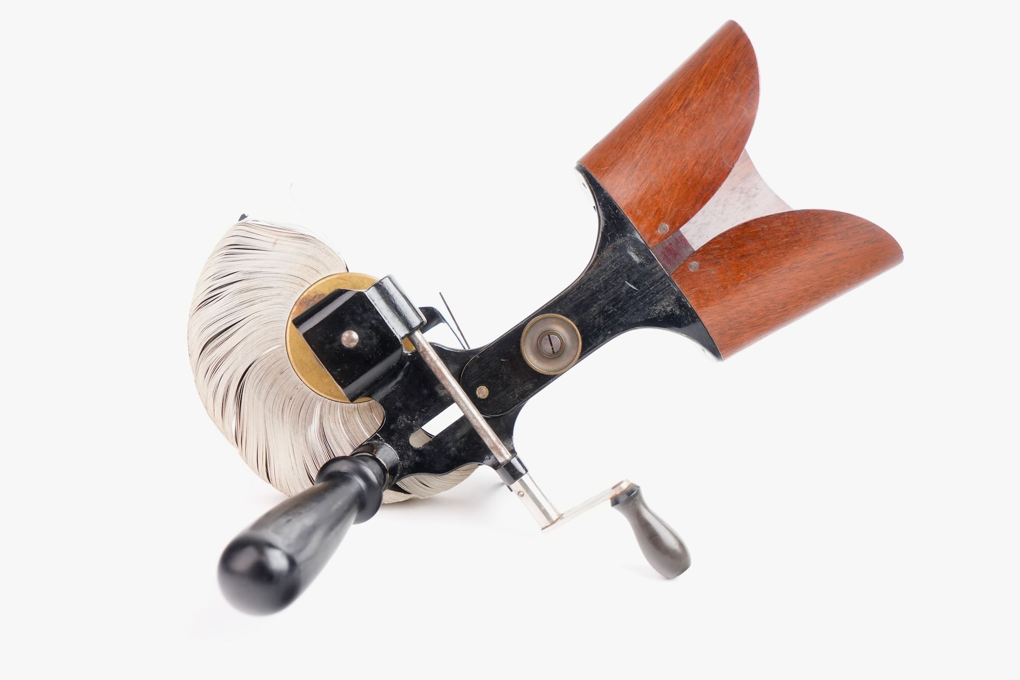 Appareil portatif de vision animée, le Kinora à main est fabriqué et commercialisé par la maison française Gaumont à partir de 1911, dans le contexte de l’essor du cinéma et des dispositifs d’images animées domestiques. Constitué d’un manche, d’un mécanisme d’entraînement et d’un bloc de feuillets photographiques montés en disque, l’appareil permet, par rotation manuelle, de feuilleter rapidement une série d’images et de restituer l’illusion du mouvement. L’observateur regarde la séquence à travers un viseur muni d’une lentille, transformant ainsi une succession de photographies en une courte scène animée.Livré avec un véritagle rouleau Gaumont.