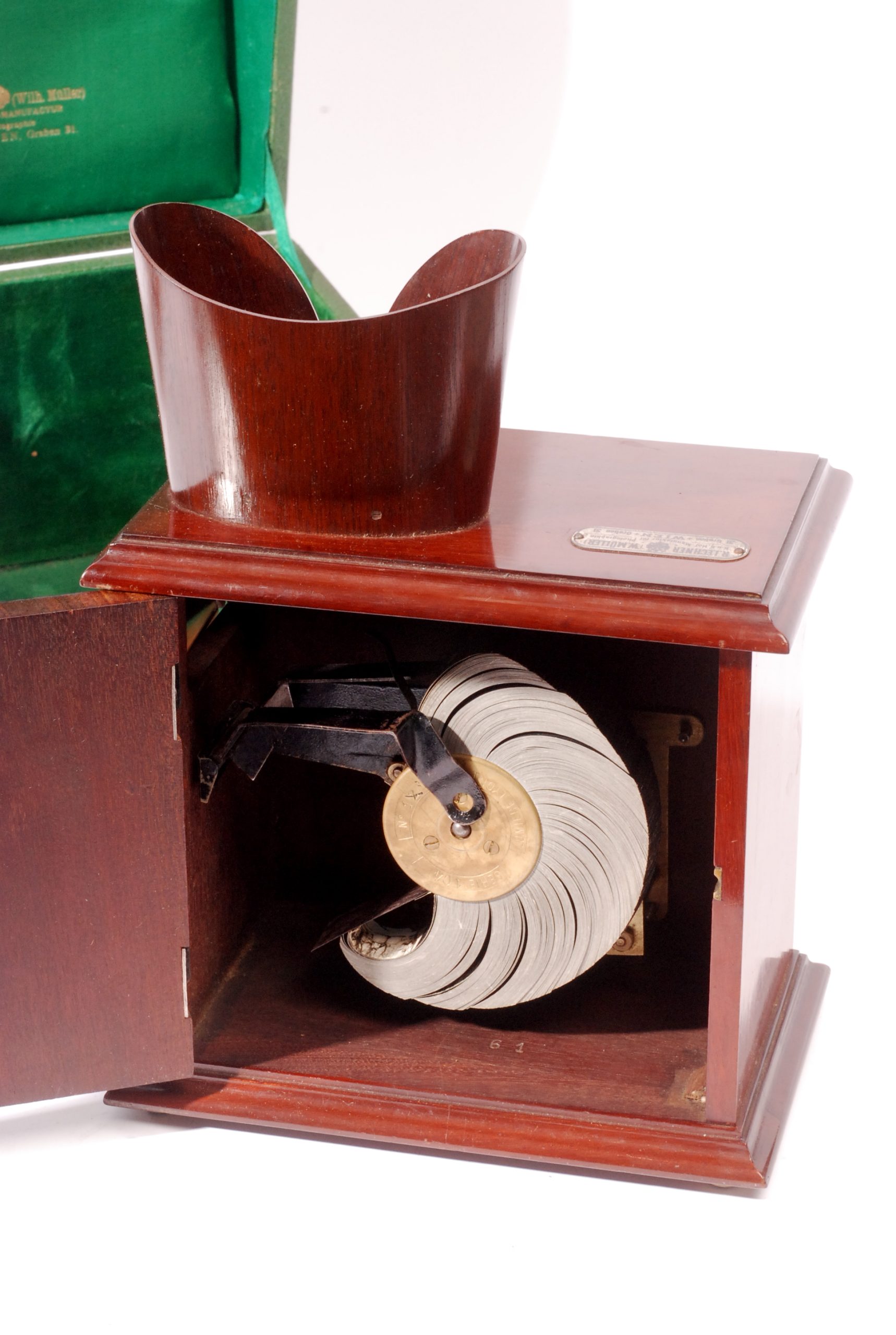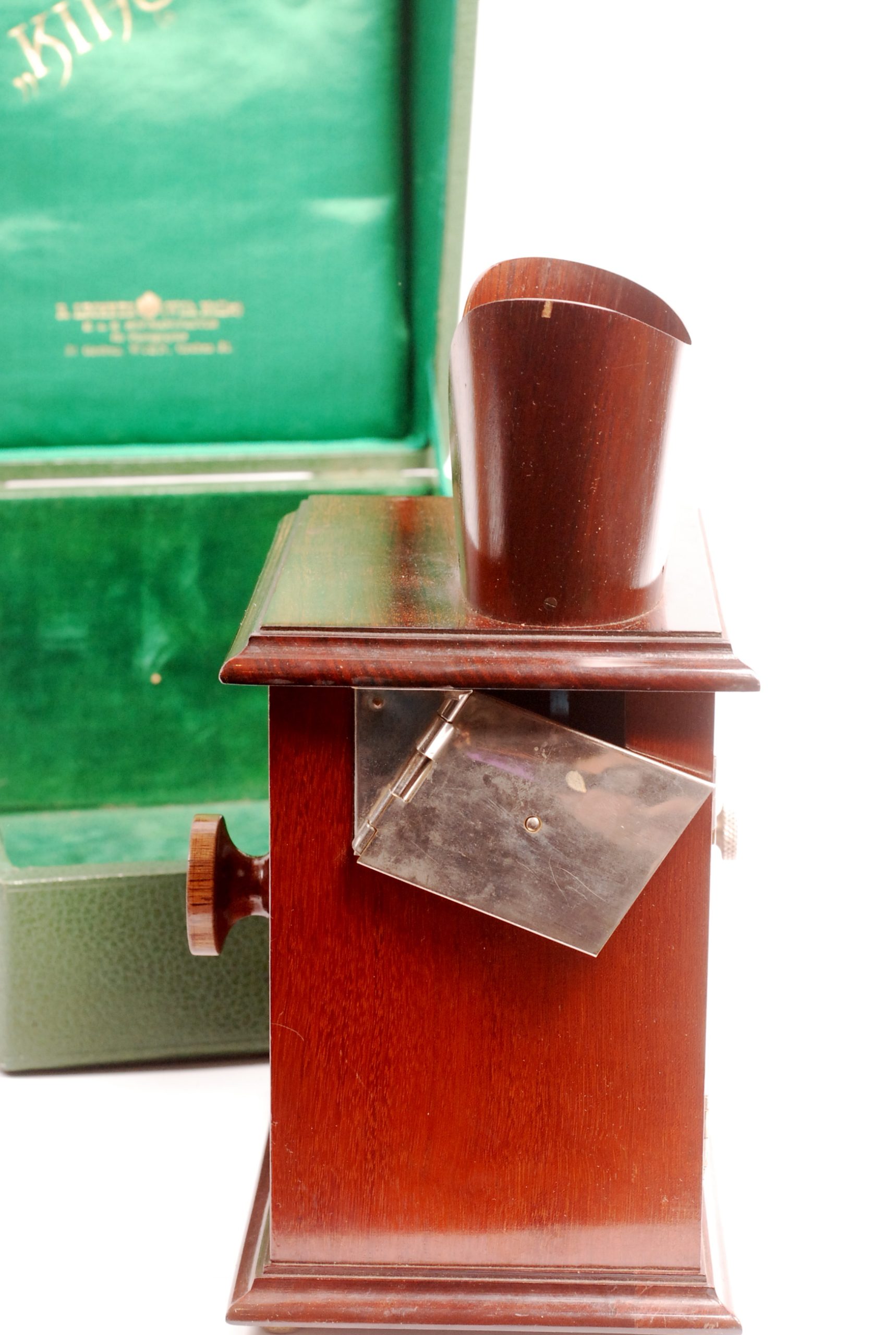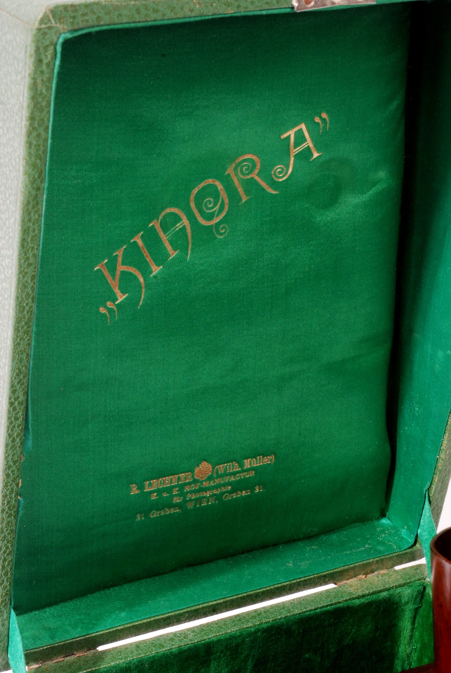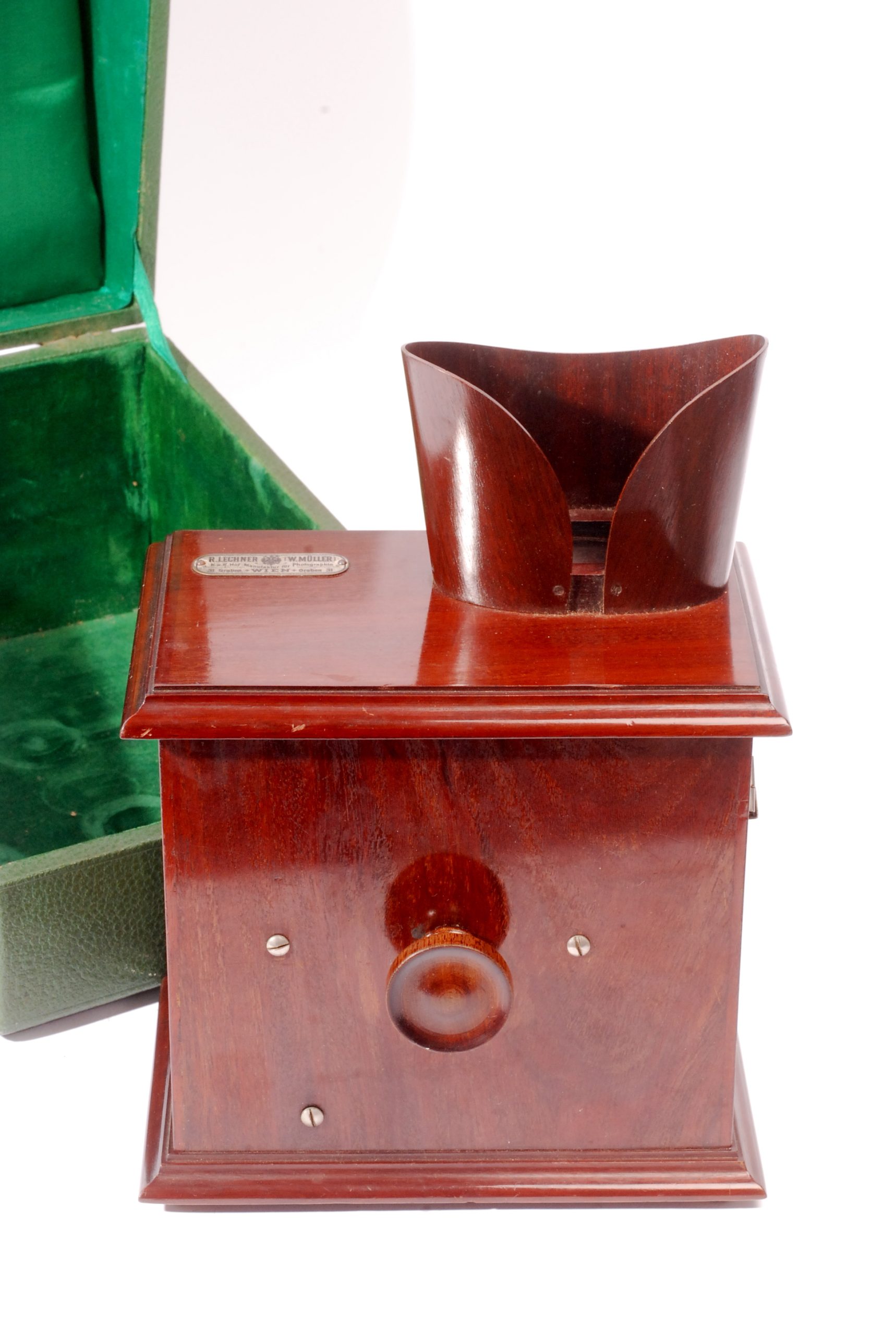 Kinora Lumière. Vues successives sur papier montées sur un axe métallique, défilant grâce à un moteur à ressort. France 1900. Inventé par Louis Lumière et breveté le 10 septembre 1896. Fabriquer par Léon Gaumont. Le modèle présenté est dans son magnifique coffret d'origine, avec l'adresse du revendeur. "R. Lechner W.Muller 31 Graben Wien." Avec un rouleau Lumière N°12 série 104.