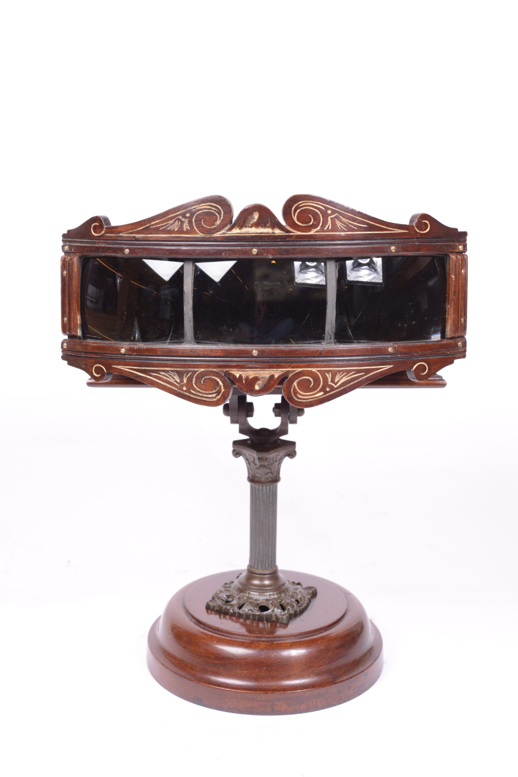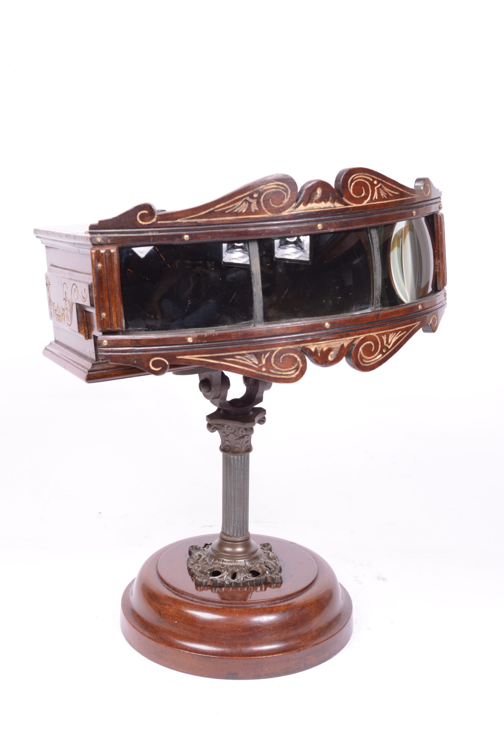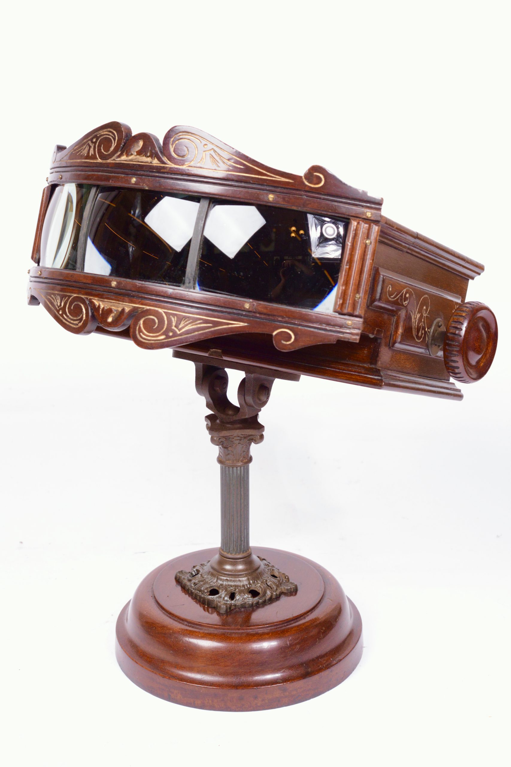 Exceptionnel et très beau Kinora triple à mouvement d'horlogerie. Fabrication anglaise par Kinora Ltd. London. Il comporte trois importantes lentilles, permettant ainsi à autant de personnes différentes une vision simultanée. Les vues sont animées par un mécanisme d’horlogerie. Le rouleau fait l'objet d'un feuilletage continu procurant ainsi une vision animée de la scène. Le corps de l’appareil et le socle du pied sont en acajou verni rehaussés de filets dorés. La colonne verticale du pied, avec chapiteau à feuilles d’acanthes, est en bronze.  Le Kinora contient un rouleau d’images animées de type Lumière. Très bel et rare appareil.