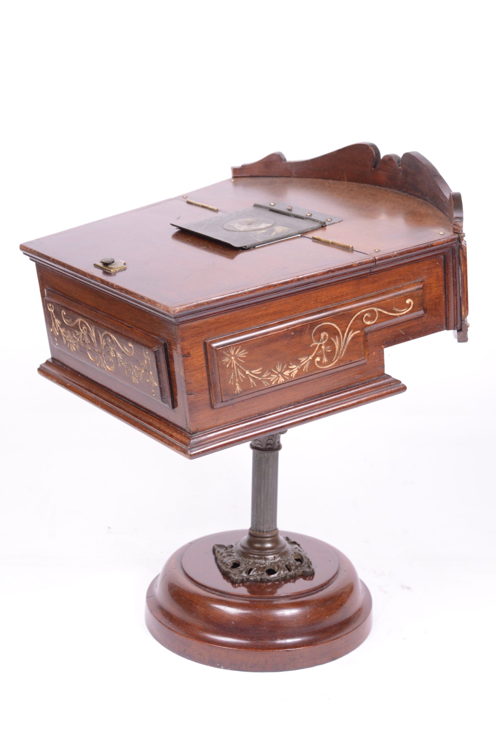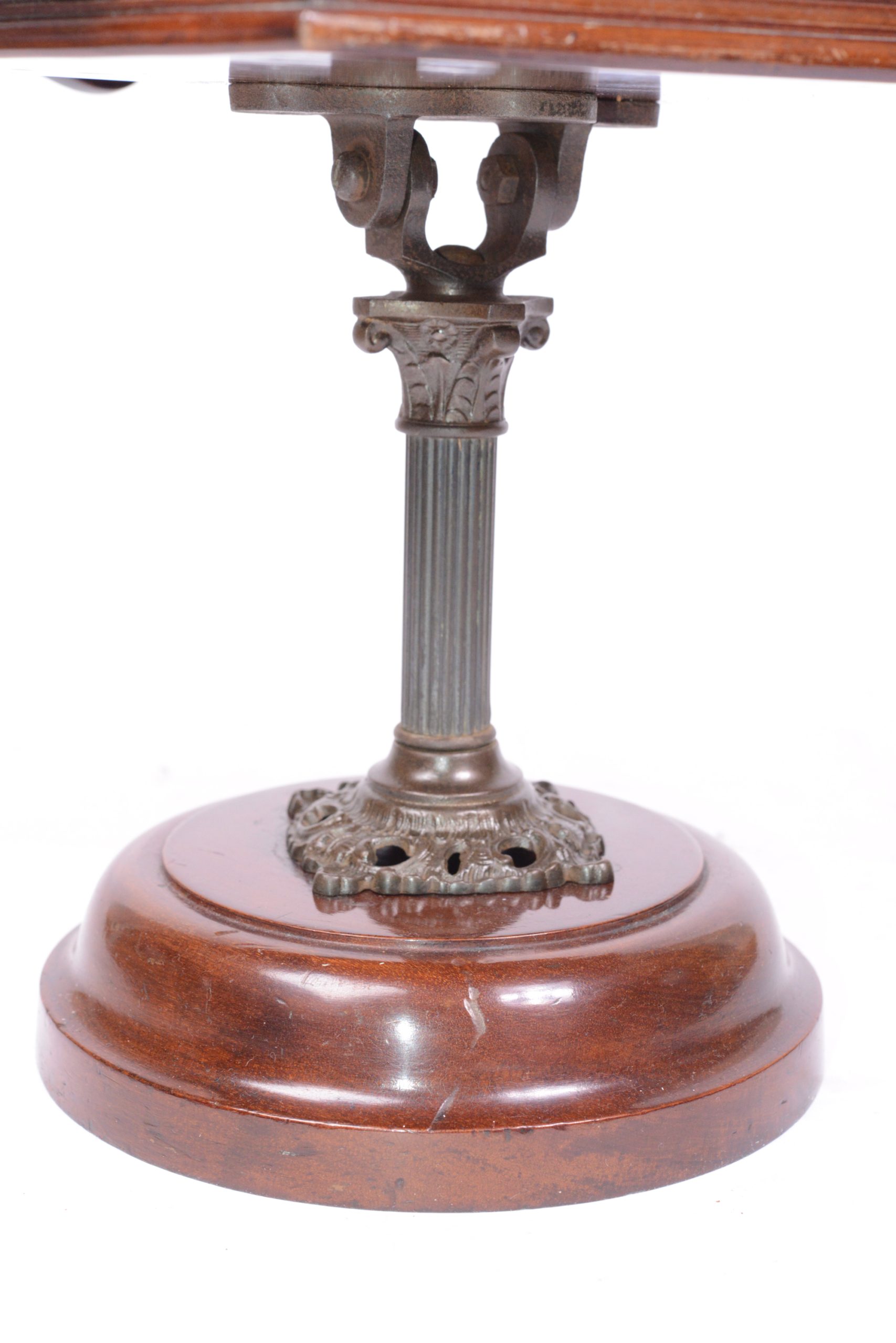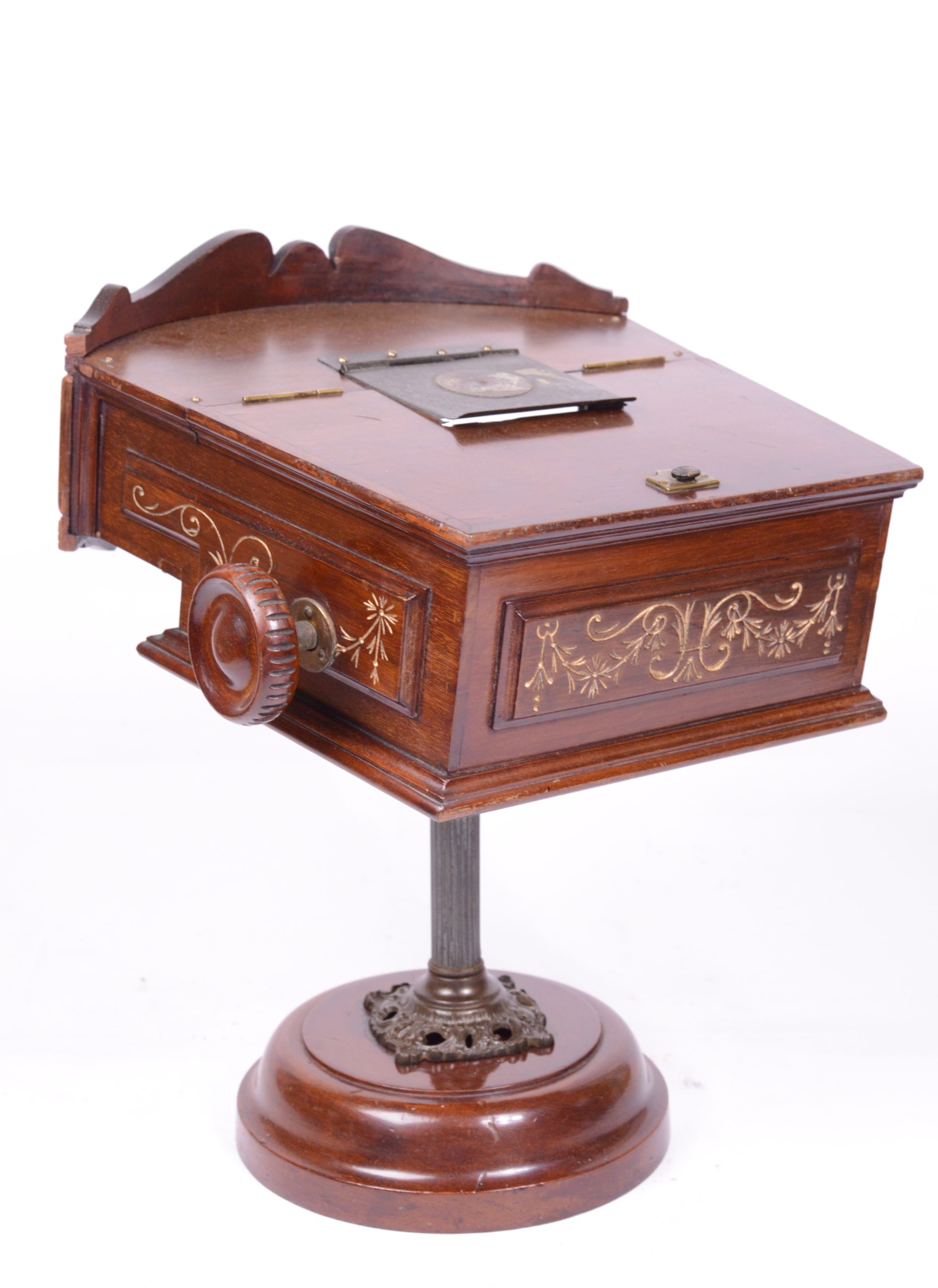 Exceptionnel et très beau Kinora triple à mouvement d'horlogerie. Fabrication anglaise par Kinora Ltd. London. Il comporte trois importantes lentilles, permettant ainsi à autant de personnes différentes une vision simultanée. Les vues sont animées par un mécanisme d’horlogerie. Le rouleau fait l'objet d'un feuilletage continu procurant ainsi une vision animée de la scène. Le corps de l’appareil et le socle du pied sont en acajou verni rehaussés de filets dorés. La colonne verticale du pied, avec chapiteau à feuilles d’acanthes, est en bronze.  Le Kinora contient un rouleau d’images animées de type Lumière. Très bel et rare appareil.