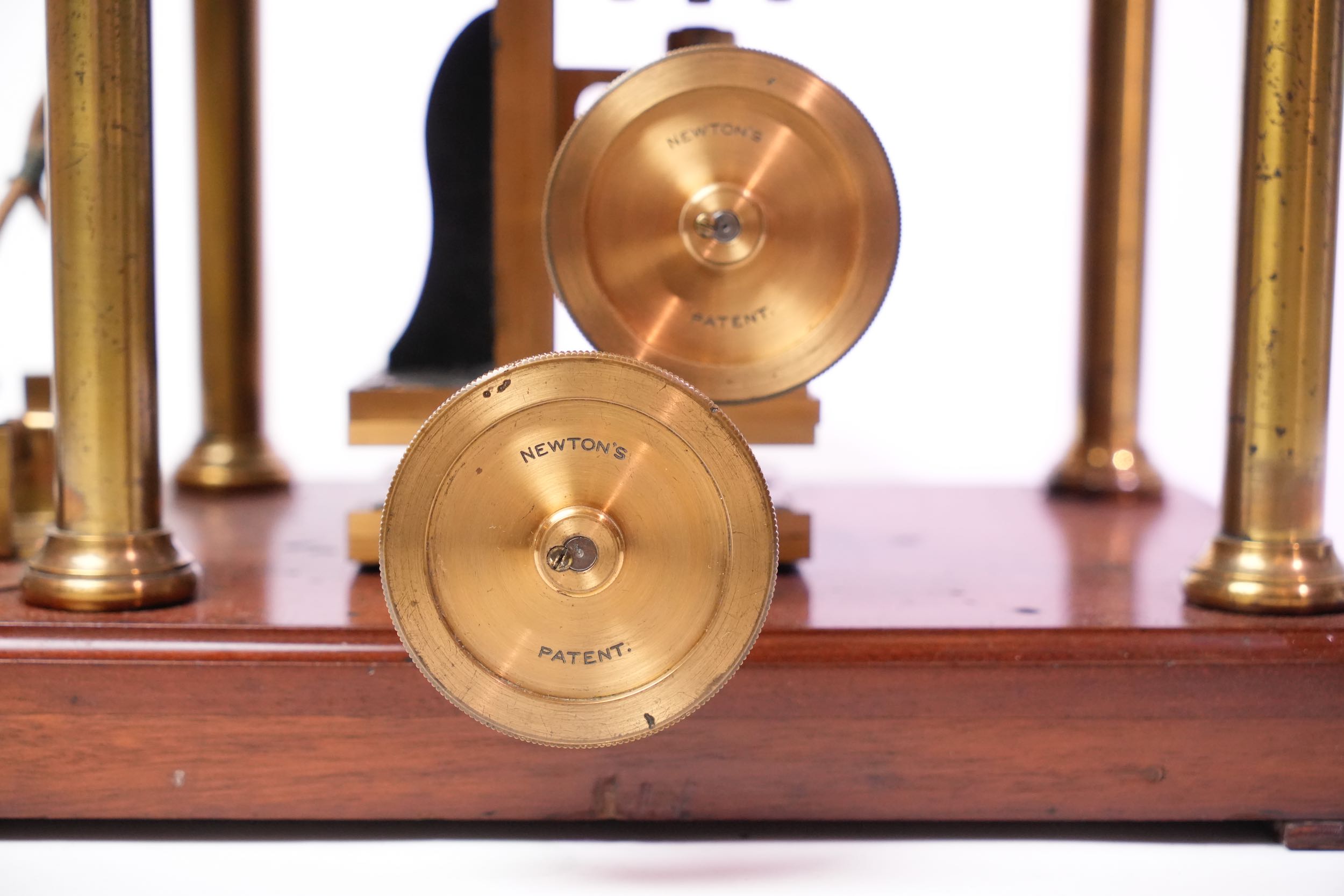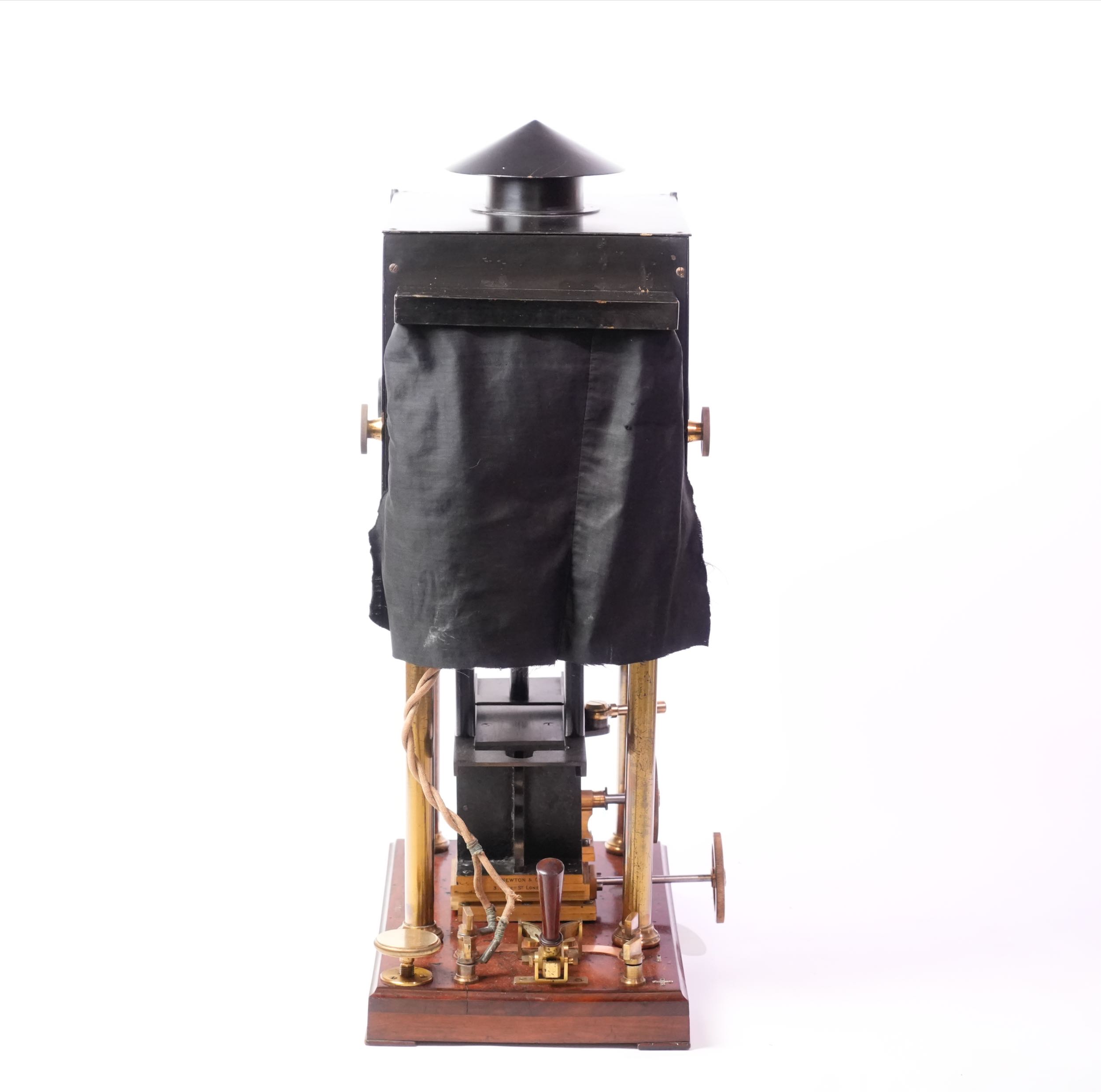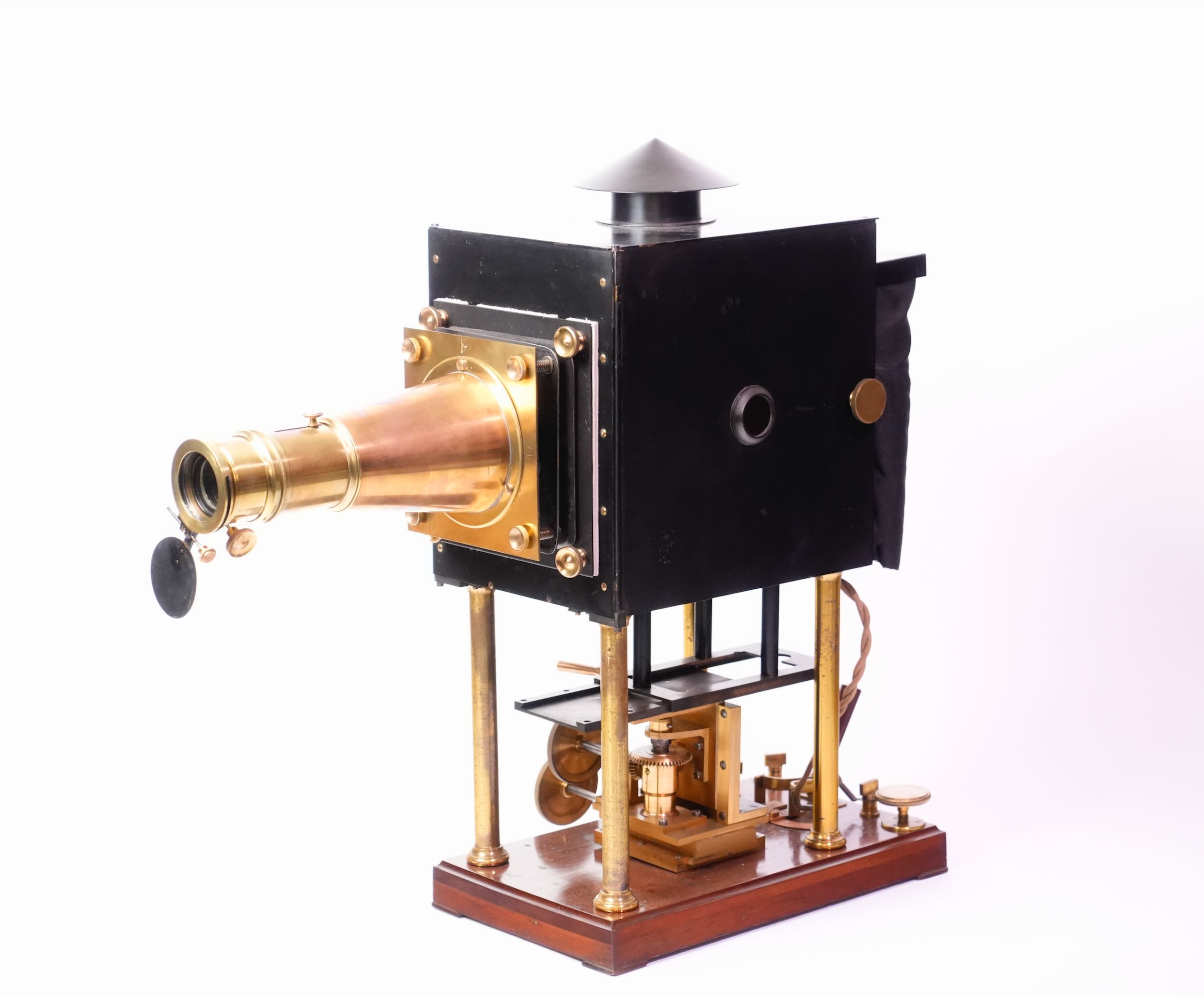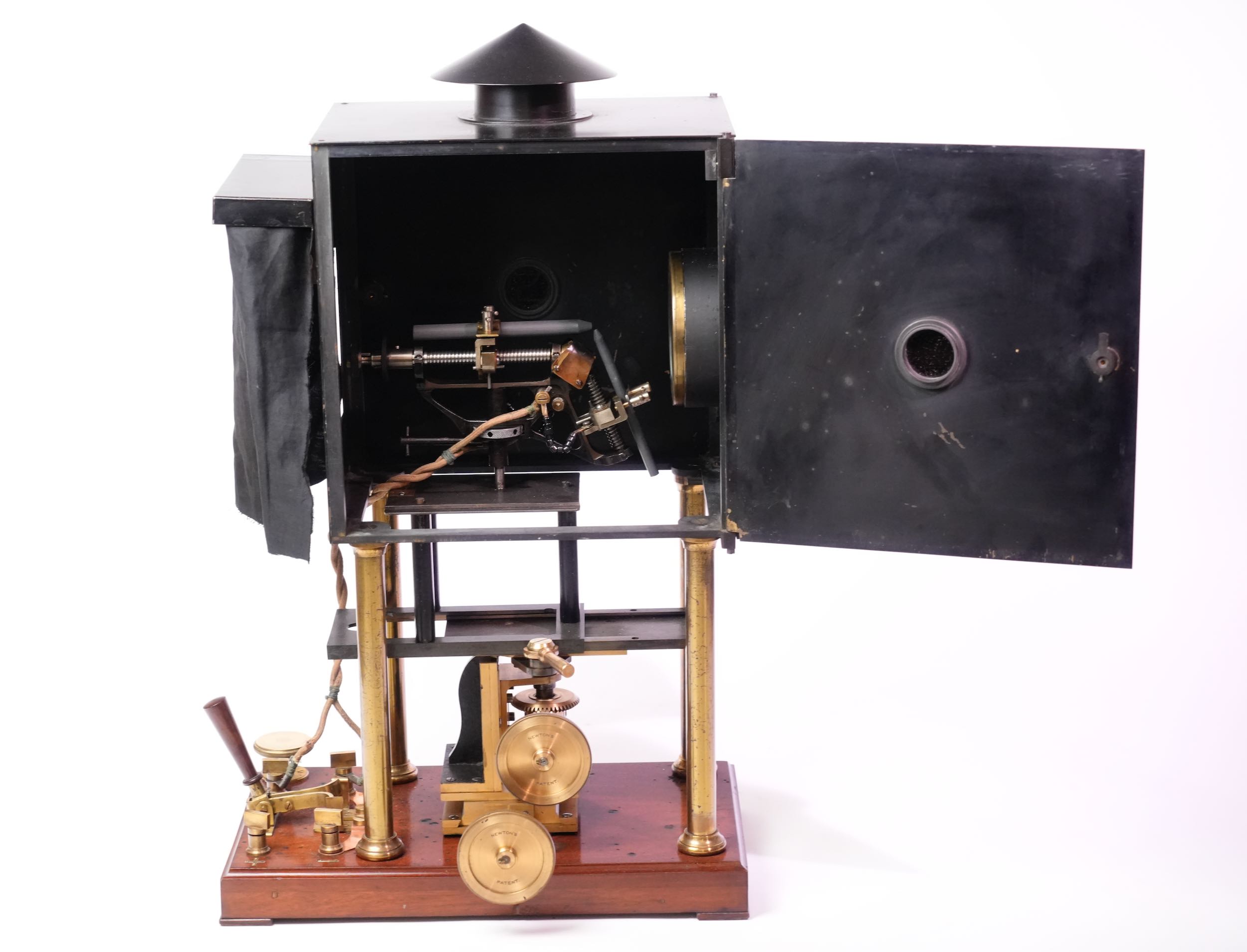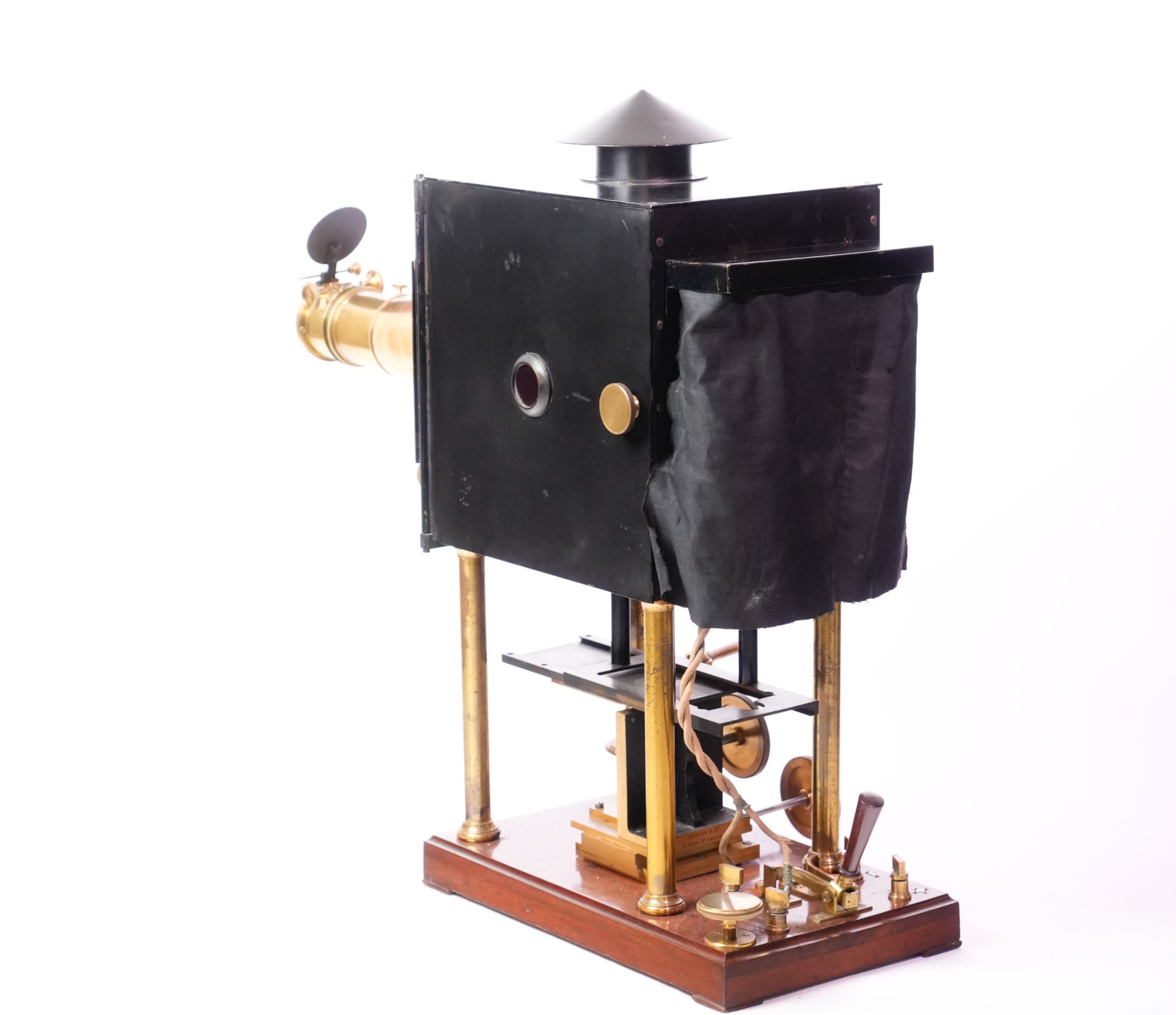 Newton & Co., Londres, c. 1885–1900 Lanterne de projection scientifique avec éclairage oxhydrique (limelight). Fabricant / Marquages : Newton & Co. (Londres) ; volants laiton gravés NEWTON’S PATENT. Construction : corps cubique en tôle peinte noire avec cheminée ; objectif en laiton à mise au point à crémaillère et capuchon d’obturateur ; hublot latéral à verre rouge ; socle en acajou porté par quatre colonnes en laiton. Éclairage : ensemble oxhydrique d’origine monté sur platine (brûleur à chaux vive, robinets/commandes, mélangeur), transmission par volants Newton’s Patent. Porte-vues : chariot pour plaques de lanterne standard env. 3¼″ / 8,3 × 8,3 cm (vues fixes ; compatible dissolving views avec seconde lanterne). Dimensions : 70 × 70 × 24 cm . État : très bon état de présentation pour l’époque ; patine homogène, mécanique complète et fonctionnelle à la main ; traces d’usage normales. Non testée. Pour des raisons de sécurité, l’emploi de l’oxhydrique historique n’est pas recommandé.