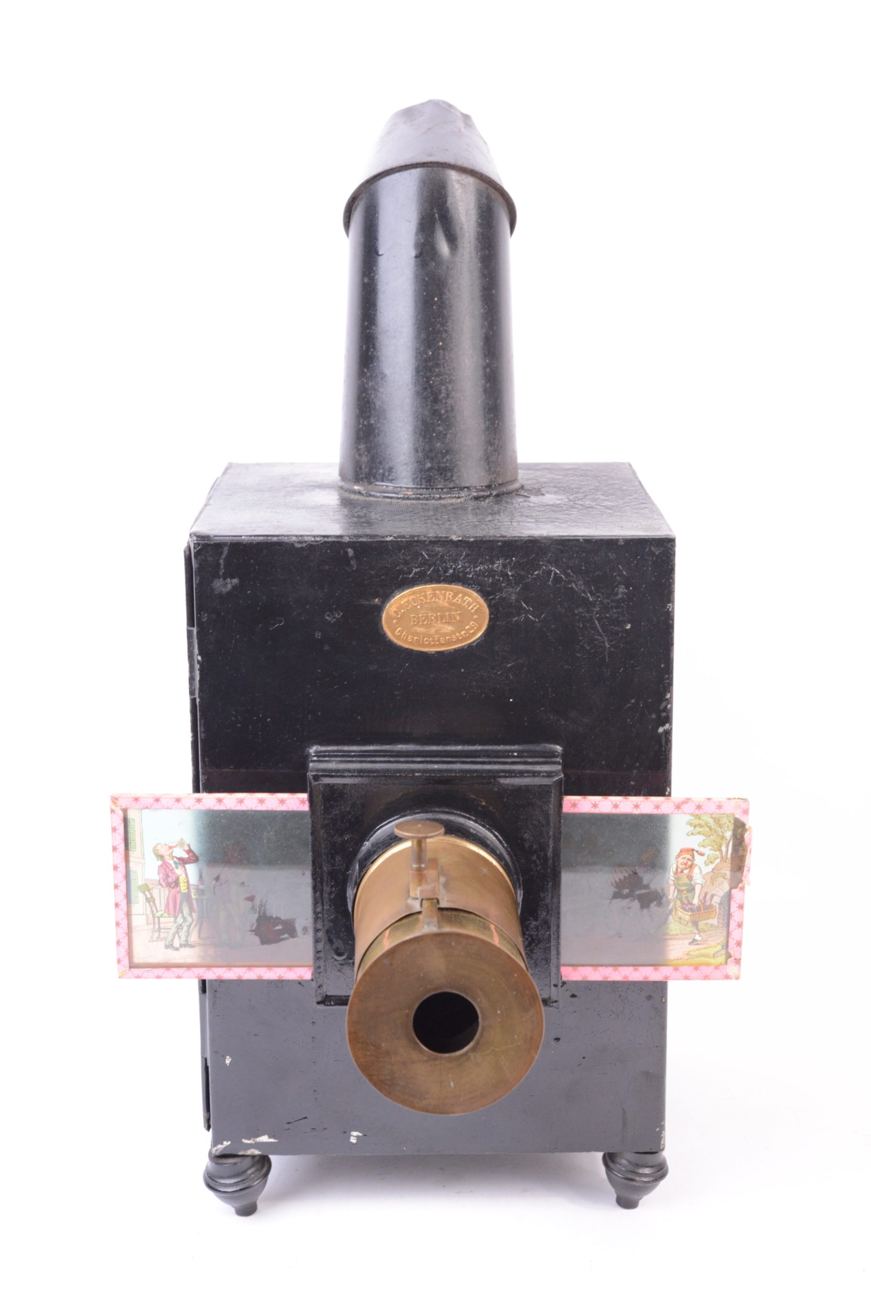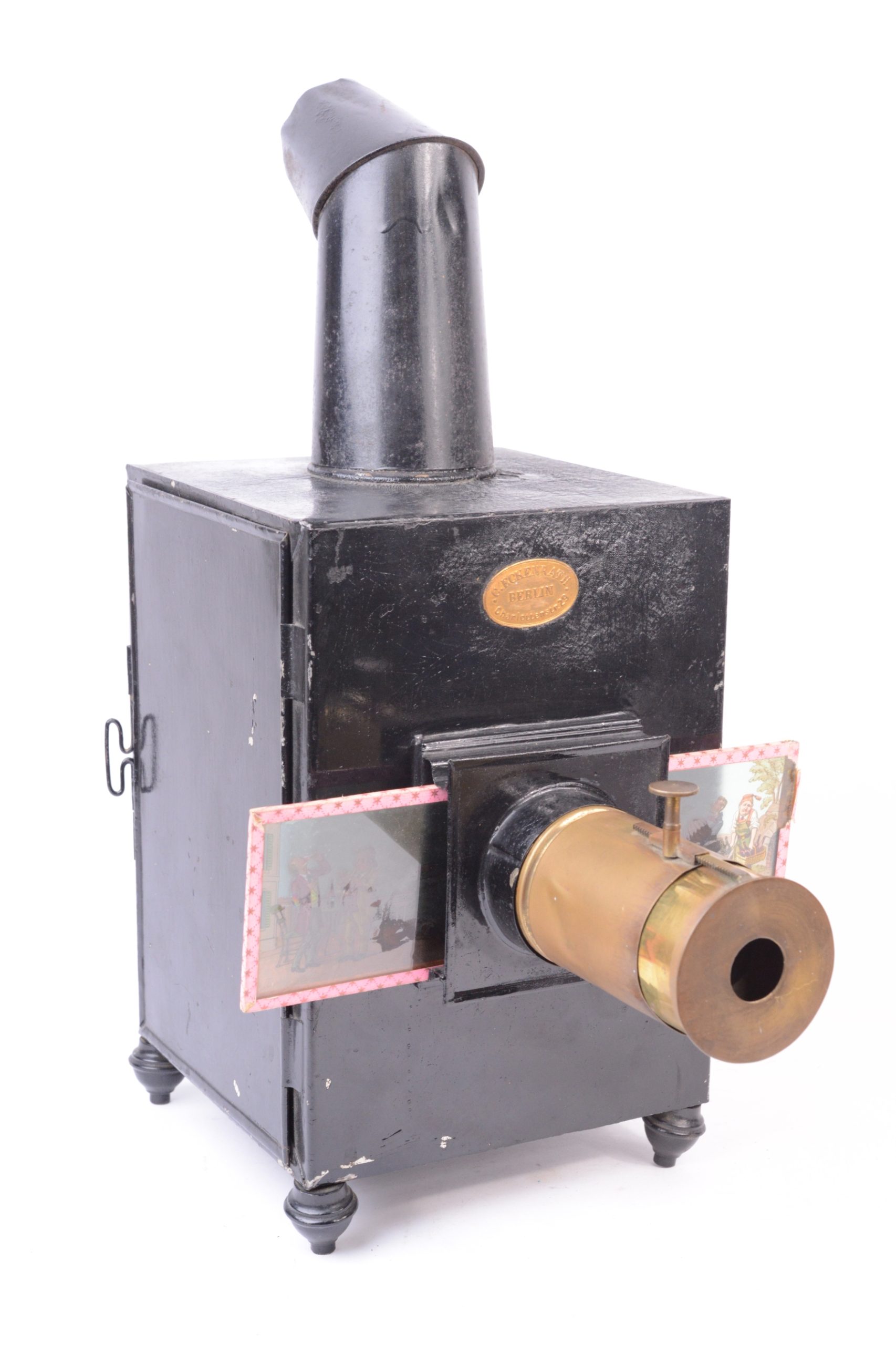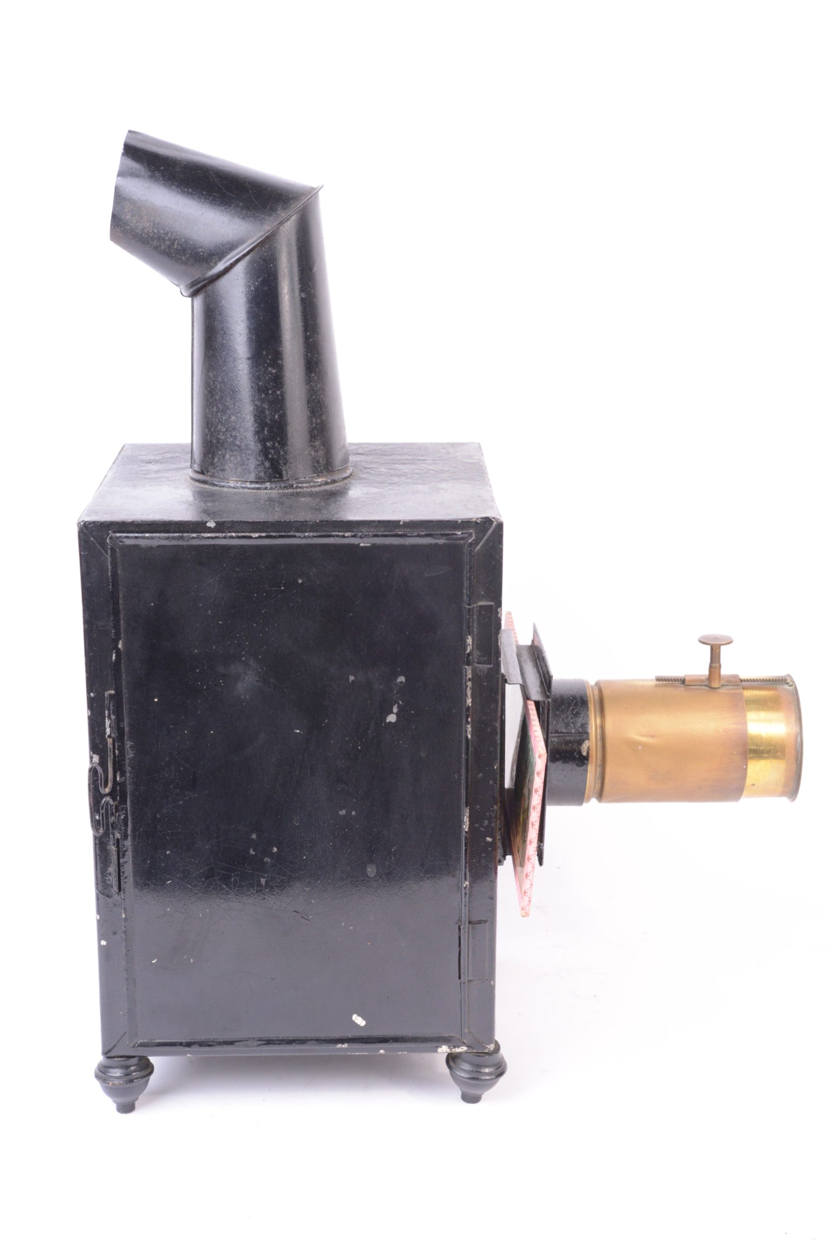 Lanterne Magique C. Eckenrath. Berlin Charlottenstrasse 29. Corps de lanterne et cheminée laqués noir. Dimensions :  Bruleur à l’alcool et son réflecteur (d’origine). Objectif à crémaillère en laiton verni. Vers 1825. Vient avec un ensemble d’une douzaine de vues sur verre bordurées. Bon état.