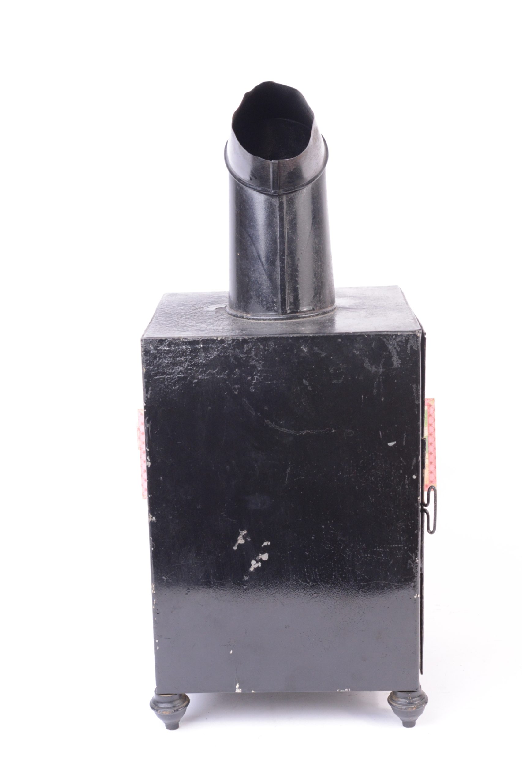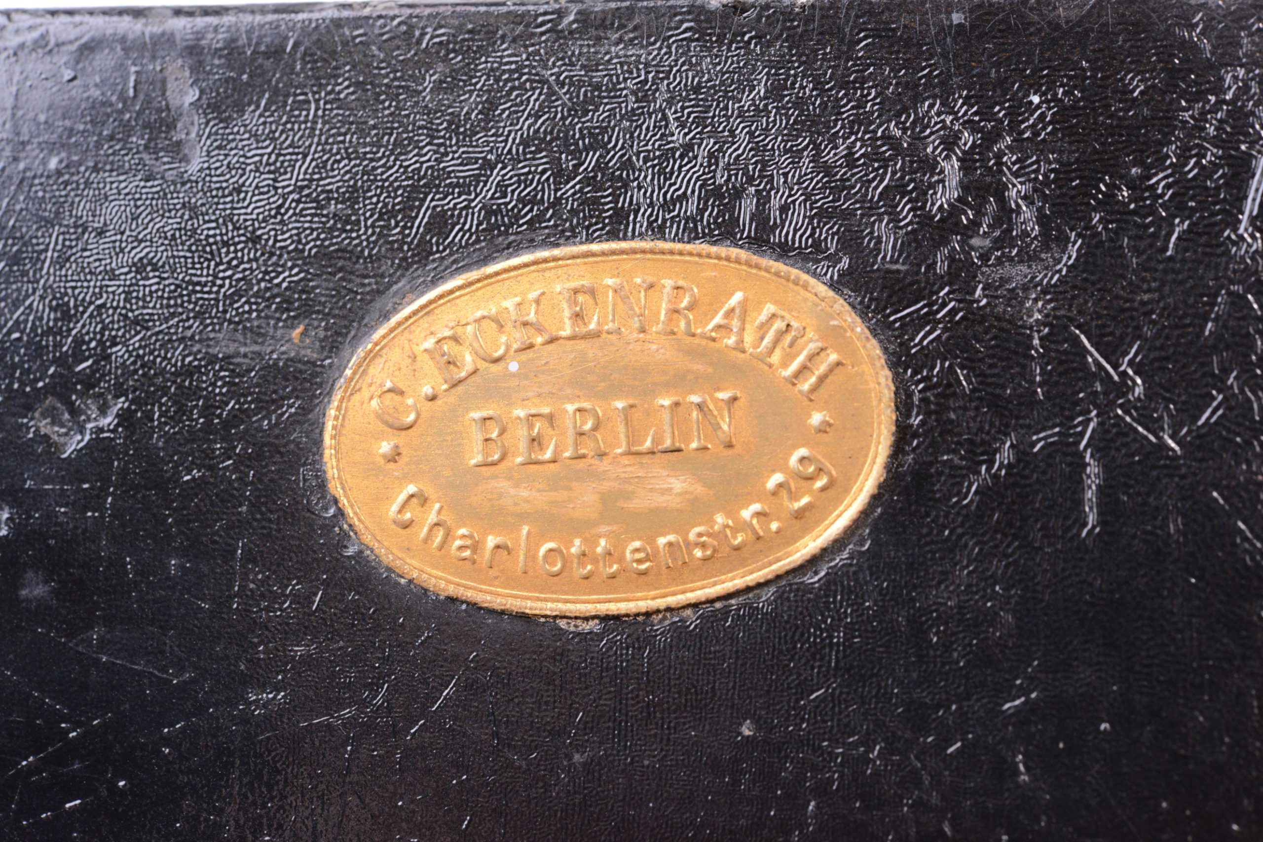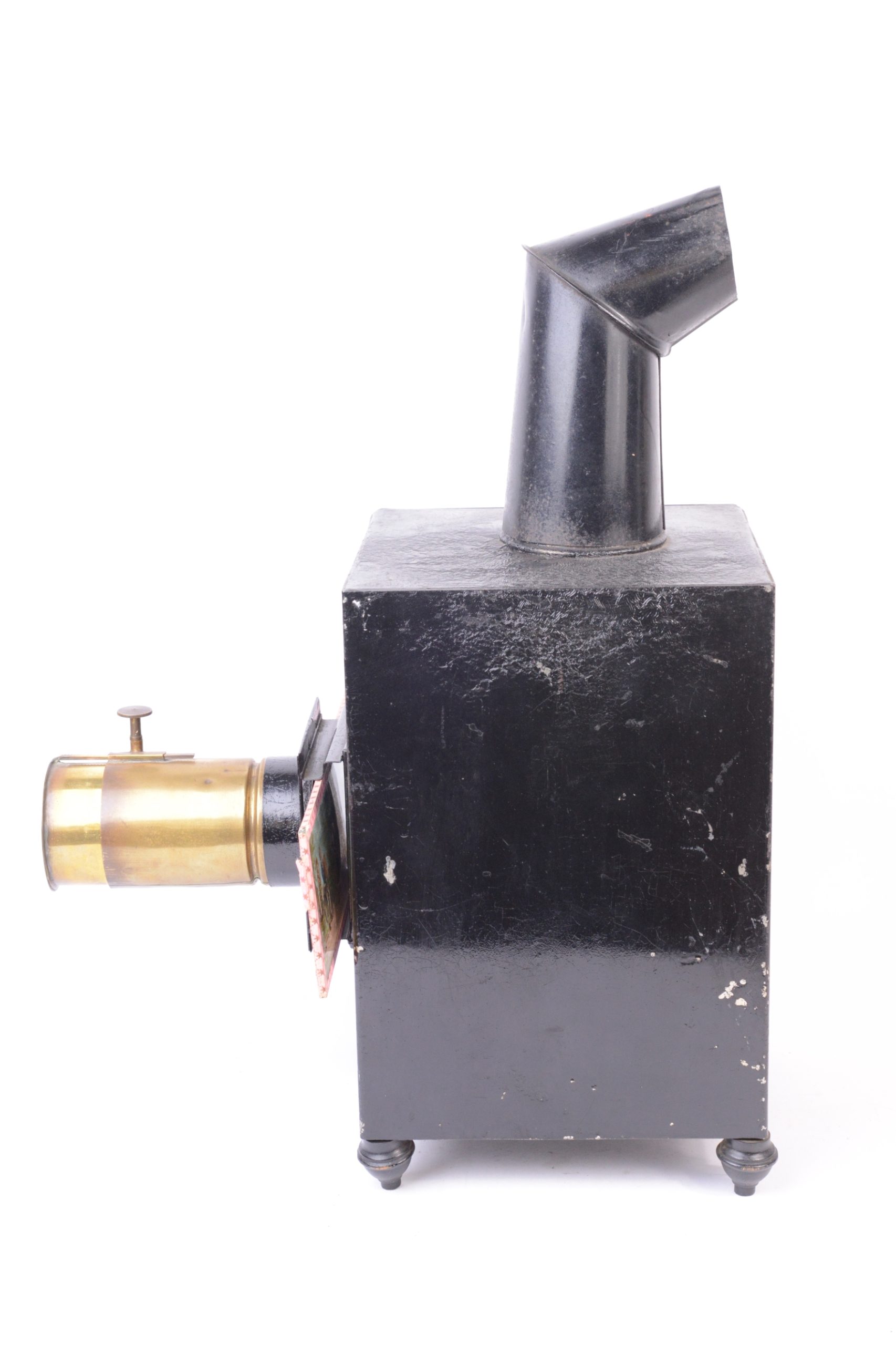 Lanterne Magique C. Eckenrath. Berlin Charlottenstrasse 29. Corps de lanterne et cheminée laqués noir. Dimensions :  Bruleur à l’alcool et son réflecteur (d’origine). Objectif à crémaillère en laiton verni. Vers 1825. Vient avec un ensemble d’une douzaine de vues sur verre bordurées. Bon état.