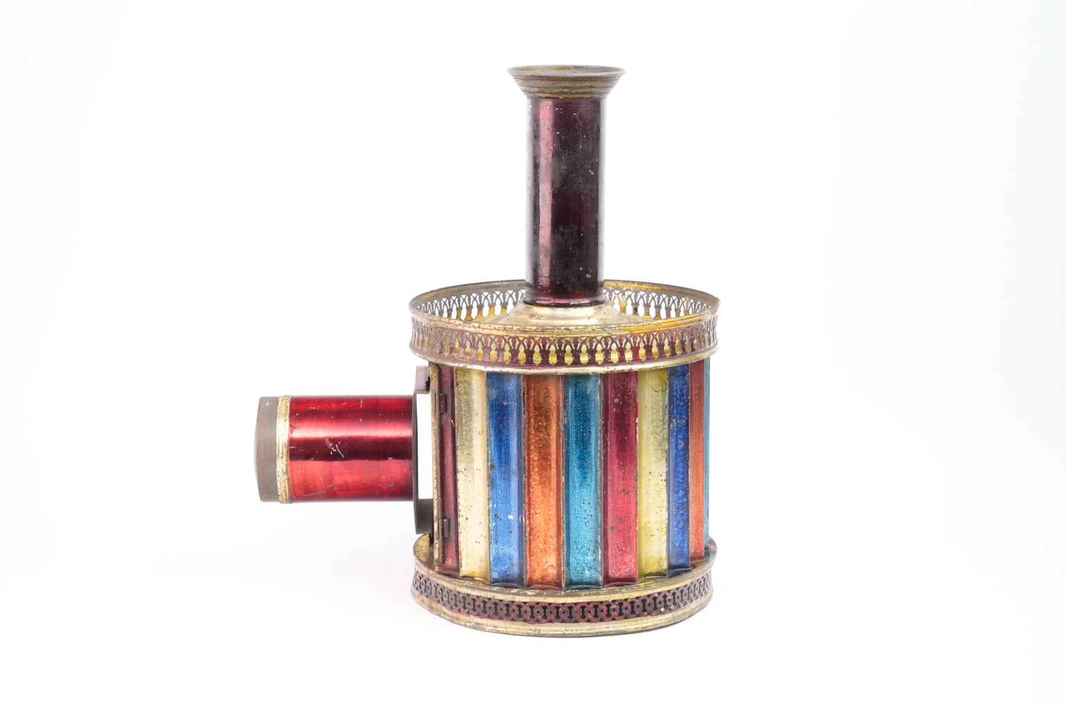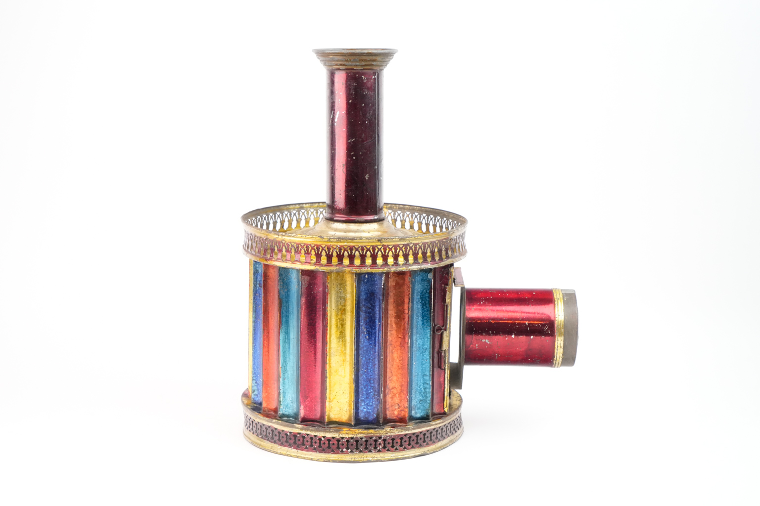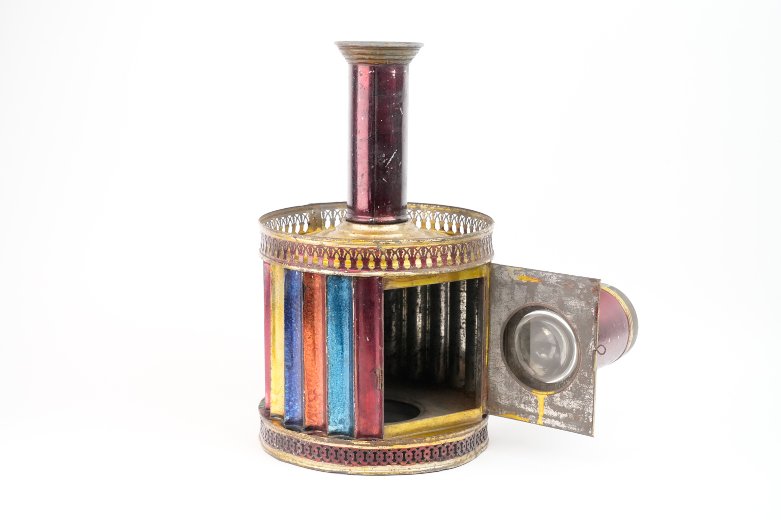 Lanterne magique Lampascope polychrome Aubert, corps cylindrique rainuré peint au vernis à l’alcool. Galeries ajourées supérieure et inférieure. Porte avant contenant le tube optique coulissant à capuchon. Hauteur 30cm. Vers 1880.